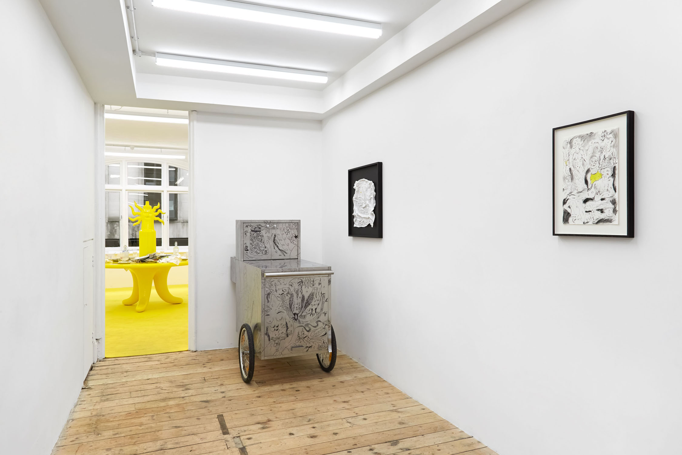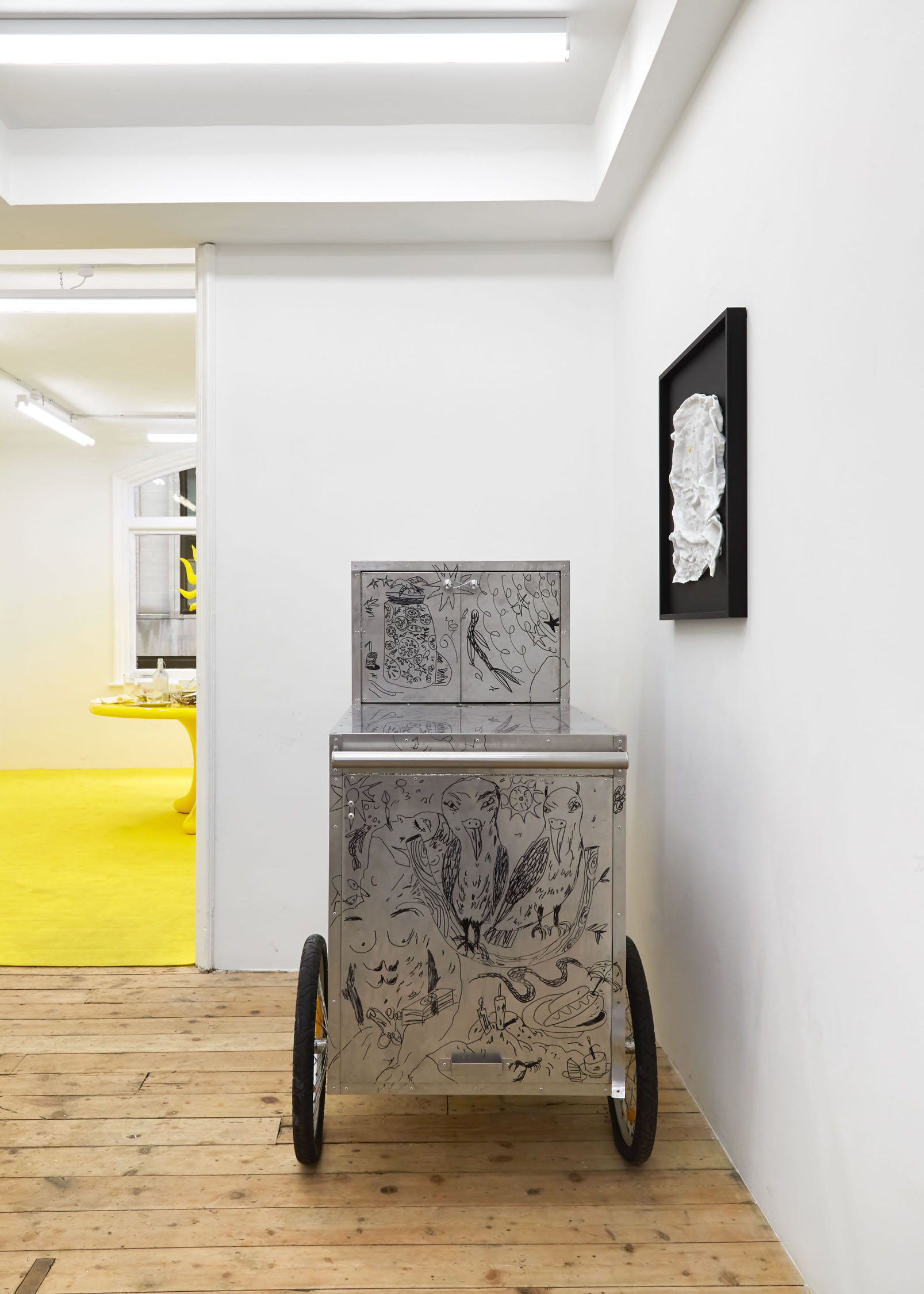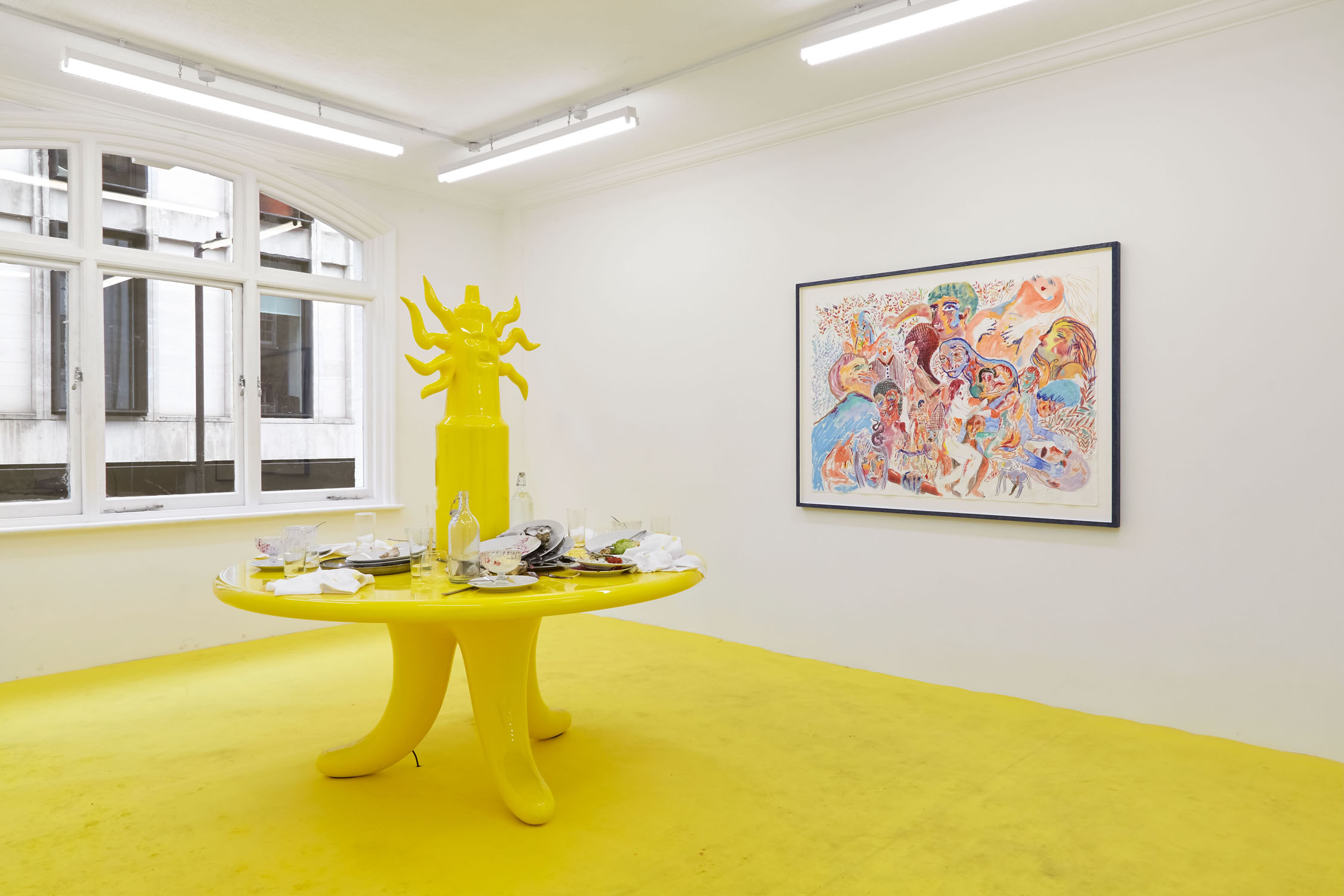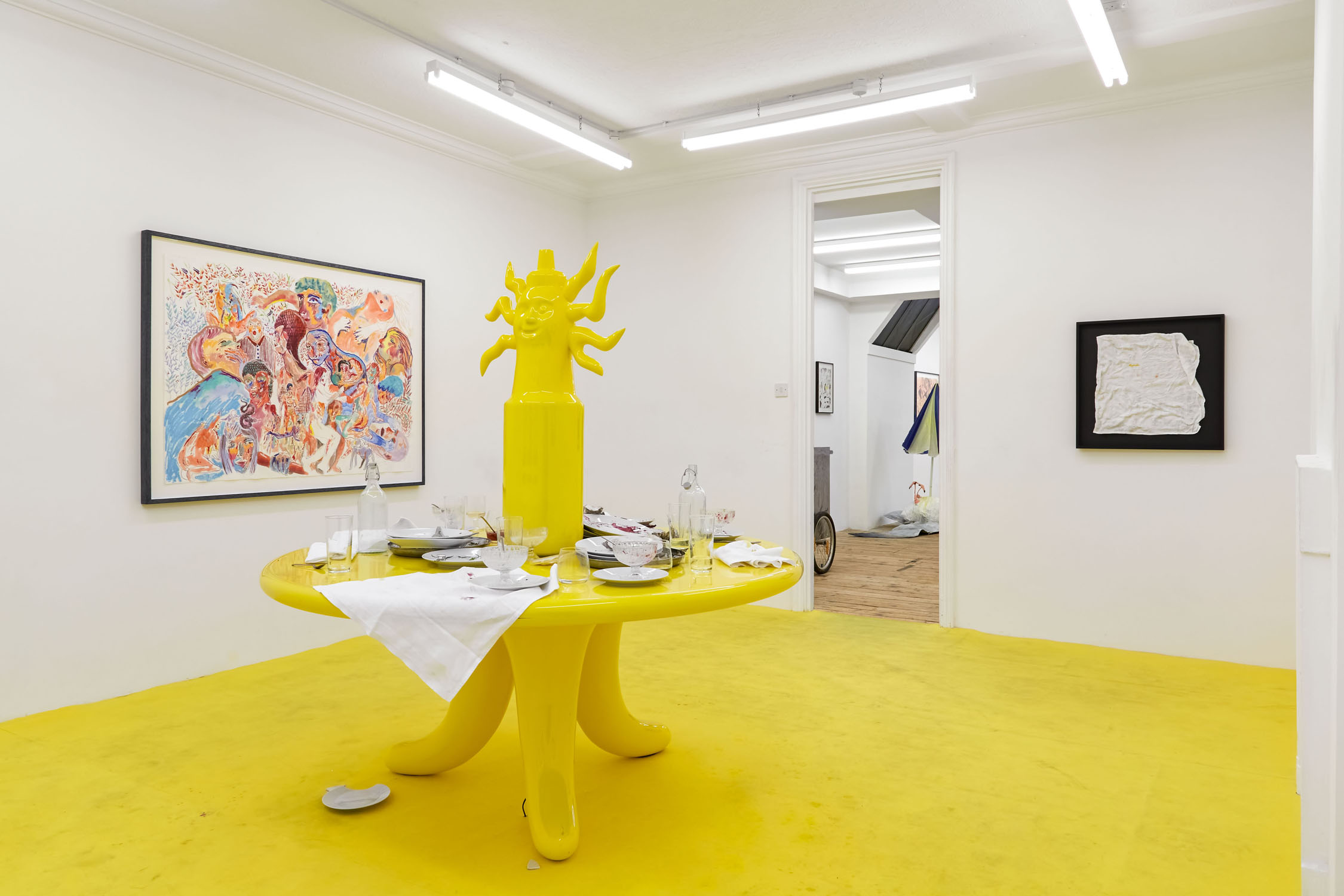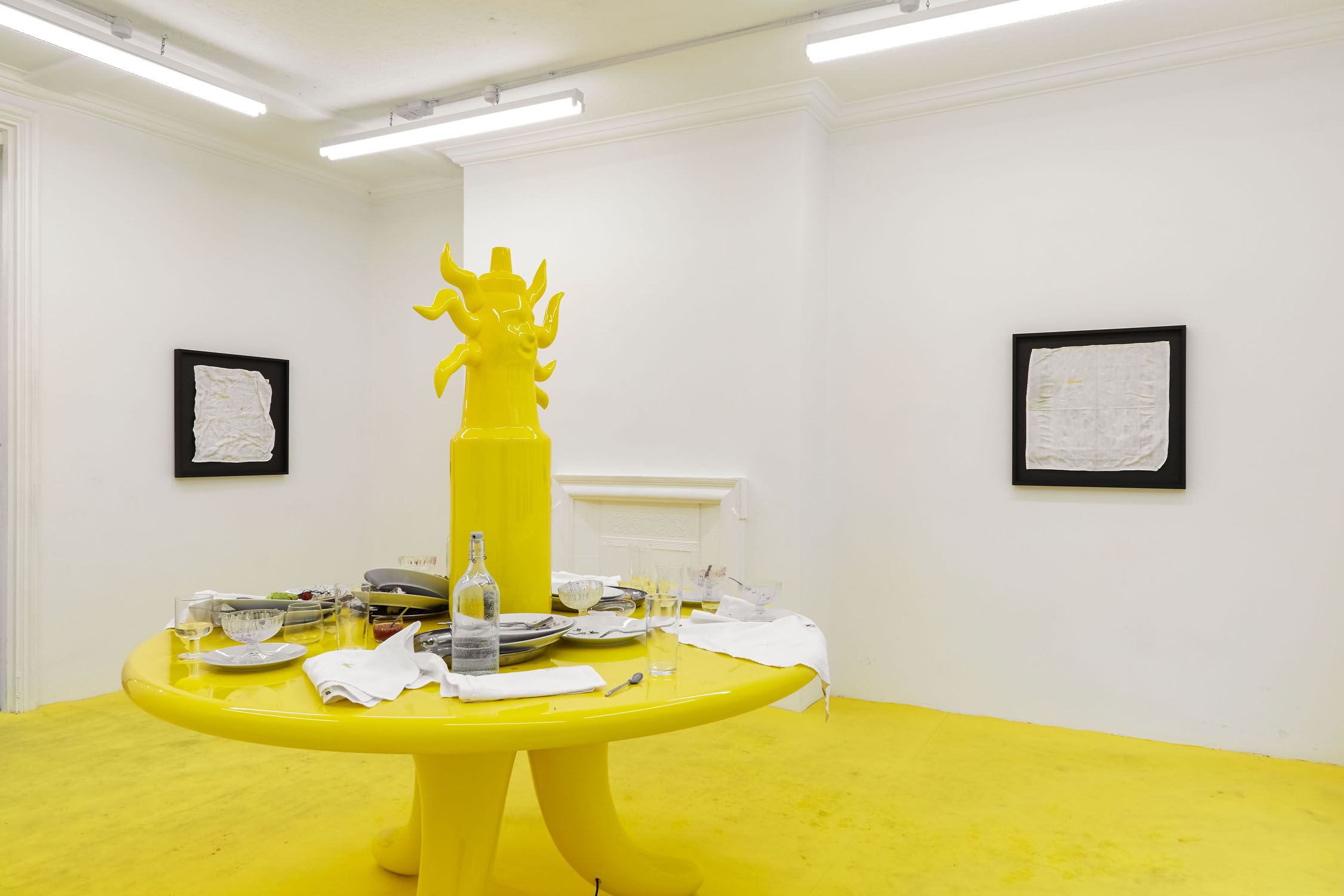 Maria Metsalu gives TINA and its London audience a new iteration of Kultuur, an ongoing performance work that animates a dialogue with the sun. Kultuur presents an anthropomorphised wildflower as an object of spectacle, while at the same time illuminating and complexifying some universal paradoxes of existence; the sun as something that gives life and energy, but something that can burn right through it. Metsalu confronts audiences in such a way that also scorns this spectacle, and the performance offers a moment of reflection, for all involved, on participation and complicity – a collective assemblage of exchange, of ritual, of unexpected and unknowable participation. The performance begins in the street, where people witness the artist’s interactions with a ubiquitous element of urban life, the hotdog vendor. With a hypnotic candour, and with intensities varying between states of pleasure, indifference, suffering and hope, audiences are led, pied piper-like, to TINA. Here, the collective body of the audience orbit the sun – an environment collaboratively made by Metsalu and Boumjimar in the gallery space. Kultuur includes the collaboration of various other artists in its conception and production; a text written by Jaakko Pallasvuo, sound design by Artjom Astrov, outfits designed by Kris Lemsalu together with Lotte Jürjendal and CRUDACRUDA, and a range of artefacts designed and built by Nikola Knezevic and Bruno Lillemets. While Karim Boumjimar creates the food as part of Kultuur, for TINA’s edition, Boumjimar presents drawings and ceramics to accompany the event and exhibition. The invited collaborators and the audience of Kultuur are a collective body that is fed, entertained and questioned. At TINA, the performance is divided into two parts – the parade at the hot dog cart and the devouring of the Sun, table d’hôte. Kultuur is a celebration of life and its dualities – a celebration of its fleeting and sensual nature.