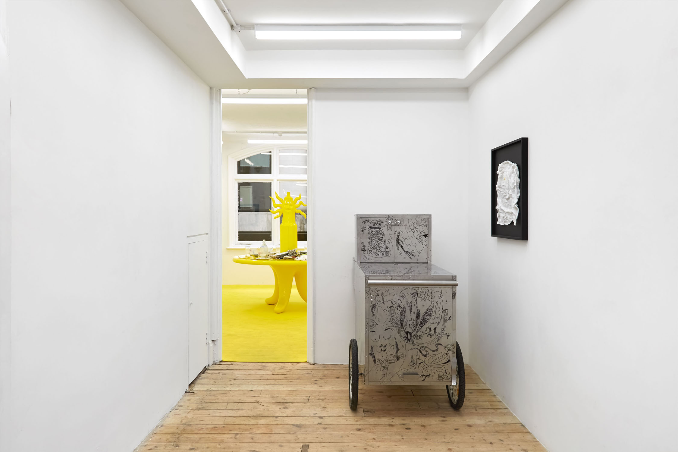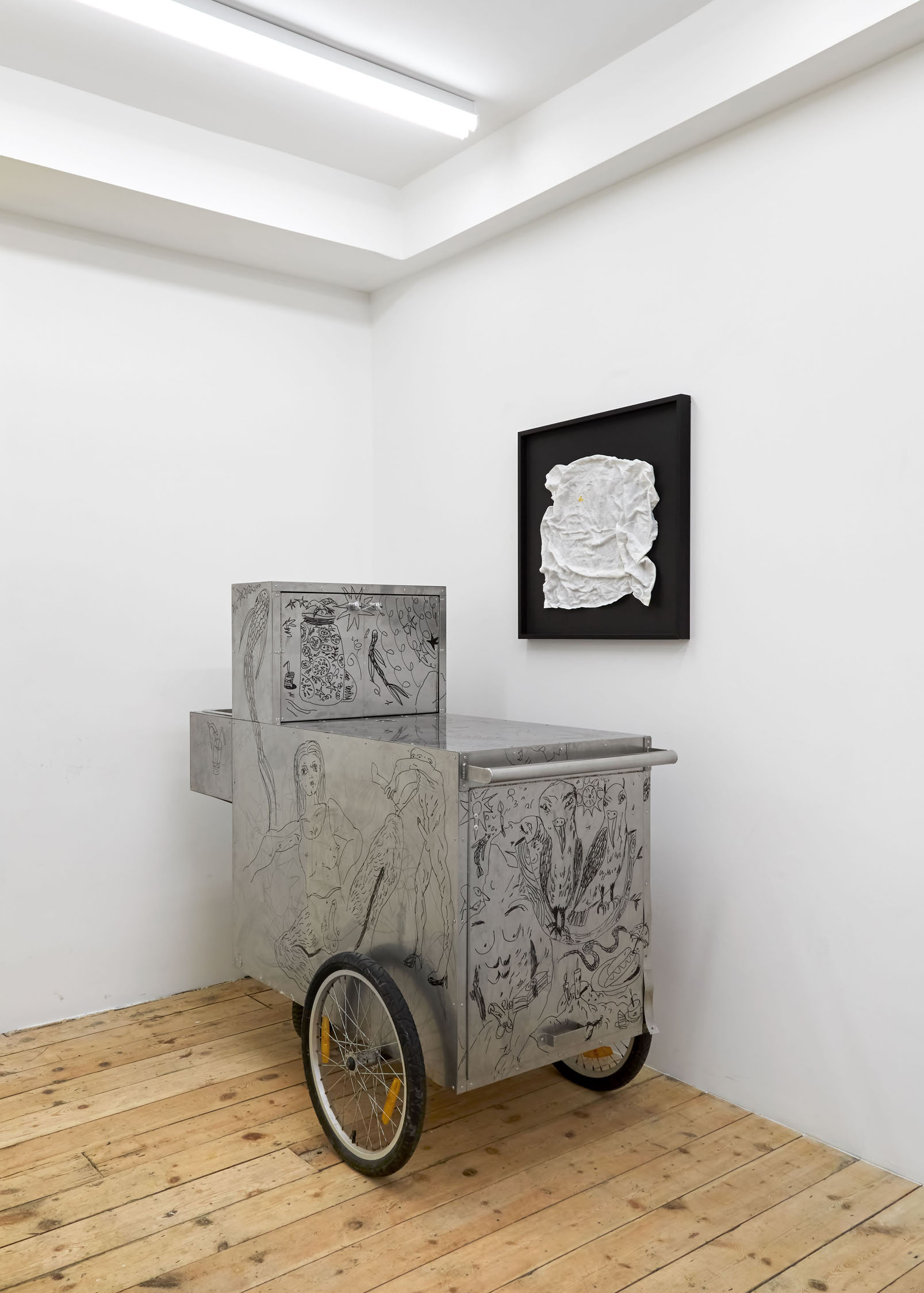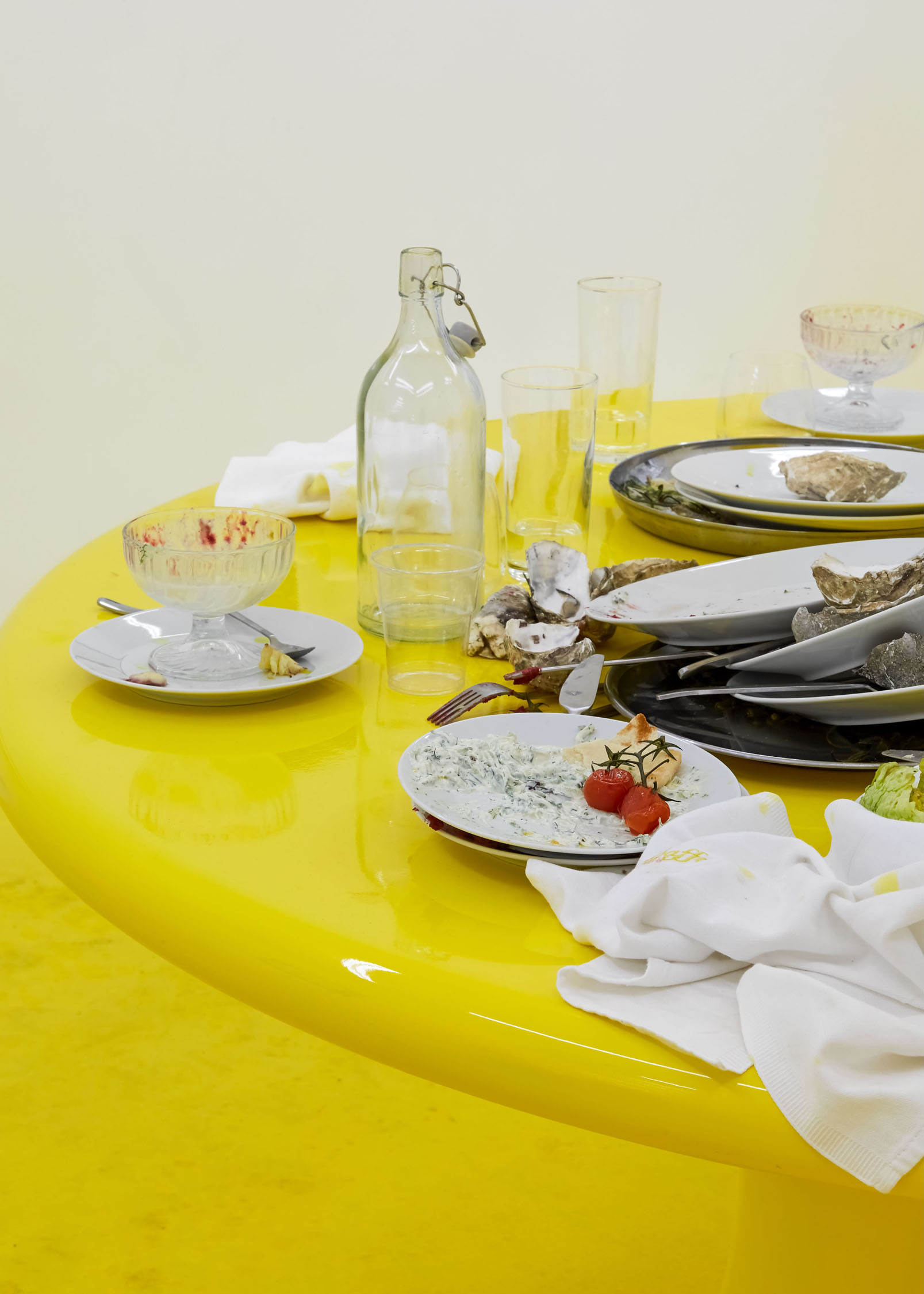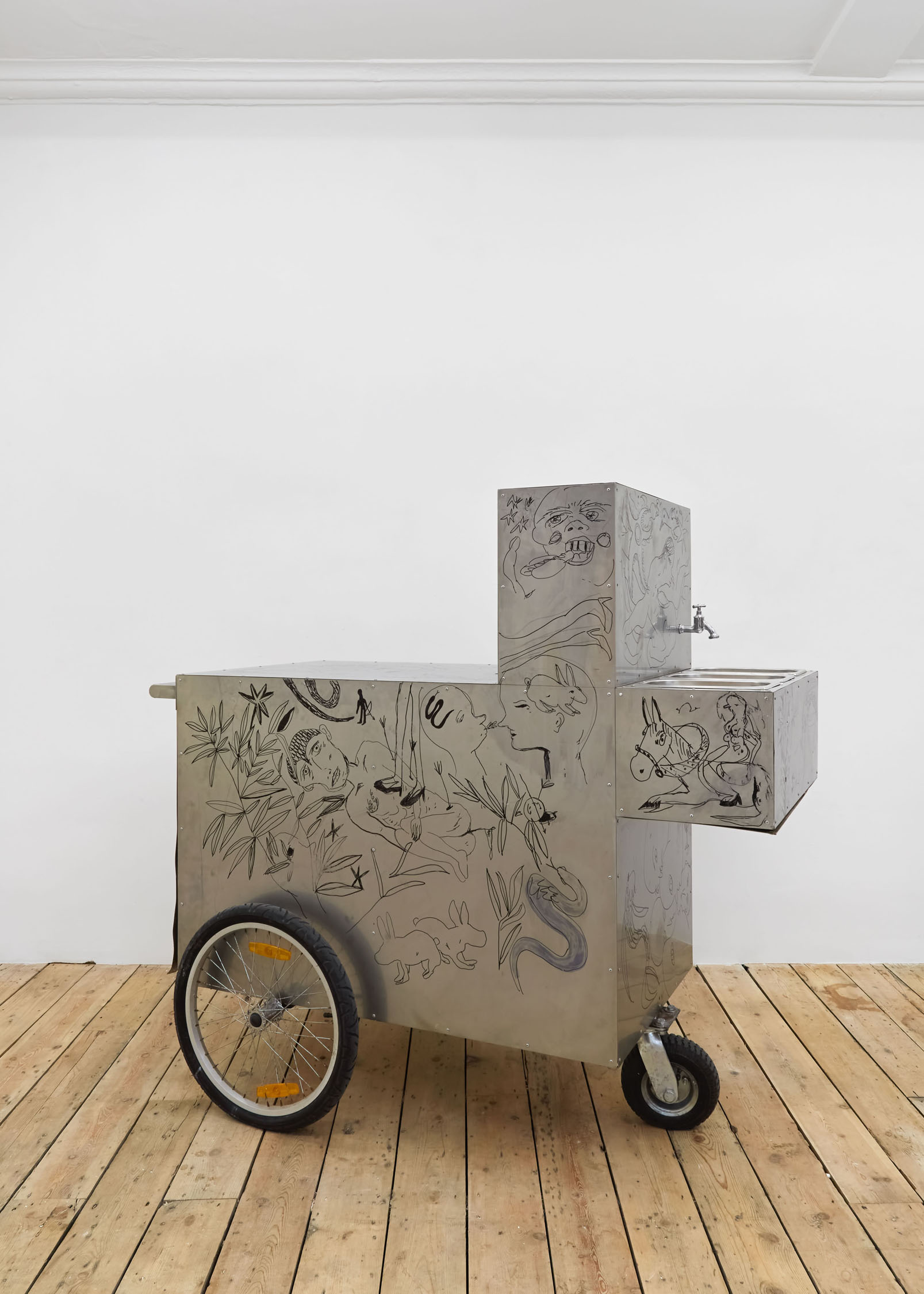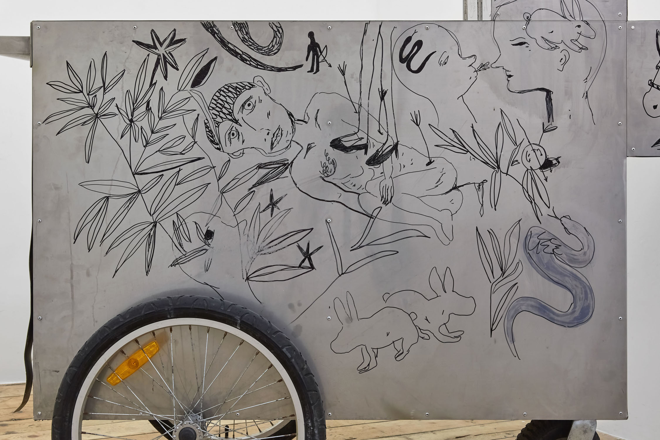 Maria Metsalu gives TINA and its London audience a new iteration of Kultuur, an ongoing performance work that animates a dialogue with the sun. Kultuur presents an anthropomorphised wildflower as an object of spectacle, while at the same time illuminating and complexifying some universal paradoxes of existence; the sun as something that gives life and energy, but something that can burn right through it. Metsalu confronts audiences in such a way that also scorns this spectacle, and the performance offers a moment of reflection, for all involved, on participation and complicity – a collective assemblage of exchange, of ritual, of unexpected and unknowable participation. The performance begins in the street, where people witness the artist’s interactions with a ubiquitous element of urban life, the hotdog vendor. With a hypnotic candour, and with intensities varying between states of pleasure, indifference, suffering and hope, audiences are led, pied piper-like, to TINA. Here, the collective body of the audience orbit the sun – an environment collaboratively made by Metsalu and Boumjimar in the gallery space. Kultuur includes the collaboration of various other artists in its conception and production; a text written by Jaakko Pallasvuo, sound design by Artjom Astrov, outfits designed by Kris Lemsalu together with Lotte Jürjendal and CRUDACRUDA, and a range of artefacts designed and built by Nikola Knezevic and Bruno Lillemets. While Karim Boumjimar creates the food as part of Kultuur, for TINA’s edition, Boumjimar presents drawings and ceramics to accompany the event and exhibition. The invited collaborators and the audience of Kultuur are a collective body that is fed, entertained and questioned. At TINA, the performance is divided into two parts – the parade at the hot dog cart and the devouring of the Sun, table d’hôte. Kultuur is a celebration of life and its dualities – a celebration of its fleeting and sensual nature.