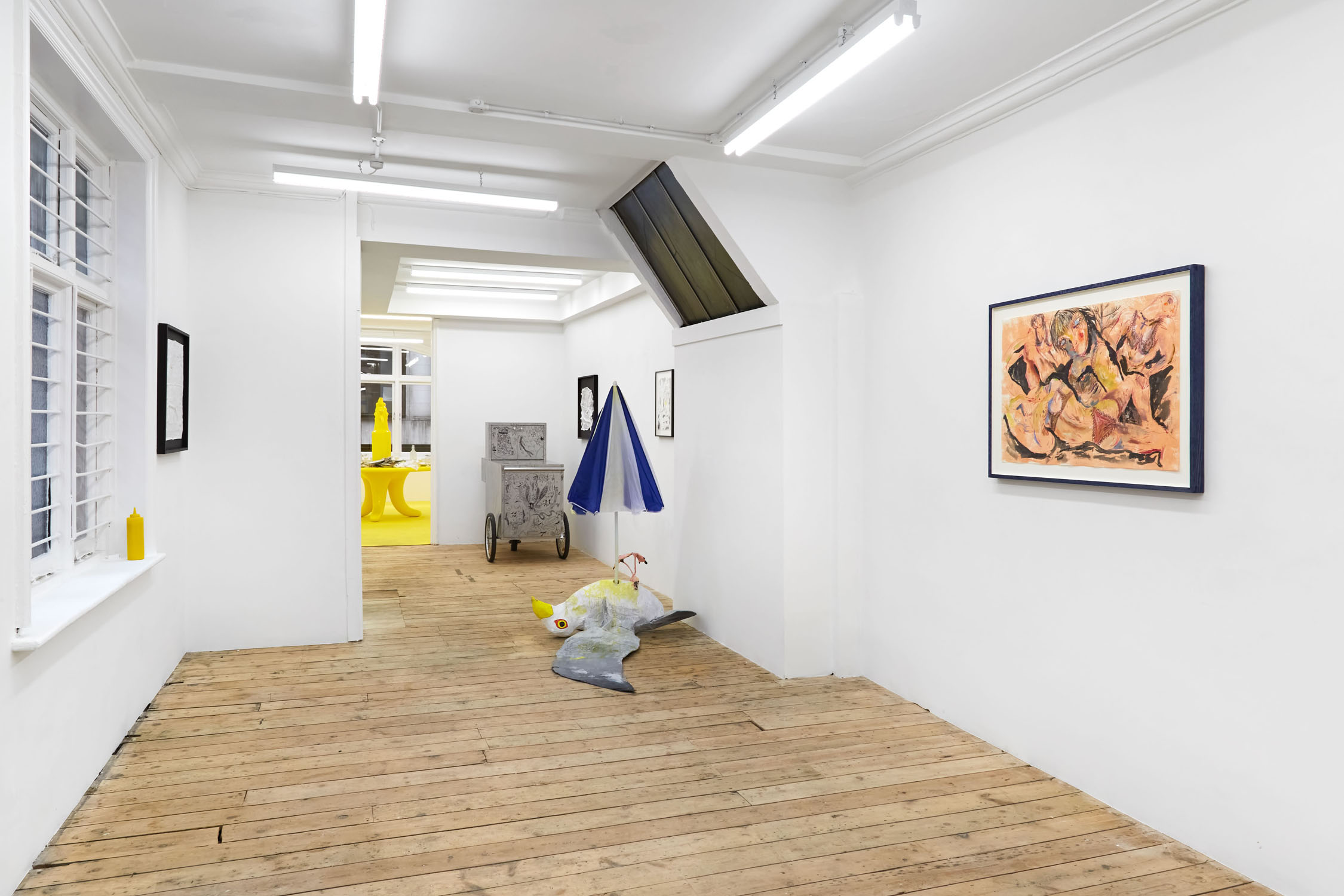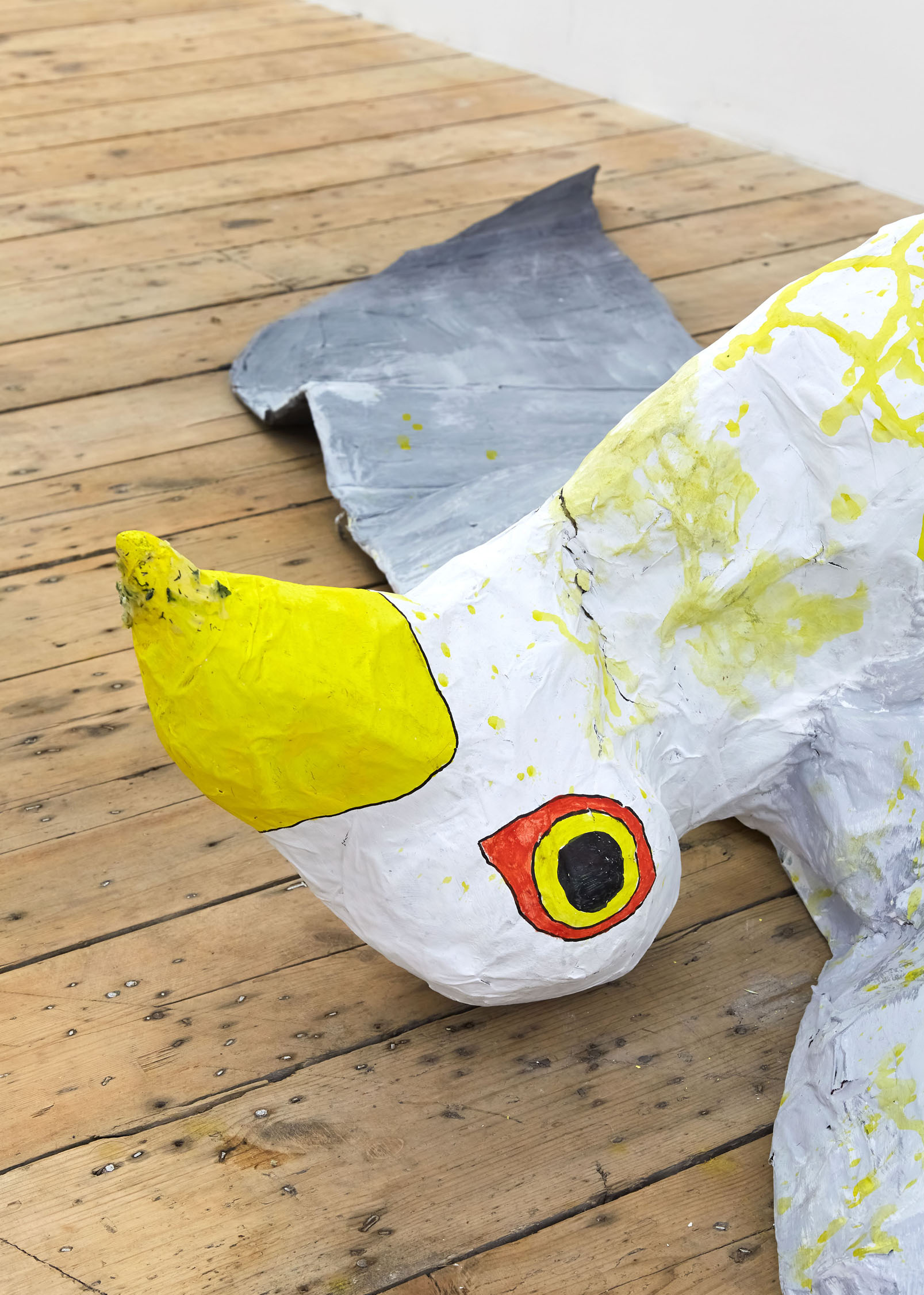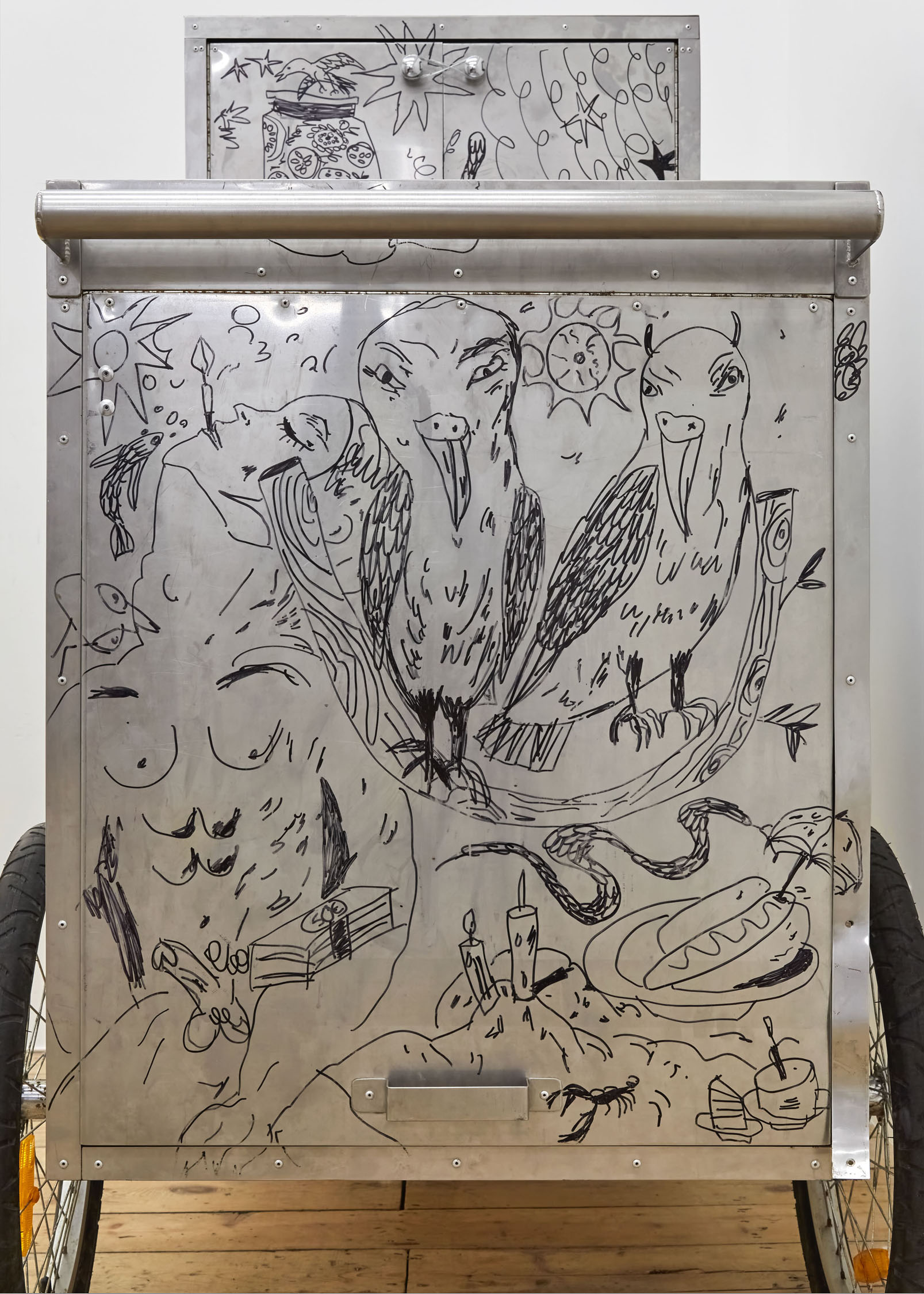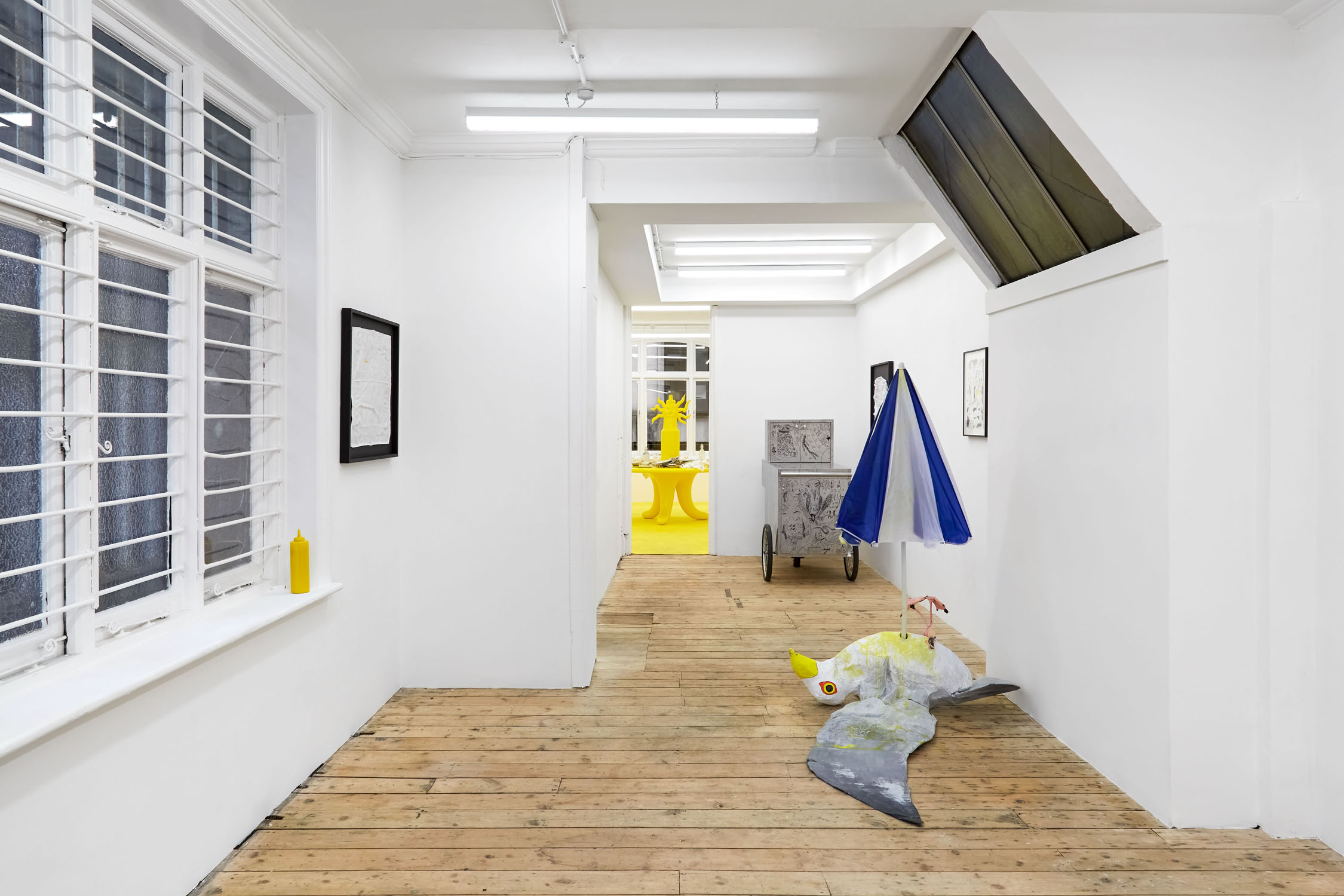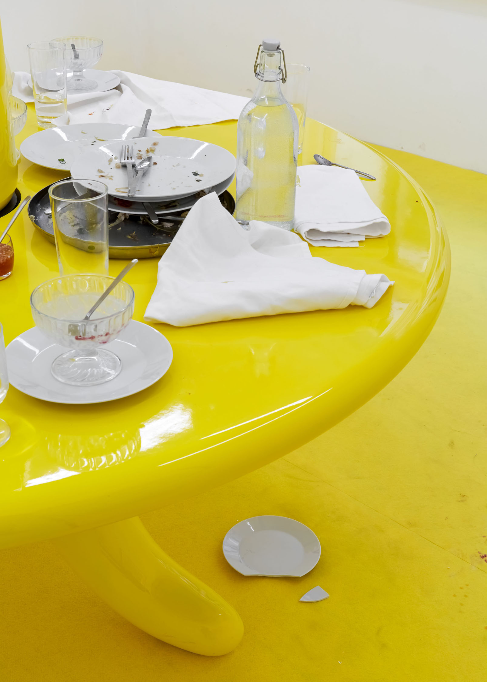 Maria Metsalu gives TINA and its London audience a new iteration of Kultuur, an ongoing performance work that animates a dialogue with the sun. Kultuur presents an anthropomorphised wildflower as an object of spectacle, while at the same time illuminating and complexifying some universal paradoxes of existence; the sun as something that gives life and energy, but something that can burn right through it. Metsalu confronts audiences in such a way that also scorns this spectacle, and the performance offers a moment of reflection, for all involved, on participation and complicity – a collective assemblage of exchange, of ritual, of unexpected and unknowable participation. The performance begins in the street, where people witness the artist’s interactions with a ubiquitous element of urban life, the hotdog vendor. With a hypnotic candour, and with intensities varying between states of pleasure, indifference, suffering and hope, audiences are led, pied piper-like, to TINA. Here, the collective body of the audience orbit the sun – an environment collaboratively made by Metsalu and Boumjimar in the gallery space. Kultuur includes the collaboration of various other artists in its conception and production; a text written by Jaakko Pallasvuo, sound design by Artjom Astrov, outfits designed by Kris Lemsalu together with Lotte Jürjendal and CRUDACRUDA, and a range of artefacts designed and built by Nikola Knezevic and Bruno Lillemets. While Karim Boumjimar creates the food as part of Kultuur, for TINA’s edition, Boumjimar presents drawings and ceramics to accompany the event and exhibition. The invited collaborators and the audience of Kultuur are a collective body that is fed, entertained and questioned. At TINA, the performance is divided into two parts – the parade at the hot dog cart and the devouring of the Sun, table d’hôte. Kultuur is a celebration of life and its dualities – a celebration of its fleeting and sensual nature.
