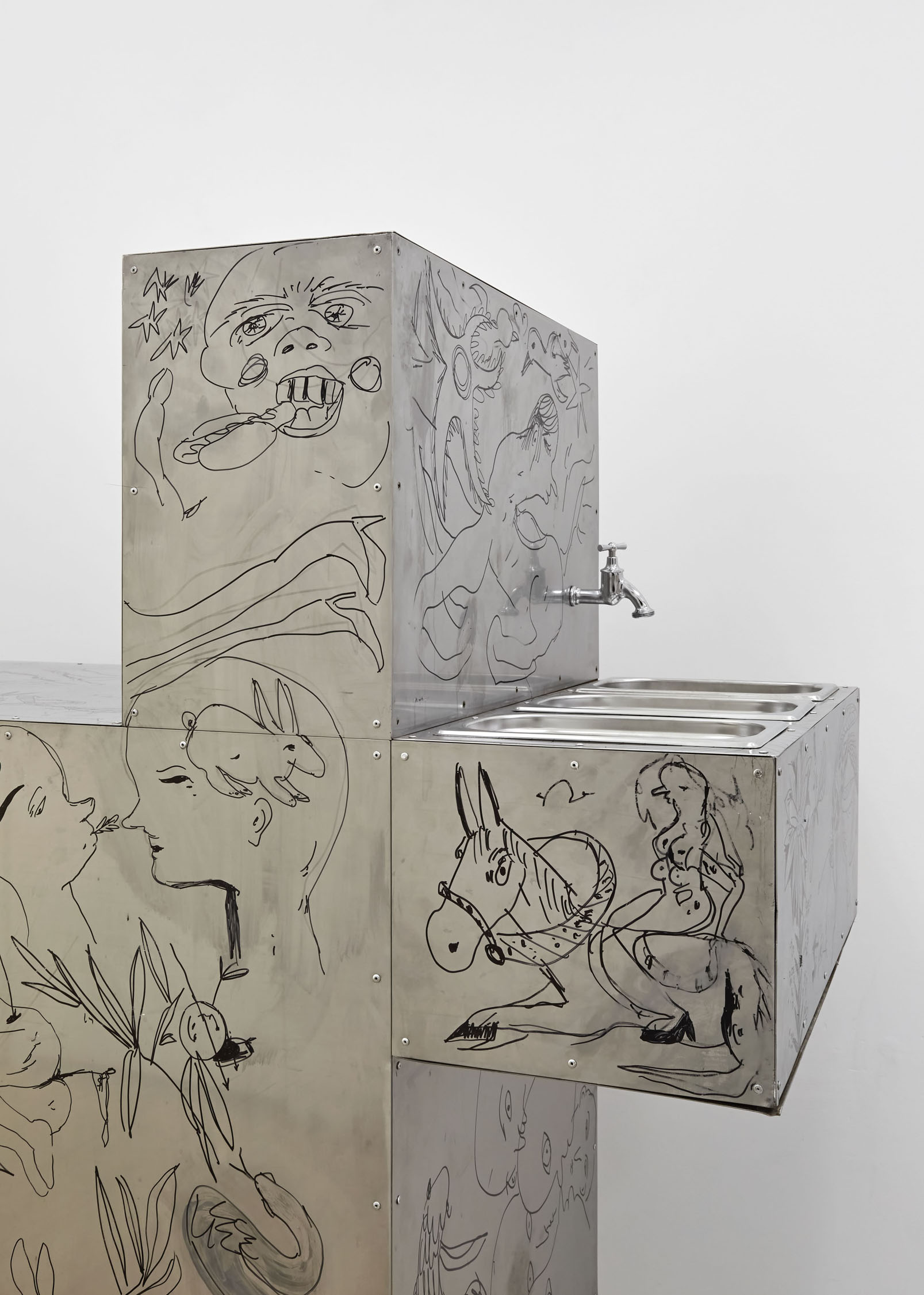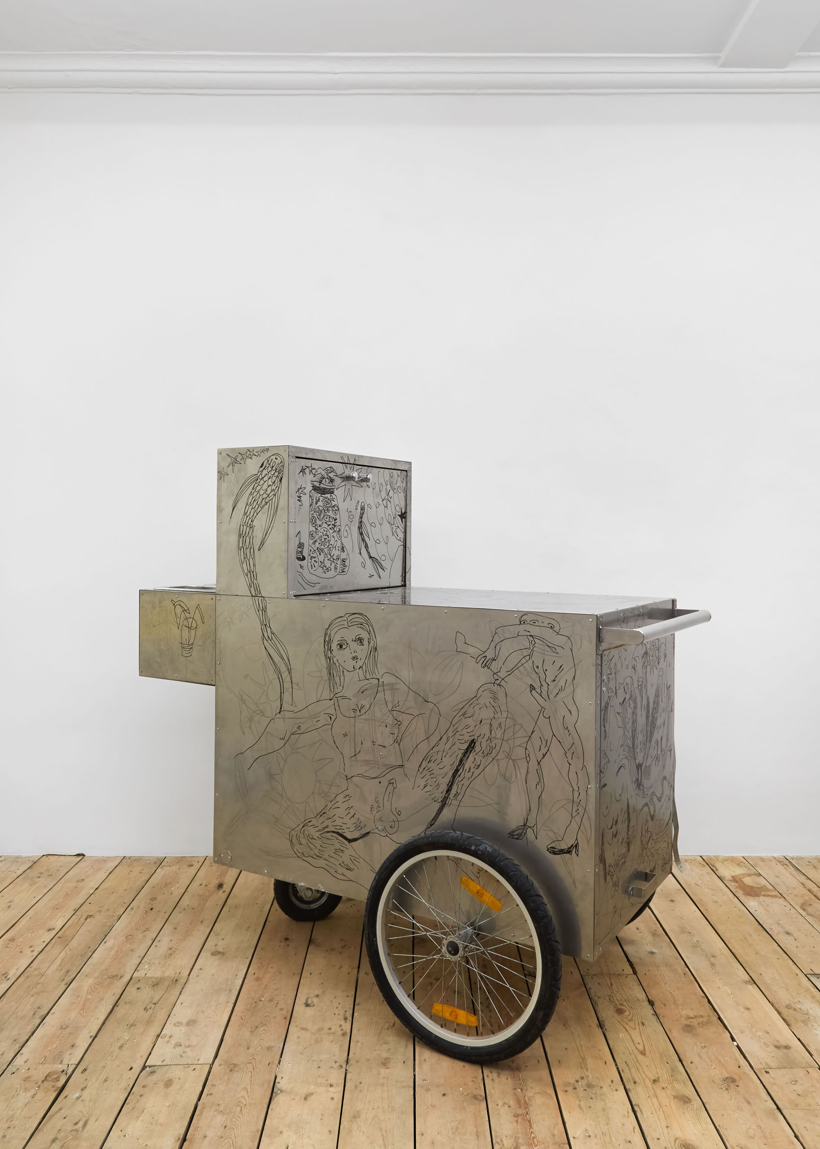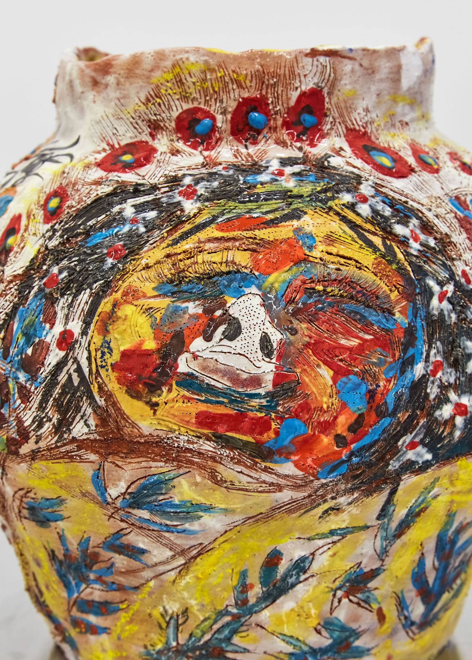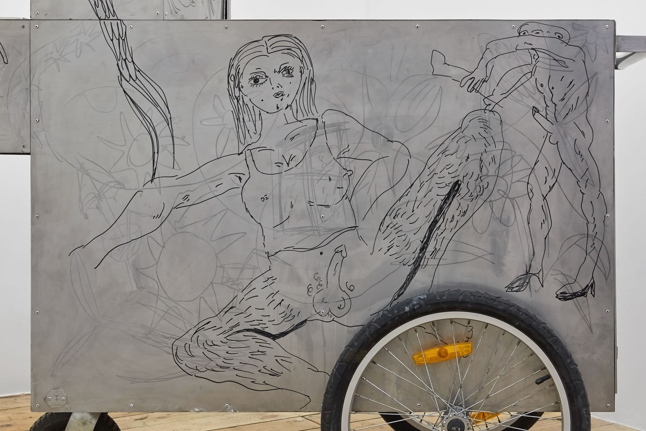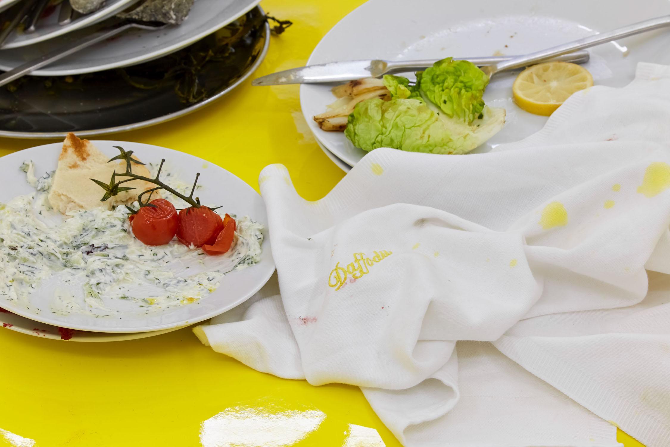 Maria Metsalu gives TINA and its London audience a new iteration of Kultuur, an ongoing performance work that animates a dialogue with the sun. Kultuur presents an anthropomorphised wildflower as an object of spectacle, while at the same time illuminating and complexifying some universal paradoxes of existence; the sun as something that gives life and energy, but something that can burn right through it. Metsalu confronts audiences in such a way that also scorns this spectacle, and the performance offers a moment of reflection, for all involved, on participation and complicity – a collective assemblage of exchange, of ritual, of unexpected and unknowable participation. The performance begins in the street, where people witness the artist’s interactions with a ubiquitous element of urban life, the hotdog vendor. With a hypnotic candour, and with intensities varying between states of pleasure, indifference, suffering and hope, audiences are led, pied piper-like, to TINA. Here, the collective body of the audience orbit the sun – an environment collaboratively made by Metsalu and Boumjimar in the gallery space. Kultuur includes the collaboration of various other artists in its conception and production; a text written by Jaakko Pallasvuo, sound design by Artjom Astrov, outfits designed by Kris Lemsalu together with Lotte Jürjendal and CRUDACRUDA, and a range of artefacts designed and built by Nikola Knezevic and Bruno Lillemets. While Karim Boumjimar creates the food as part of Kultuur, for TINA’s edition, Boumjimar presents drawings and ceramics to accompany the event and exhibition. The invited collaborators and the audience of Kultuur are a collective body that is fed, entertained and questioned. At TINA, the performance is divided into two parts – the parade at the hot dog cart and the devouring of the Sun, table d’hôte. Kultuur is a celebration of life and its dualities – a celebration of its fleeting and sensual nature.