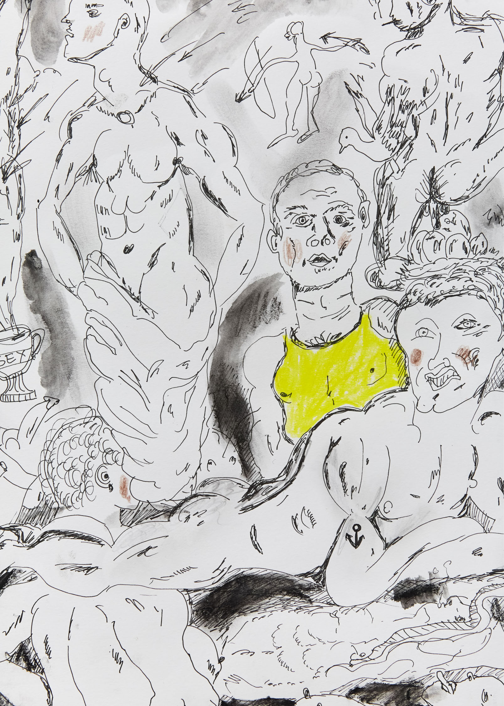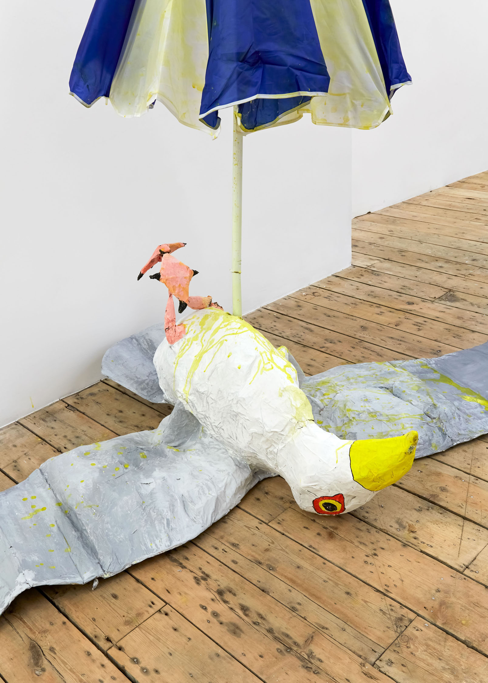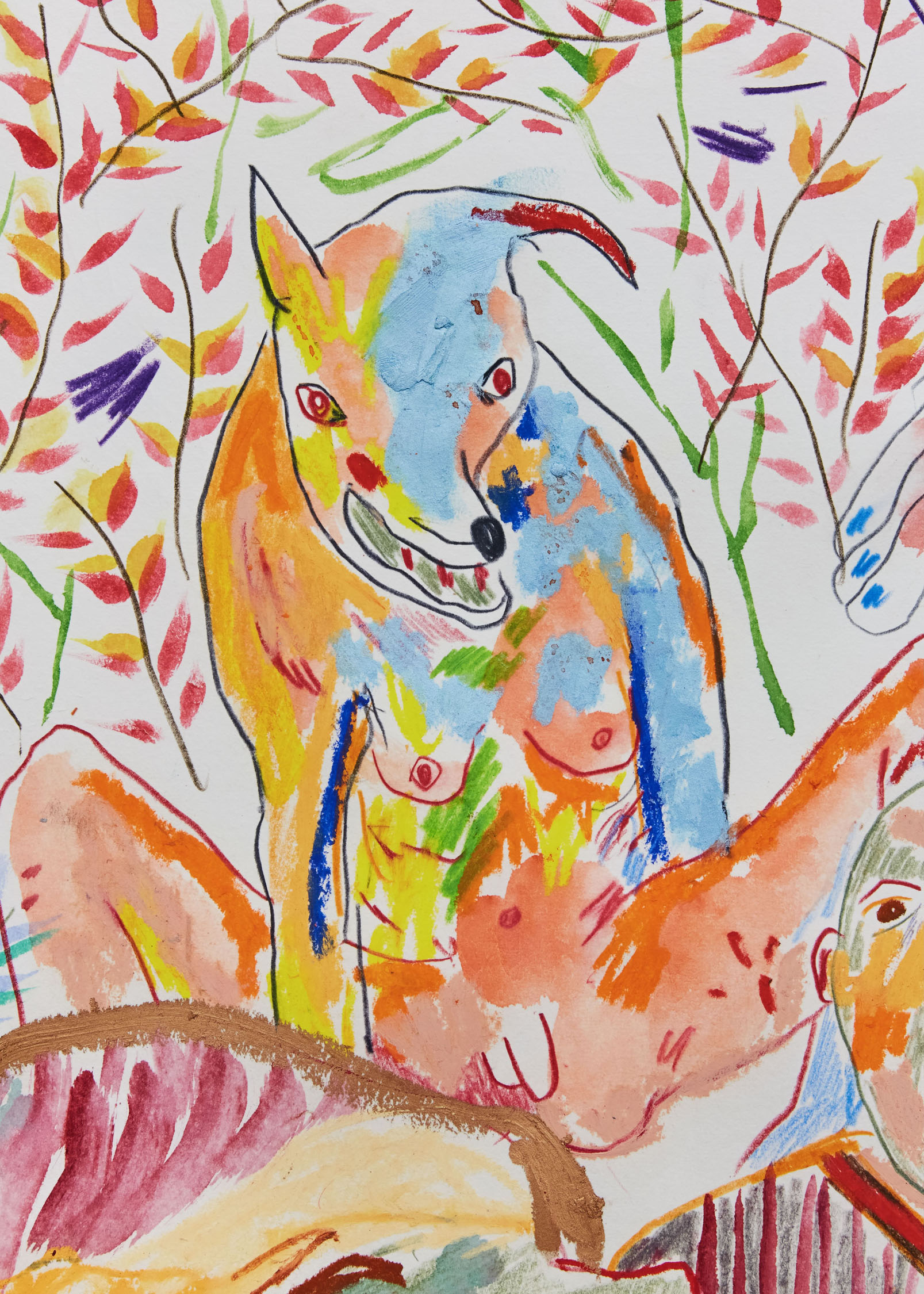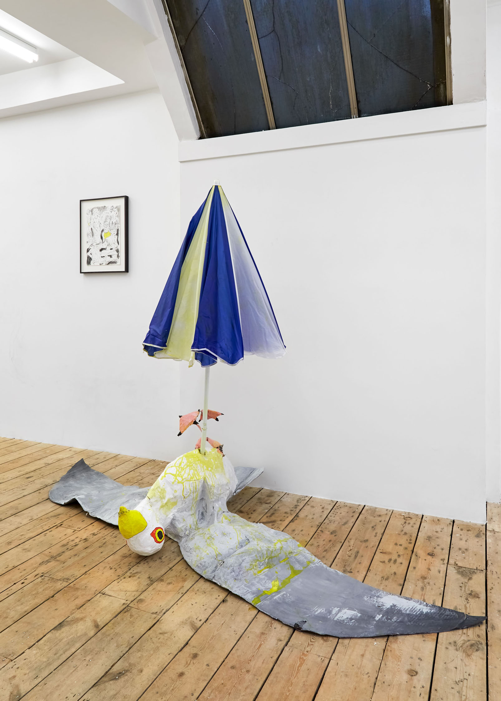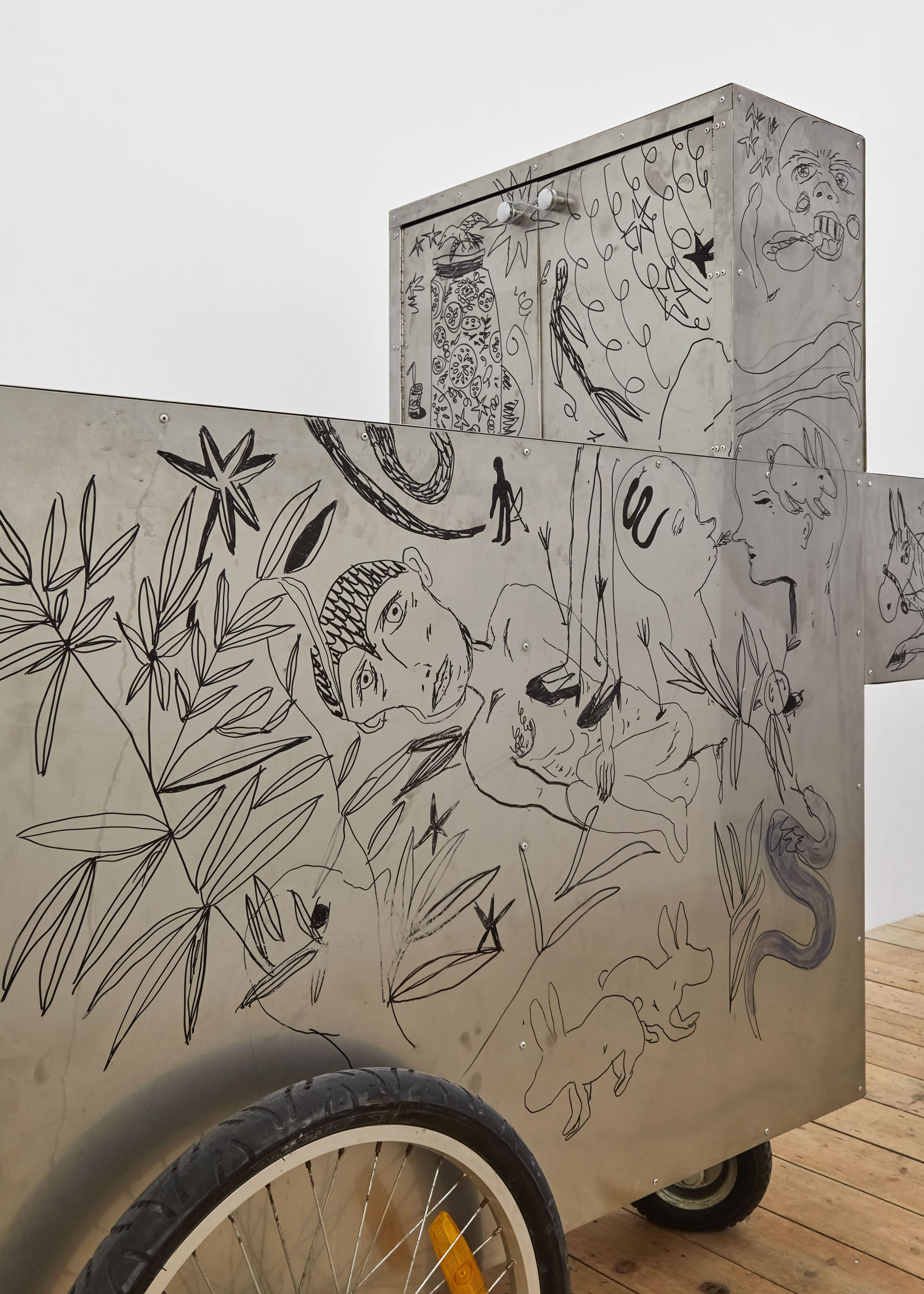 Maria Metsalu gives TINA and its London audience a new iteration of Kultuur, an ongoing performance work that animates a dialogue with the sun. Kultuur presents an anthropomorphised wildflower as an object of spectacle, while at the same time illuminating and complexifying some universal paradoxes of existence; the sun as something that gives life and energy, but something that can burn right through it. Metsalu confronts audiences in such a way that also scorns this spectacle, and the performance offers a moment of reflection, for all involved, on participation and complicity – a collective assemblage of exchange, of ritual, of unexpected and unknowable participation. The performance begins in the street, where people witness the artist’s interactions with a ubiquitous element of urban life, the hotdog vendor. With a hypnotic candour, and with intensities varying between states of pleasure, indifference, suffering and hope, audiences are led, pied piper-like, to TINA. Here, the collective body of the audience orbit the sun – an environment collaboratively made by Metsalu and Boumjimar in the gallery space. Kultuur includes the collaboration of various other artists in its conception and production; a text written by Jaakko Pallasvuo, sound design by Artjom Astrov, outfits designed by Kris Lemsalu together with Lotte Jürjendal and CRUDACRUDA, and a range of artefacts designed and built by Nikola Knezevic and Bruno Lillemets. While Karim Boumjimar creates the food as part of Kultuur, for TINA’s edition, Boumjimar presents drawings and ceramics to accompany the event and exhibition. The invited collaborators and the audience of Kultuur are a collective body that is fed, entertained and questioned. At TINA, the performance is divided into two parts – the parade at the hot dog cart and the devouring of the Sun, table d’hôte. Kultuur is a celebration of life and its dualities – a celebration of its fleeting and sensual nature.
