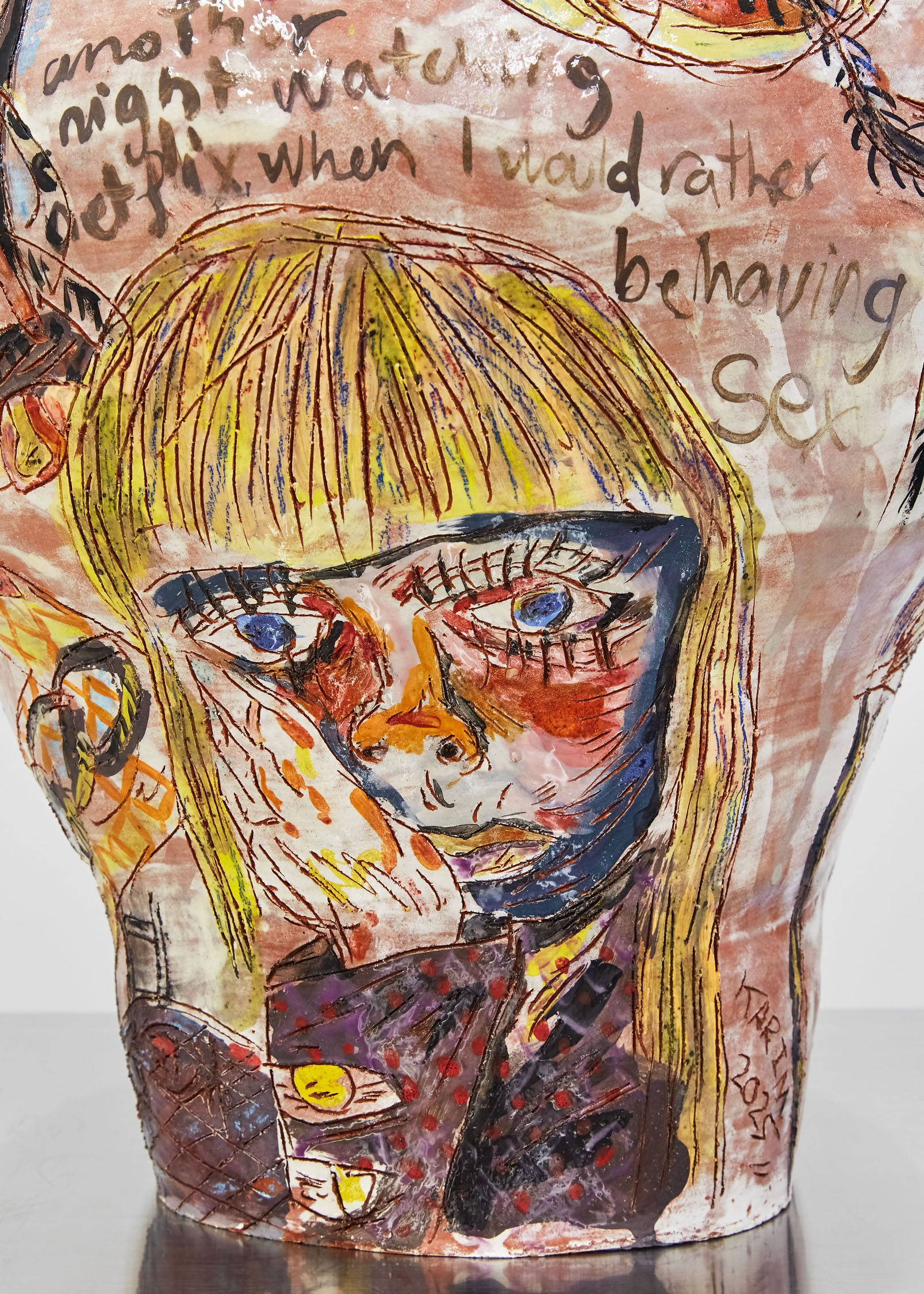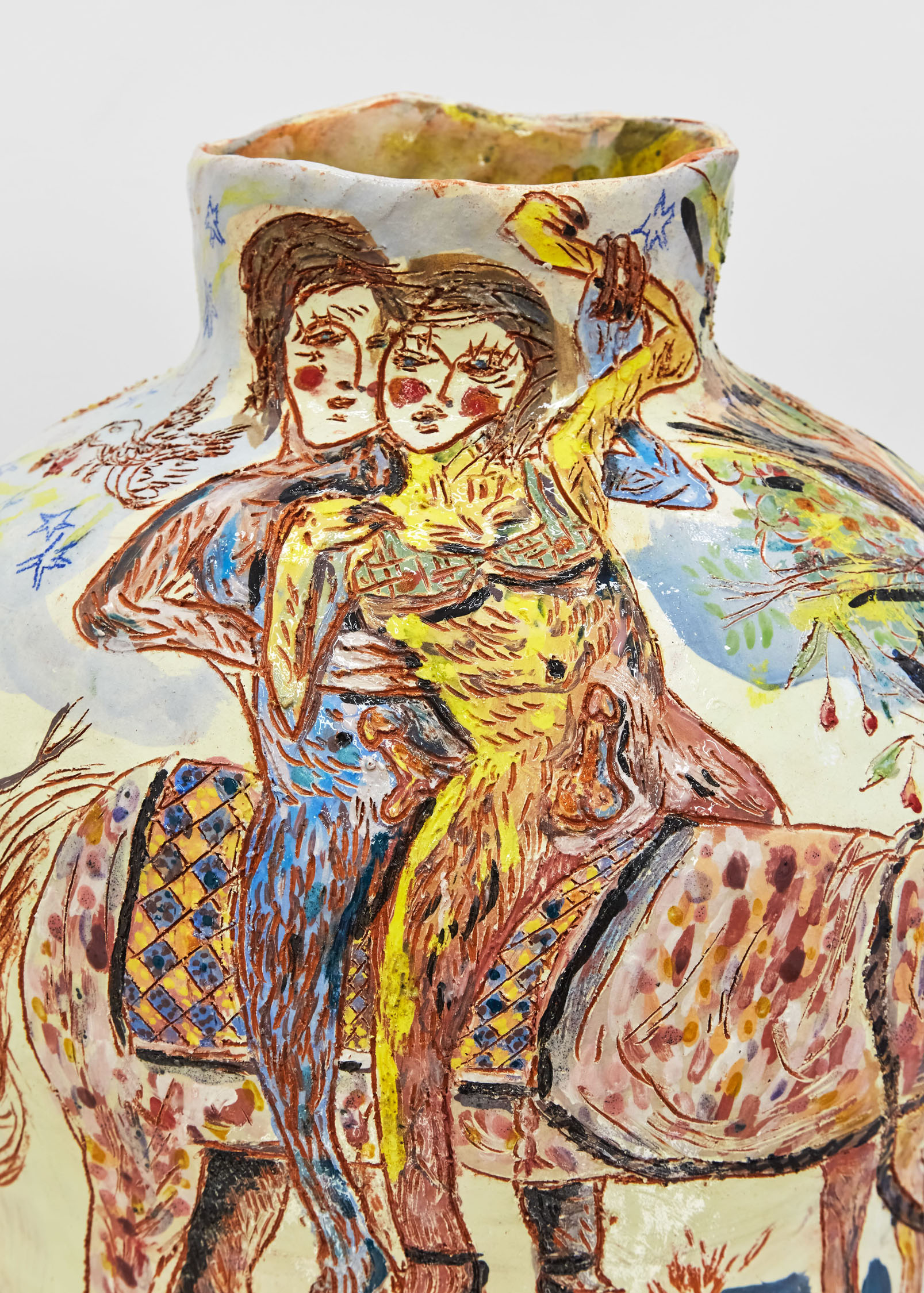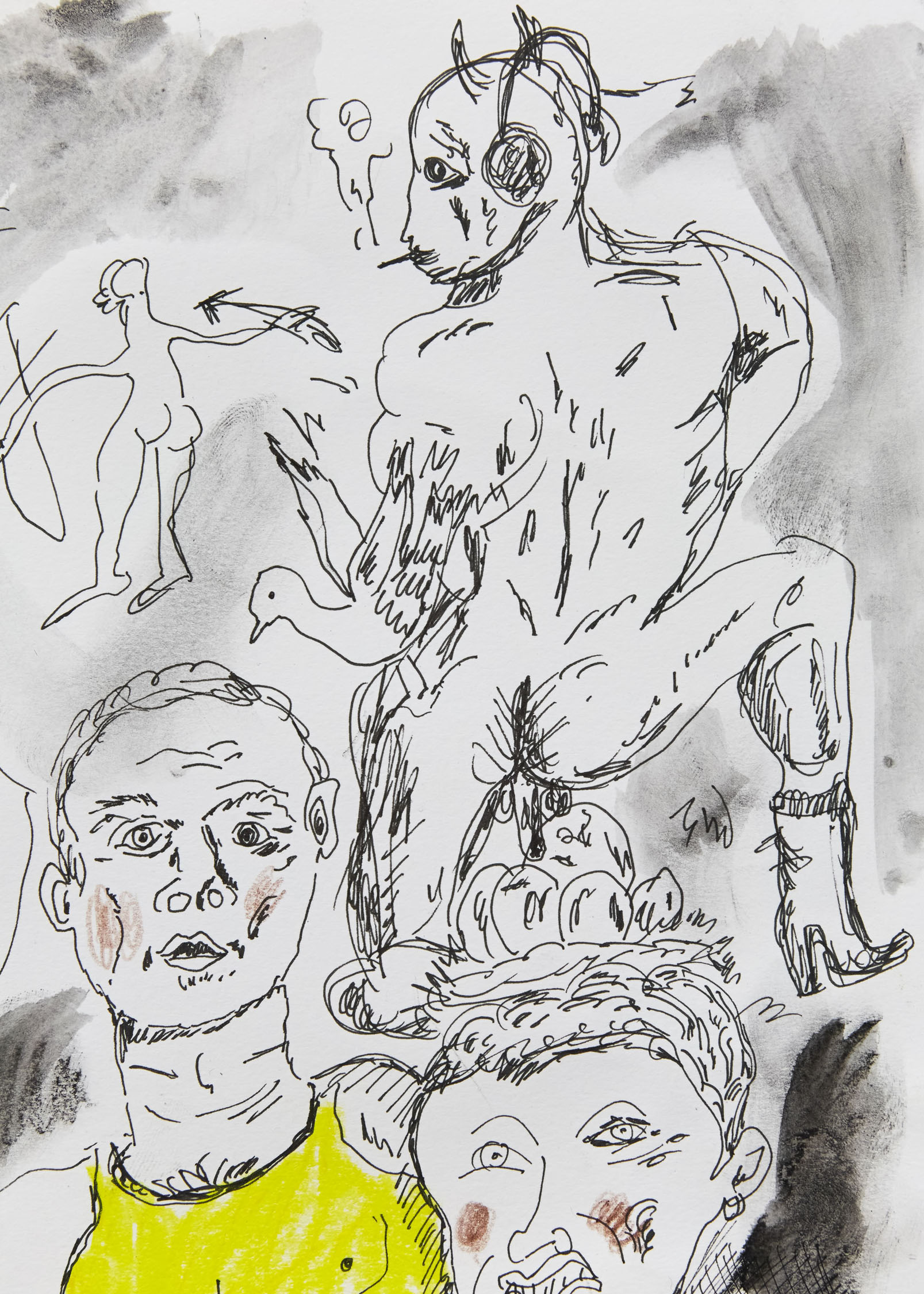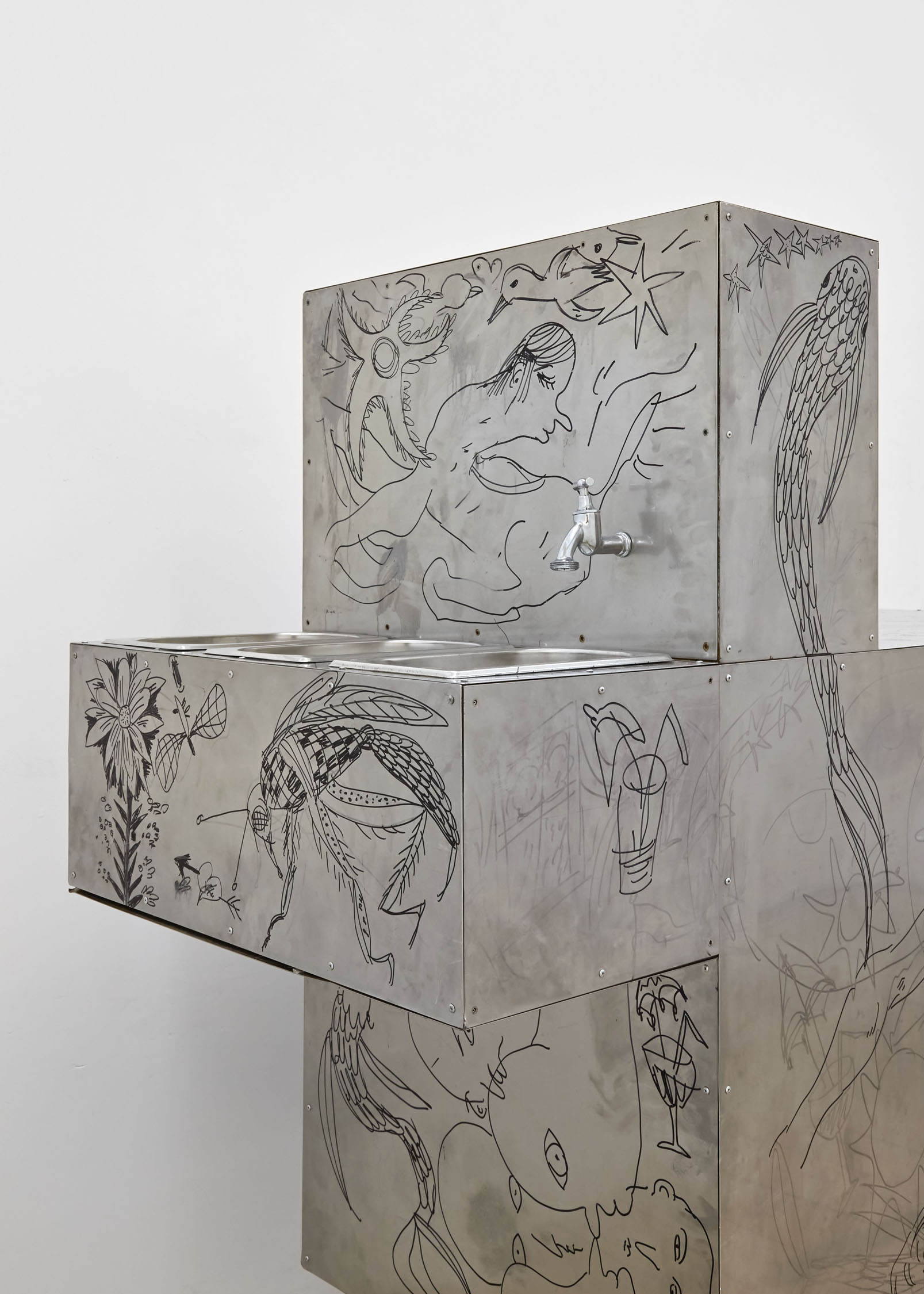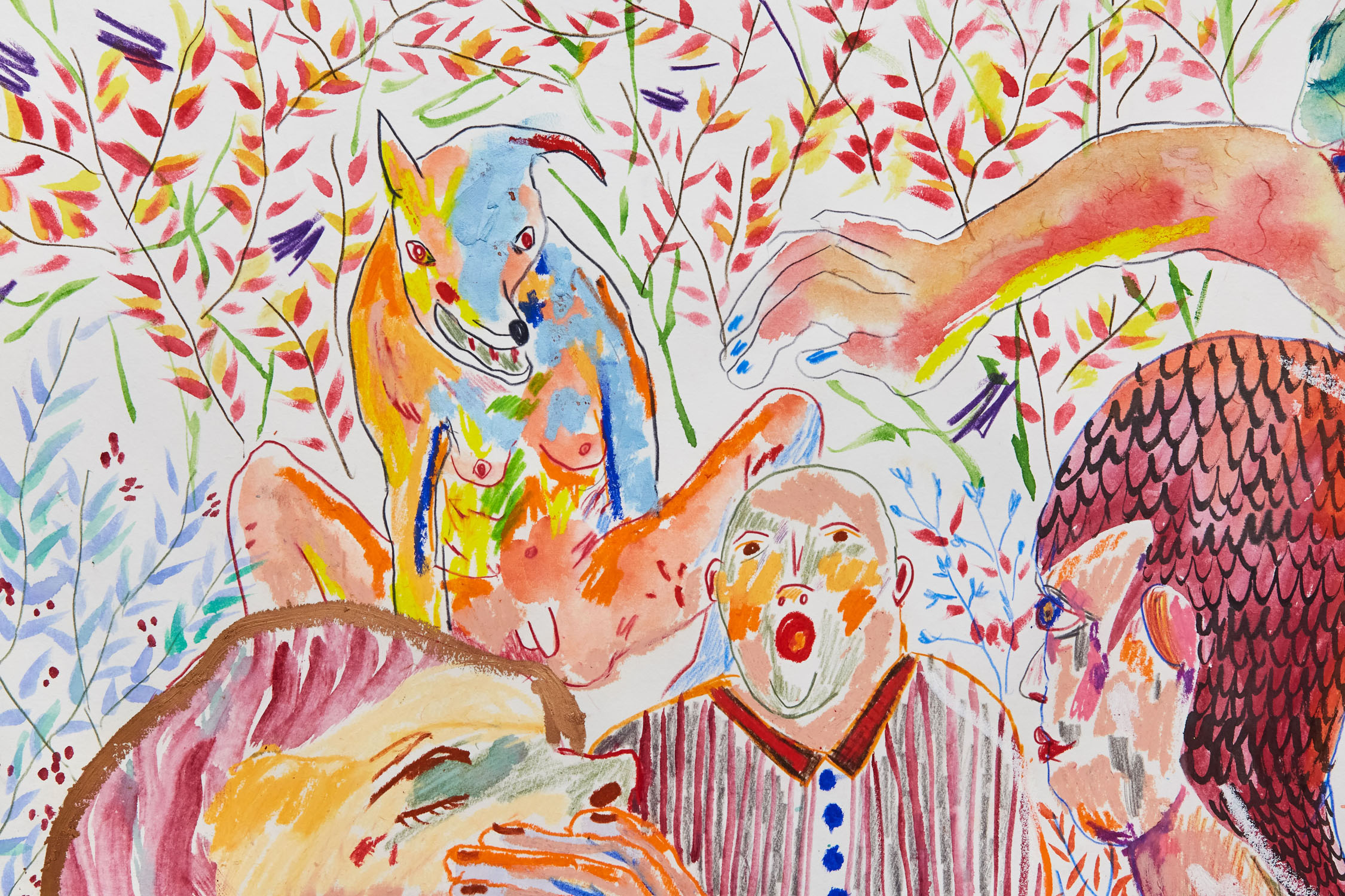 Maria Metsalu gives TINA and its London audience a new iteration of Kultuur, an ongoing performance work that animates a dialogue with the sun. Kultuur presents an anthropomorphised wildflower as an object of spectacle, while at the same time illuminating and complexifying some universal paradoxes of existence; the sun as something that gives life and energy, but something that can burn right through it. Metsalu confronts audiences in such a way that also scorns this spectacle, and the performance offers a moment of reflection, for all involved, on participation and complicity – a collective assemblage of exchange, of ritual, of unexpected and unknowable participation. The performance begins in the street, where people witness the artist’s interactions with a ubiquitous element of urban life, the hotdog vendor. With a hypnotic candour, and with intensities varying between states of pleasure, indifference, suffering and hope, audiences are led, pied piper-like, to TINA. Here, the collective body of the audience orbit the sun – an environment collaboratively made by Metsalu and Boumjimar in the gallery space. Kultuur includes the collaboration of various other artists in its conception and production; a text written by Jaakko Pallasvuo, sound design by Artjom Astrov, outfits designed by Kris Lemsalu together with Lotte Jürjendal and CRUDACRUDA, and a range of artefacts designed and built by Nikola Knezevic and Bruno Lillemets. While Karim Boumjimar creates the food as part of Kultuur, for TINA’s edition, Boumjimar presents drawings and ceramics to accompany the event and exhibition. The invited collaborators and the audience of Kultuur are a collective body that is fed, entertained and questioned. At TINA, the performance is divided into two parts – the parade at the hot dog cart and the devouring of the Sun, table d’hôte. Kultuur is a celebration of life and its dualities – a celebration of its fleeting and sensual nature.