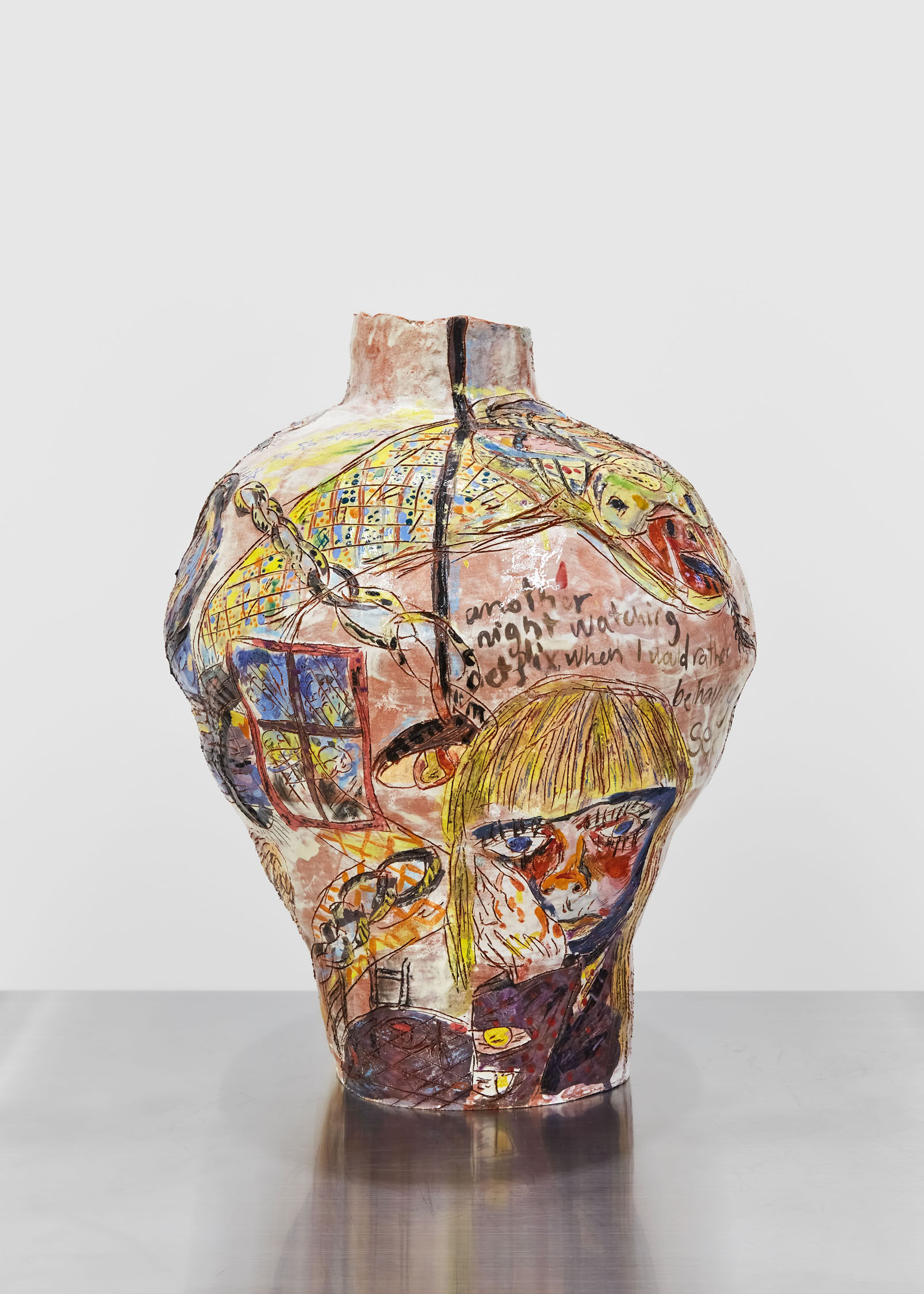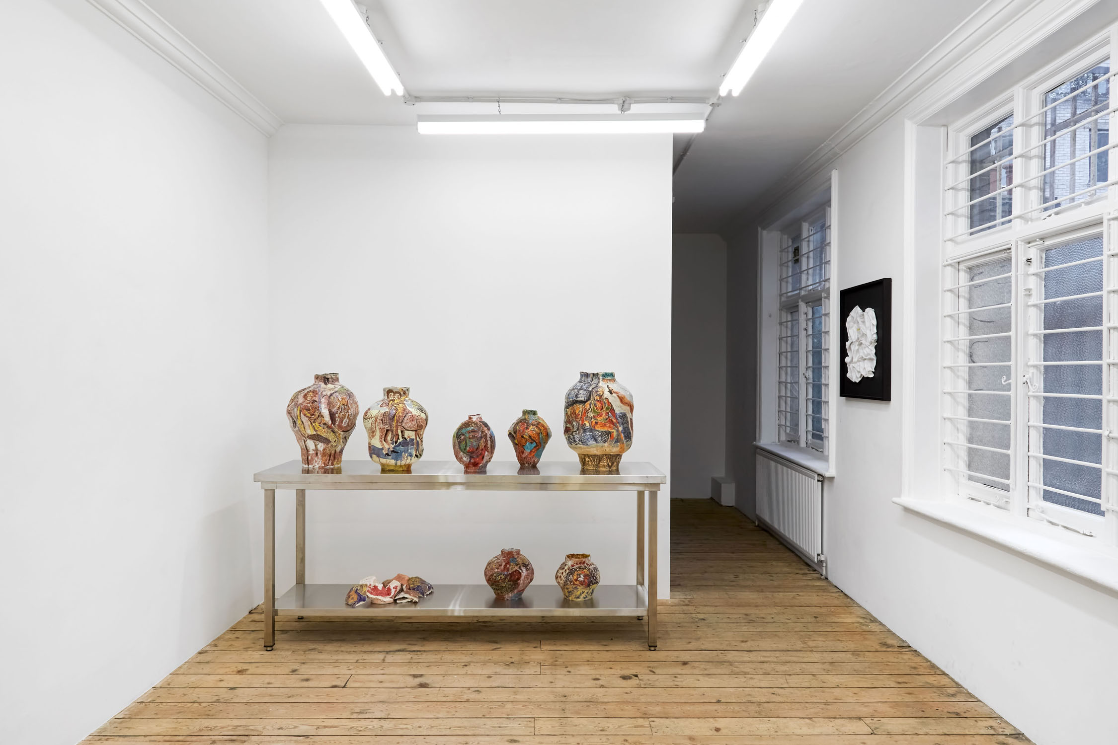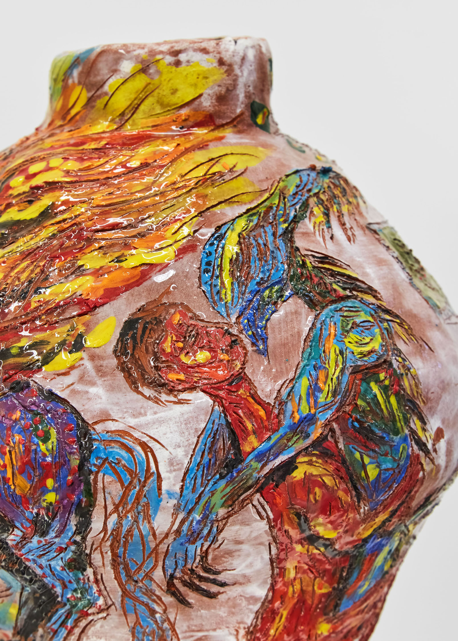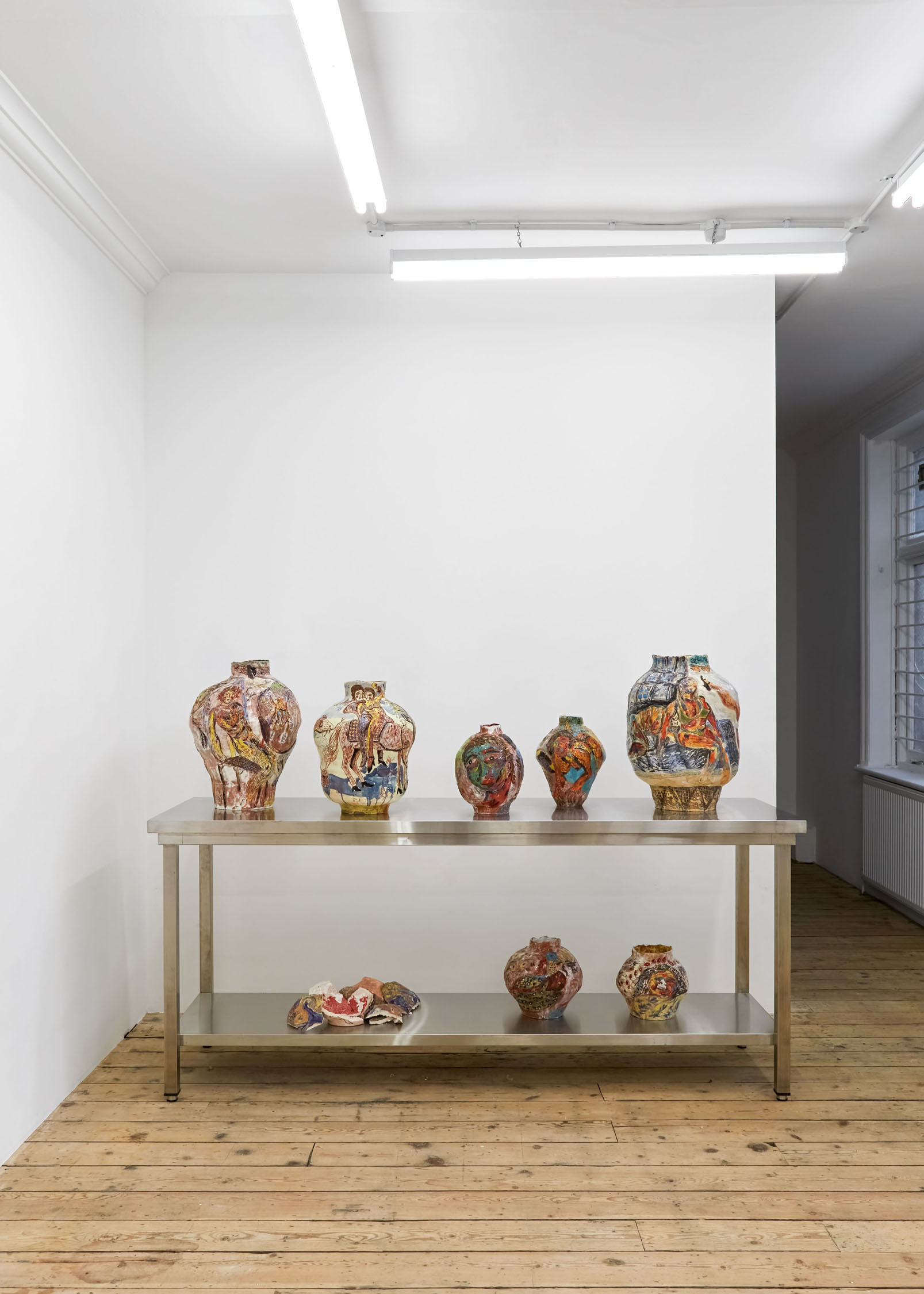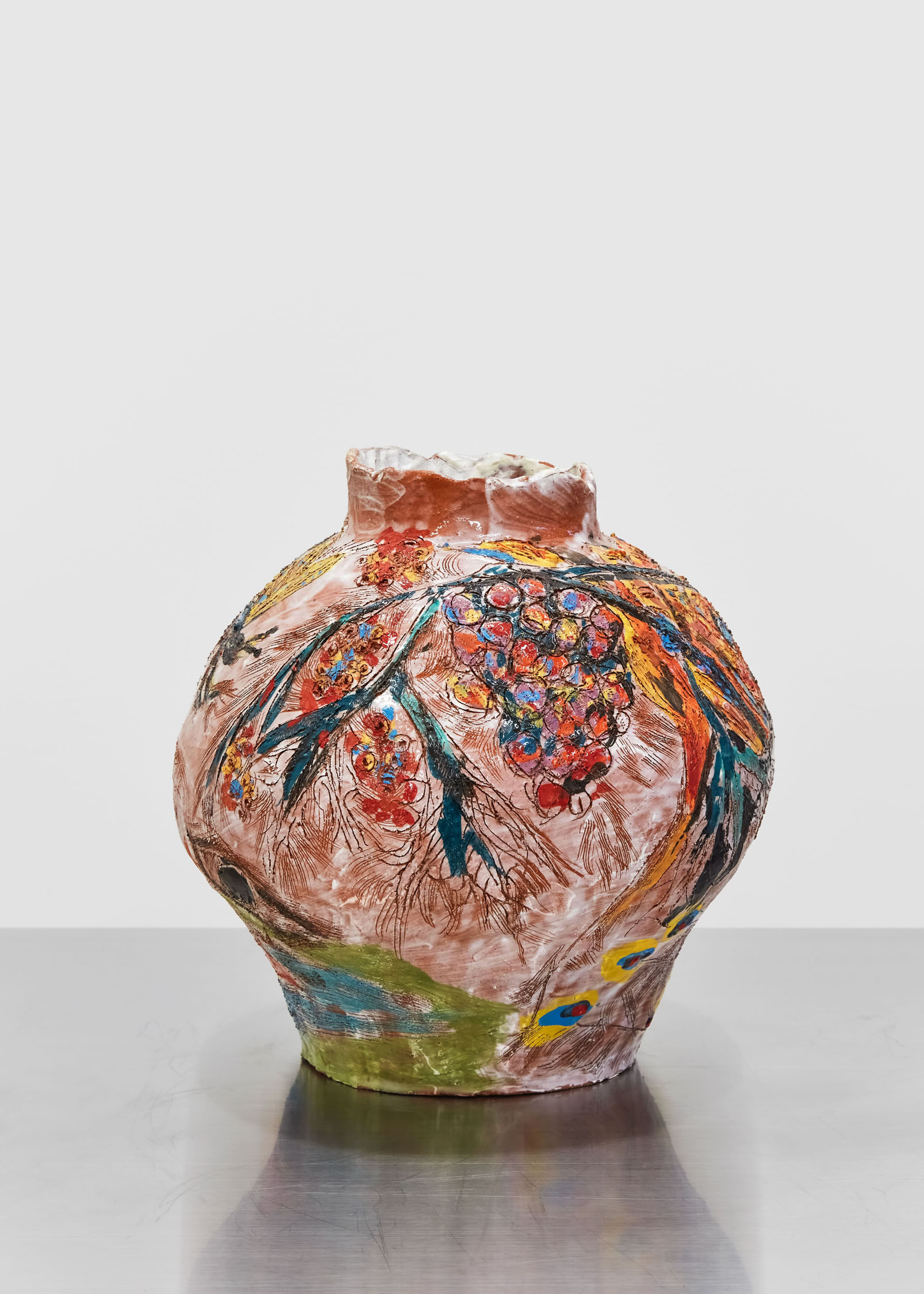 Maria Metsalu gives TINA and its London audience a new iteration of Kultuur, an ongoing performance work that animates a dialogue with the sun. Kultuur presents an anthropomorphised wildflower as an object of spectacle, while at the same time illuminating and complexifying some universal paradoxes of existence; the sun as something that gives life and energy, but something that can burn right through it. Metsalu confronts audiences in such a way that also scorns this spectacle, and the performance offers a moment of reflection, for all involved, on participation and complicity – a collective assemblage of exchange, of ritual, of unexpected and unknowable participation. The performance begins in the street, where people witness the artist’s interactions with a ubiquitous element of urban life, the hotdog vendor. With a hypnotic candour, and with intensities varying between states of pleasure, indifference, suffering and hope, audiences are led, pied piper-like, to TINA. Here, the collective body of the audience orbit the sun – an environment collaboratively made by Metsalu and Boumjimar in the gallery space. Kultuur includes the collaboration of various other artists in its conception and production; a text written by Jaakko Pallasvuo, sound design by Artjom Astrov, outfits designed by Kris Lemsalu together with Lotte Jürjendal and CRUDACRUDA, and a range of artefacts designed and built by Nikola Knezevic and Bruno Lillemets. While Karim Boumjimar creates the food as part of Kultuur, for TINA’s edition, Boumjimar presents drawings and ceramics to accompany the event and exhibition. The invited collaborators and the audience of Kultuur are a collective body that is fed, entertained and questioned. At TINA, the performance is divided into two parts – the parade at the hot dog cart and the devouring of the Sun, table d’hôte. Kultuur is a celebration of life and its dualities – a celebration of its fleeting and sensual nature.