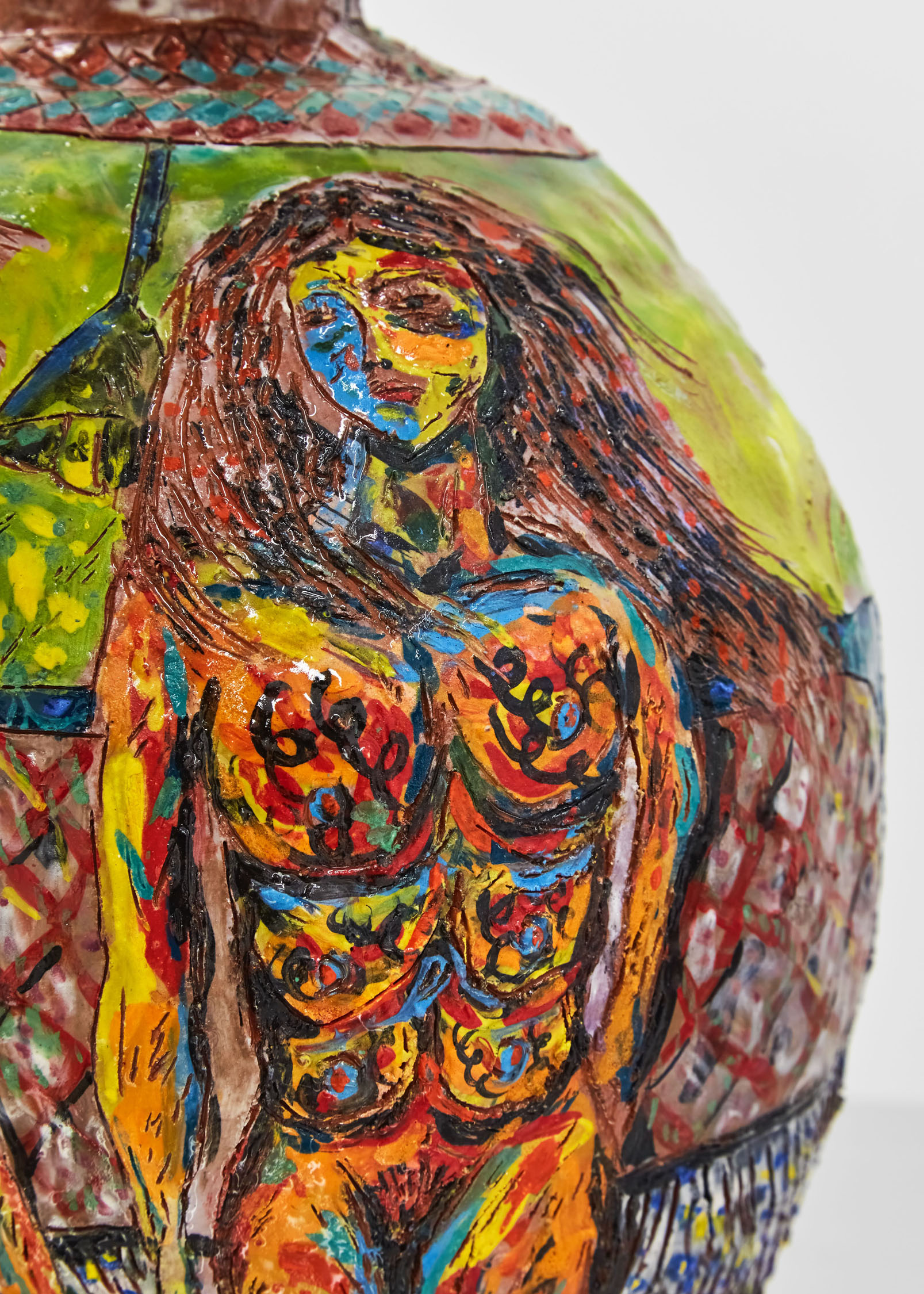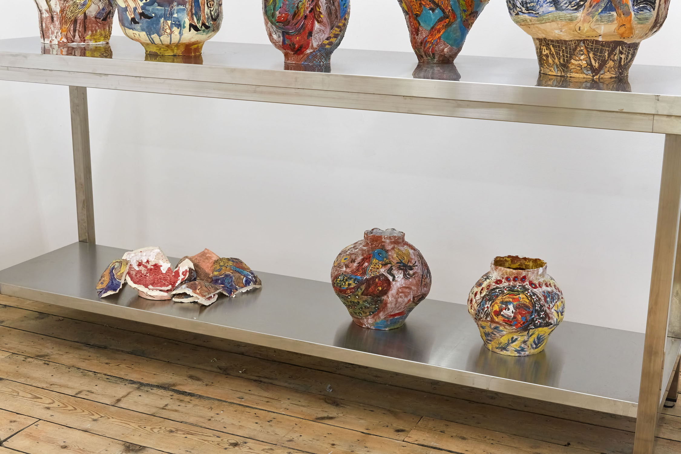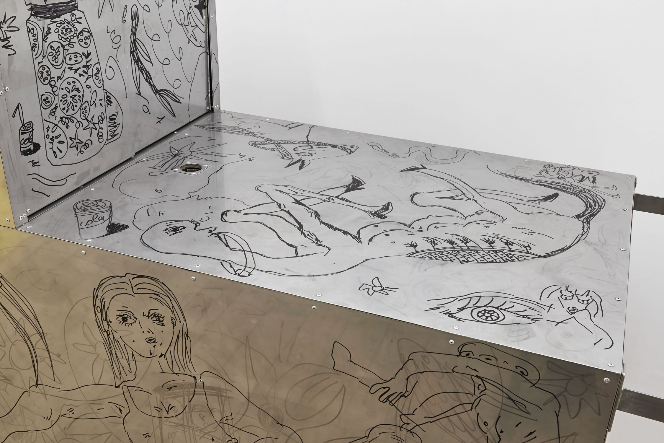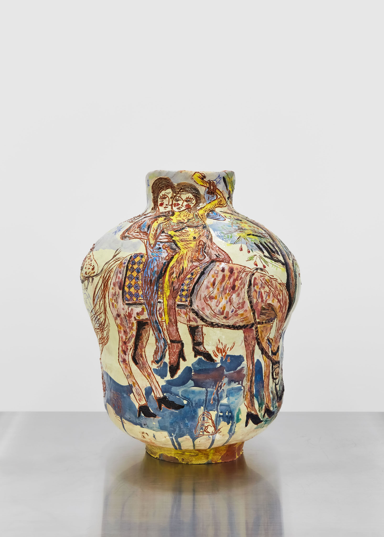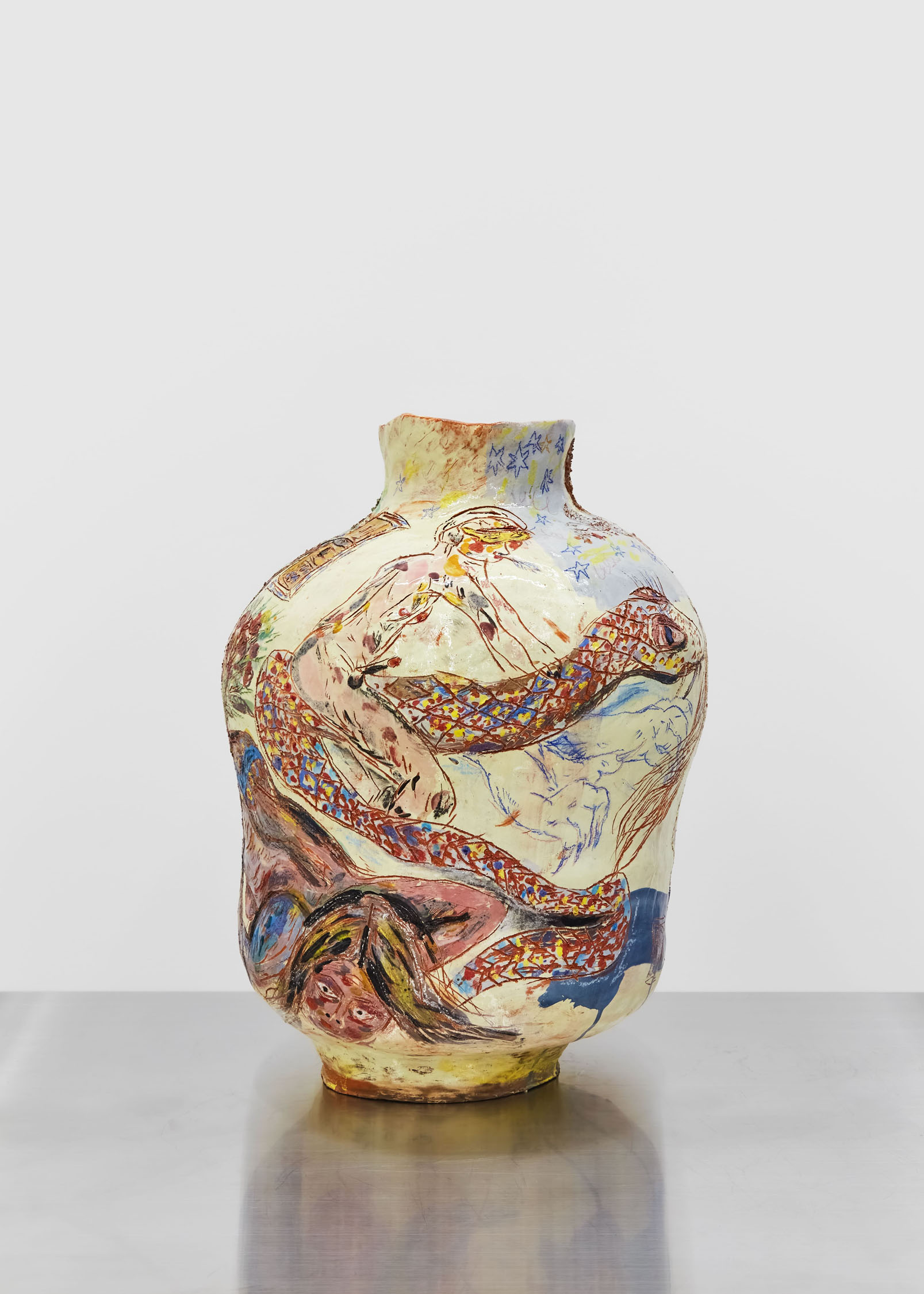 Maria Metsalu gives TINA and its London audience a new iteration of Kultuur, an ongoing performance work that animates a dialogue with the sun. Kultuur presents an anthropomorphised wildflower as an object of spectacle, while at the same time illuminating and complexifying some universal paradoxes of existence; the sun as something that gives life and energy, but something that can burn right through it. Metsalu confronts audiences in such a way that also scorns this spectacle, and the performance offers a moment of reflection, for all involved, on participation and complicity – a collective assemblage of exchange, of ritual, of unexpected and unknowable participation. The performance begins in the street, where people witness the artist’s interactions with a ubiquitous element of urban life, the hotdog vendor. With a hypnotic candour, and with intensities varying between states of pleasure, indifference, suffering and hope, audiences are led, pied piper-like, to TINA. Here, the collective body of the audience orbit the sun – an environment collaboratively made by Metsalu and Boumjimar in the gallery space. Kultuur includes the collaboration of various other artists in its conception and production; a text written by Jaakko Pallasvuo, sound design by Artjom Astrov, outfits designed by Kris Lemsalu together with Lotte Jürjendal and CRUDACRUDA, and a range of artefacts designed and built by Nikola Knezevic and Bruno Lillemets. While Karim Boumjimar creates the food as part of Kultuur, for TINA’s edition, Boumjimar presents drawings and ceramics to accompany the event and exhibition. The invited collaborators and the audience of Kultuur are a collective body that is fed, entertained and questioned. At TINA, the performance is divided into two parts – the parade at the hot dog cart and the devouring of the Sun, table d’hôte. Kultuur is a celebration of life and its dualities – a celebration of its fleeting and sensual nature.