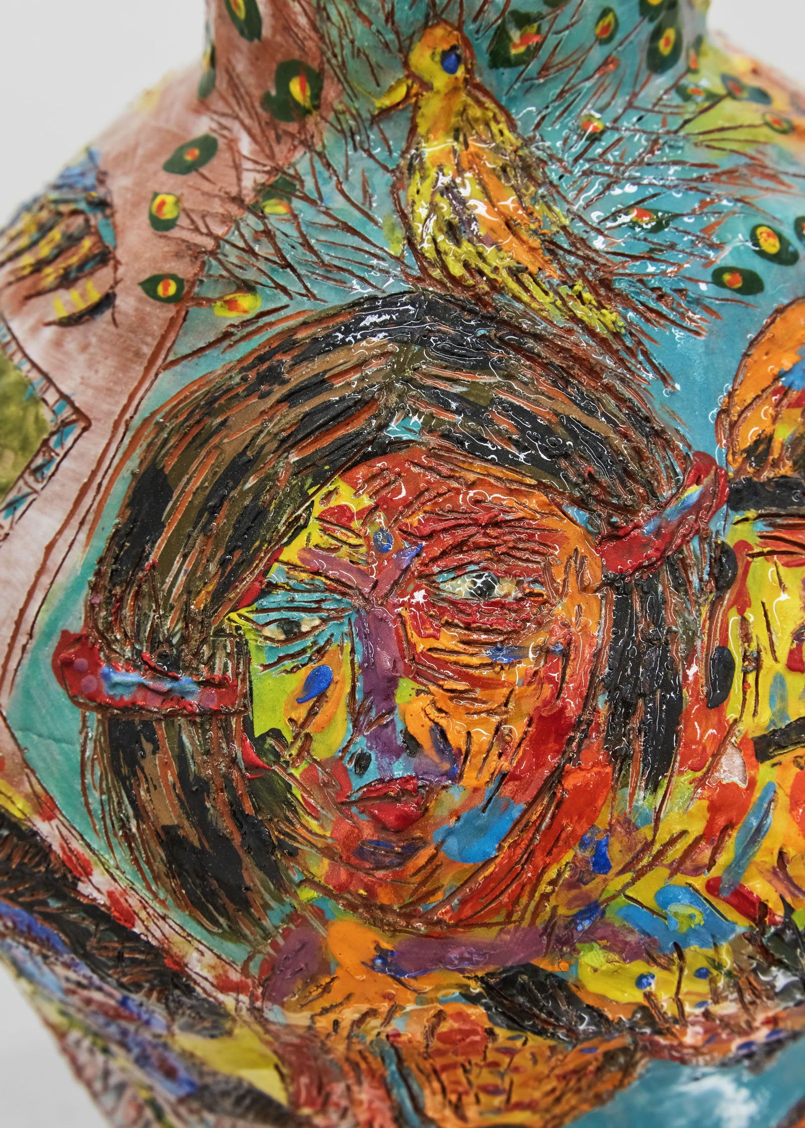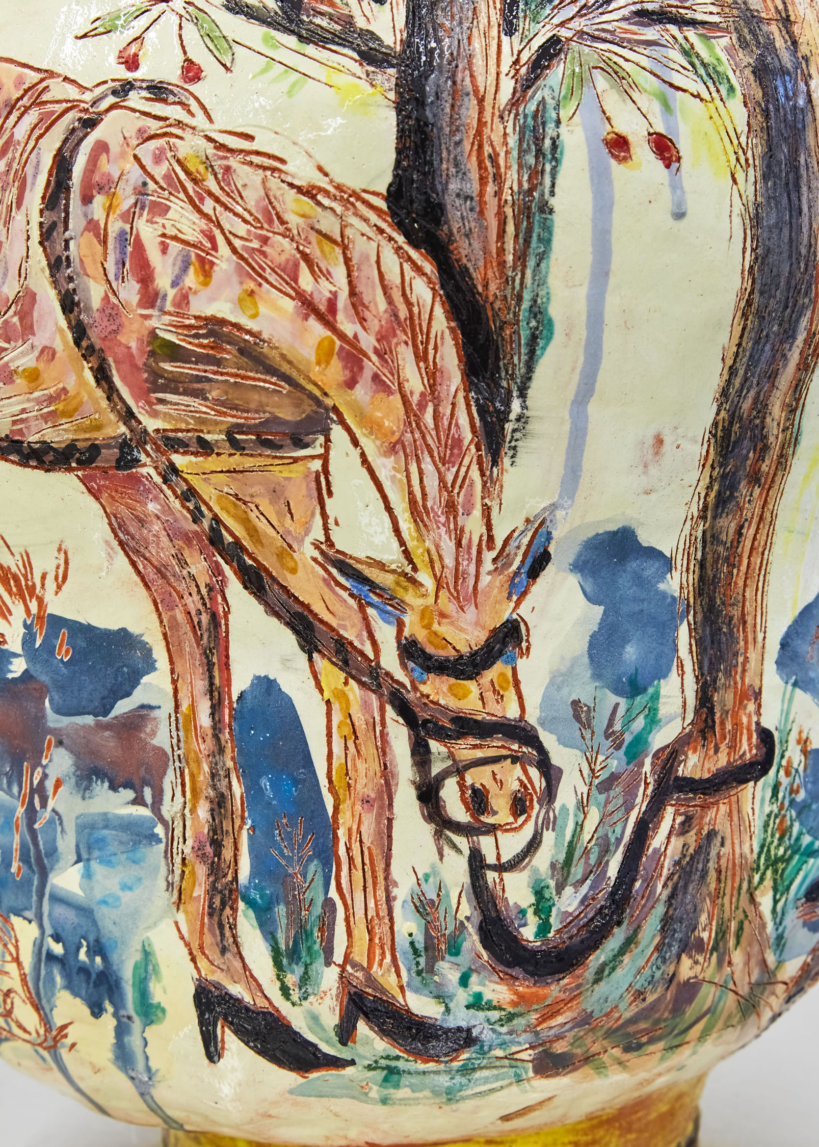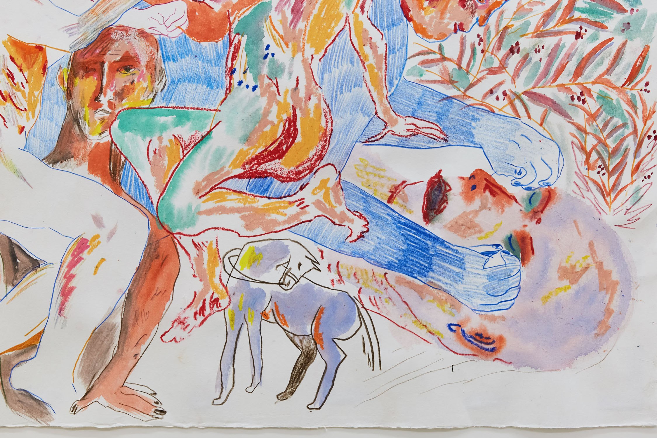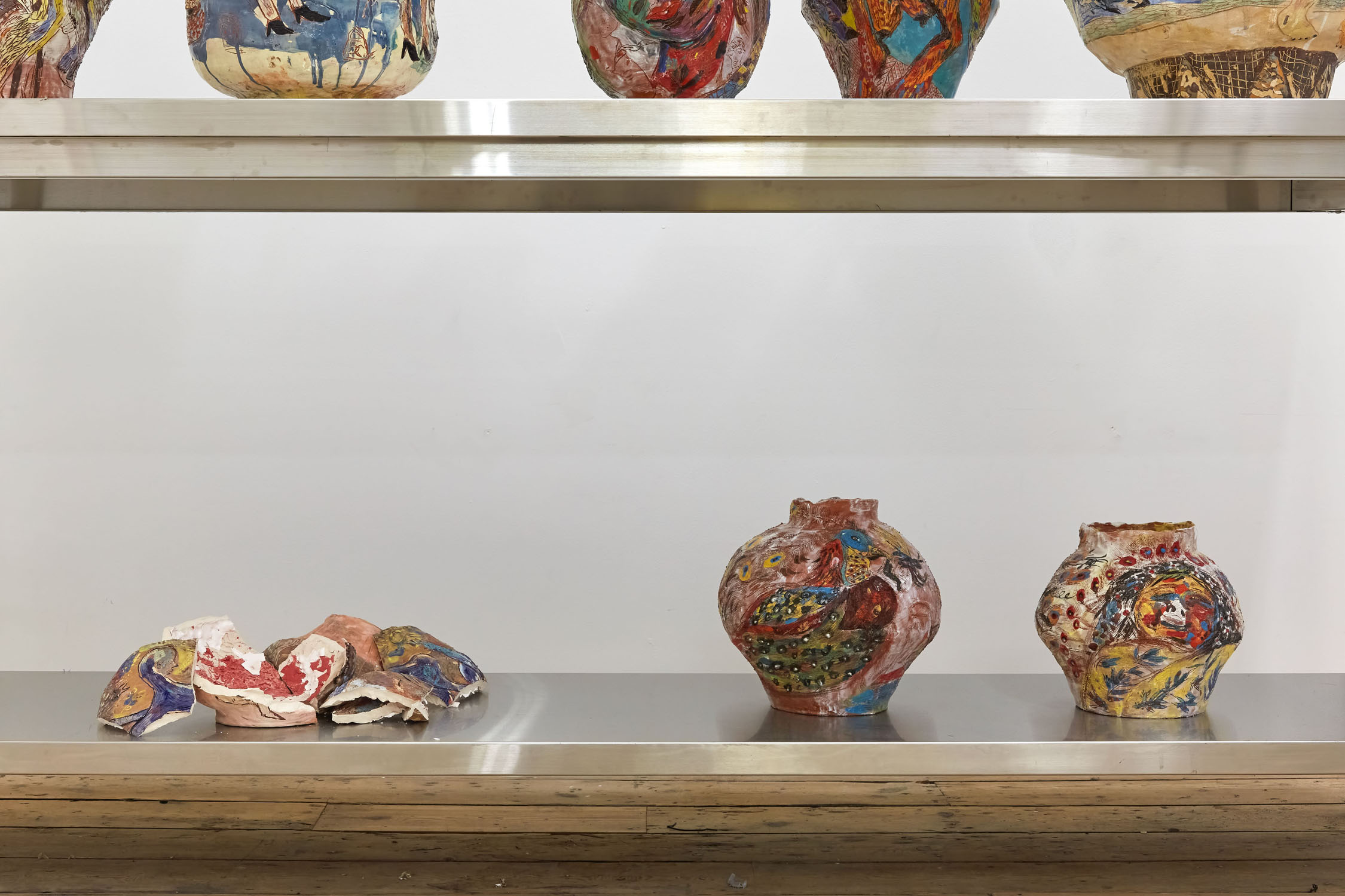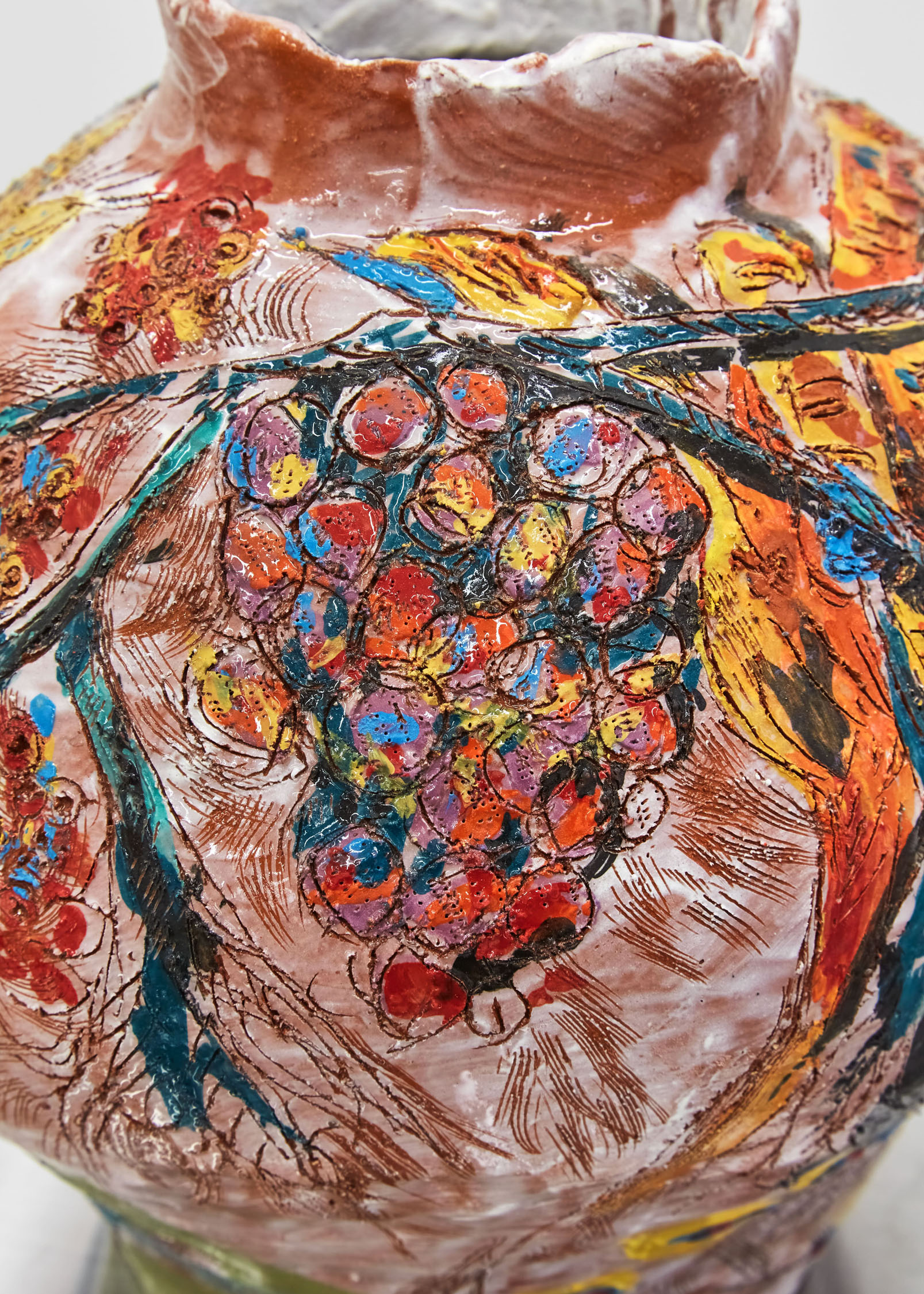 Maria Metsalu gives TINA and its London audience a new iteration of Kultuur, an ongoing performance work that animates a dialogue with the sun. Kultuur presents an anthropomorphised wildflower as an object of spectacle, while at the same time illuminating and complexifying some universal paradoxes of existence; the sun as something that gives life and energy, but something that can burn right through it. Metsalu confronts audiences in such a way that also scorns this spectacle, and the performance offers a moment of reflection, for all involved, on participation and complicity – a collective assemblage of exchange, of ritual, of unexpected and unknowable participation. The performance begins in the street, where people witness the artist’s interactions with a ubiquitous element of urban life, the hotdog vendor. With a hypnotic candour, and with intensities varying between states of pleasure, indifference, suffering and hope, audiences are led, pied piper-like, to TINA. Here, the collective body of the audience orbit the sun – an environment collaboratively made by Metsalu and Boumjimar in the gallery space. Kultuur includes the collaboration of various other artists in its conception and production; a text written by Jaakko Pallasvuo, sound design by Artjom Astrov, outfits designed by Kris Lemsalu together with Lotte Jürjendal and CRUDACRUDA, and a range of artefacts designed and built by Nikola Knezevic and Bruno Lillemets. While Karim Boumjimar creates the food as part of Kultuur, for TINA’s edition, Boumjimar presents drawings and ceramics to accompany the event and exhibition. The invited collaborators and the audience of Kultuur are a collective body that is fed, entertained and questioned. At TINA, the performance is divided into two parts – the parade at the hot dog cart and the devouring of the Sun, table d’hôte. Kultuur is a celebration of life and its dualities – a celebration of its fleeting and sensual nature.
