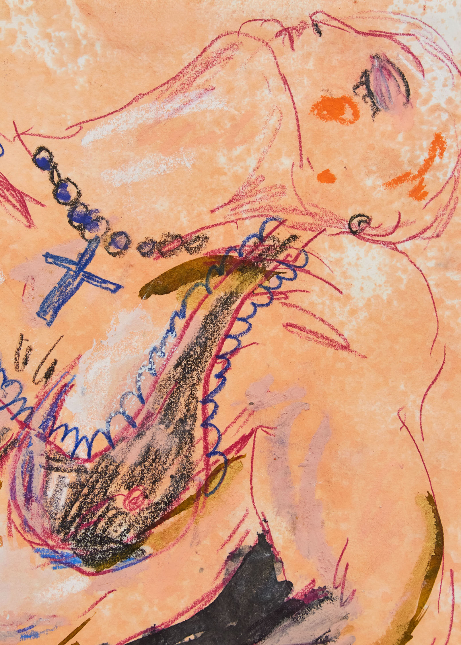 Recent solo exhibitions include Fluid Forms, Alice Folker Gallery, Copenhagen (2023); Stroke, Creator Projects, Copenhagen (2023); Business of Living, NSFW/SVILOVA, Gothenburg (2023); Orgy of Consumption, Springbrættet 6a, Copenhagen (2023); and Alien Water, Art Hub Copenhagen, Copenhagen (2021). Group exhibitions include Queer Ecologies, Centro de Arte la Panera, Lleida (2023); Fear and Fauna, Dag H 42, Copenhagen (2023); Psychopathia Sexualis, O-Overgaden, Copenhagen (2021); Speaking in Tongues, Blake, Vargas, Berlin (2021); Moby Dick, or The Whale, Wu Tsang, Schauspielhaus, Zurich (2021); Popular Courage of Duchess Orchid, Cucina x Copenhill, Copenhagen (2021); Young Girl Reading Group, a performance at Kunstverein, Hamburg (2021); and A Night in Alexander, Alexander Sauna, Athenes (2018).