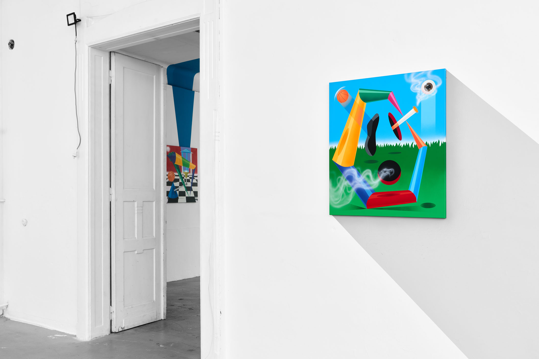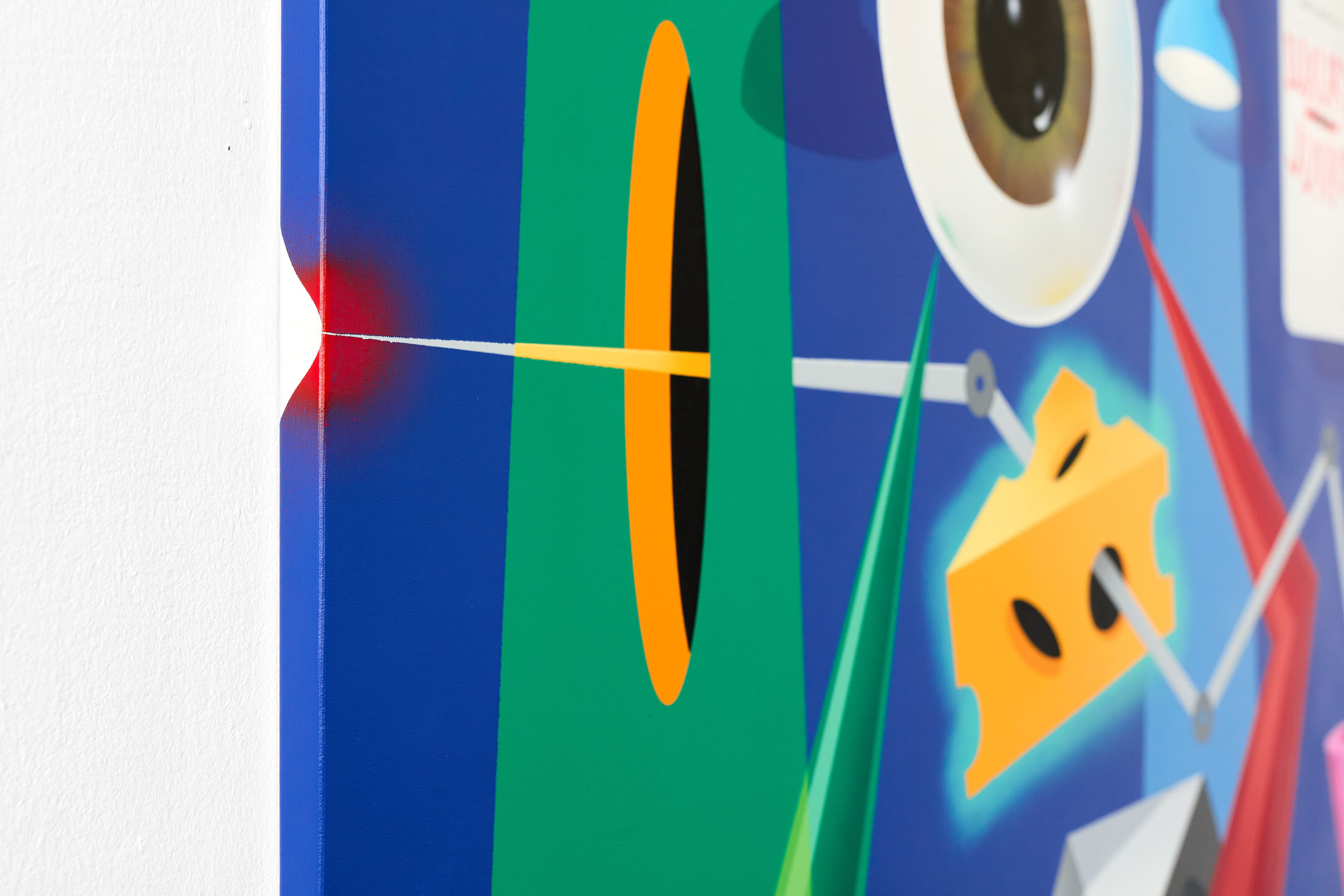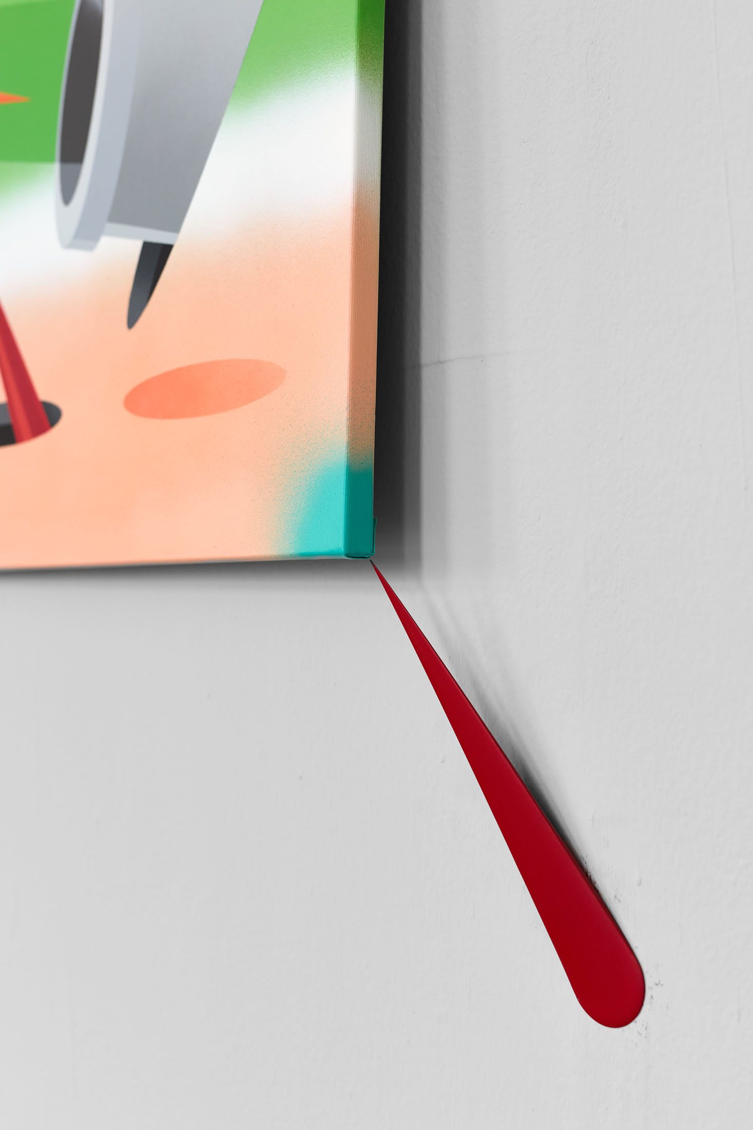 This exhibition’s iconographic exploration of 21st-century post-digital culture no longer unfolds solely within the grid structures dividing the pictorial field. The paintings often extend beyond their own strict flatness, incorporating three-dimensional, installative elements derived from their internal visual logic. These pieces engage in constant communication- with the exhibition space, with details of other paintings, with themselves, and with each other.