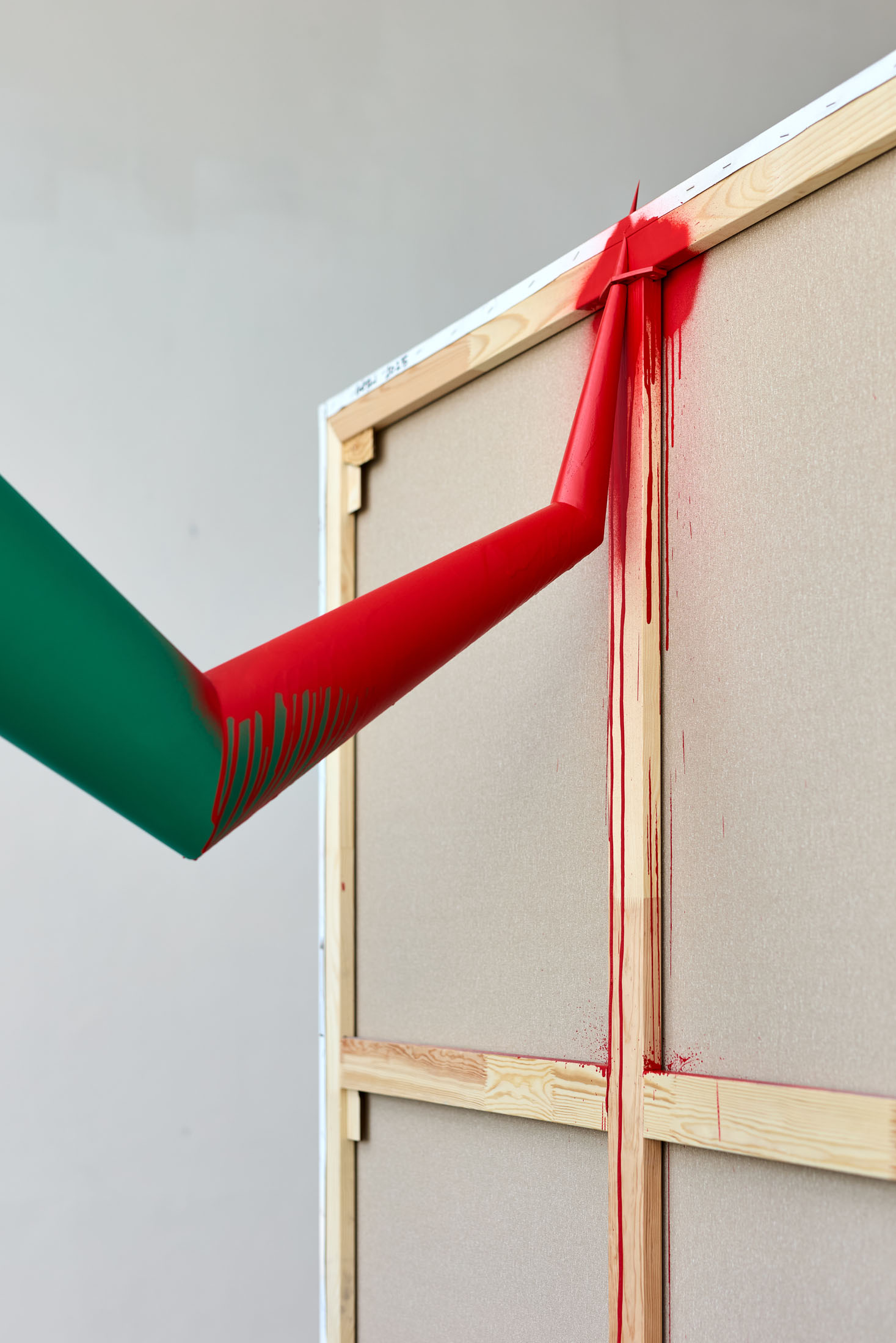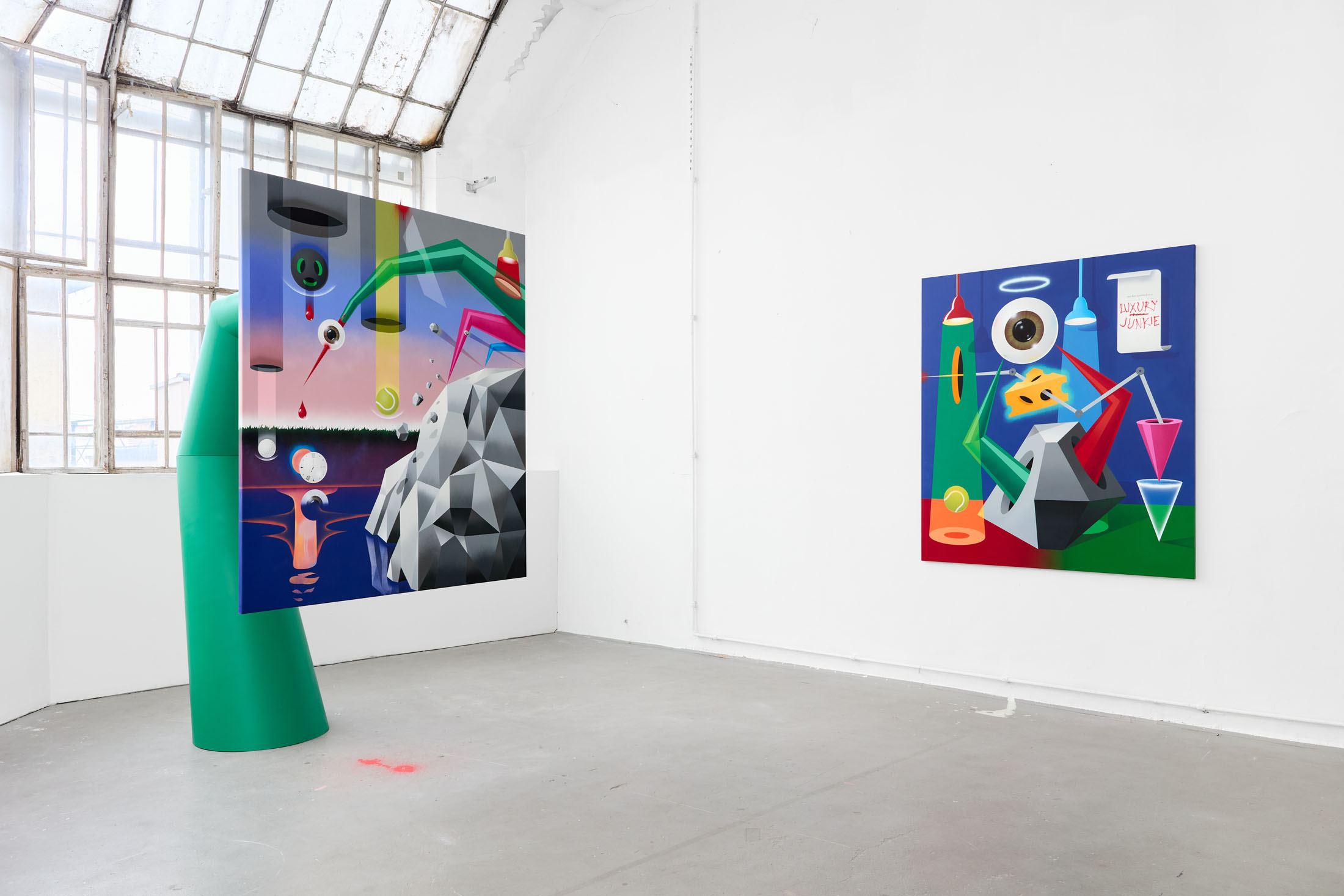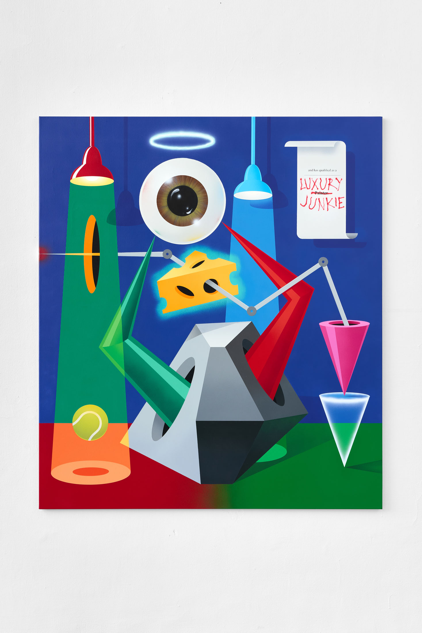 This exhibition’s iconographic exploration of 21st-century post-digital culture no longer unfolds solely within the grid structures dividing the pictorial field. The paintings often extend beyond their own strict flatness, incorporating three-dimensional, installative elements derived from their internal visual logic. These pieces engage in constant communication- with the exhibition space, with details of other paintings, with themselves, and with each other.