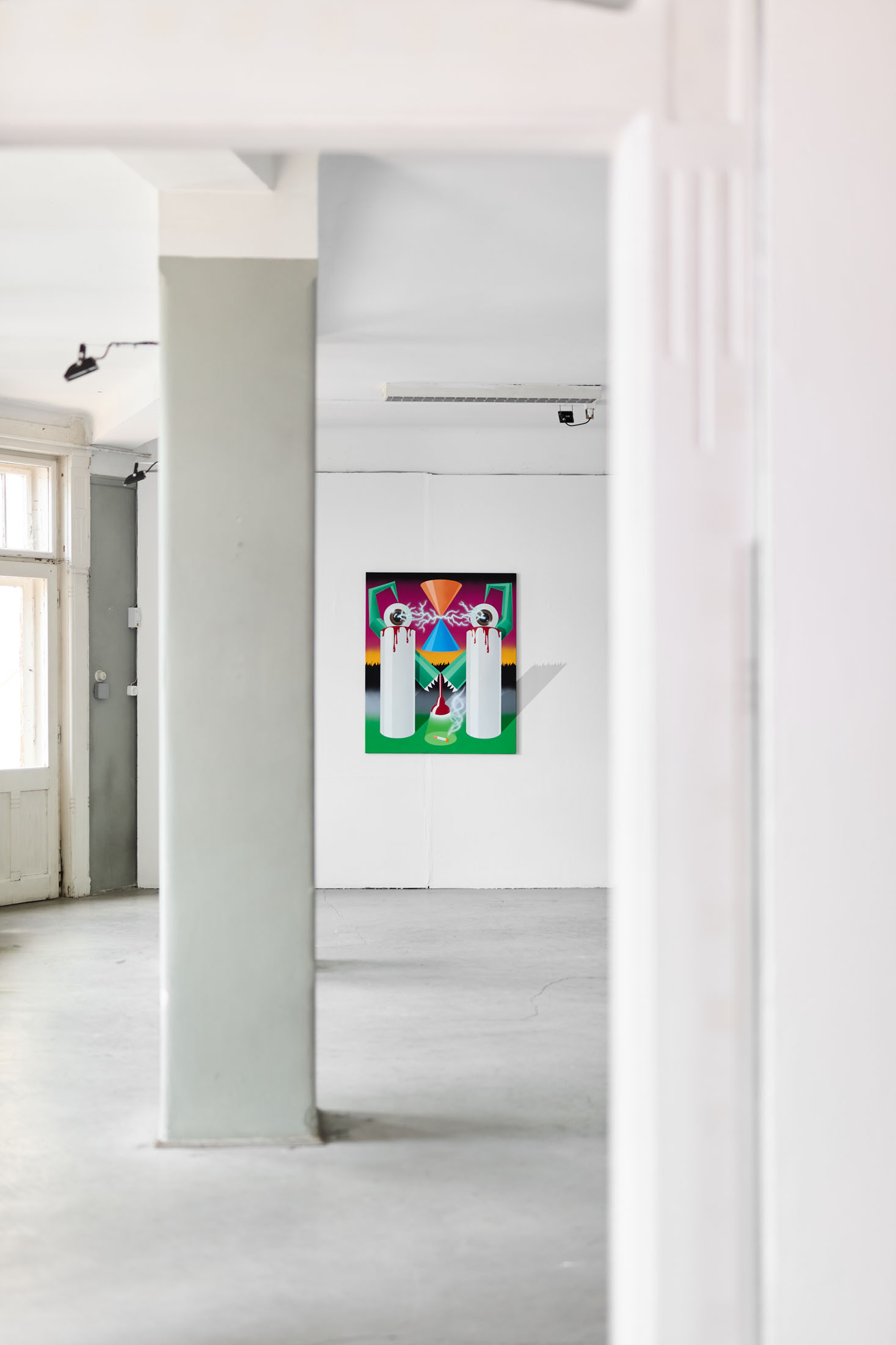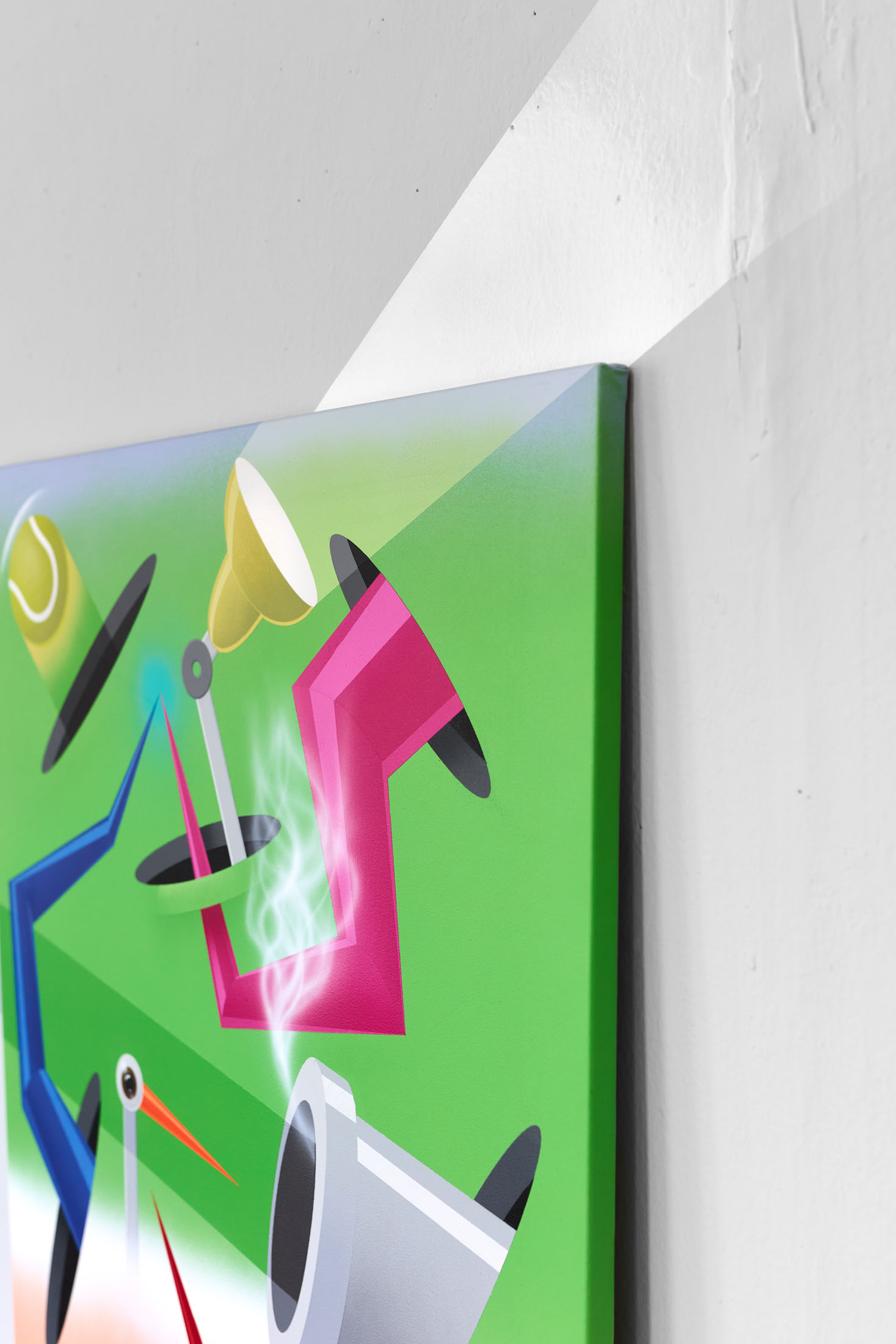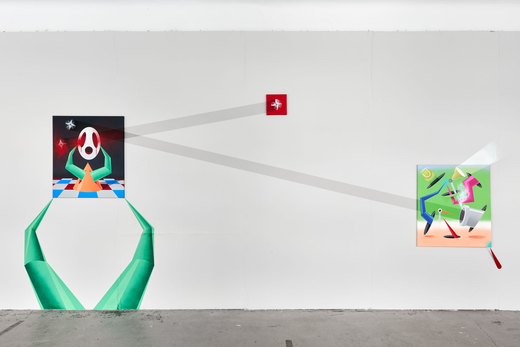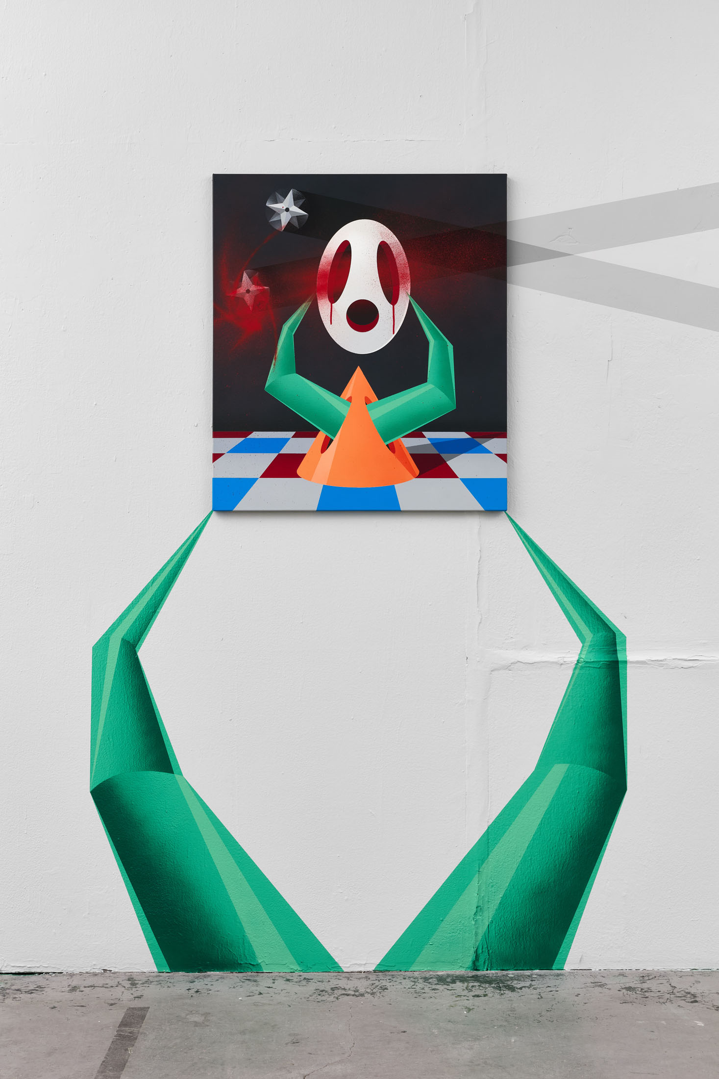 Góth’s paintings achieve this by treating seemingly inanimate objects as living protagonists, and pictorial space as a vibrant theatrical stage. The sharply contoured, hard-edge forms reminiscent of robotic arms can be viewed as allegorical extensions of the tools that produced them – pencil, scalpel, and box cutter. The compositions in his recent work are no longer determined by the grid structures of pixel-based reality, but rather by the visual language of pittura metafisica, particularly Giorgio de Chirico and Carlo Carrà, Dalí’s dreamlike logic, and Munch’s expressive isolation. Yet these coolly refined surfaces remain deeply connected to the absurd realities of our contemporary visual cultures.