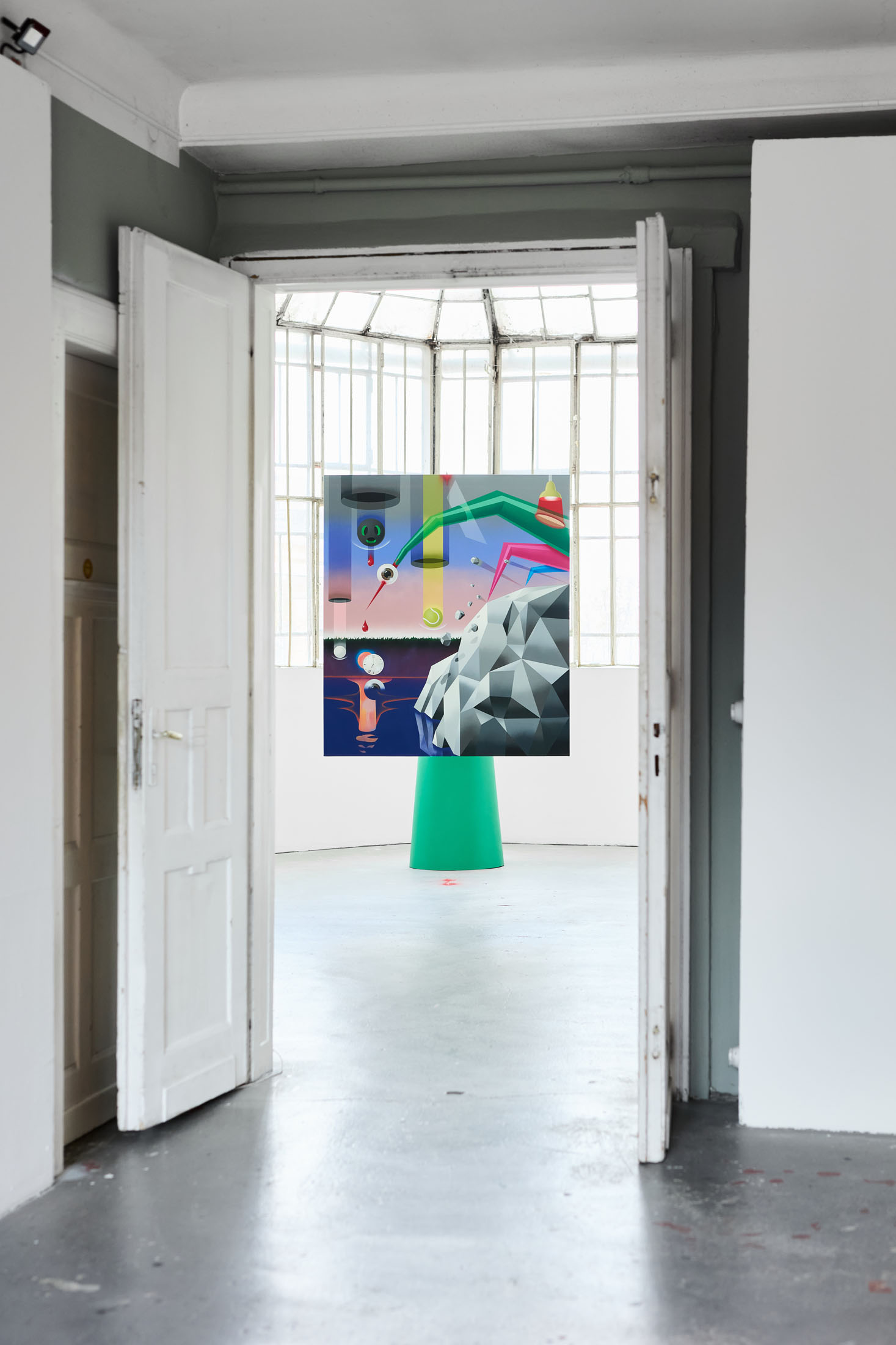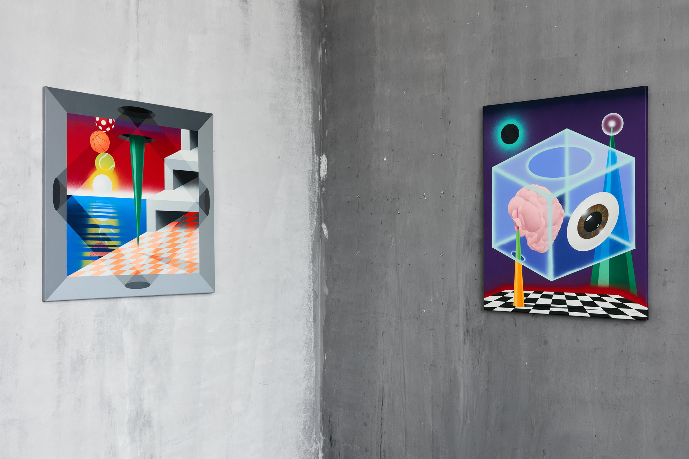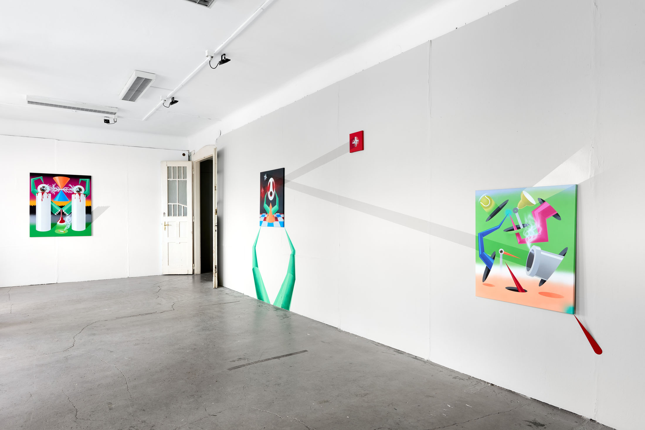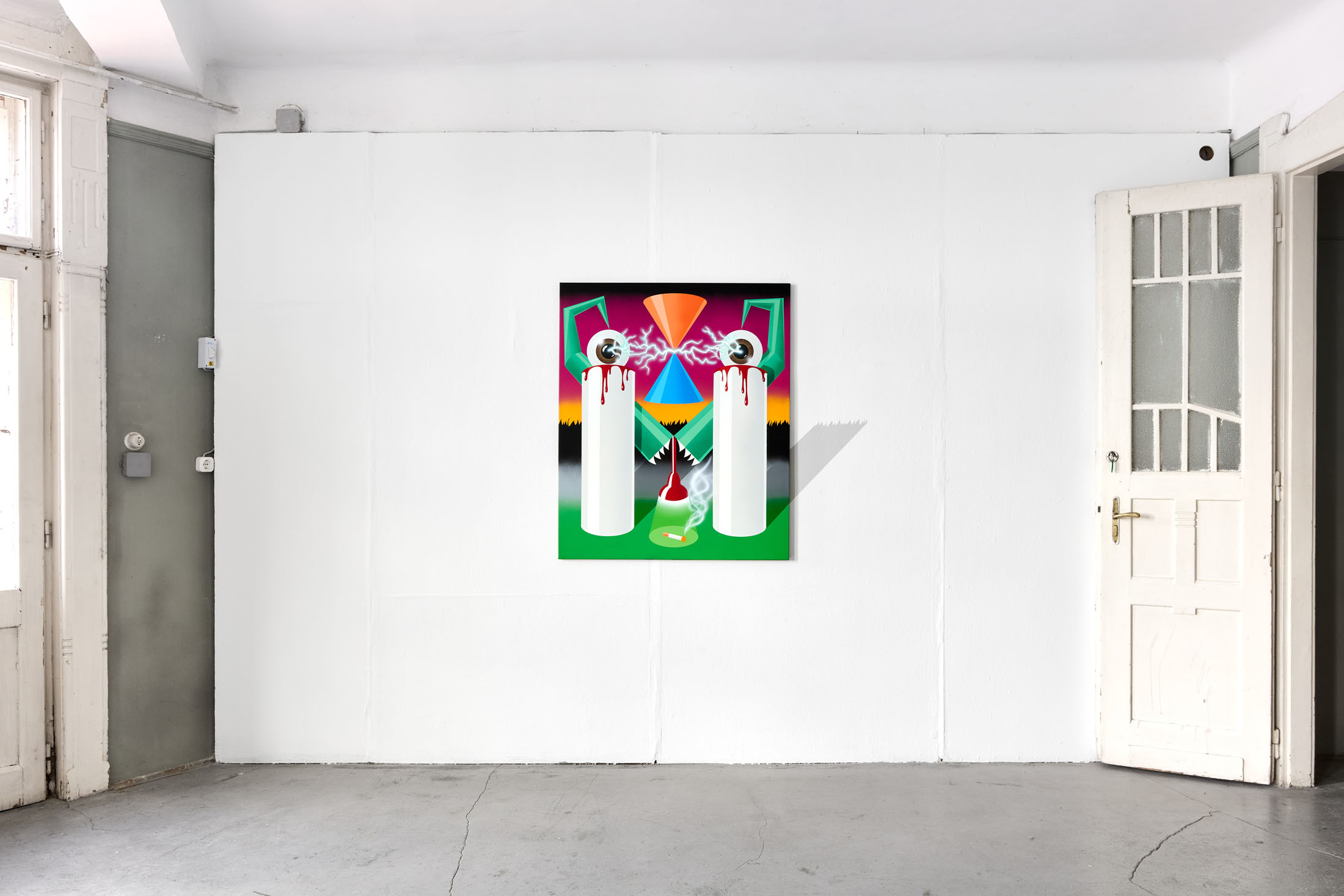 Góth’s paintings achieve this by treating seemingly inanimate objects as living protagonists, and pictorial space as a vibrant theatrical stage. The sharply contoured, hard-edge forms reminiscent of robotic arms can be viewed as allegorical extensions of the tools that produced them – pencil, scalpel, and box cutter. The compositions in his recent work are no longer determined by the grid structures of pixel-based reality, but rather by the visual language of pittura metafisica, particularly Giorgio de Chirico and Carlo Carrà, Dalí’s dreamlike logic, and Munch’s expressive isolation. Yet these coolly refined surfaces remain deeply connected to the absurd realities of our contemporary visual cultures.