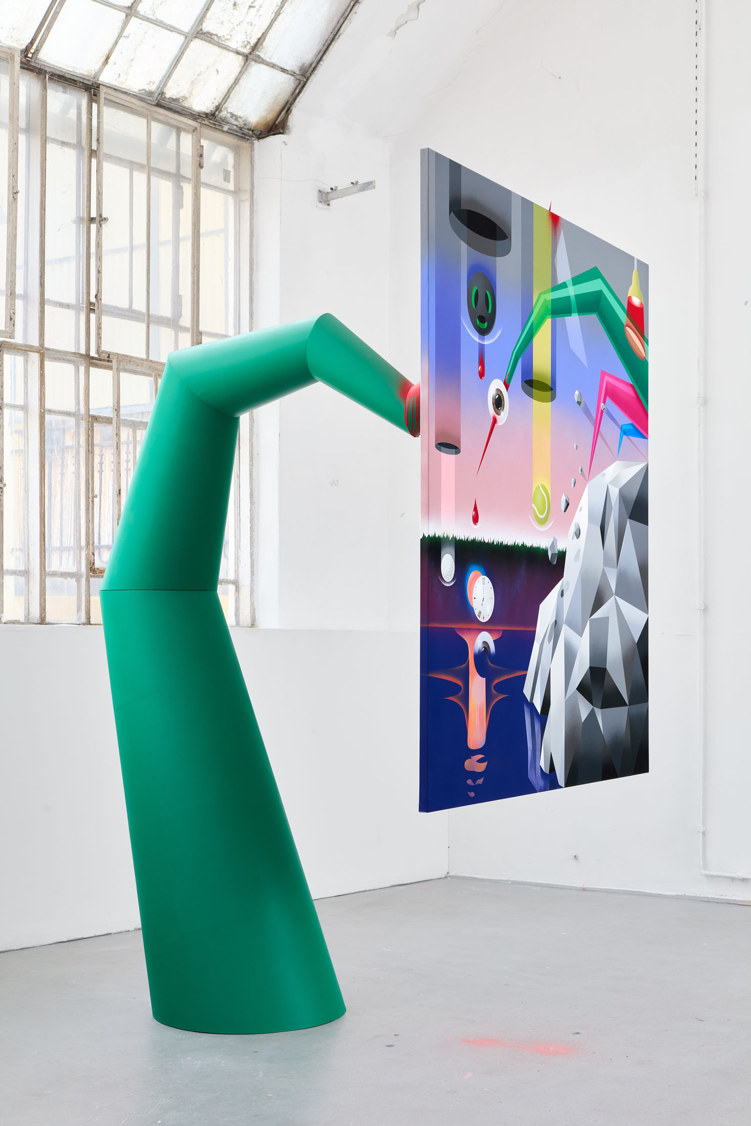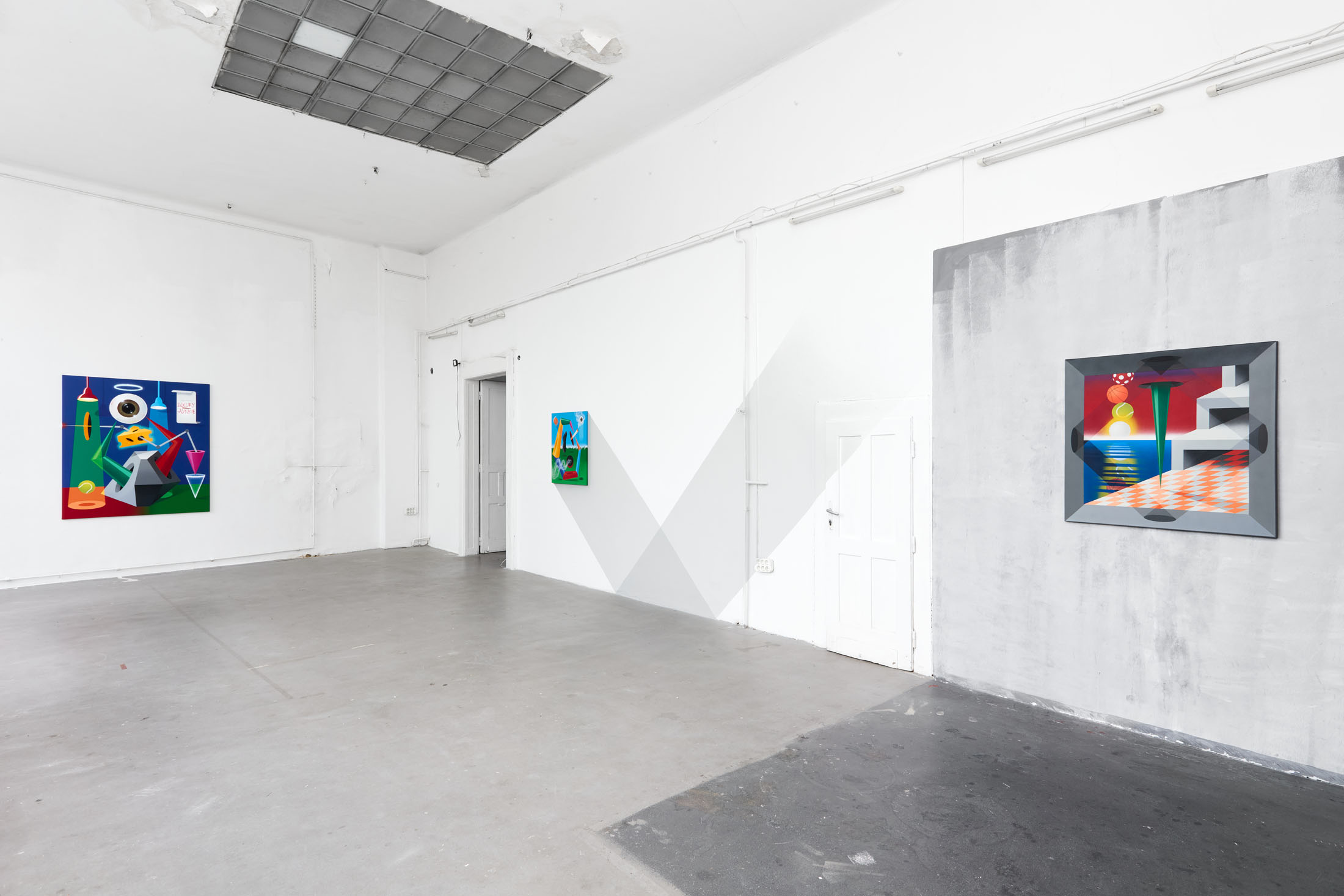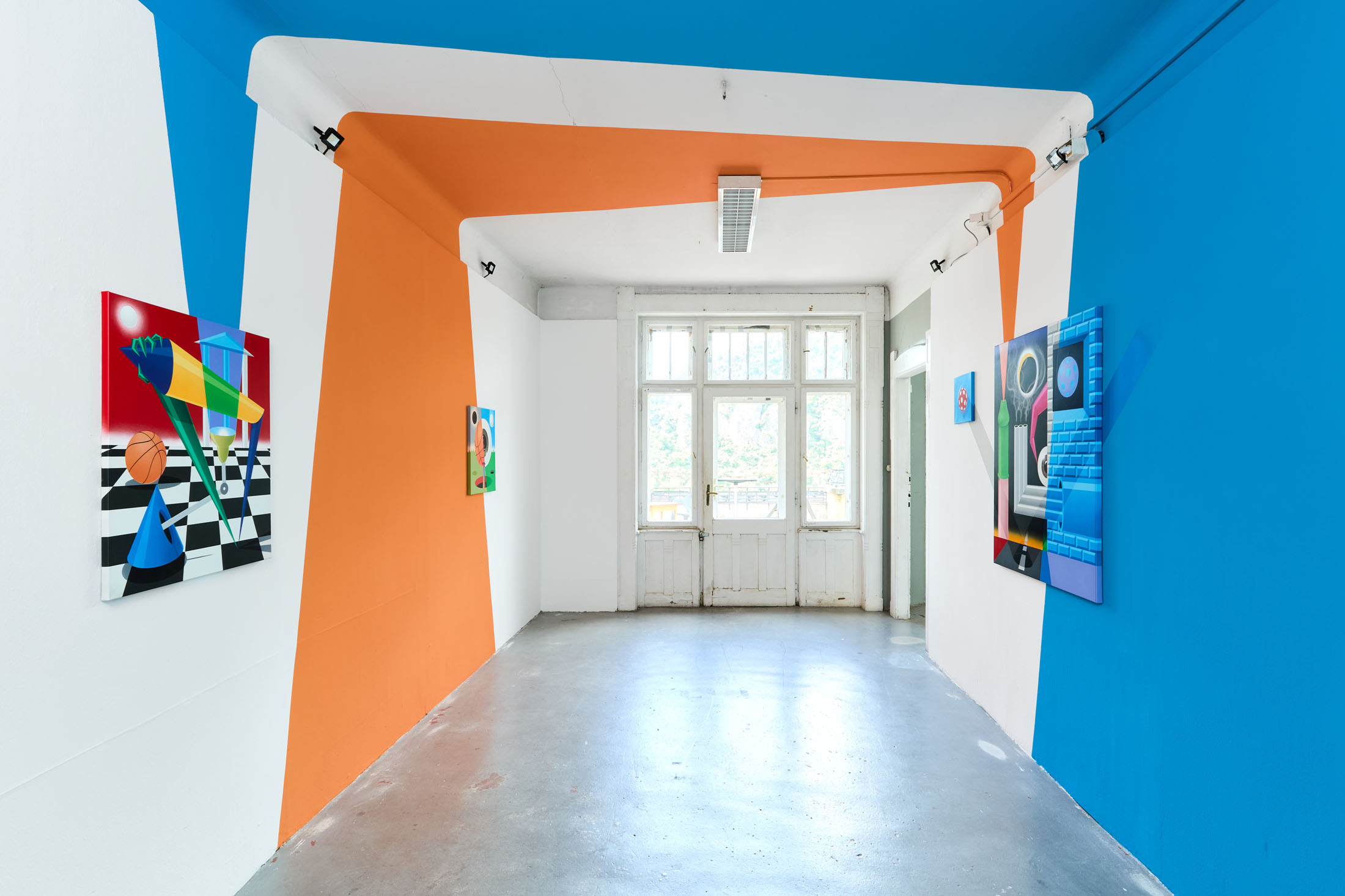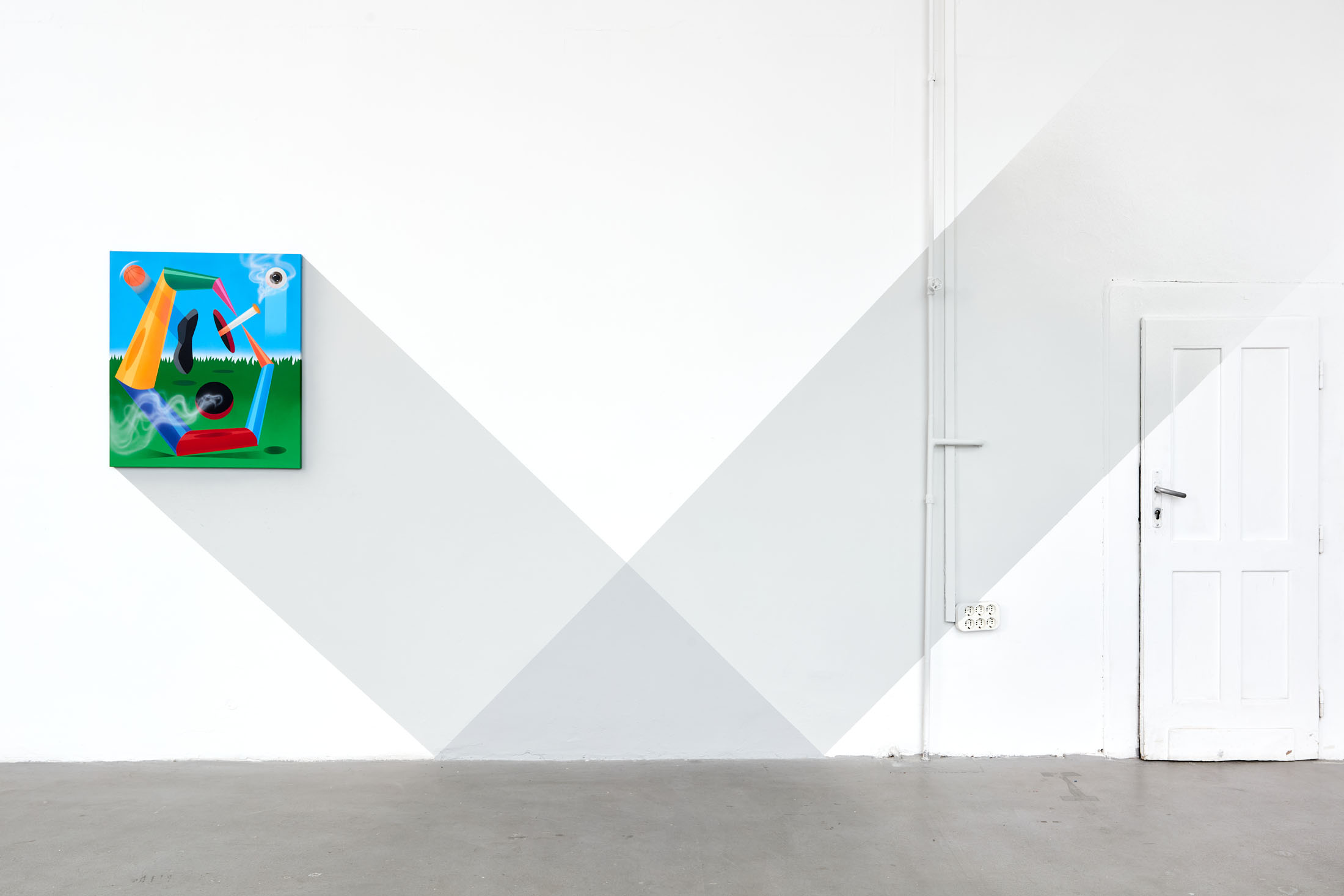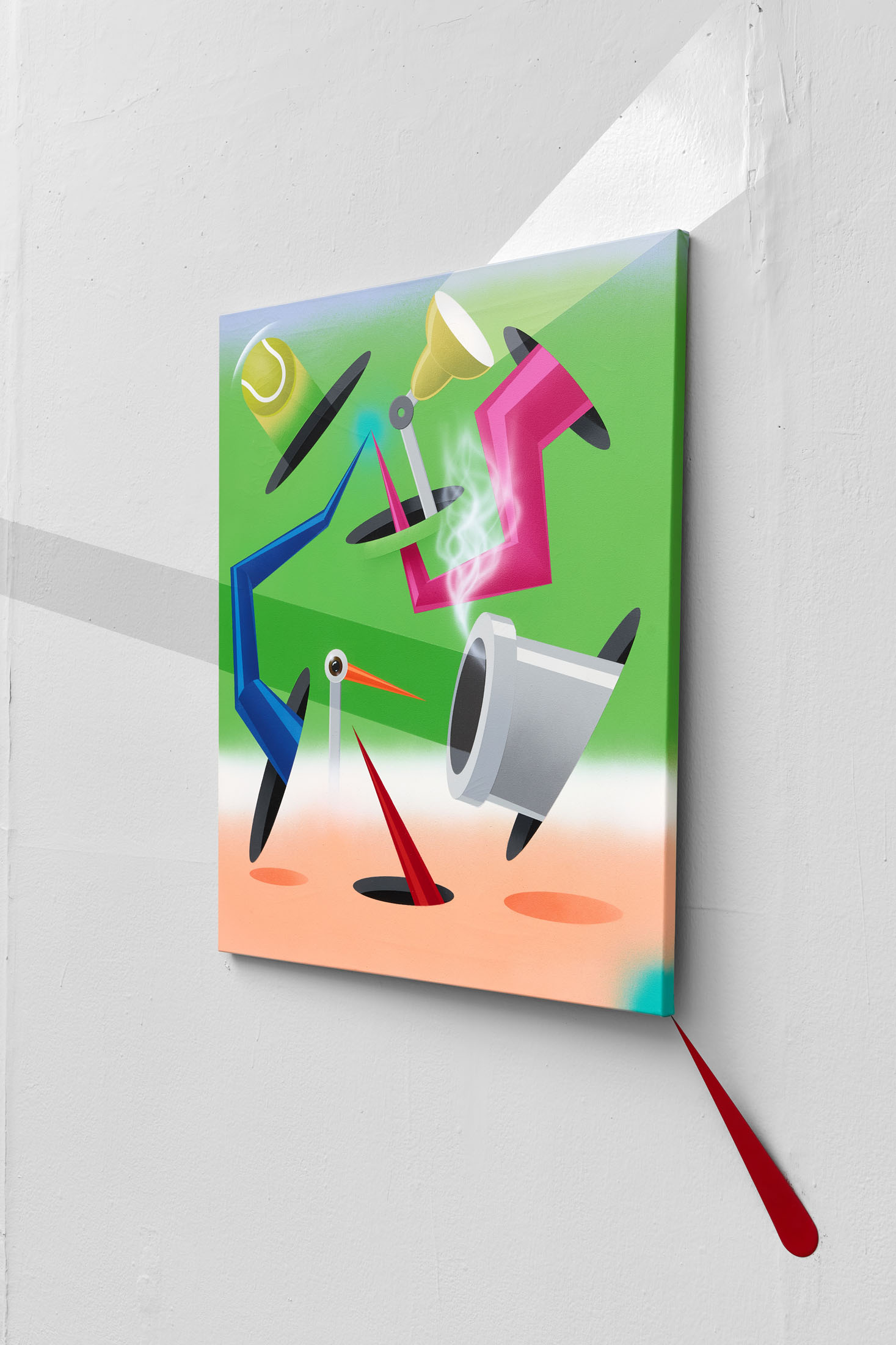 Góth’s paintings achieve this by treating seemingly inanimate objects as living protagonists, and pictorial space as a vibrant theatrical stage. The sharply contoured, hard-edge forms reminiscent of robotic arms can be viewed as allegorical extensions of the tools that produced them – pencil, scalpel, and box cutter. The compositions in his recent work are no longer determined by the grid structures of pixel-based reality, but rather by the visual language of pittura metafisica, particularly Giorgio de Chirico and Carlo Carrà, Dalí’s dreamlike logic, and Munch’s expressive isolation. Yet these coolly refined surfaces remain deeply connected to the absurd realities of our contemporary visual cultures.