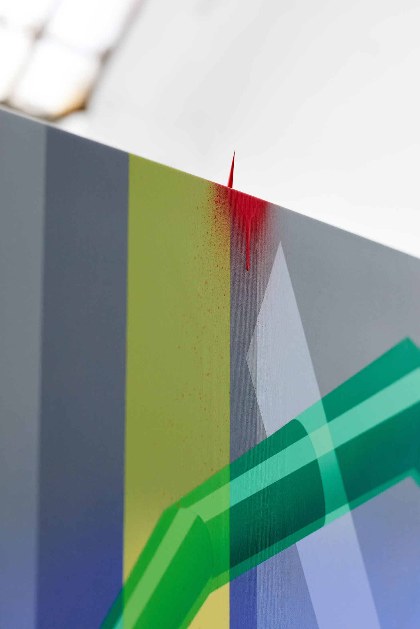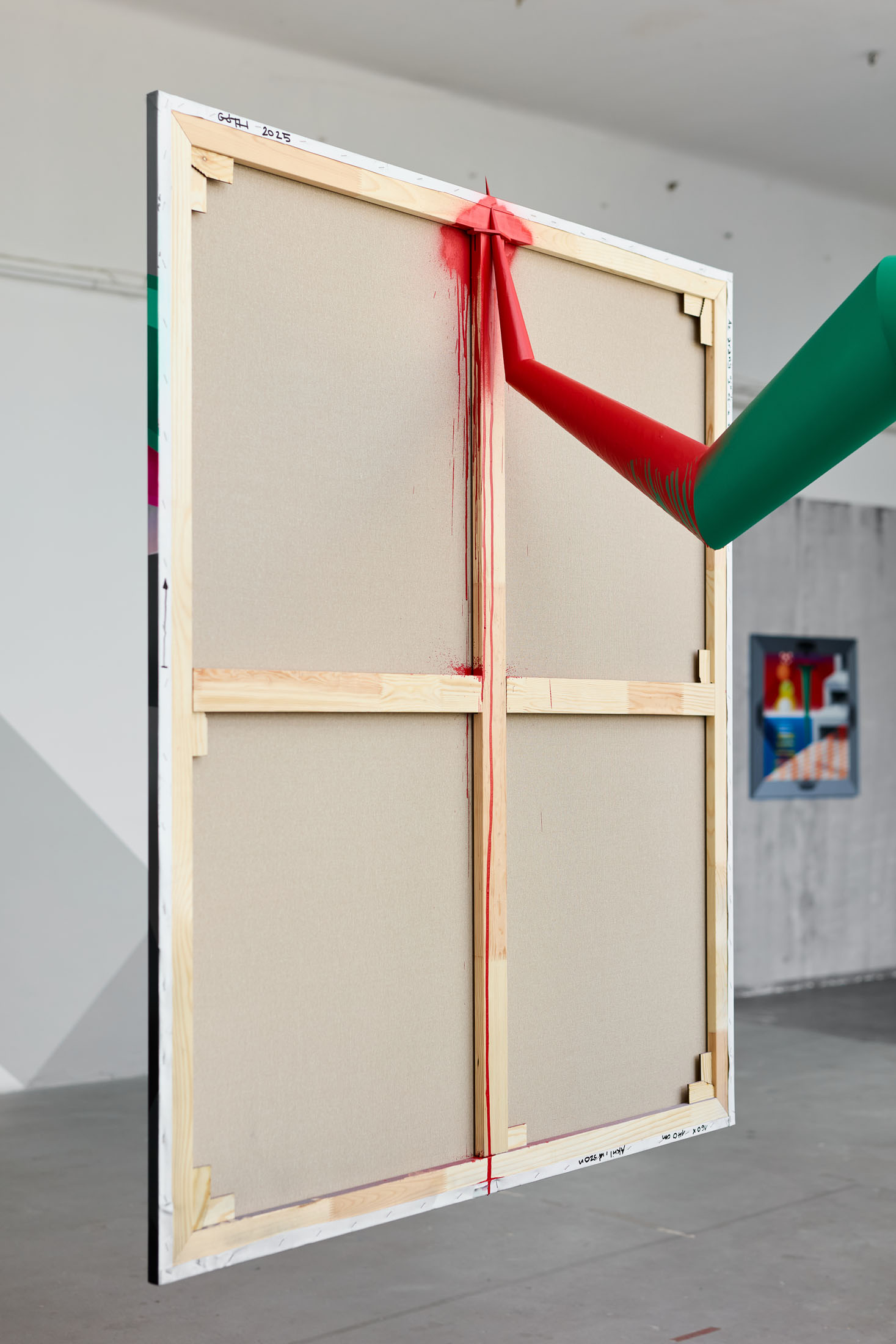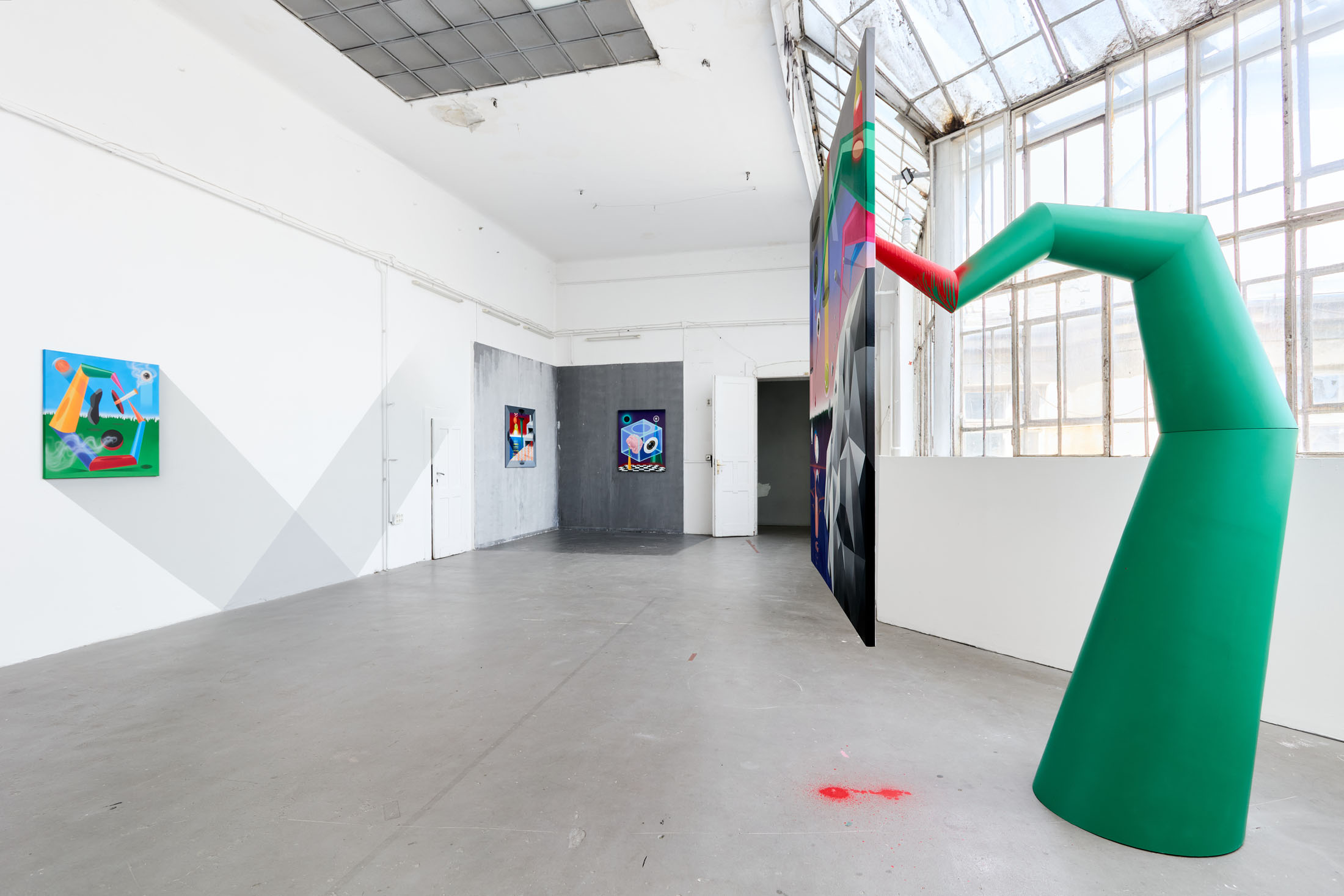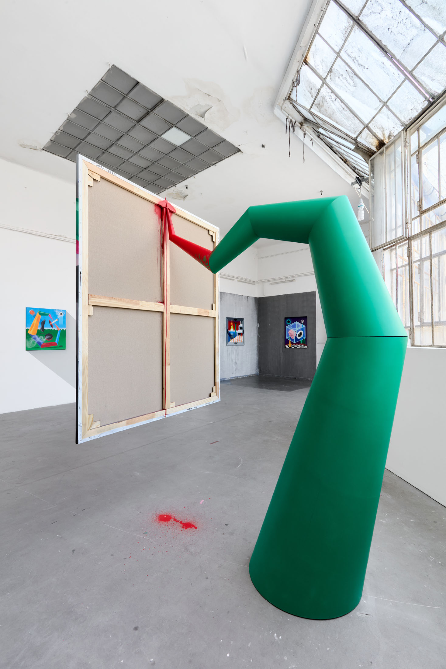 Góth’s paintings achieve this by treating seemingly inanimate objects as living protagonists, and pictorial space as a vibrant theatrical stage. The sharply contoured, hard-edge forms reminiscent of robotic arms can be viewed as allegorical extensions of the tools that produced them – pencil, scalpel, and box cutter. The compositions in his recent work are no longer determined by the grid structures of pixel-based reality, but rather by the visual language of pittura metafisica, particularly Giorgio de Chirico and Carlo Carrà, Dalí’s dreamlike logic, and Munch’s expressive isolation. Yet these coolly refined surfaces remain deeply connected to the absurd realities of our contemporary visual cultures.