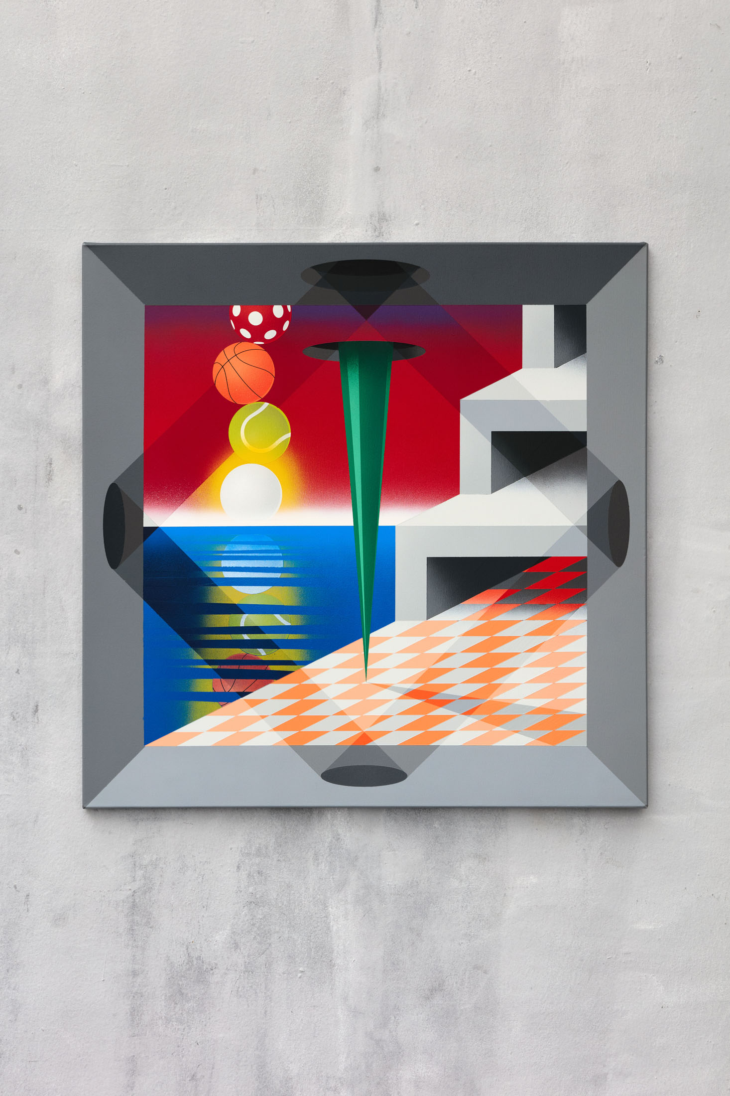 Running throughout the exhibition is the idea of the “mechanical theatre”: a stage with no human actors, where only objects and gestures drift through cold, calculated, labyrinthine relations of presence and absence. The bouncing ball, the suspended motion, the frozen instant of perception- all constitute a visual syntax in Góth’s work that evokes the dreamlike stagecraft of Bauhaus experiments by artists like Oskar Schlemmer and the architectural reveries of Italian metaphysical painting. In this context, nostalgia is not a private sentiment, but a collective emotional state contributing to the construction of a utopian worldview.