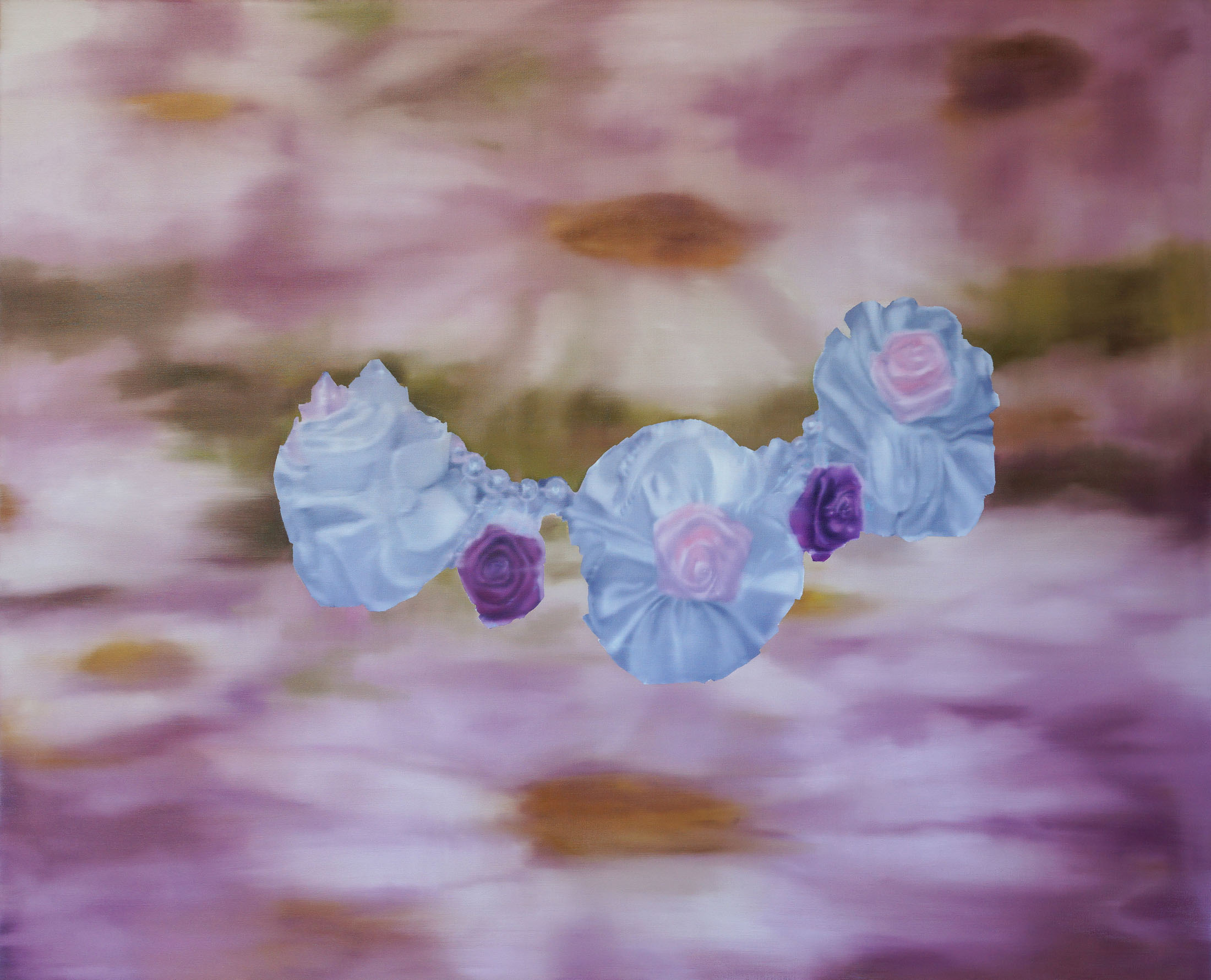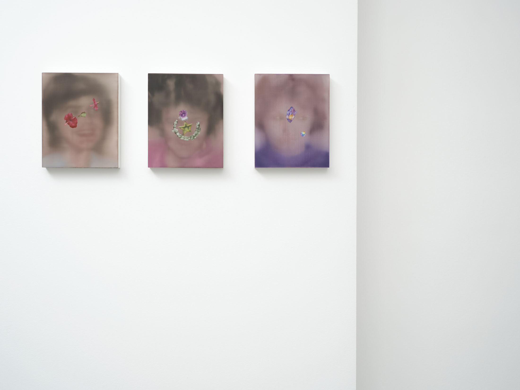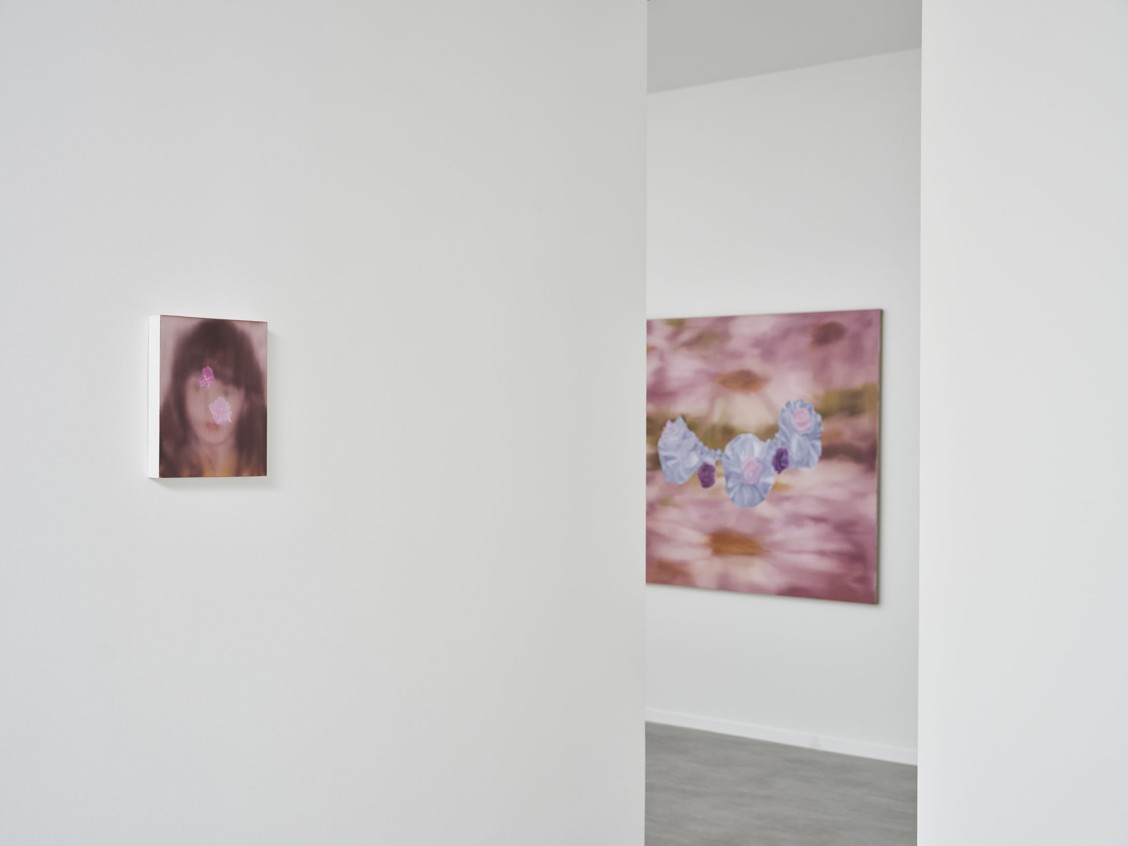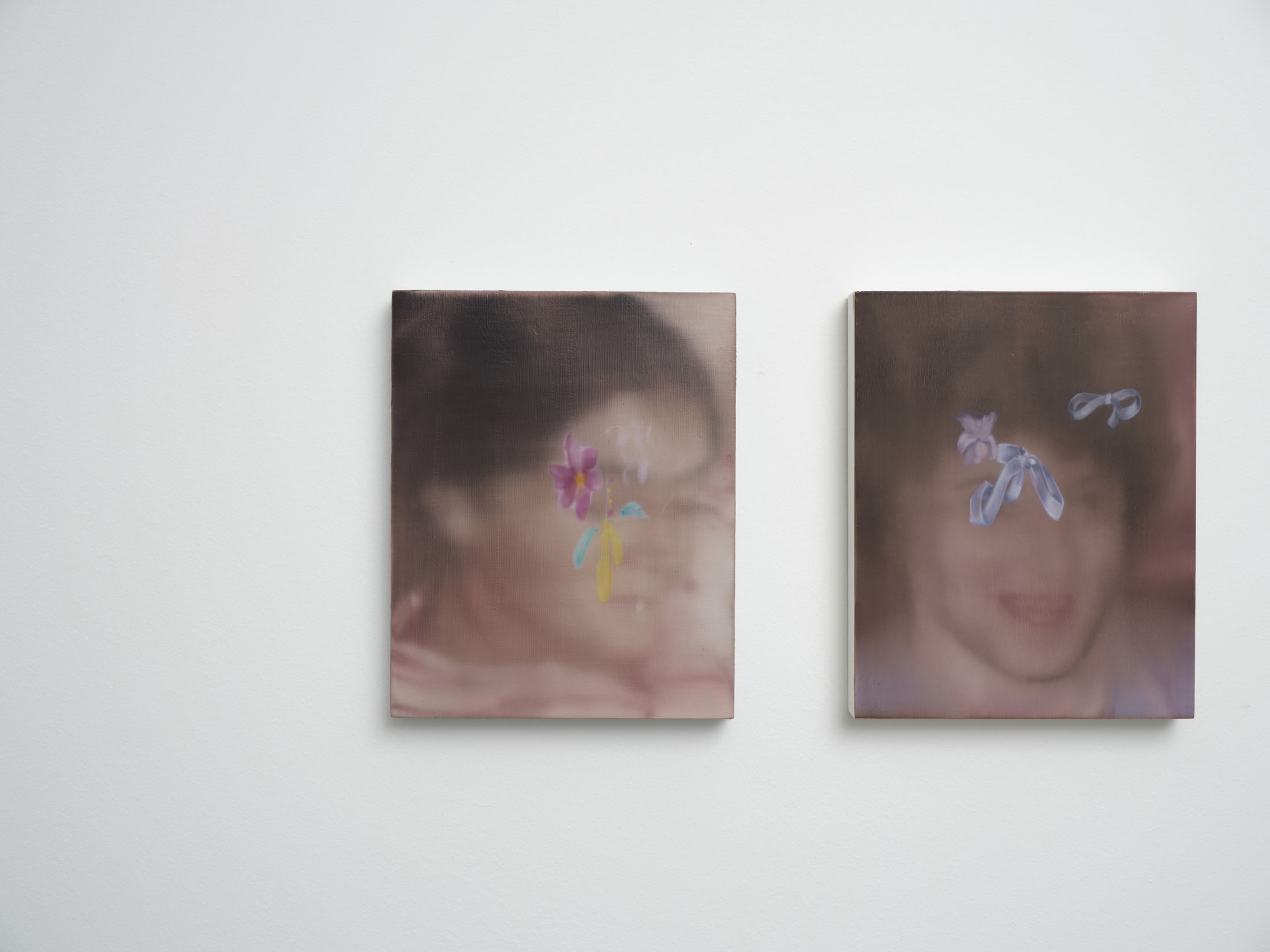 All stories sentimentalise. Just like memory. When Martina Grlić takes a photograph from her family albums as a starting-point, she enters into the deceptiveness of memory (because there is no escaping it), consciously working with its distortions. Her paintings are not documents, but rather constructs; what draws us in is the truthfulness of the scene, but the manner in which it is arranged to satisfy us. Decorative props float above sfumato daisies and portraits of smiling women. Everything is rosy, soft, so sweet. The idyll hovers at the edges. “There’s nothing beautiful in these paintings”, says the artist; the familiar at once transforms into the strange. The uncanny creeps in.