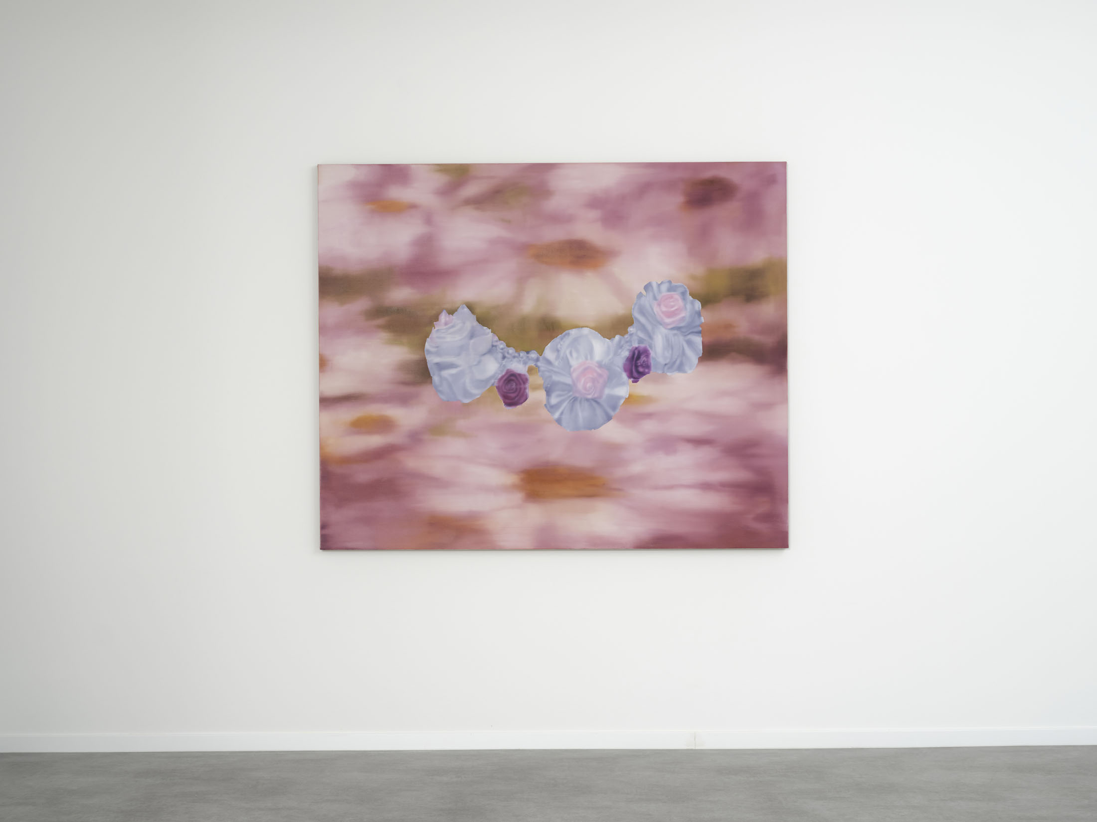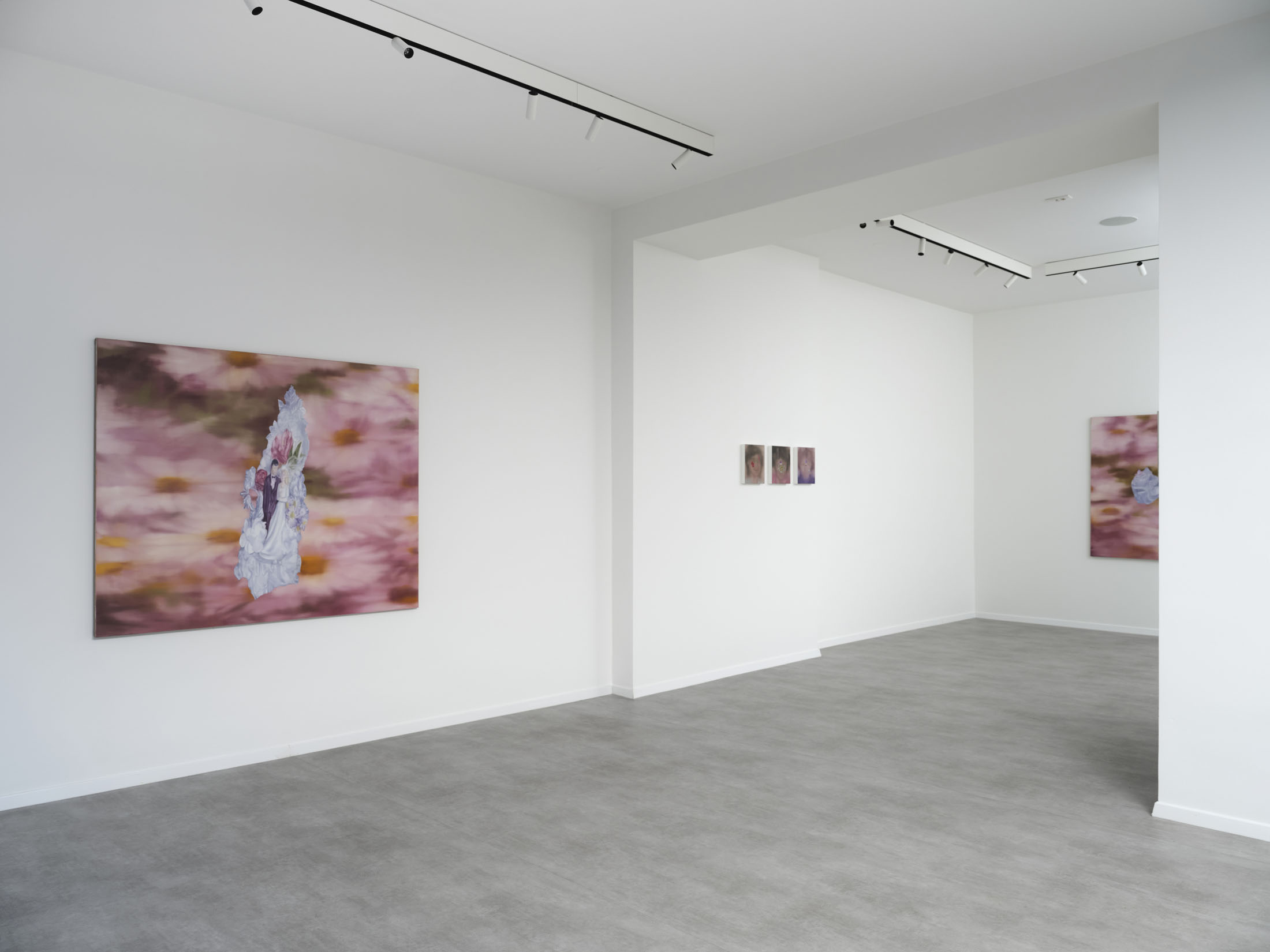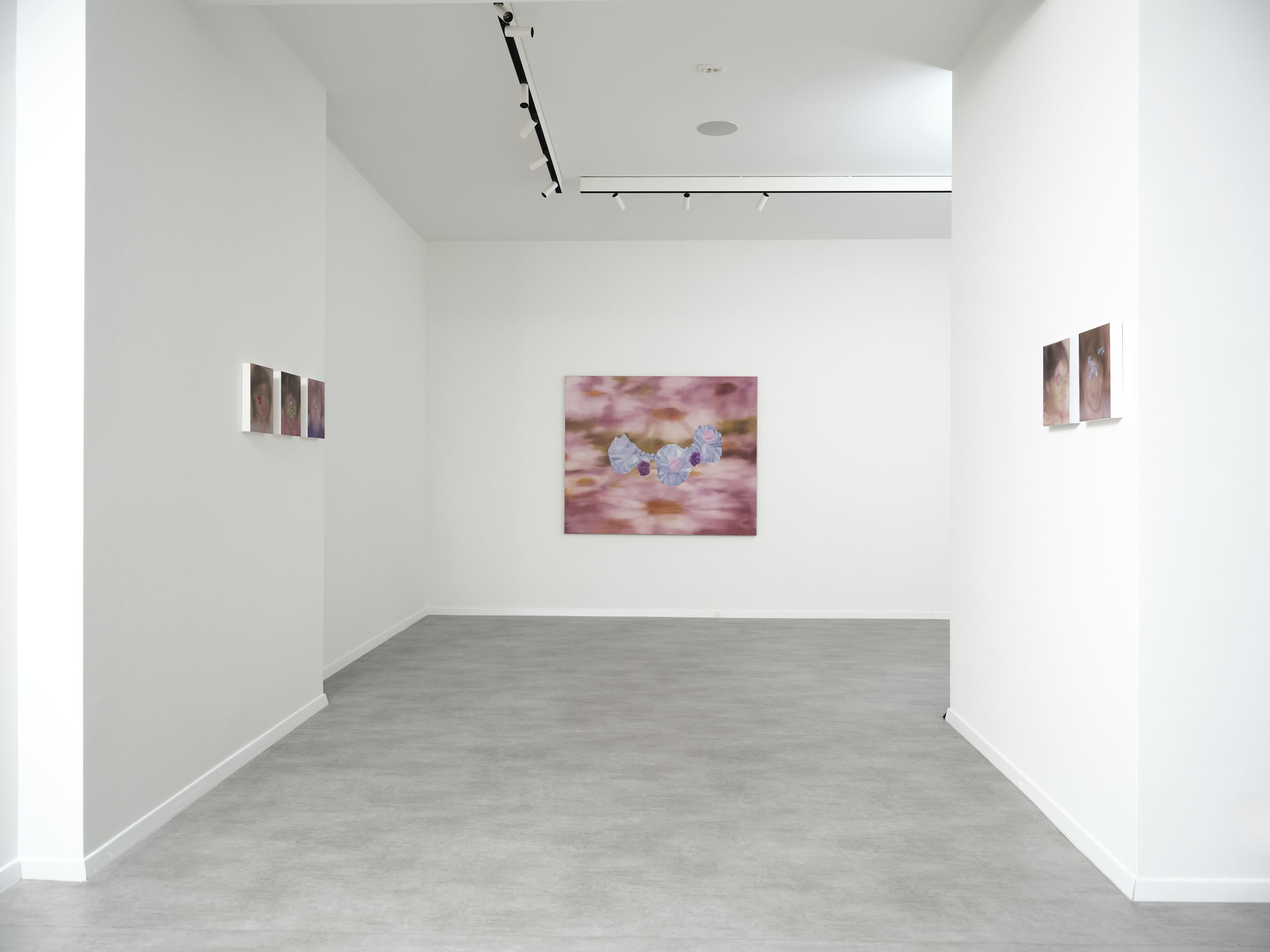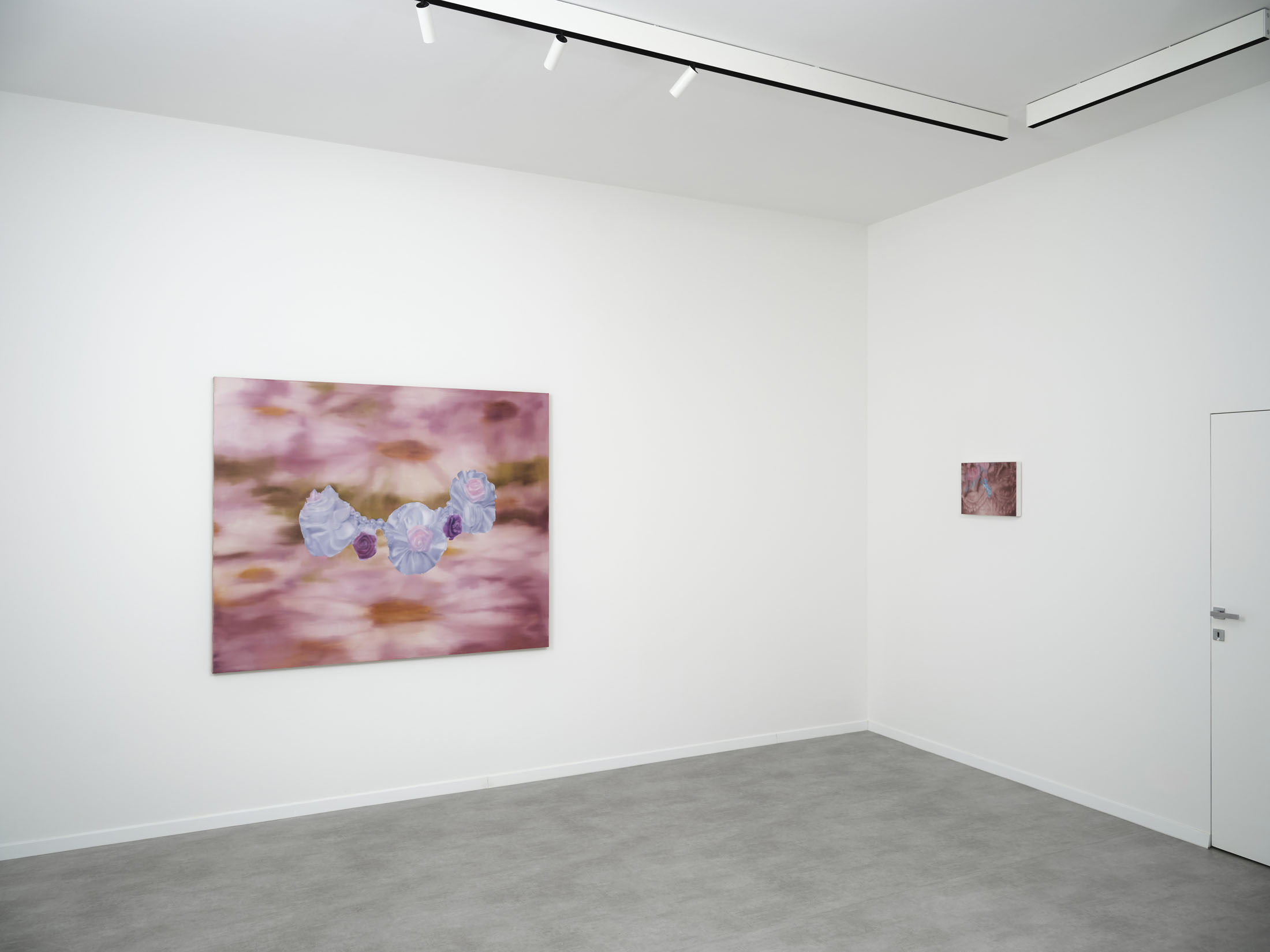 All stories sentimentalise. Just like memory. When Martina Grlić takes a photograph from her family albums as a starting-point, she enters into the deceptiveness of memory (because there is no escaping it), consciously working with its distortions. Her paintings are not documents, but rather constructs; what draws us in is the truthfulness of the scene, but the manner in which it is arranged to satisfy us. Decorative props float above sfumato daisies and portraits of smiling women. Everything is rosy, soft, so sweet. The idyll hovers at the edges. “There’s nothing beautiful in these paintings”, says the artist; the familiar at once transforms into the strange. The uncanny creeps in.