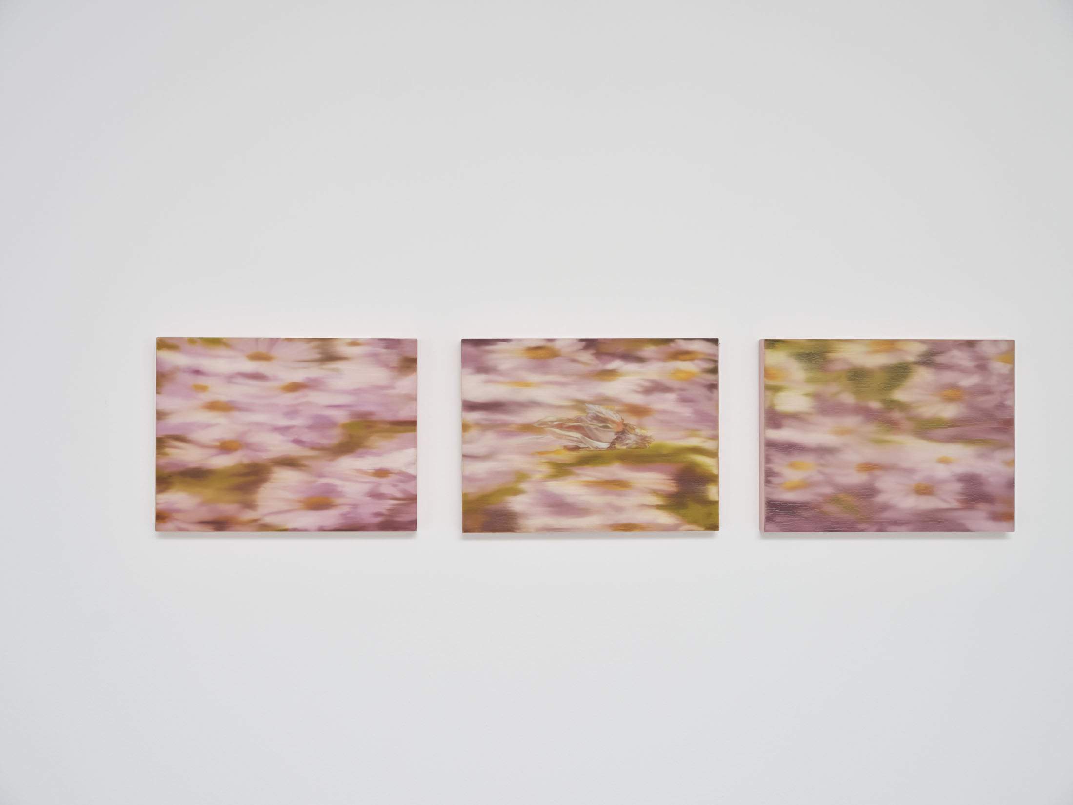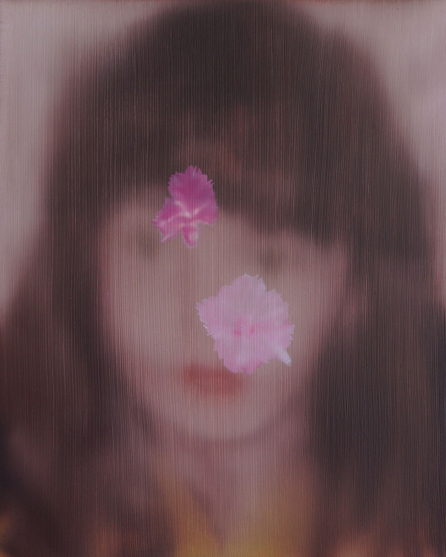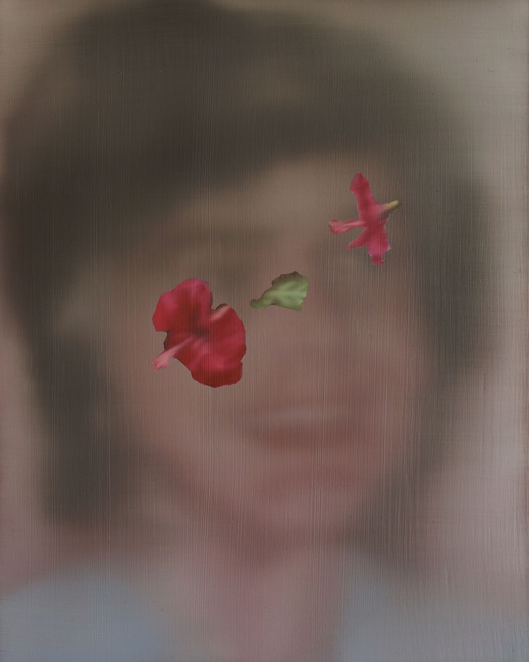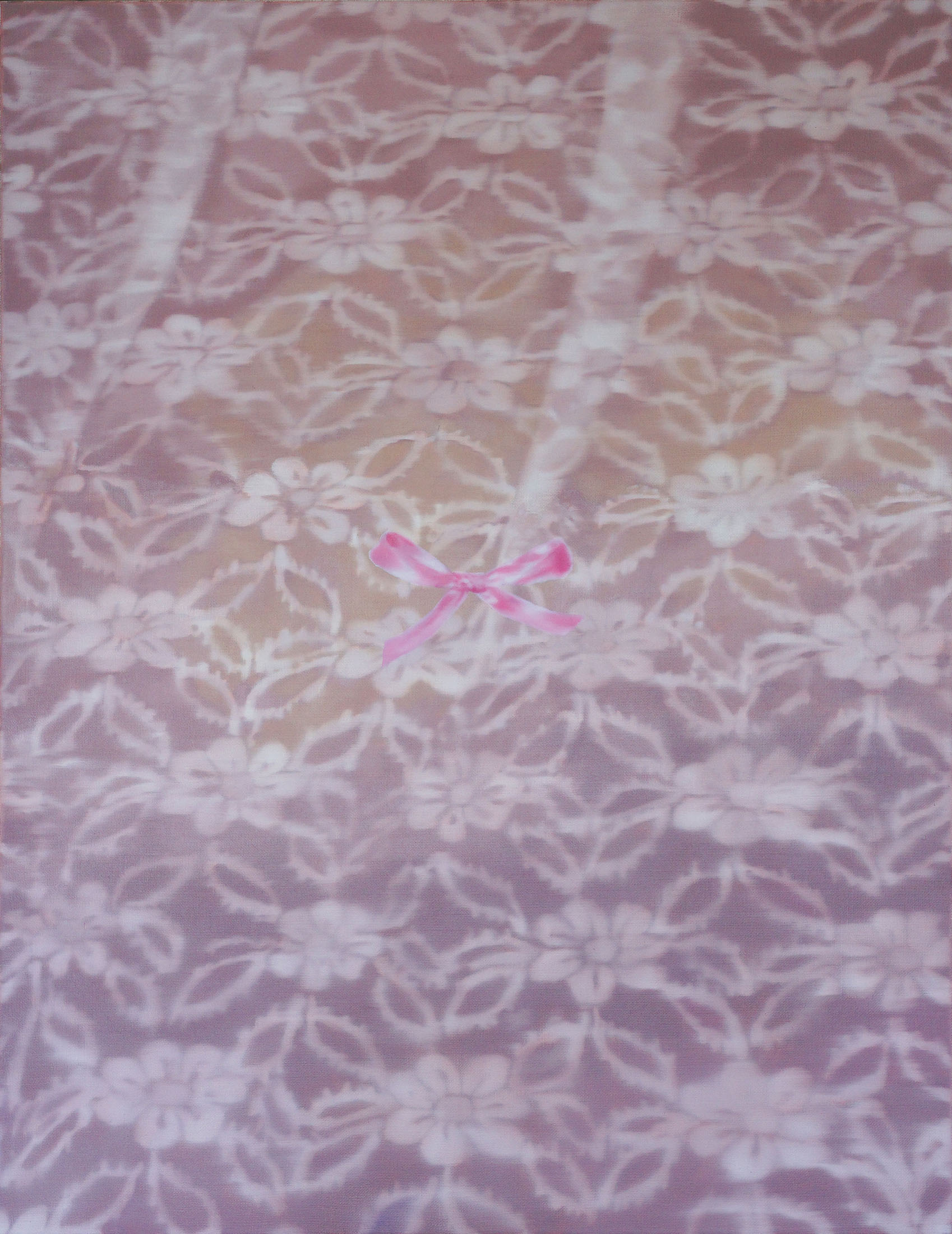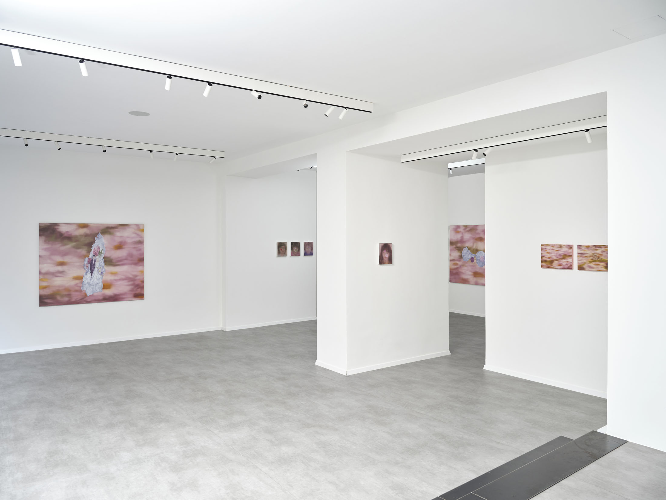 All stories sentimentalise. Just like memory. When Martina Grlić takes a photograph from her family albums as a starting-point, she enters into the deceptiveness of memory (because there is no escaping it), consciously working with its distortions. Her paintings are not documents, but rather constructs; what draws us in is the truthfulness of the scene, but the manner in which it is arranged to satisfy us. Decorative props float above sfumato daisies and portraits of smiling women. Everything is rosy, soft, so sweet. The idyll hovers at the edges. “There’s nothing beautiful in these paintings”, says the artist; the familiar at once transforms into the strange. The uncanny creeps in.