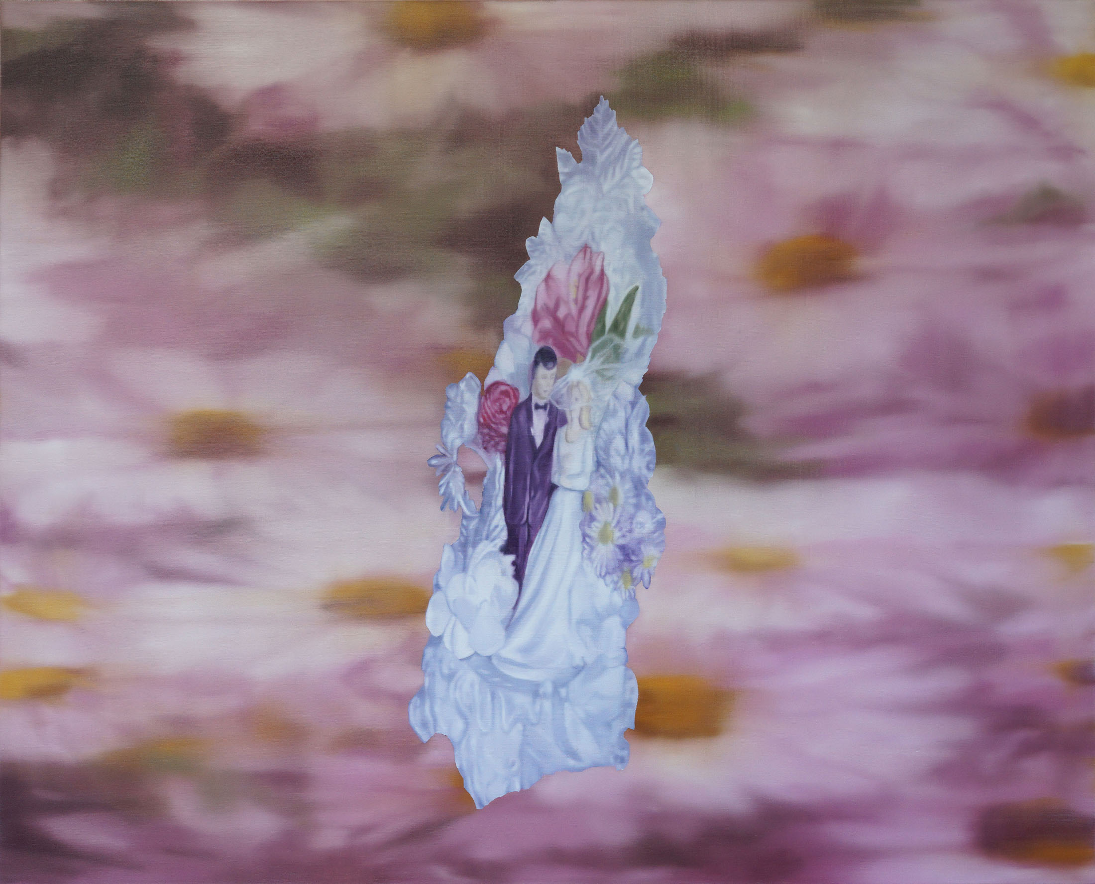 What at first glance seemed lovely reveals another, far from pleasant, register: a matrix of desires and fears. The symbols we recognise – the white wedding dress, a cupid, glittering jewellery – simultaneously create a sense of promise and menace. They become the bearers of collective illusions, relics of ideologies that used to provide a framework for us, and now, torn from their sources, they twirl around like defective heraldic tokens.