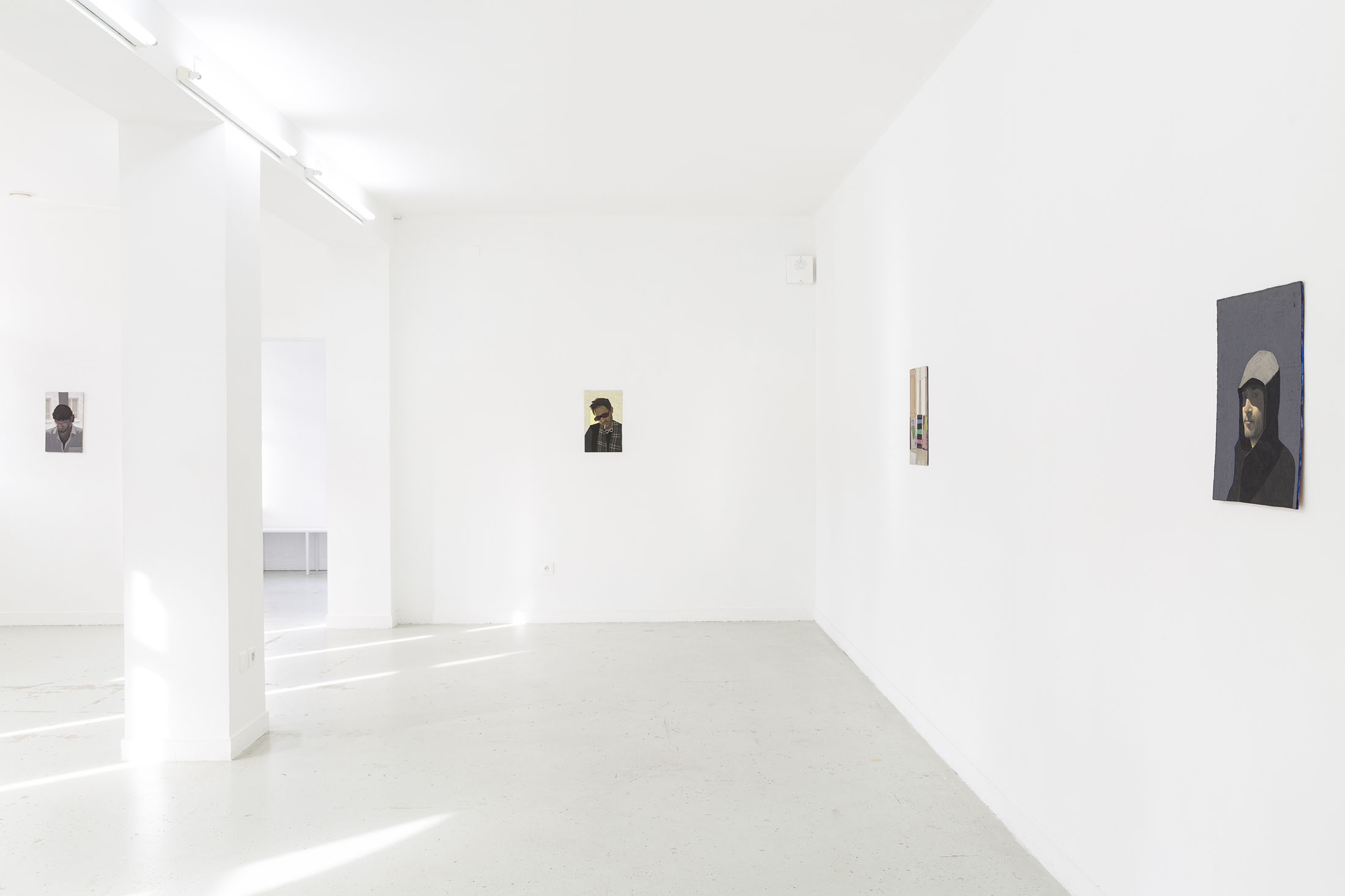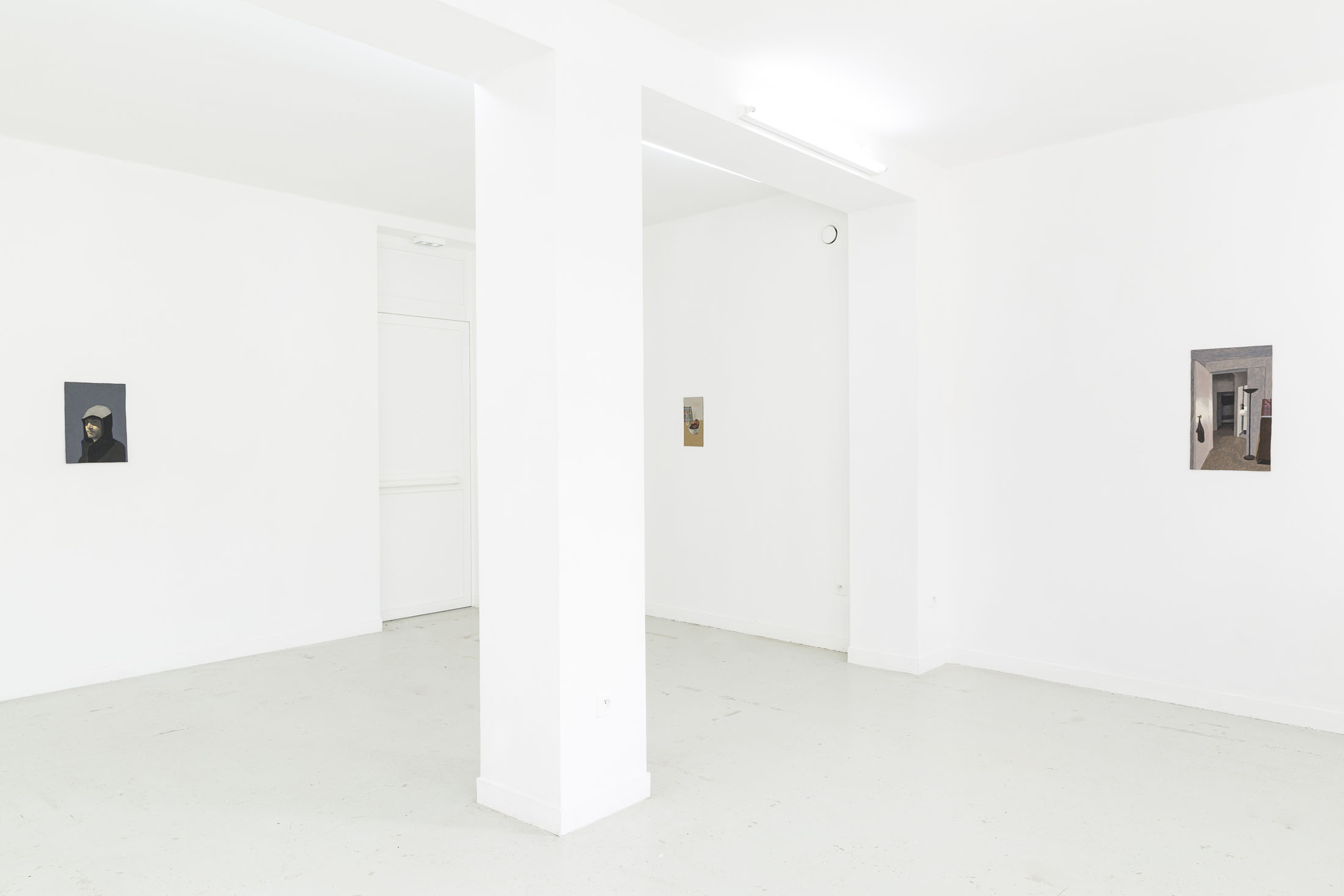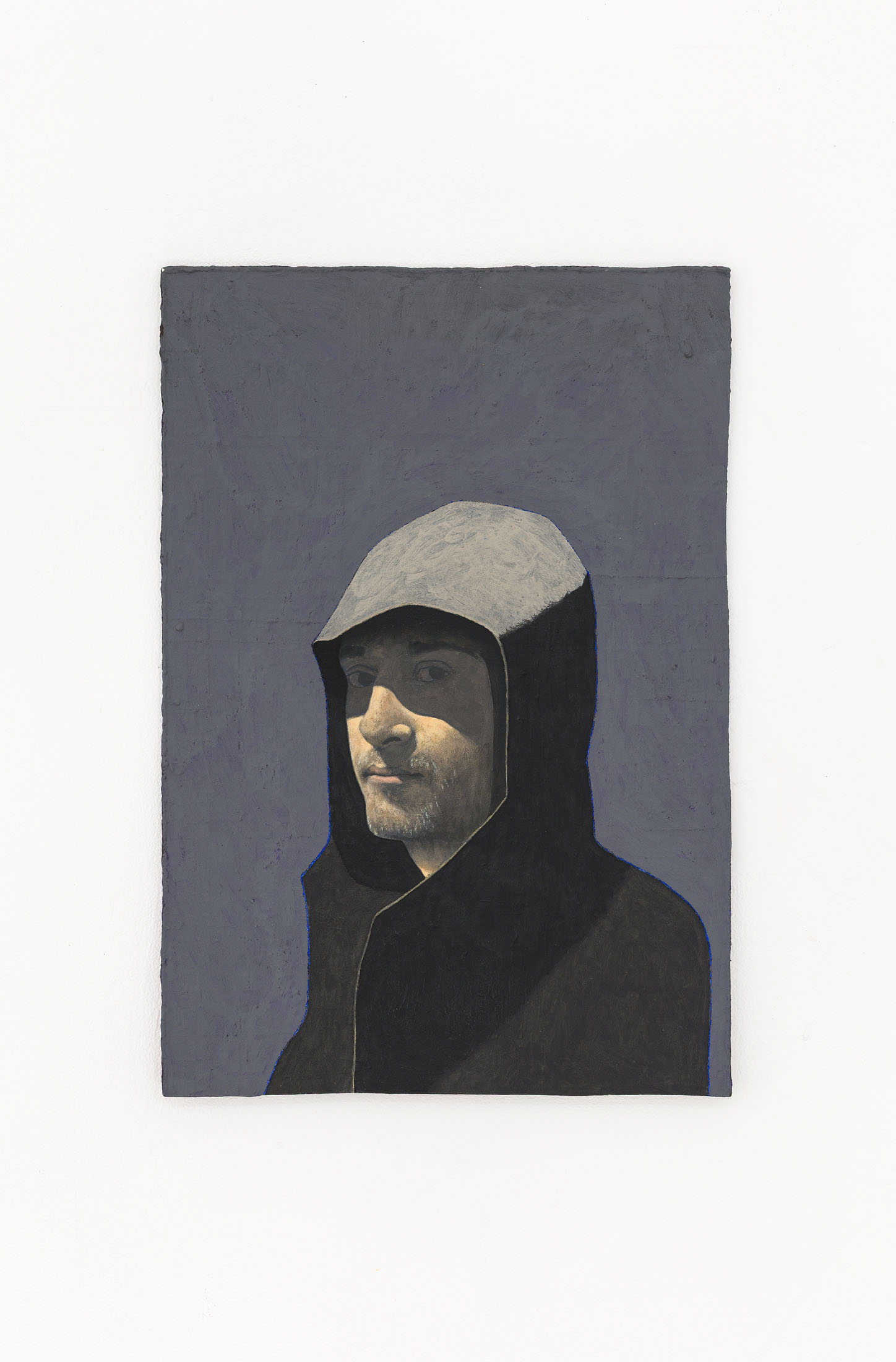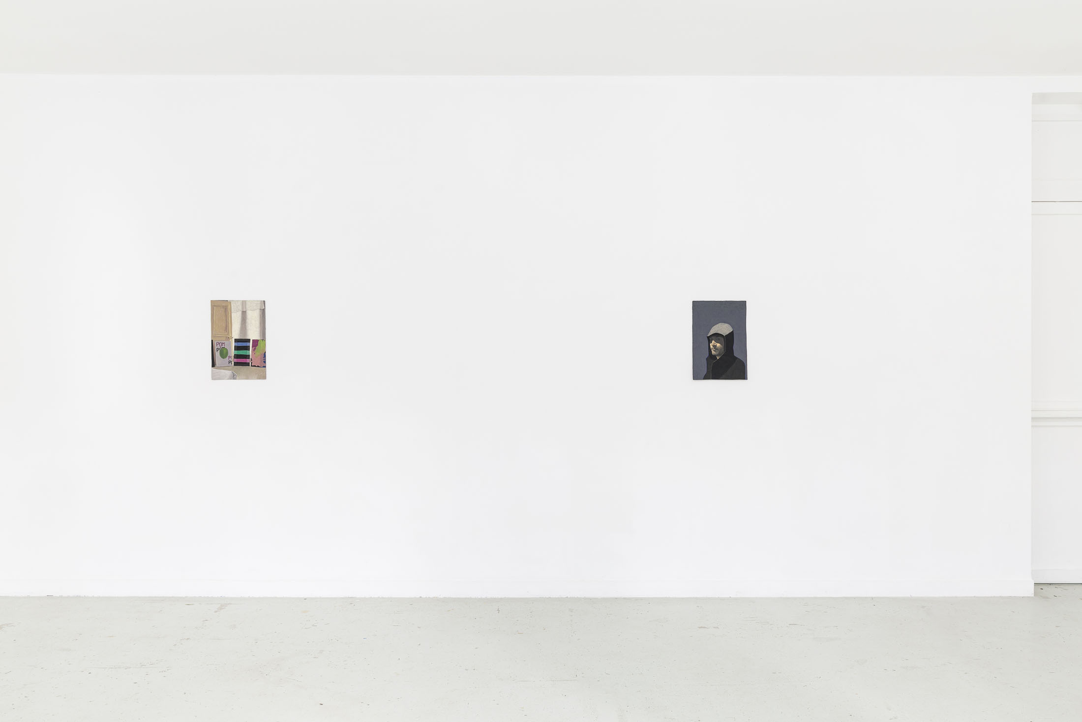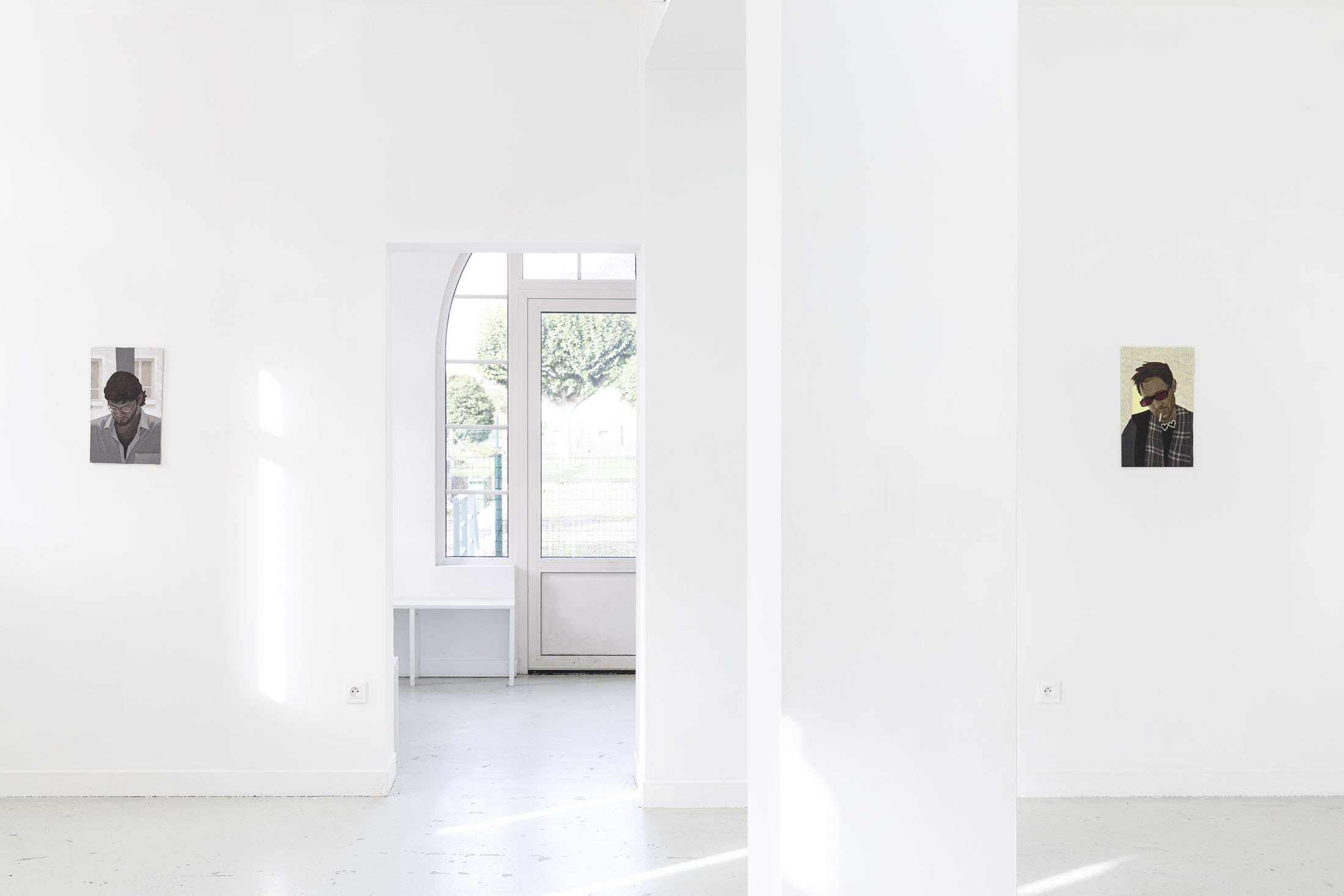 It is a world of interiors with no way out, no vistas leading the eye elsewhere. The curtains are drawn, the perspectives blocked off. At the same time, this spare interior contains exactly what it should: a few pieces of fruit, friendly figures, and painting itself. For unlike the earlier eponymous exhibitions, the “recent paintings” of this show are both presented and represented. One of the pictures on display indeed figures three paintings set at the foot of a window, the window of Matthieu’s room. The three are very colorful and differ from each other. One depicts an apple green “pom” logo, the other is striped, and the third, more fluid, seems covered in puddles of various colors. In the background of the still life a small abstract painting can be seen. Matthieu produced these four pictures “for real” but decided not to exhibit them, at least not outside the space of the apartment/painting. They have nothing to do with the rather realist yellowish brown austere style he used to represent the interior containing them. As far as I know, this is the first time he gives a meta treatment to the coexistence of his different styles, lending this new group a more reflexive, even analytical tonality. Painting is put into perspective, the (uninhabited) interiors and (noncontextualized) figures have been separated. Nor is there any real continuity between the three portraits. Each of the men that Matthieu paints has his own manner, as if their look each time called for a new approach to representation or a different legacy for figurative painting. I am put in mind of 17th-century painting in several regards – Vermeer, for his window and painting-within-a-painting effects; Zurbaran with his sculptural cowls that cast shadows down on the faces beneath them. Painting is never recent; Matthieu Palud’s painting changes completely, then draws in, lets time go by and cuts itself off… sometimes.