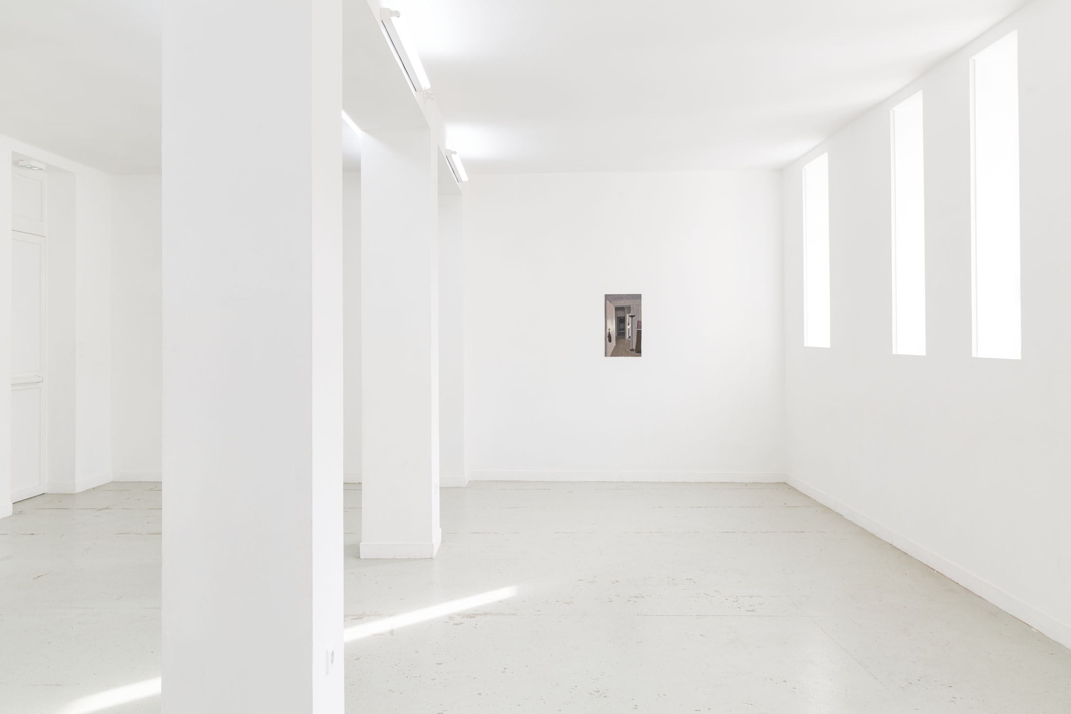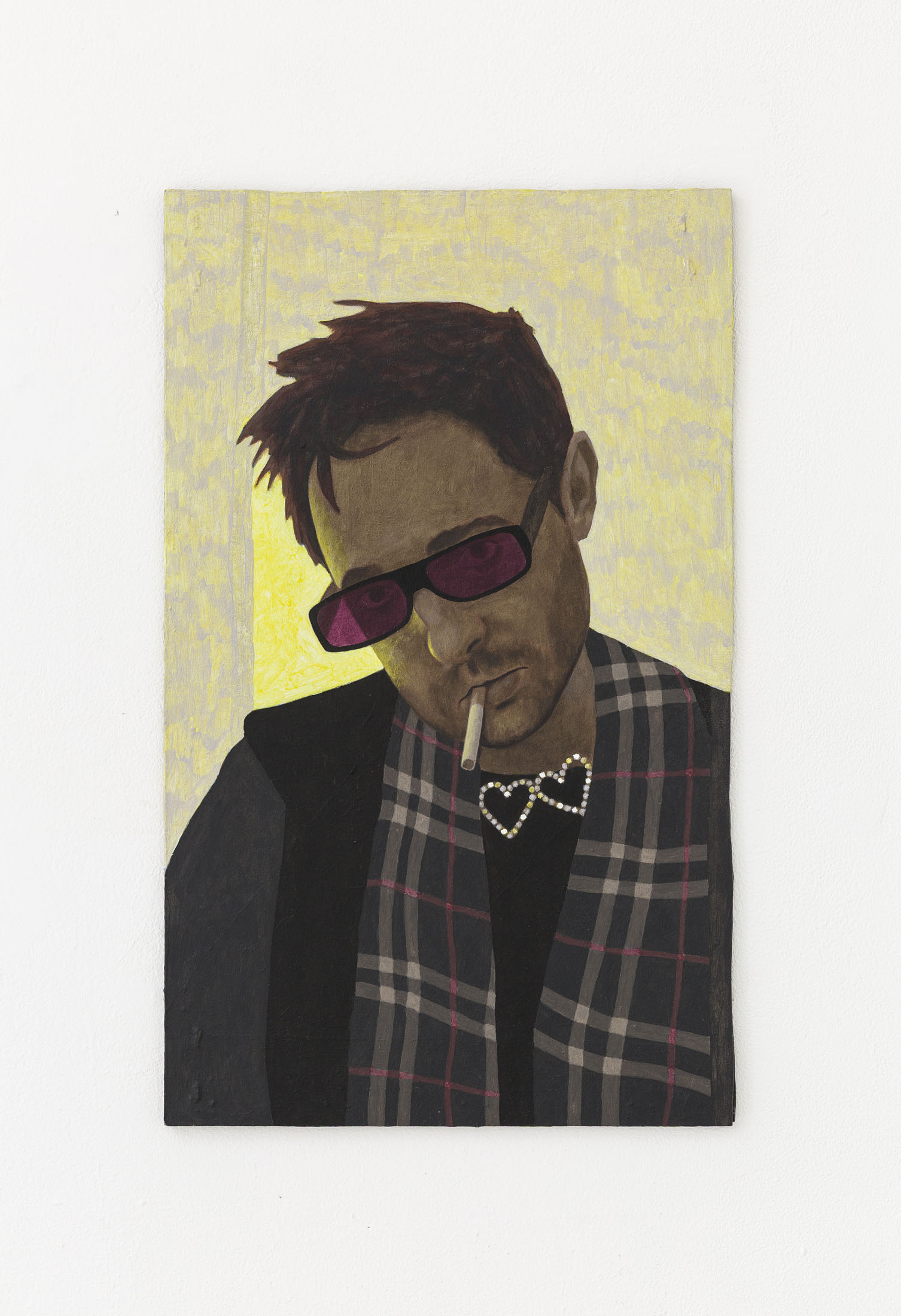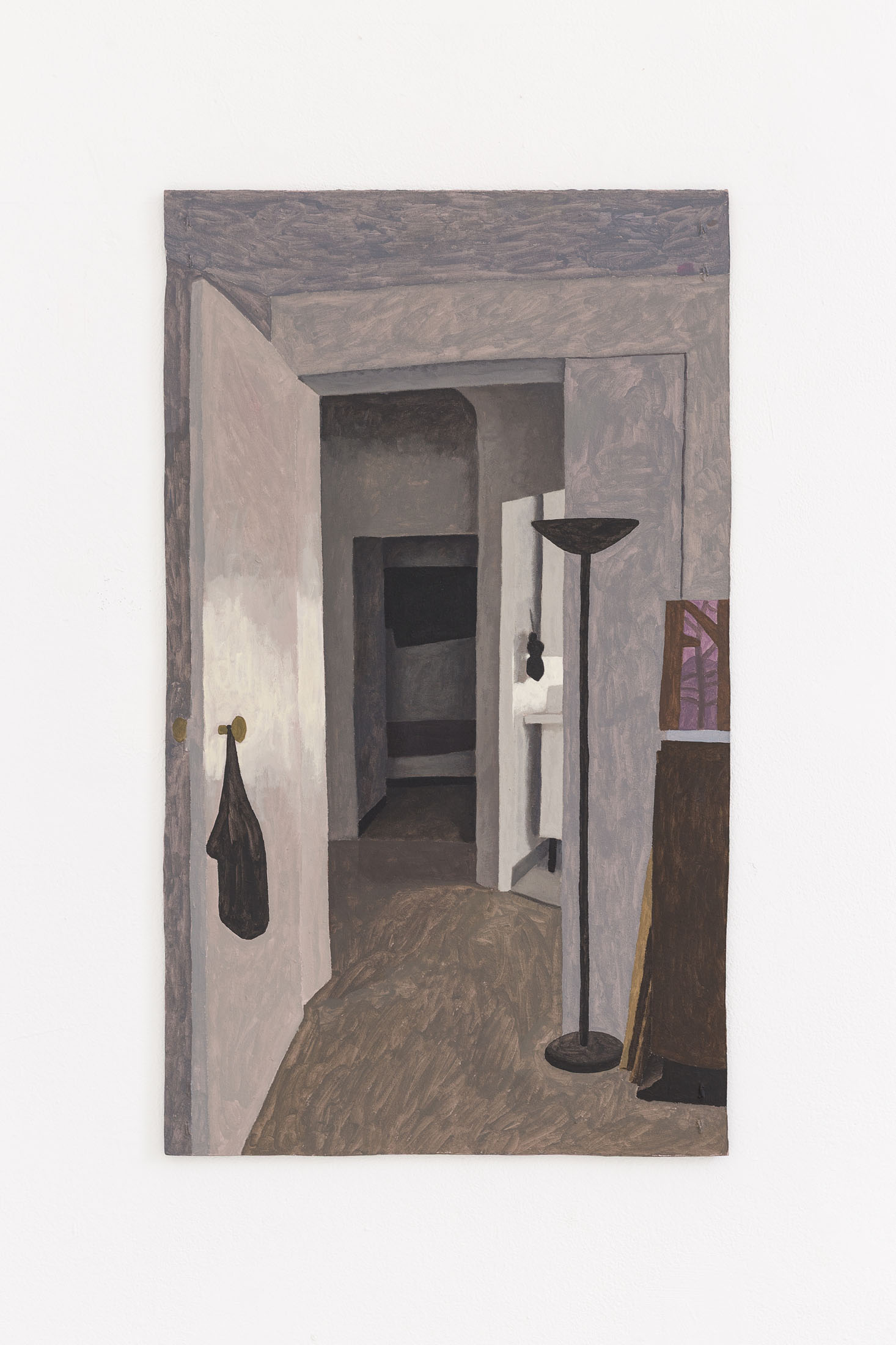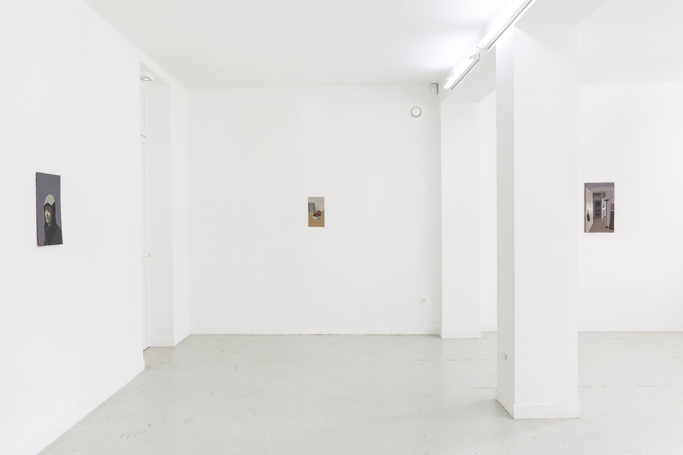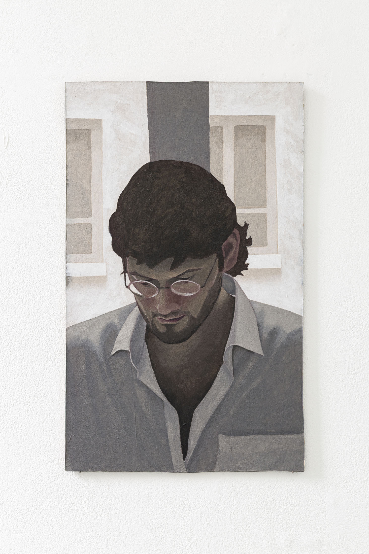 It is a world of interiors with no way out, no vistas leading the eye elsewhere. The curtains are drawn, the perspectives blocked off. At the same time, this spare interior contains exactly what it should: a few pieces of fruit, friendly figures, and painting itself. For unlike the earlier eponymous exhibitions, the “recent paintings” of this show are both presented and represented. One of the pictures on display indeed figures three paintings set at the foot of a window, the window of Matthieu’s room. The three are very colorful and differ from each other. One depicts an apple green “pom” logo, the other is striped, and the third, more fluid, seems covered in puddles of various colors. In the background of the still life a small abstract painting can be seen. Matthieu produced these four pictures “for real” but decided not to exhibit them, at least not outside the space of the apartment/painting. They have nothing to do with the rather realist yellowish brown austere style he used to represent the interior containing them. As far as I know, this is the first time he gives a meta treatment to the coexistence of his different styles, lending this new group a more reflexive, even analytical tonality. Painting is put into perspective, the (uninhabited) interiors and (noncontextualized) figures have been separated. Nor is there any real continuity between the three portraits. Each of the men that Matthieu paints has his own manner, as if their look each time called for a new approach to representation or a different legacy for figurative painting. I am put in mind of 17th-century painting in several regards – Vermeer, for his window and painting-within-a-painting effects; Zurbaran with his sculptural cowls that cast shadows down on the faces beneath them. Painting is never recent; Matthieu Palud’s painting changes completely, then draws in, lets time go by and cuts itself off… sometimes.