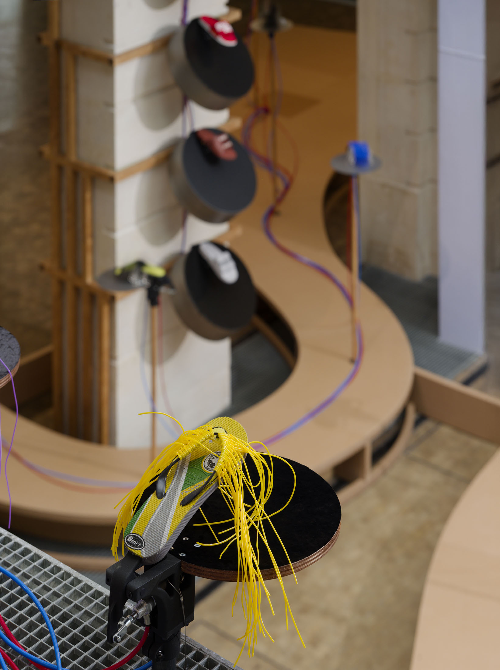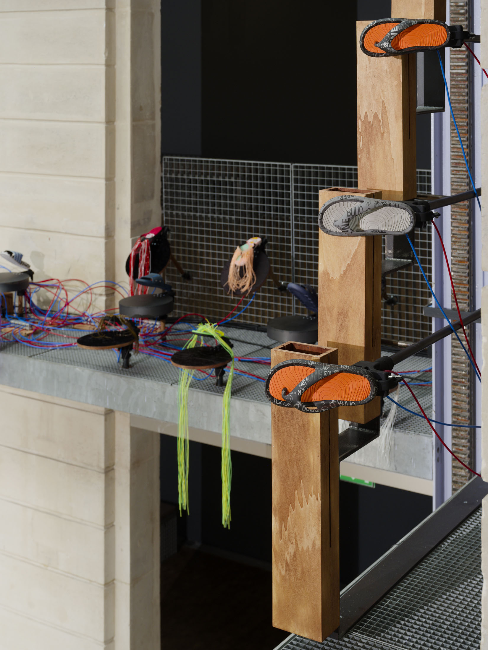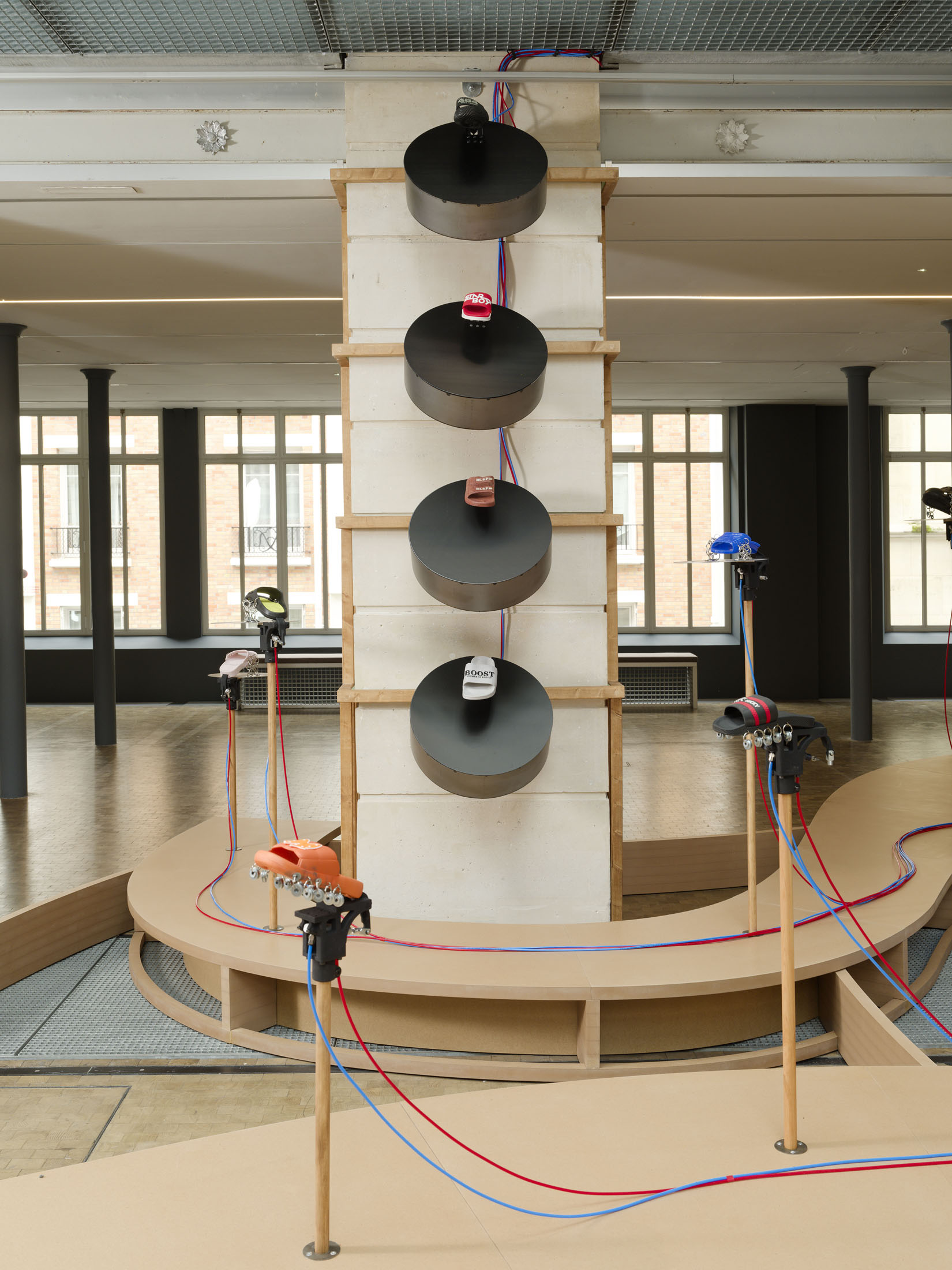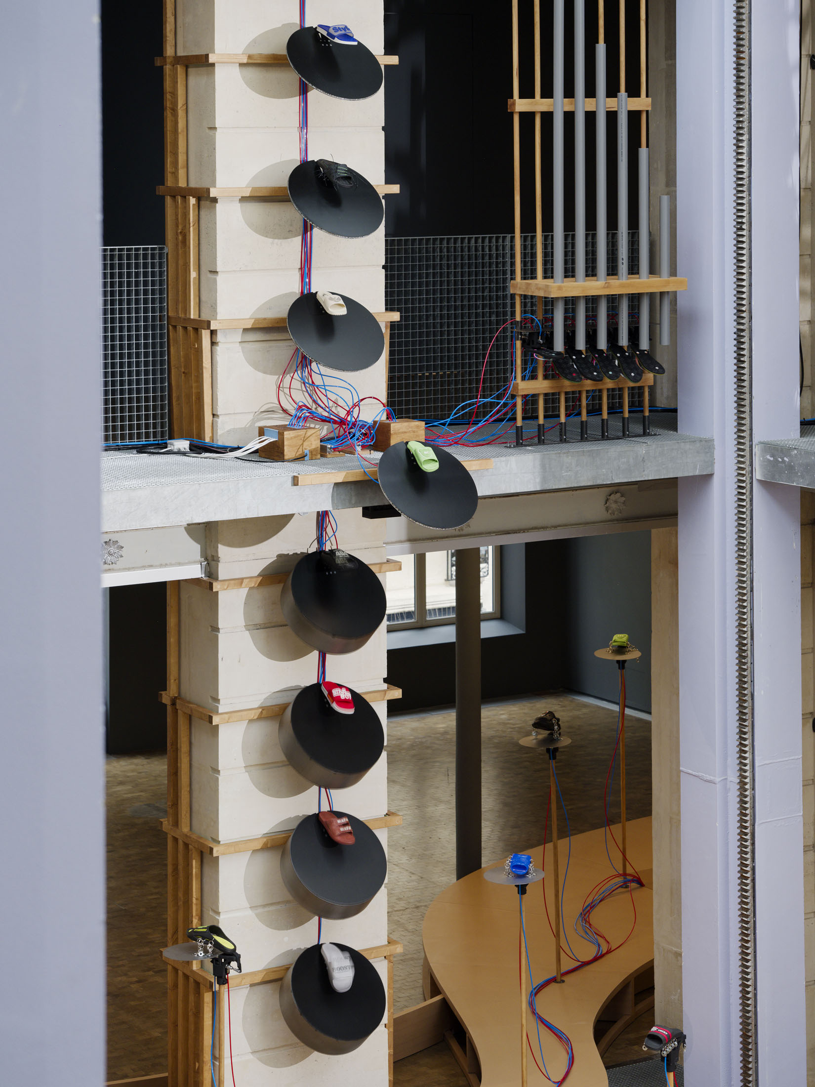 The work’s title plays o the expression “soul-crushing” with the materiality of the sandals’ soles, which both keep time and rhythmically sync up with what can become an overwhelming sonic power. First exhibited at the Fondazione Prada in Milan in 2024–25, Sole crushing has been completely readapted for Lafayette Anticipations with new instruments and a new musical composition. Meriem Bennani invites visitors to wander through the space, absorbing an experience of collective joy or uprising.