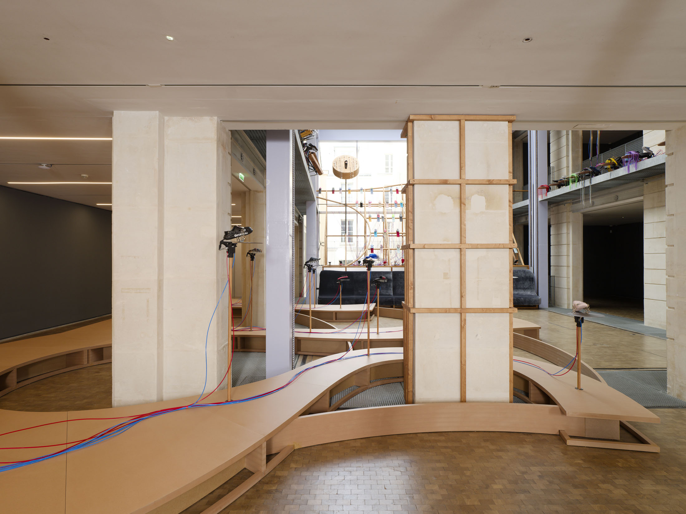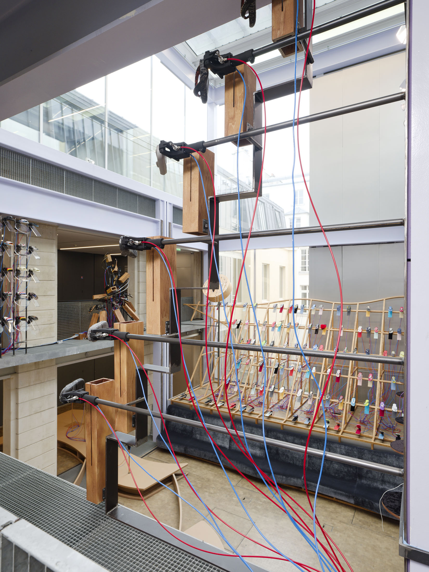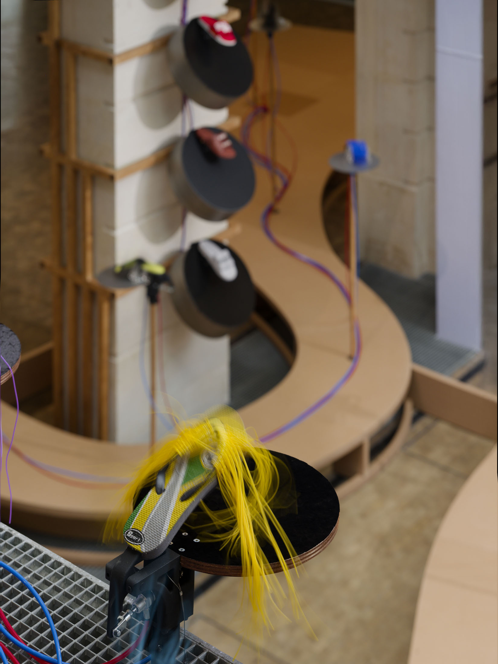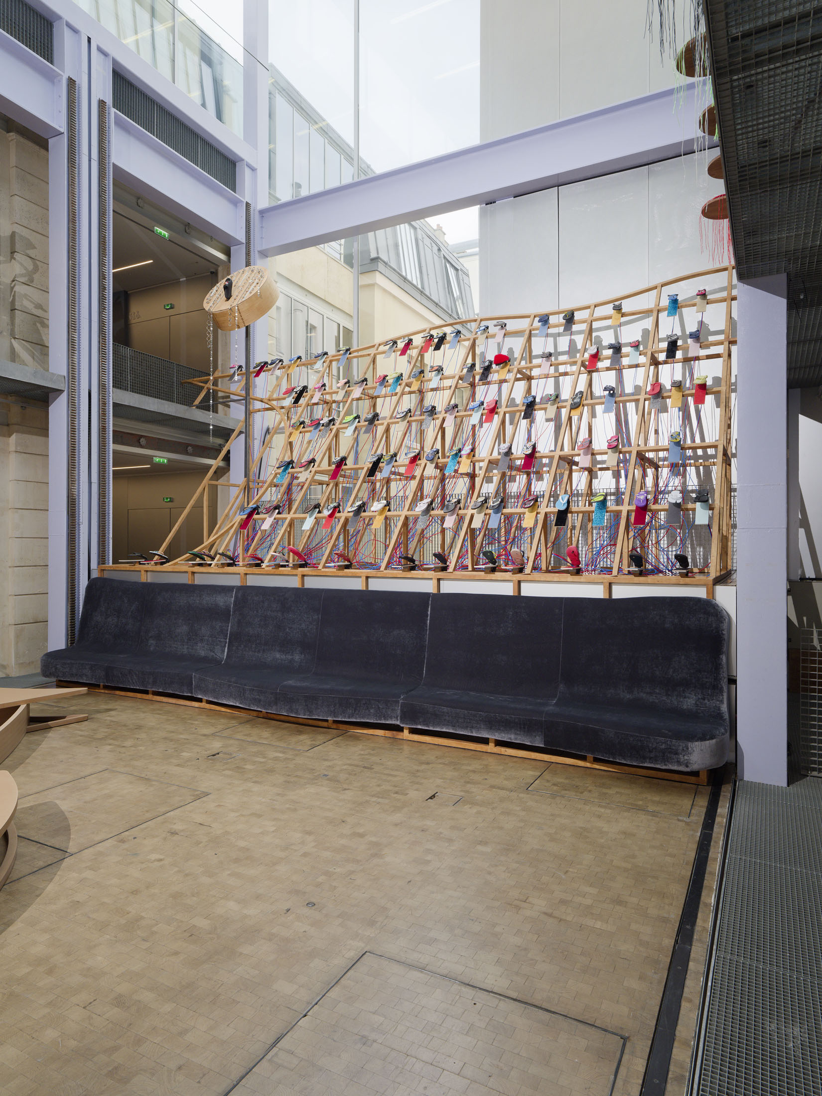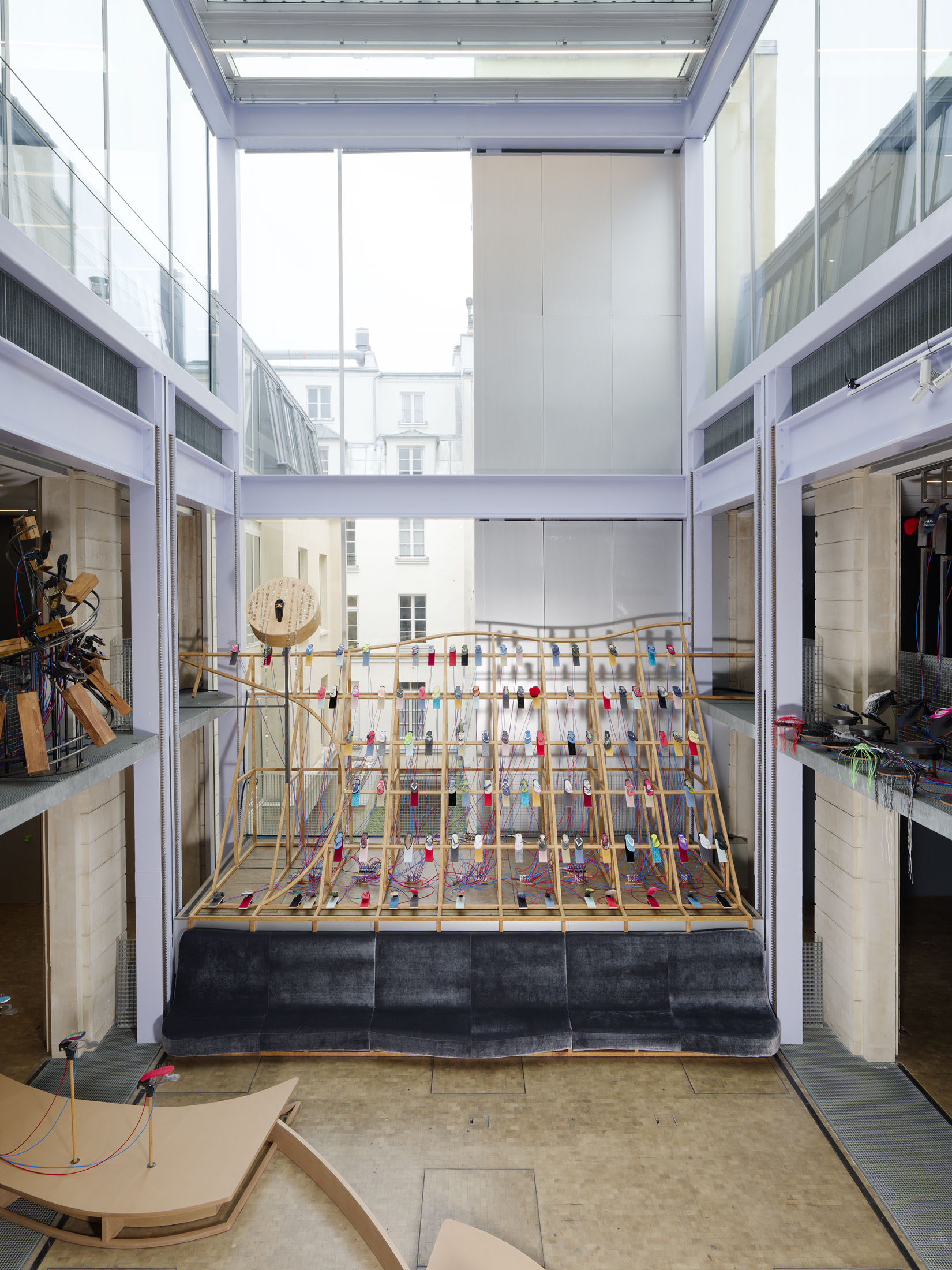 The work’s title plays o the expression “soul-crushing” with the materiality of the sandals’ soles, which both keep time and rhythmically sync up with what can become an overwhelming sonic power. First exhibited at the Fondazione Prada in Milan in 2024–25, Sole crushing has been completely readapted for Lafayette Anticipations with new instruments and a new musical composition. Meriem Bennani invites visitors to wander through the space, absorbing an experience of collective joy or uprising.