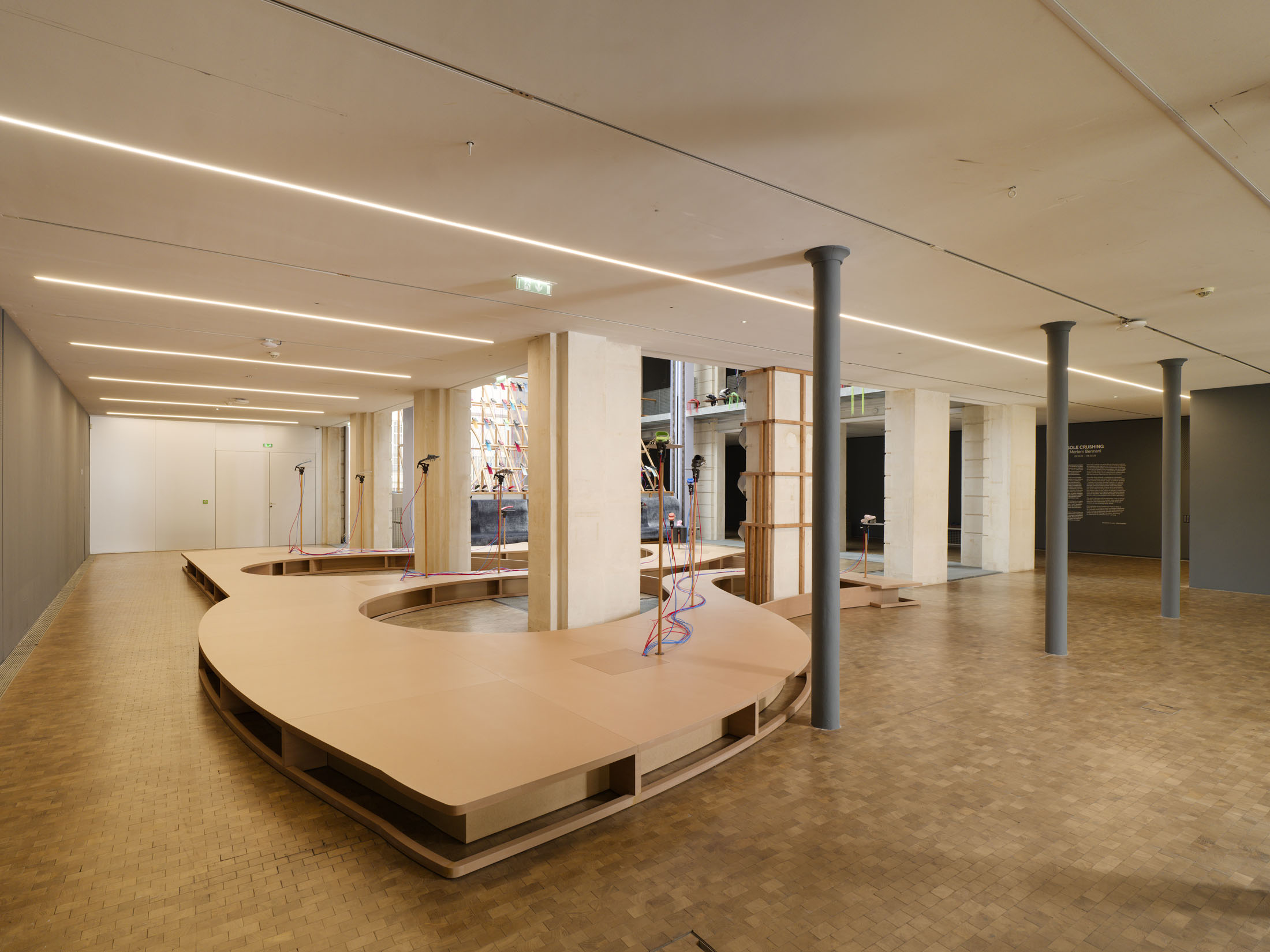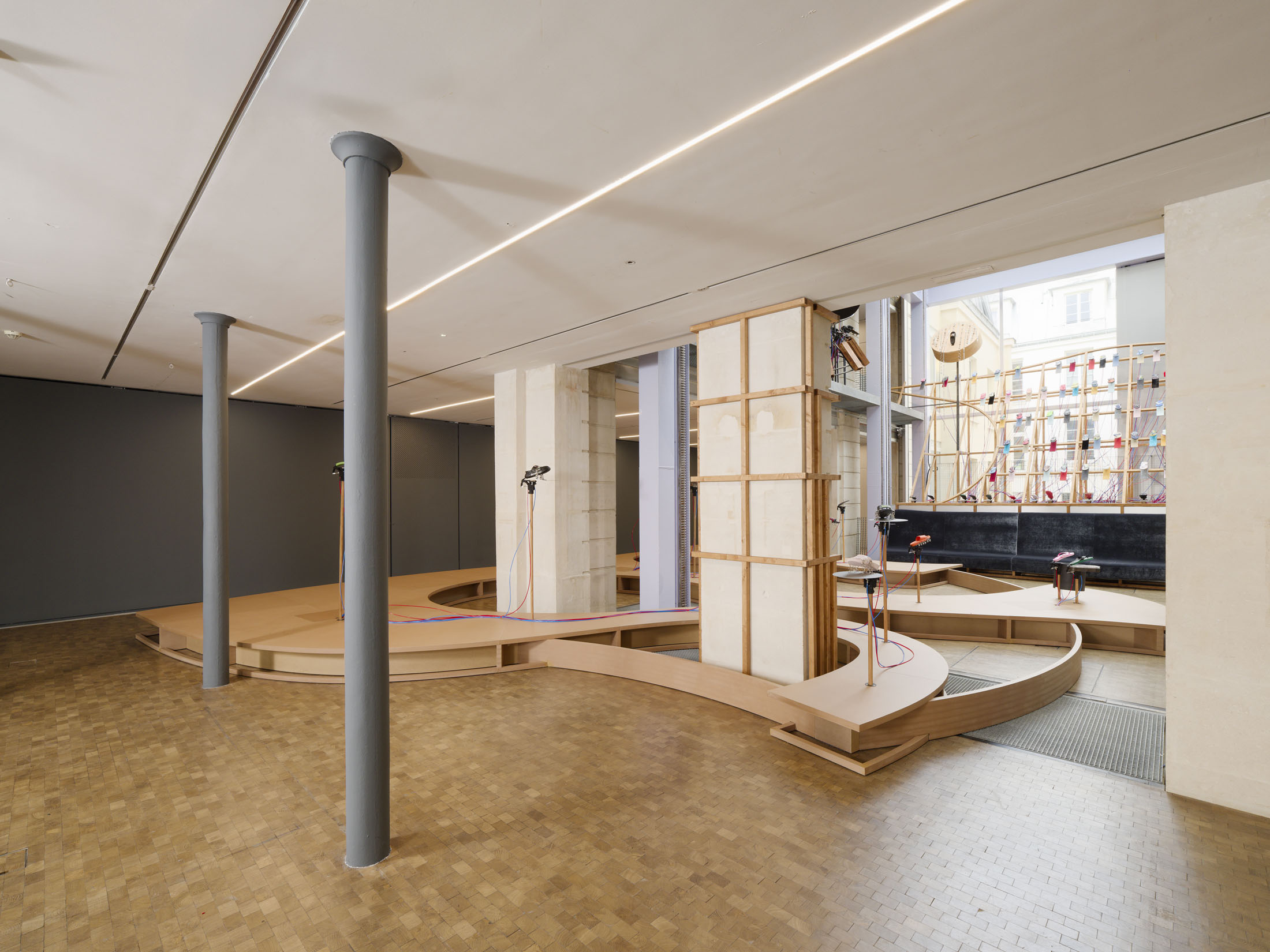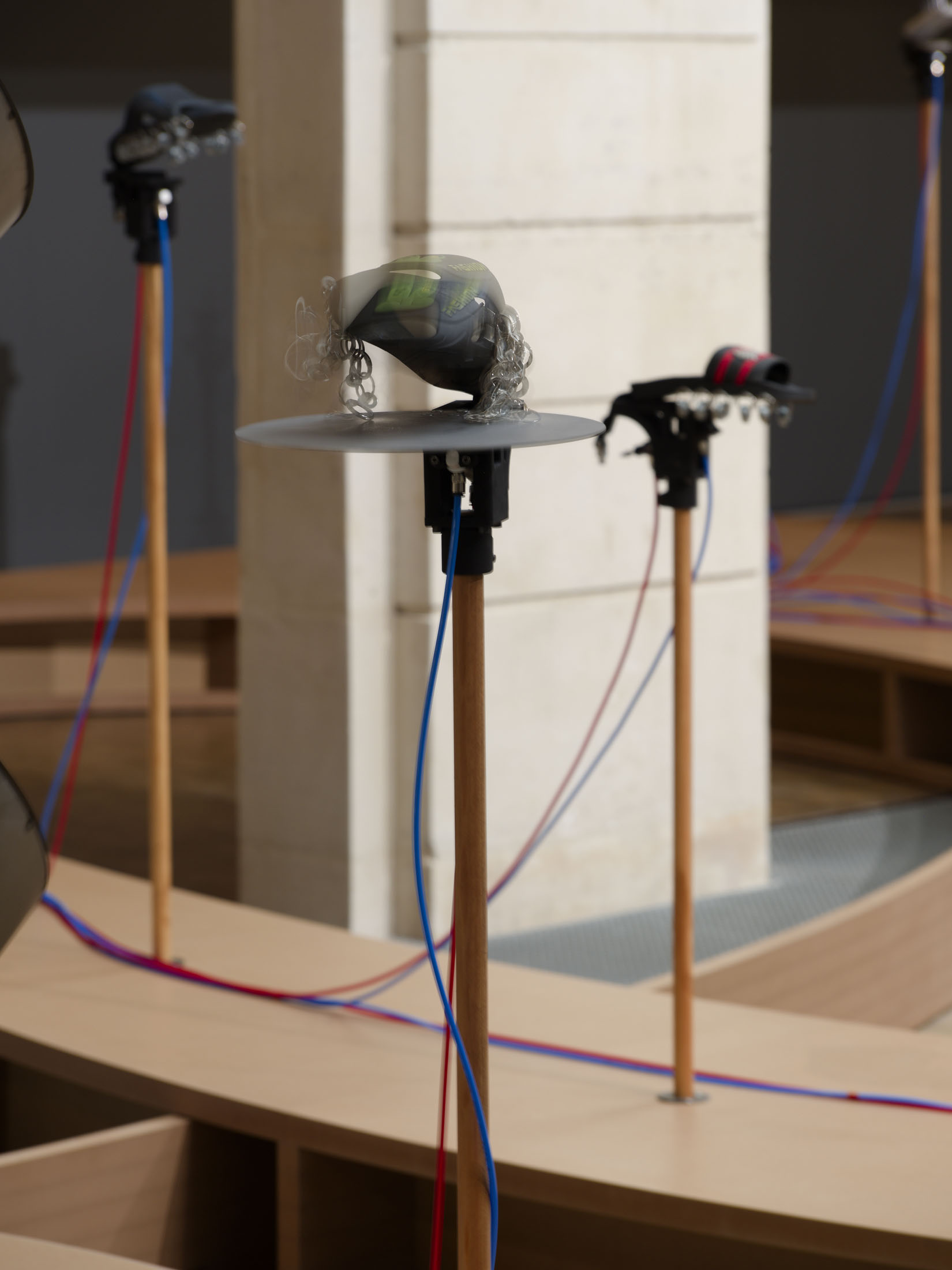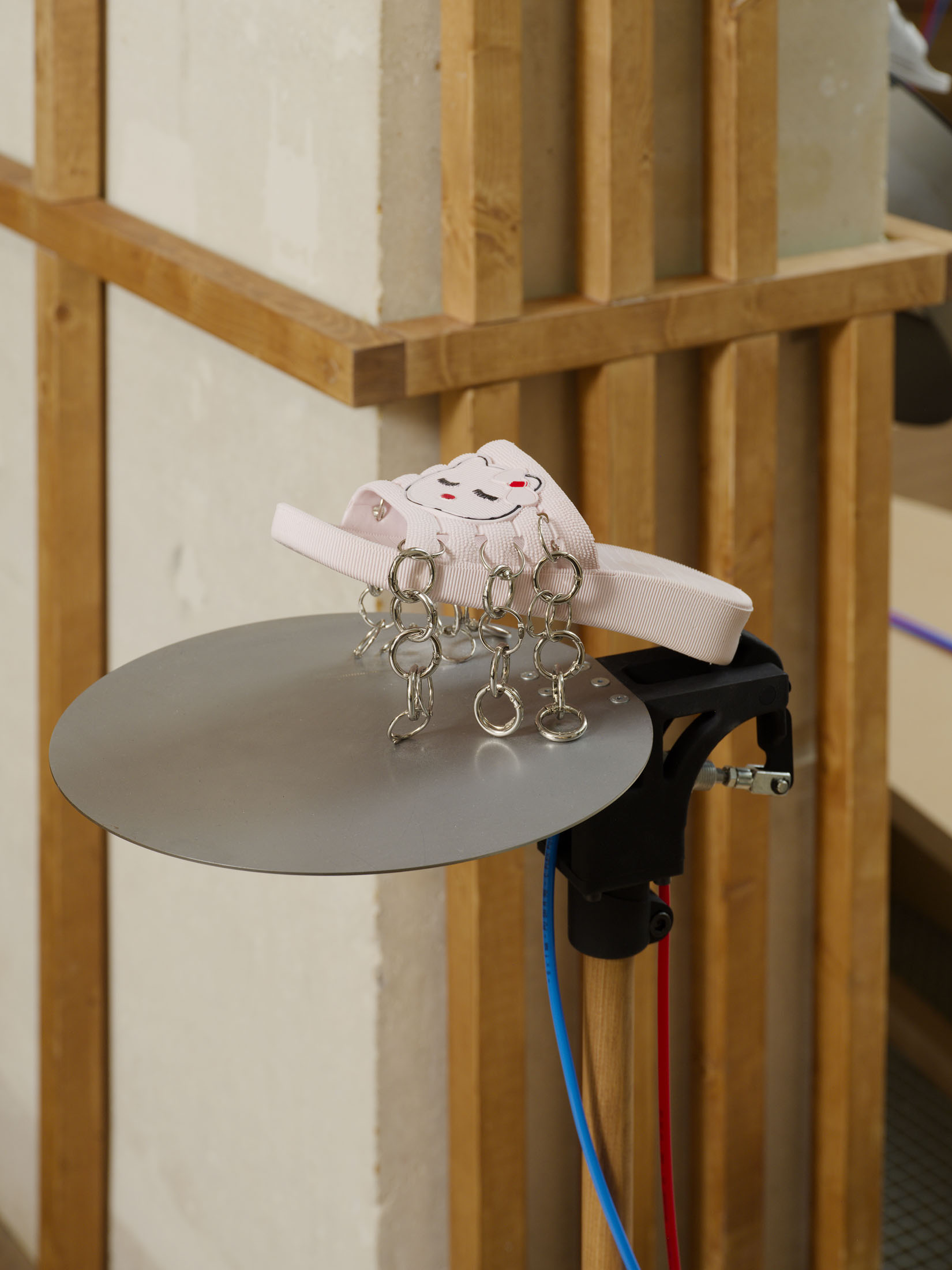 The work’s title plays o the expression “soul-crushing” with the materiality of the sandals’ soles, which both keep time and rhythmically sync up with what can become an overwhelming sonic power. First exhibited at the Fondazione Prada in Milan in 2024–25, Sole crushing has been completely readapted for Lafayette Anticipations with new instruments and a new musical composition. Meriem Bennani invites visitors to wander through the space, absorbing an experience of collective joy or uprising.