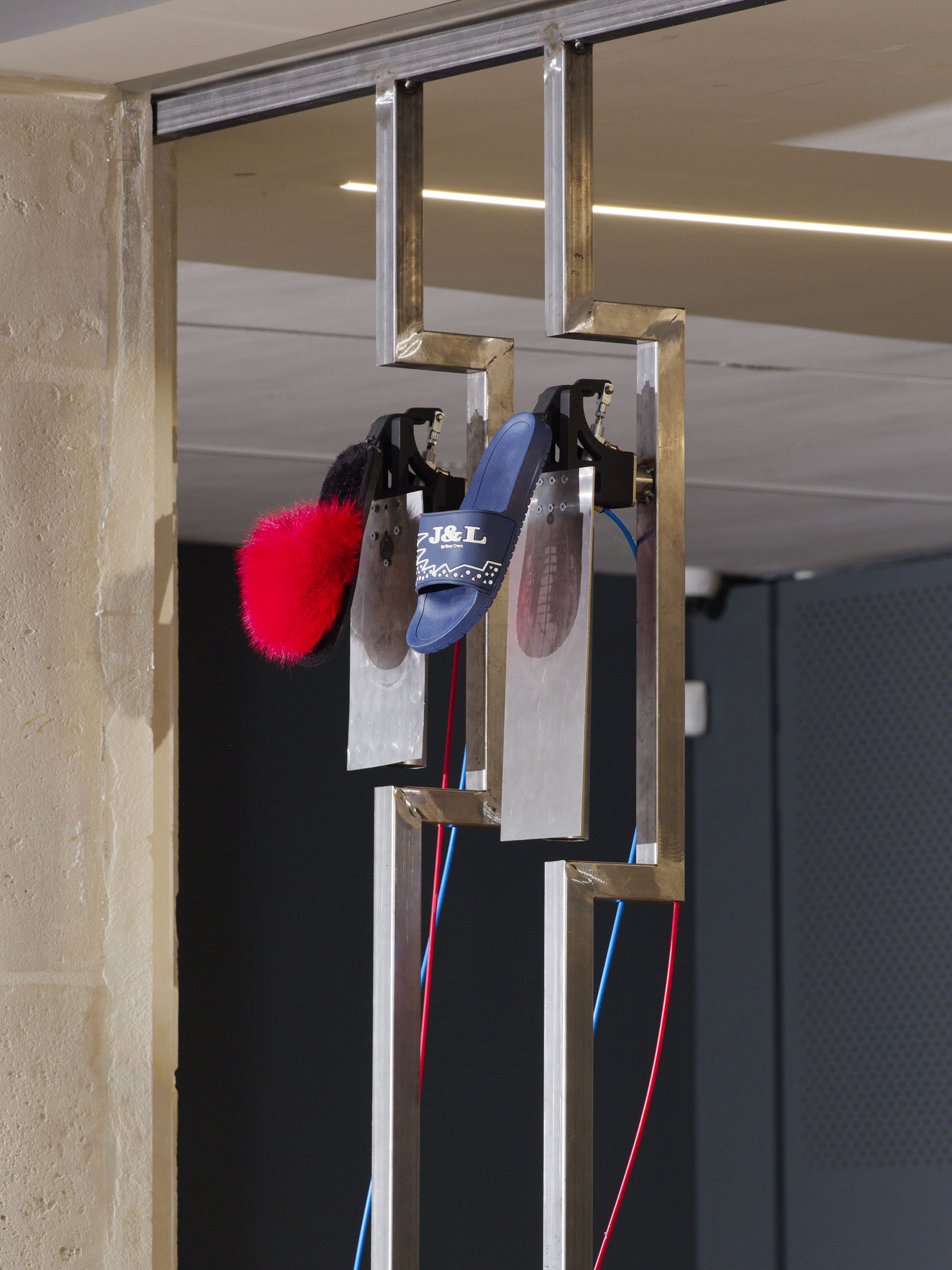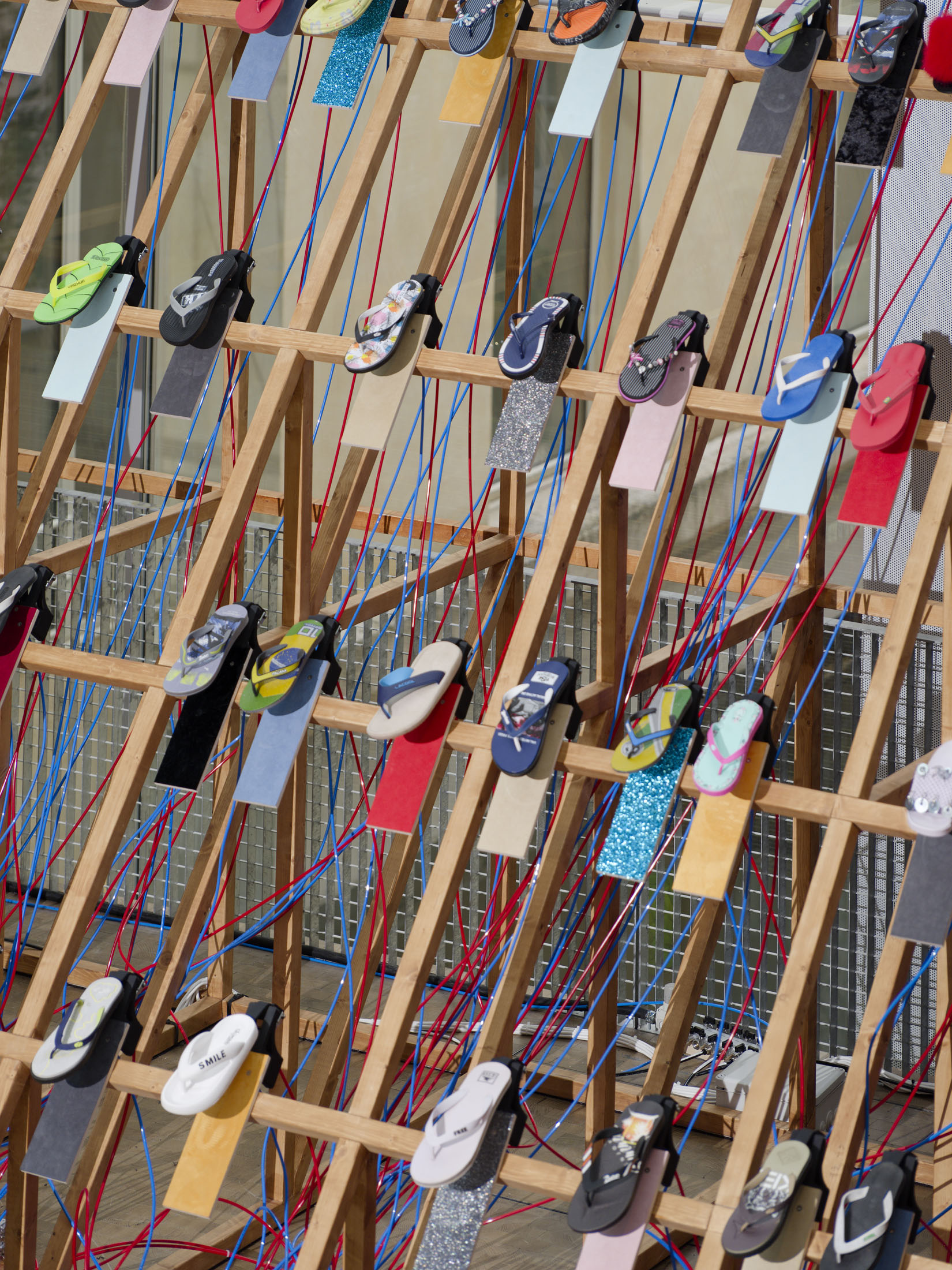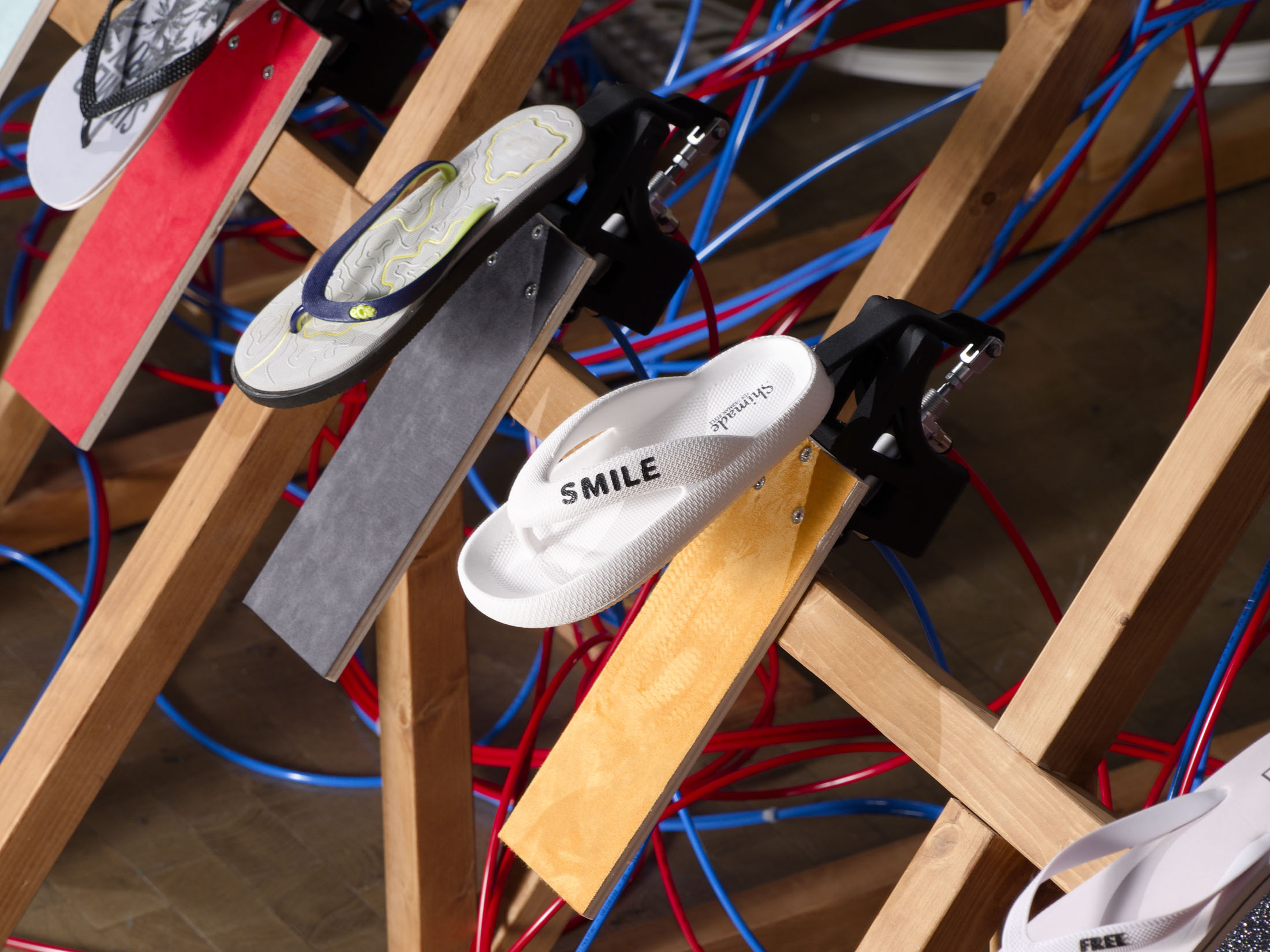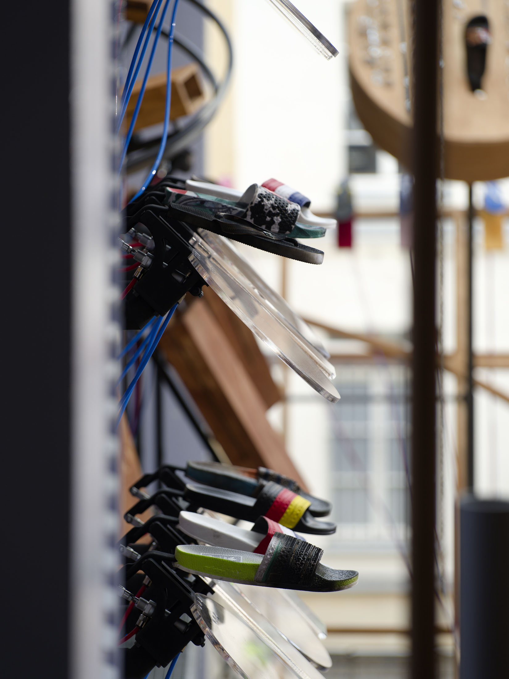 With Sole crushing, the artist Meriem Bennani proposes an installation that explores the notion of being together and the individual’s place in the community. Unfolding across the full height of the Fondation, the work stages some 200 fip-fops that are animated by a pneumatic system, performing a score composed in collaboration with the musician Reda Senhaji (aka Cheb Runner).