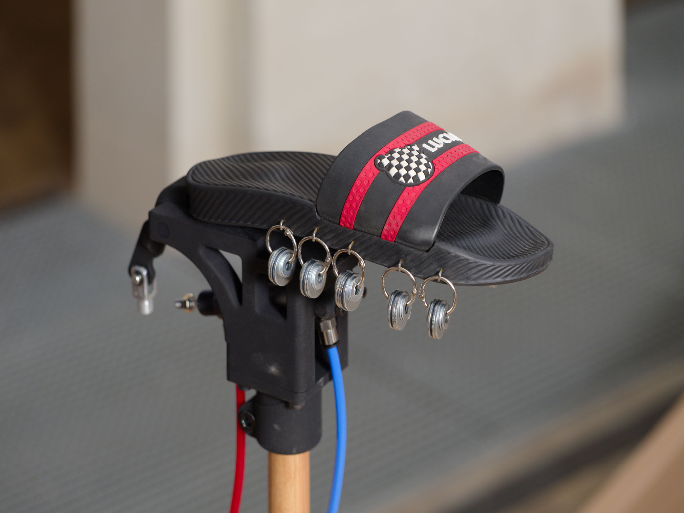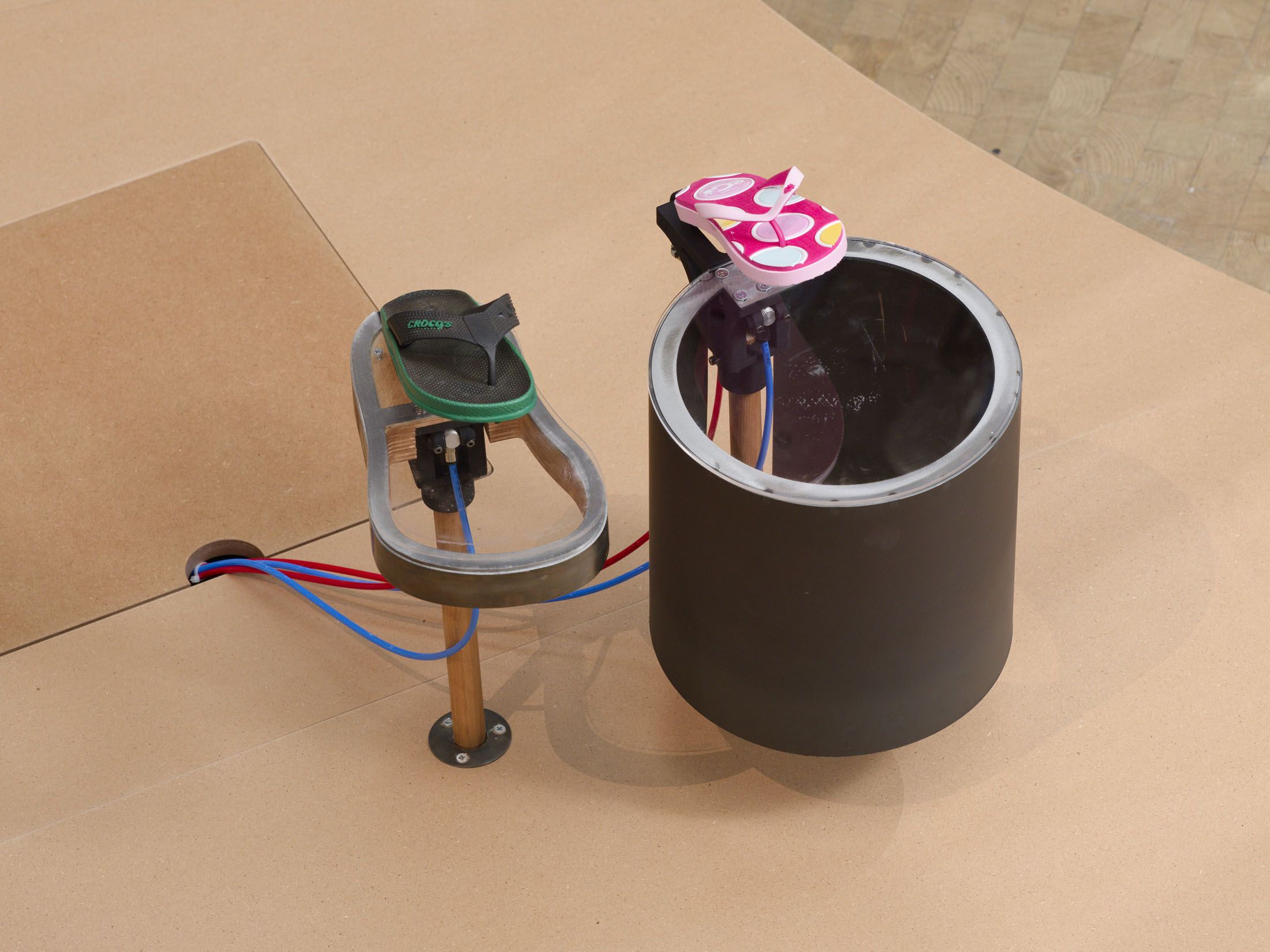 These fip-fops embody a multitude of characters and evoke collective moments where bodies are united by the rhythms of footsteps, songs, or political uprisings — whether at a protest, football stadium, or musical ceremonies. Fascinated by such contagious collective energies, the artist takes further cues from dakka marrakchia, a Moroccan ritual in which participants play music while reaching a peak of spiritual intensity.