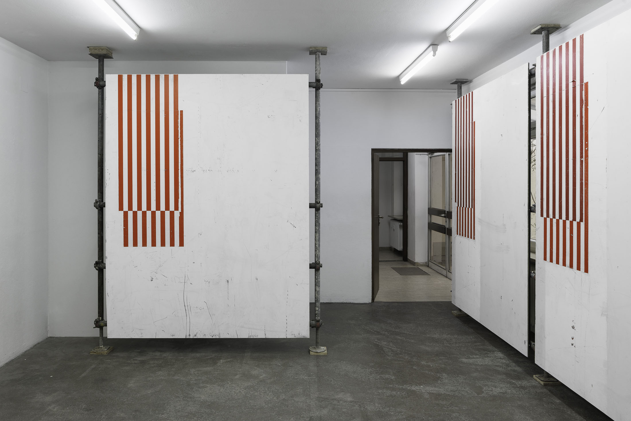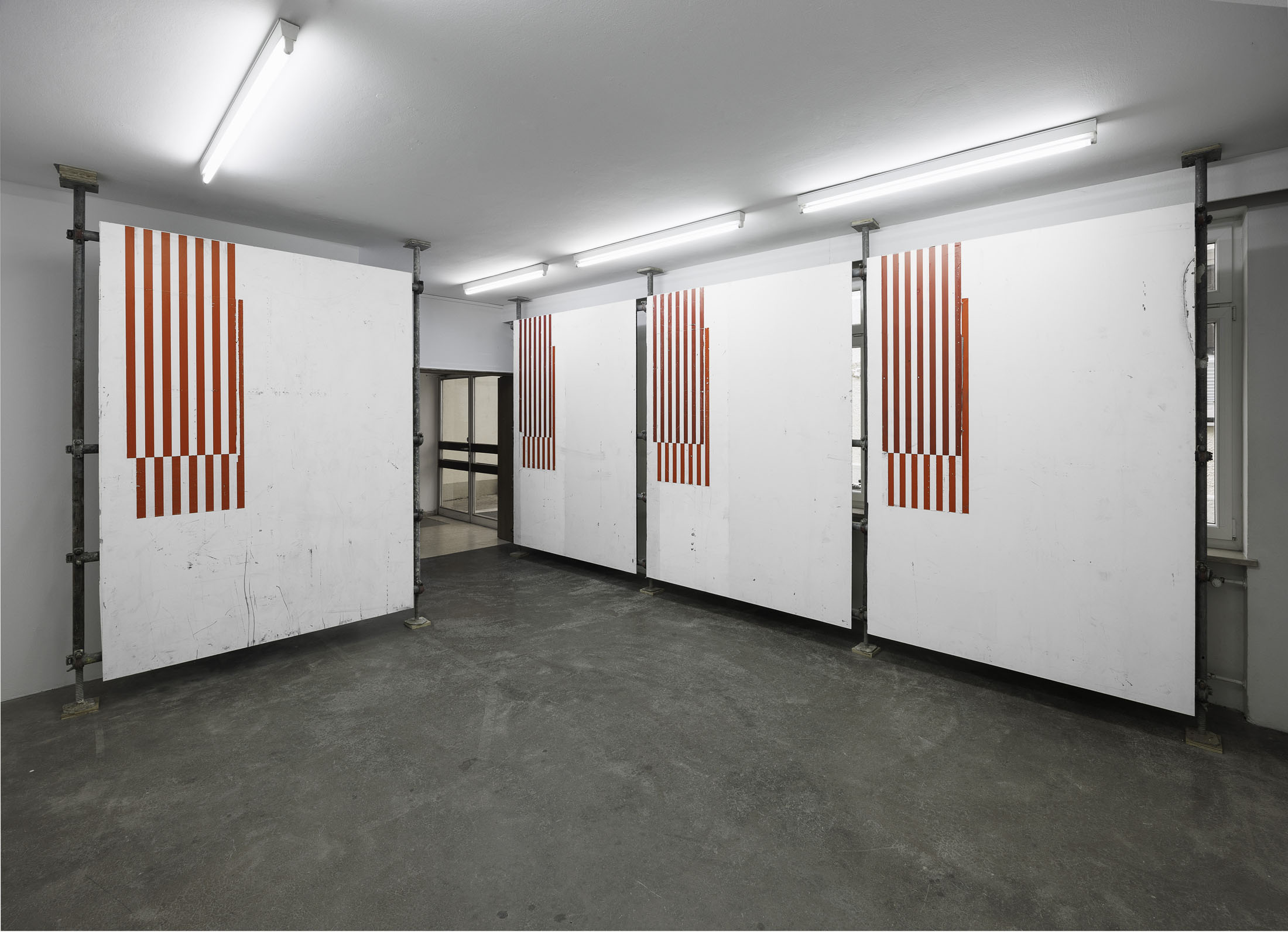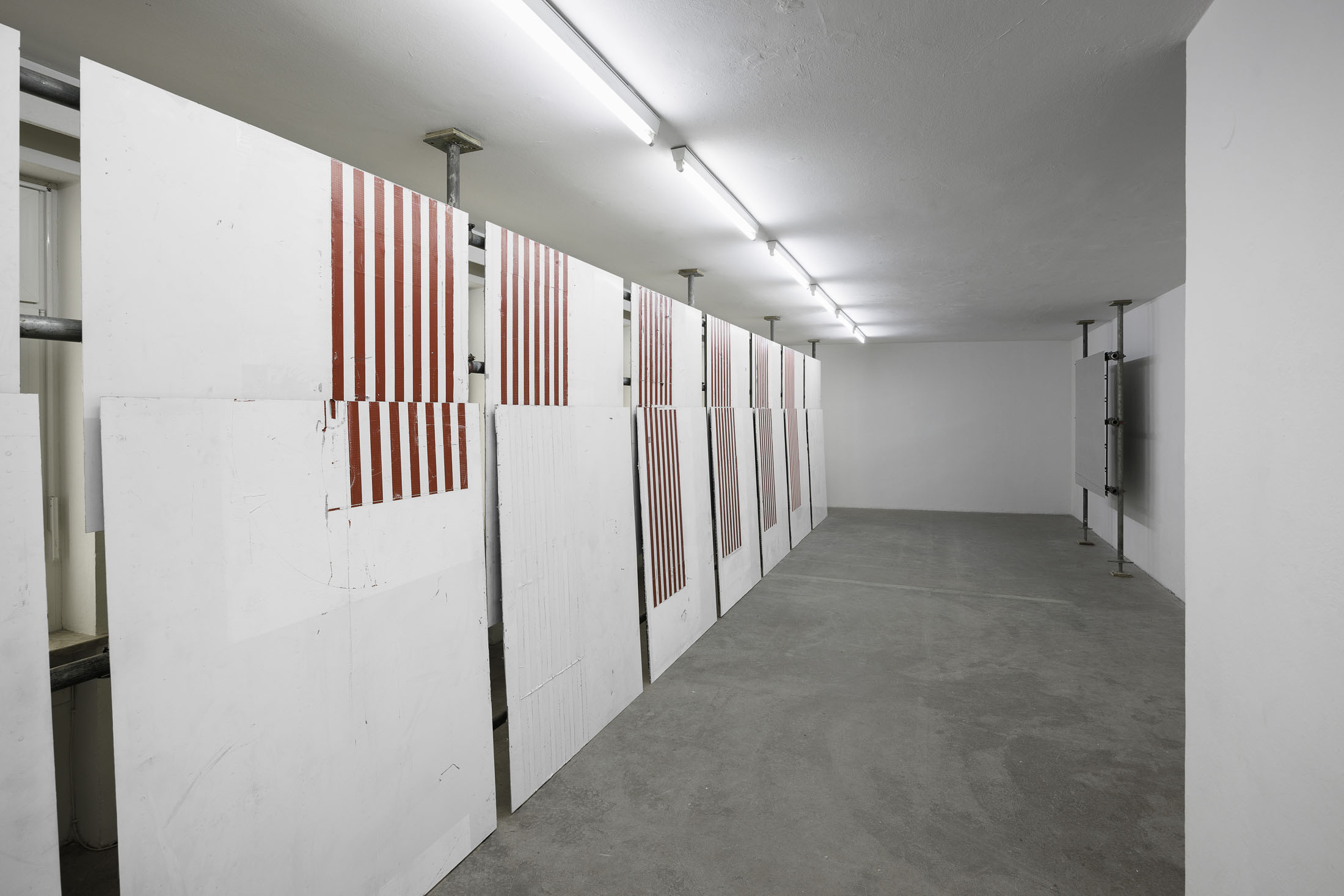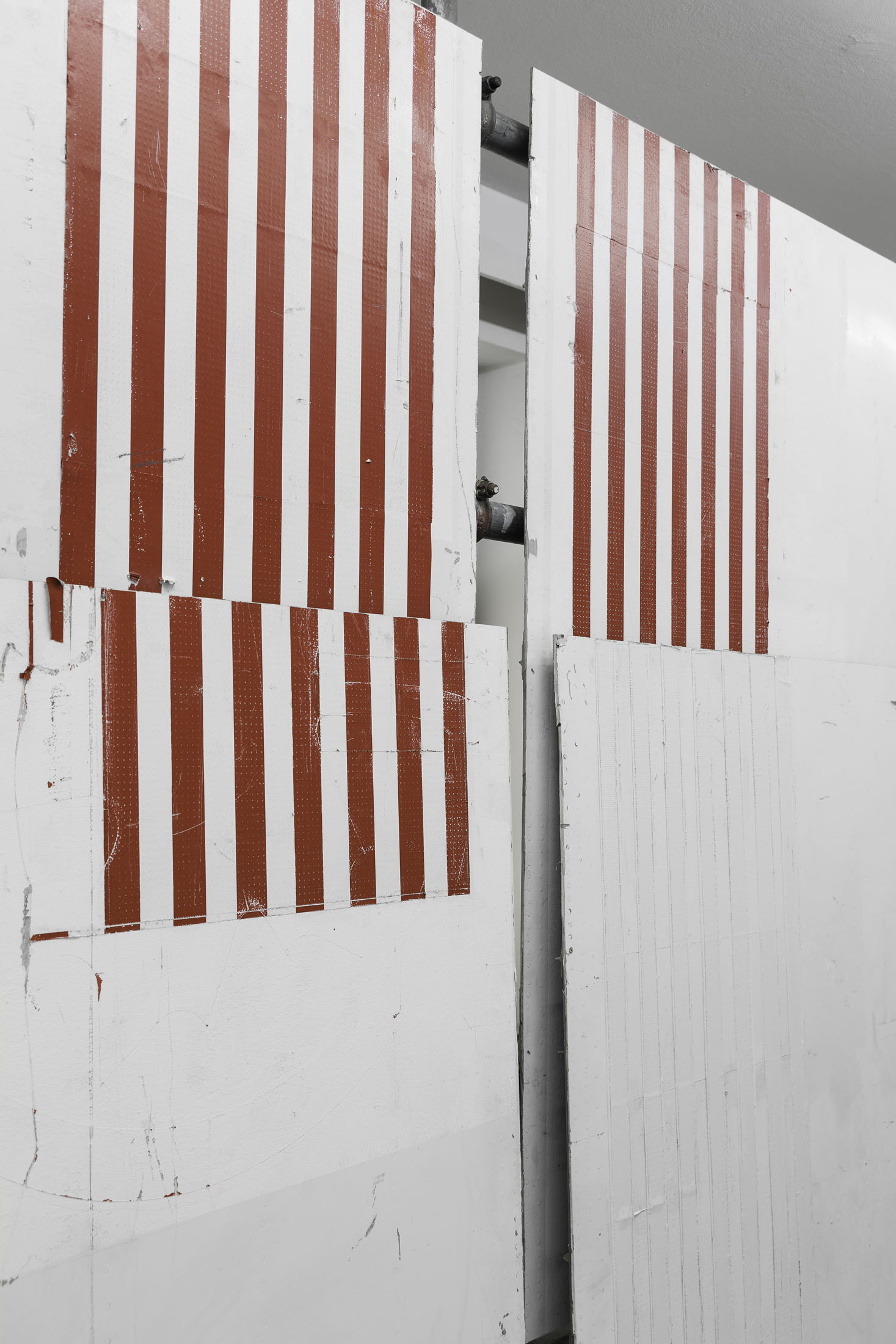 In »Hawaiian Hills« Michail Pirgelis introduces his latest work series in a site-specific installation spanning two floors. The works are crafted from original red-and-white striped aircraft parts—abstracted fragments of flags. Pirgelis intervenes to varying effect in the design of these found materials using cutouts and other surface treatments. With their red stripes, white backgrounds, and consistent formats, the works recall abstract Minimal Art paintings. Yet the title »Hawaiian Hills«, evokes a space of longing that seems at odds with a conceptual approach.