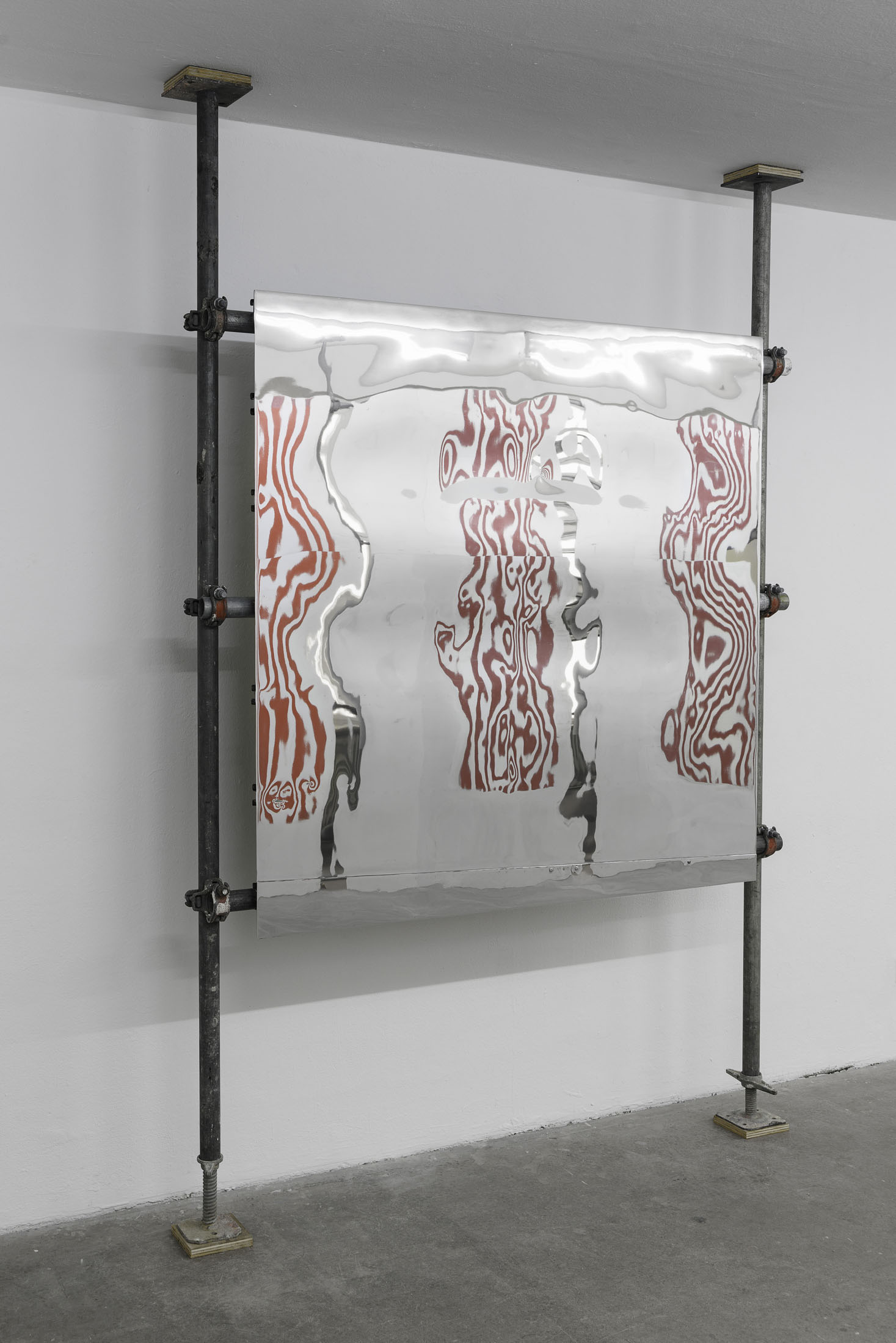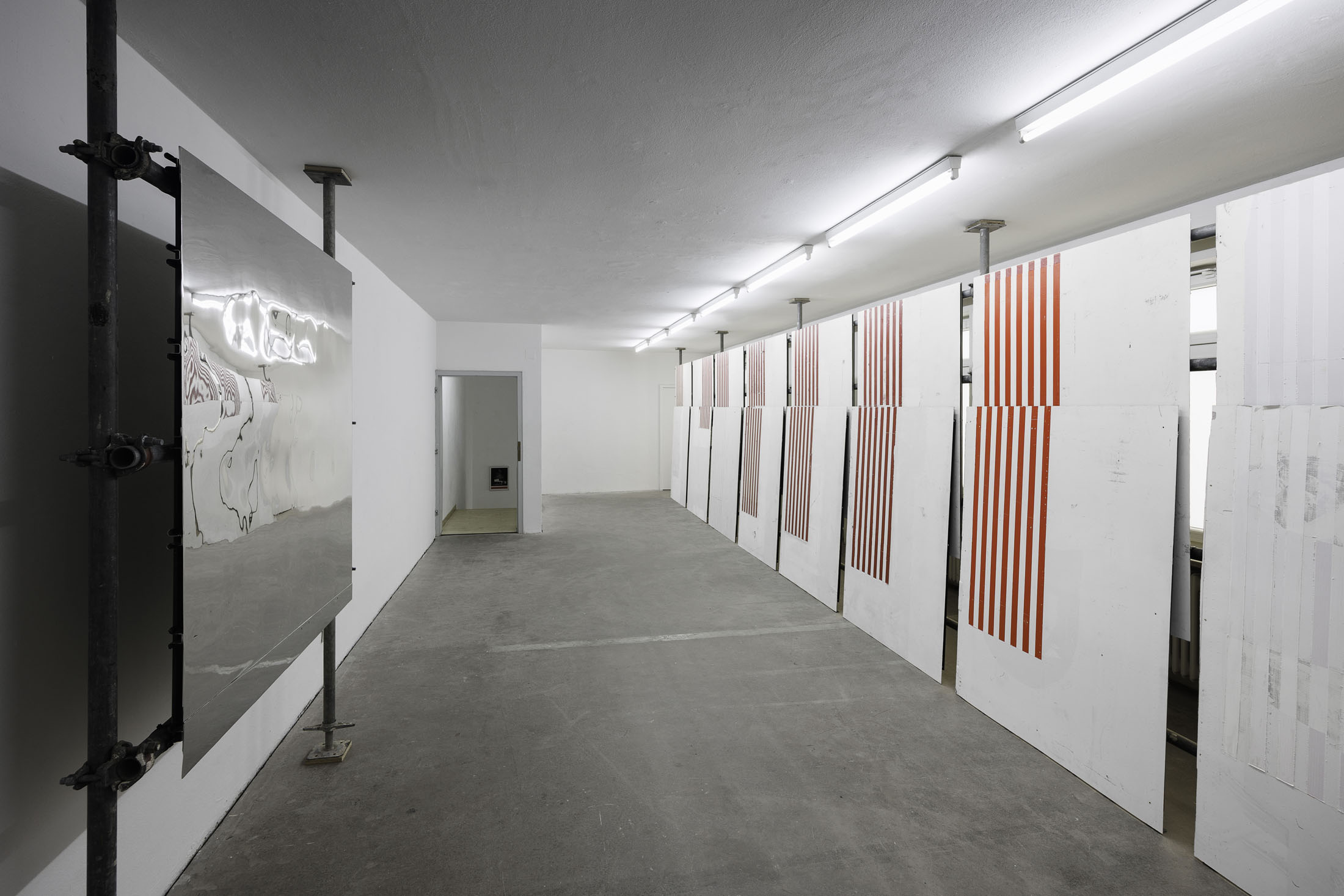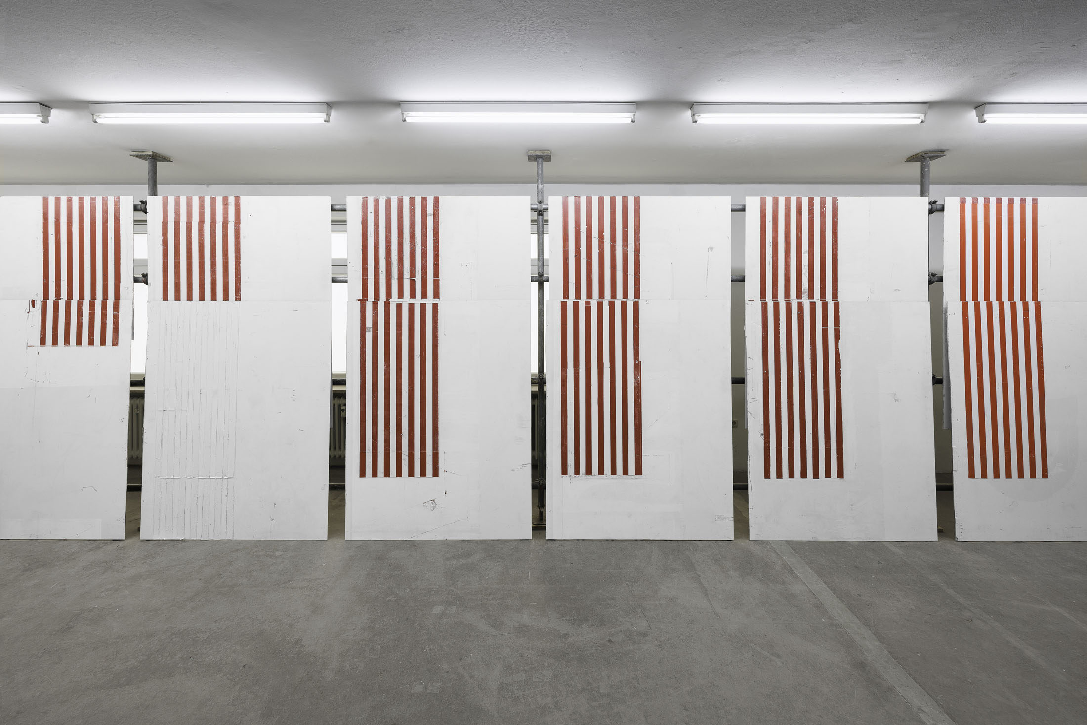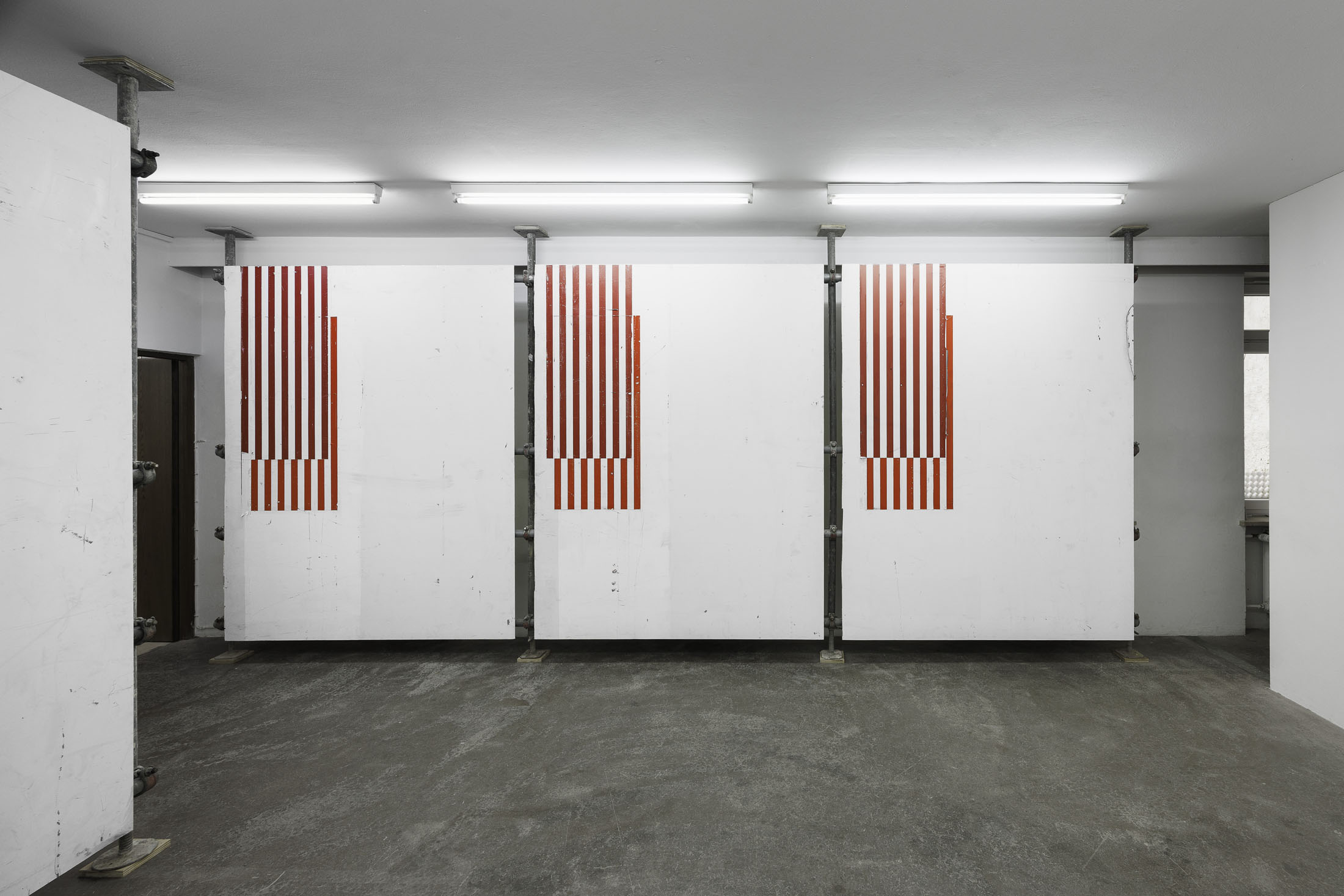 In »Hawaiian Hills« Michail Pirgelis introduces his latest work series in a site-specific installation spanning two floors. The works are crafted from original red-and-white striped aircraft parts—abstracted fragments of flags. Pirgelis intervenes to varying effect in the design of these found materials using cutouts and other surface treatments. With their red stripes, white backgrounds, and consistent formats, the works recall abstract Minimal Art paintings. Yet the title »Hawaiian Hills«, evokes a space of longing that seems at odds with a conceptual approach.