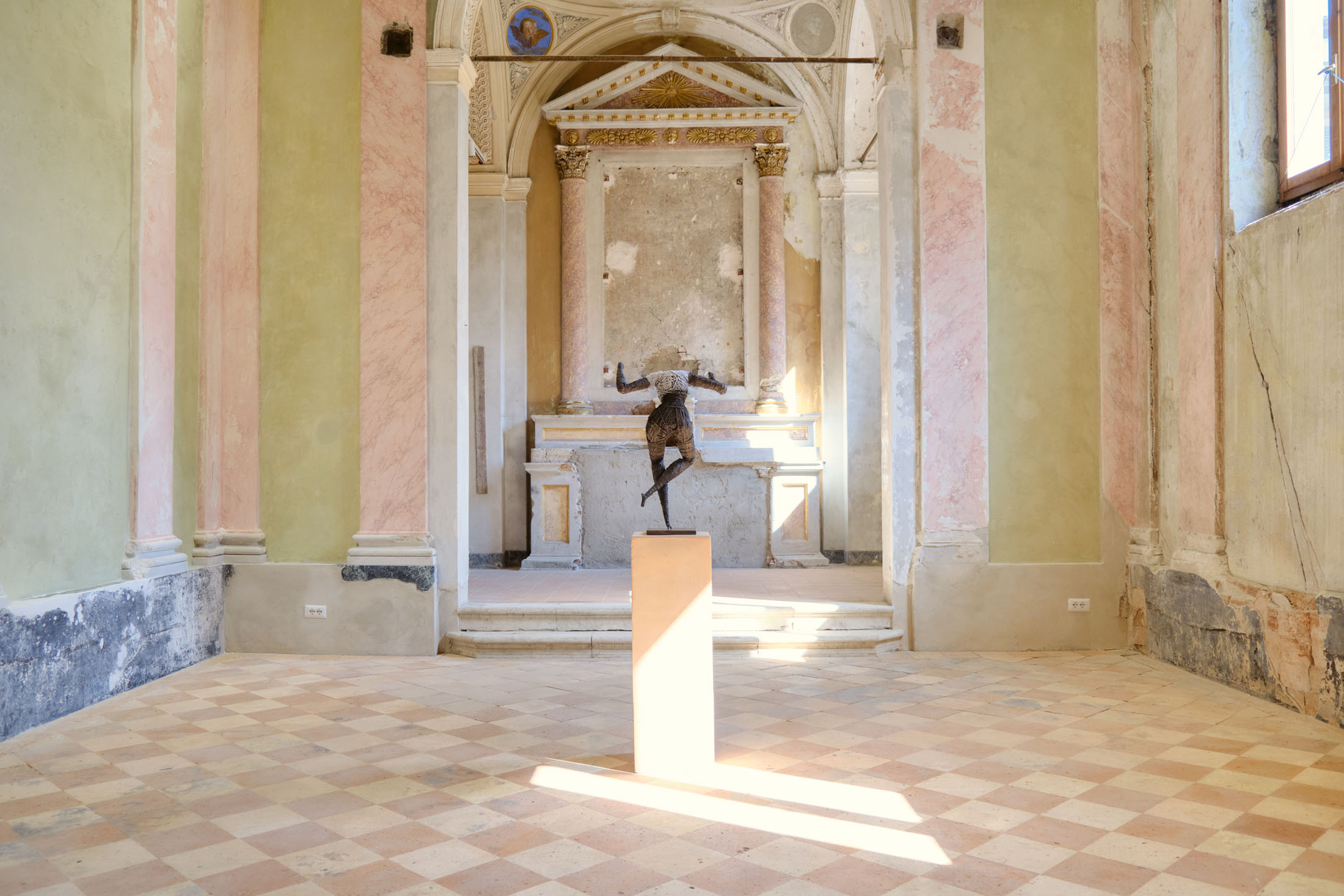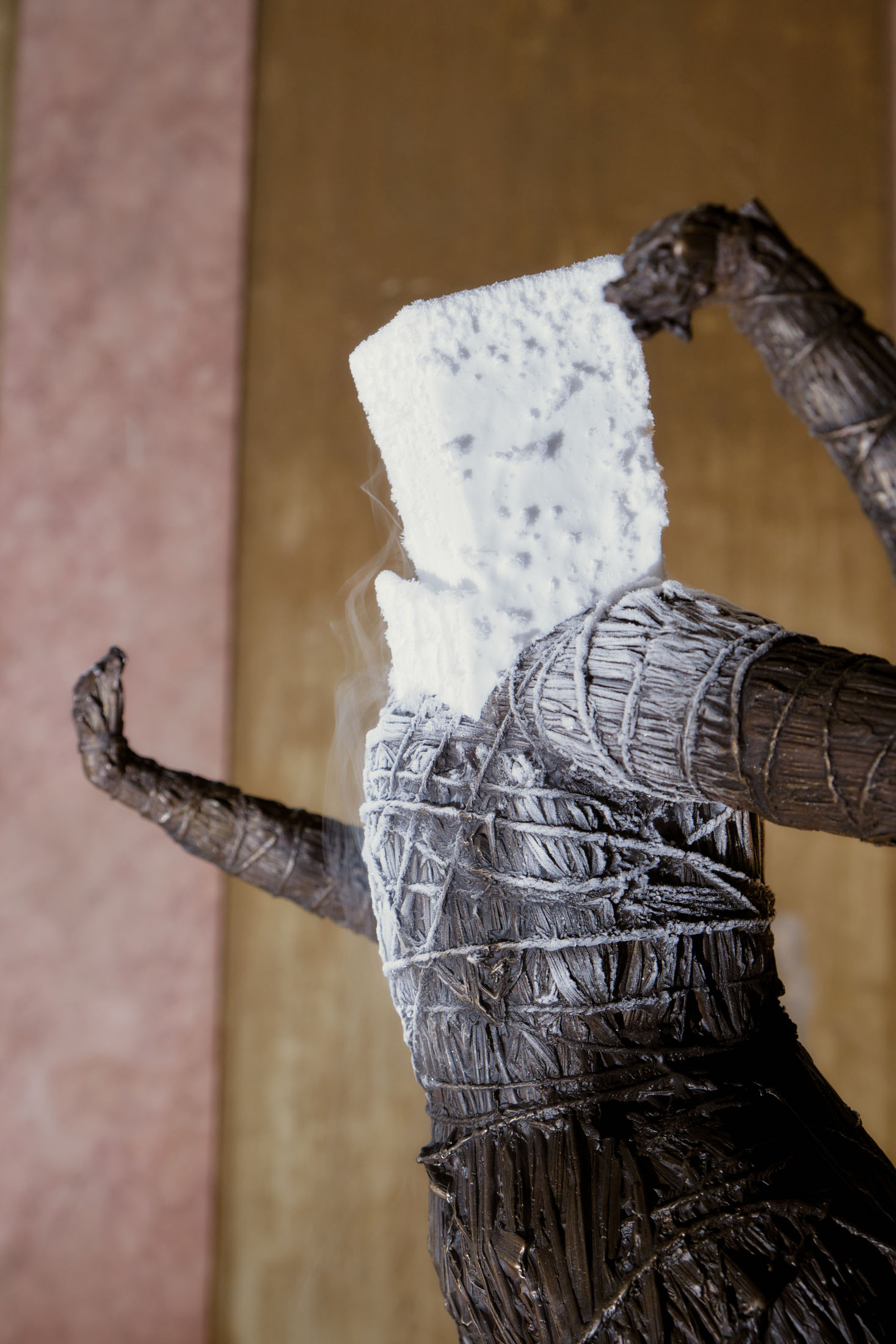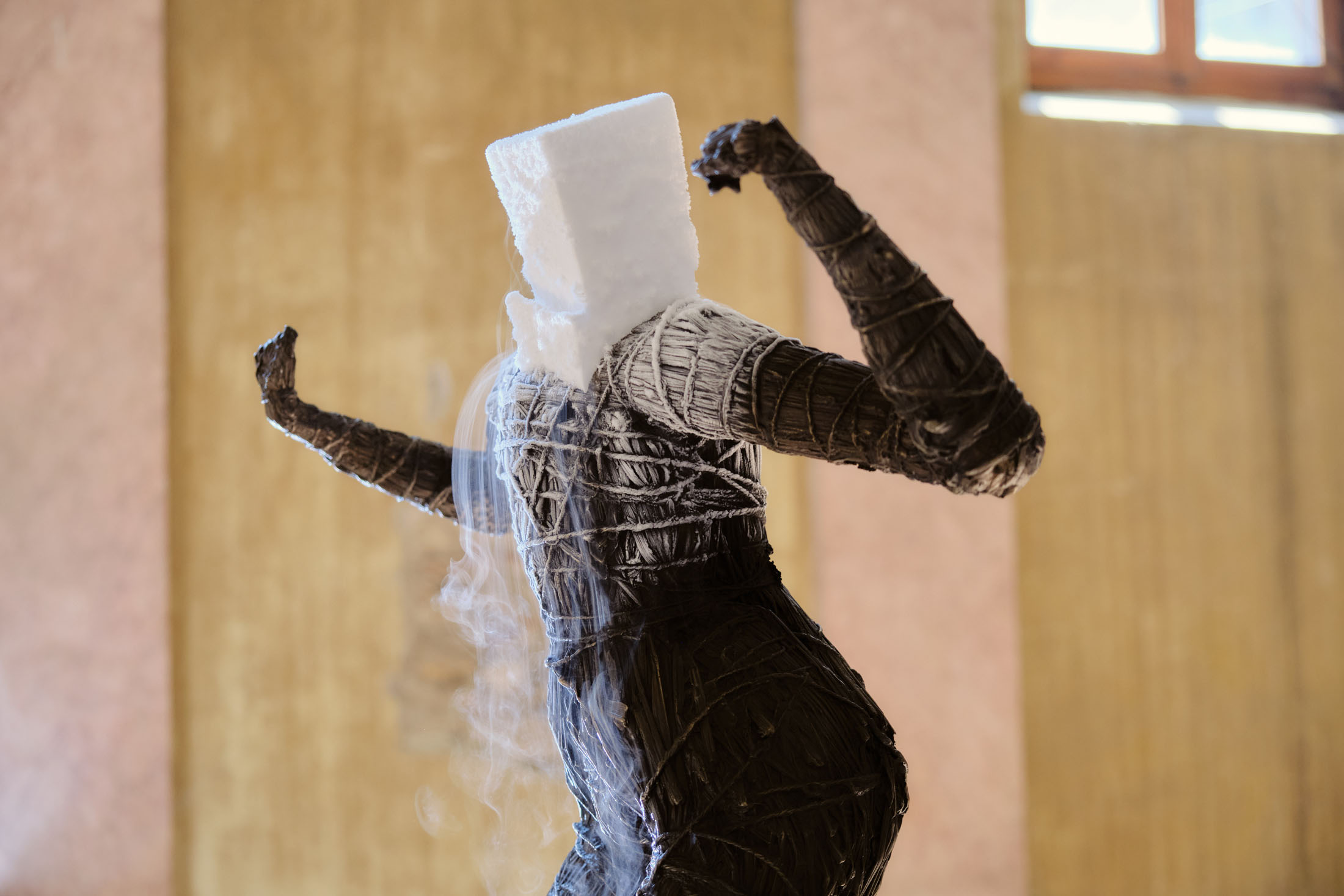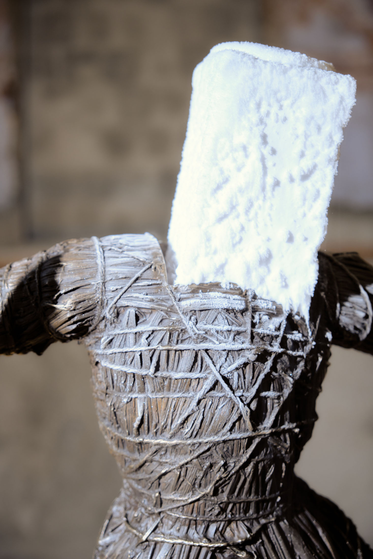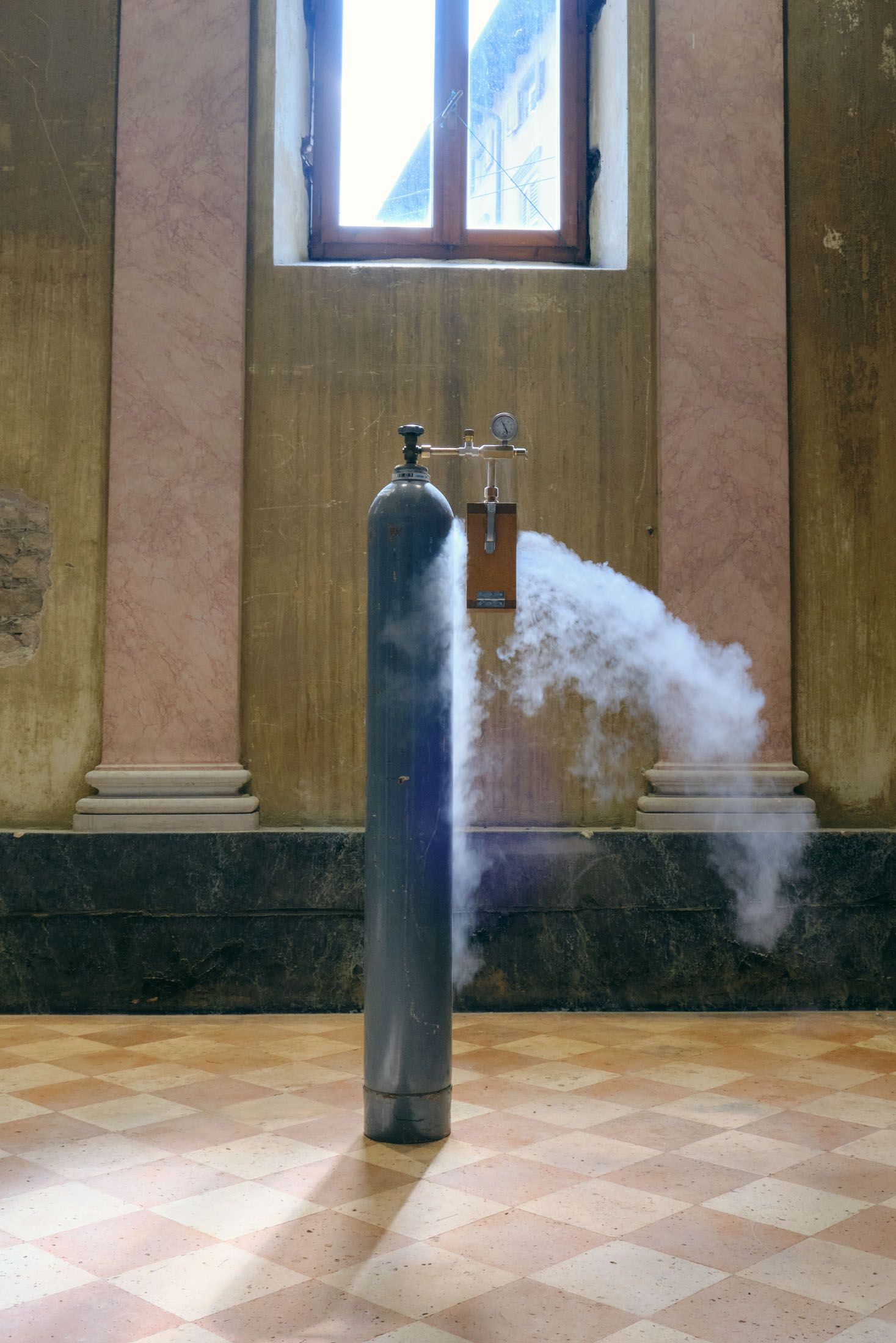 In the framework of the biennial program dedicated to the theme of the removed in contemporary society, the project imagined by Namsal Siedlecki starts from the rituality of India’s most representative Hindu festival, Dur-gā Pūjā. The festival lasts six days: every year, thousands of devotional idols are built and finally immersed in the rivers. The process leading to the creation of a fetish depicting the goddess Durgā, with her characteristic ten arms, always starts with a stuffed soul, which Namsal uses to make the base of a new sculpture, a new idol. In the centre of the nave, this figure stands on a terracotta pedestal. The barely sketched existence of the soul in straw, still without feet, hands and head, is fixed in the permanence of the bronze, a solid, shiny body with the appearance of armour on the one hand Siedlecki subtracts a moment of festive rituality, taking away the fetish, on the other hand he reintroduces new forms of processuality through his own vocabulary. Once a day, the sculpture is reactivated by animating itself through the transformative capacity of matter: recreating the physical mechanism of sublimation, a silhouette of ice sublimates from a solid to a gaseous state, creating a dense condensation around the work.