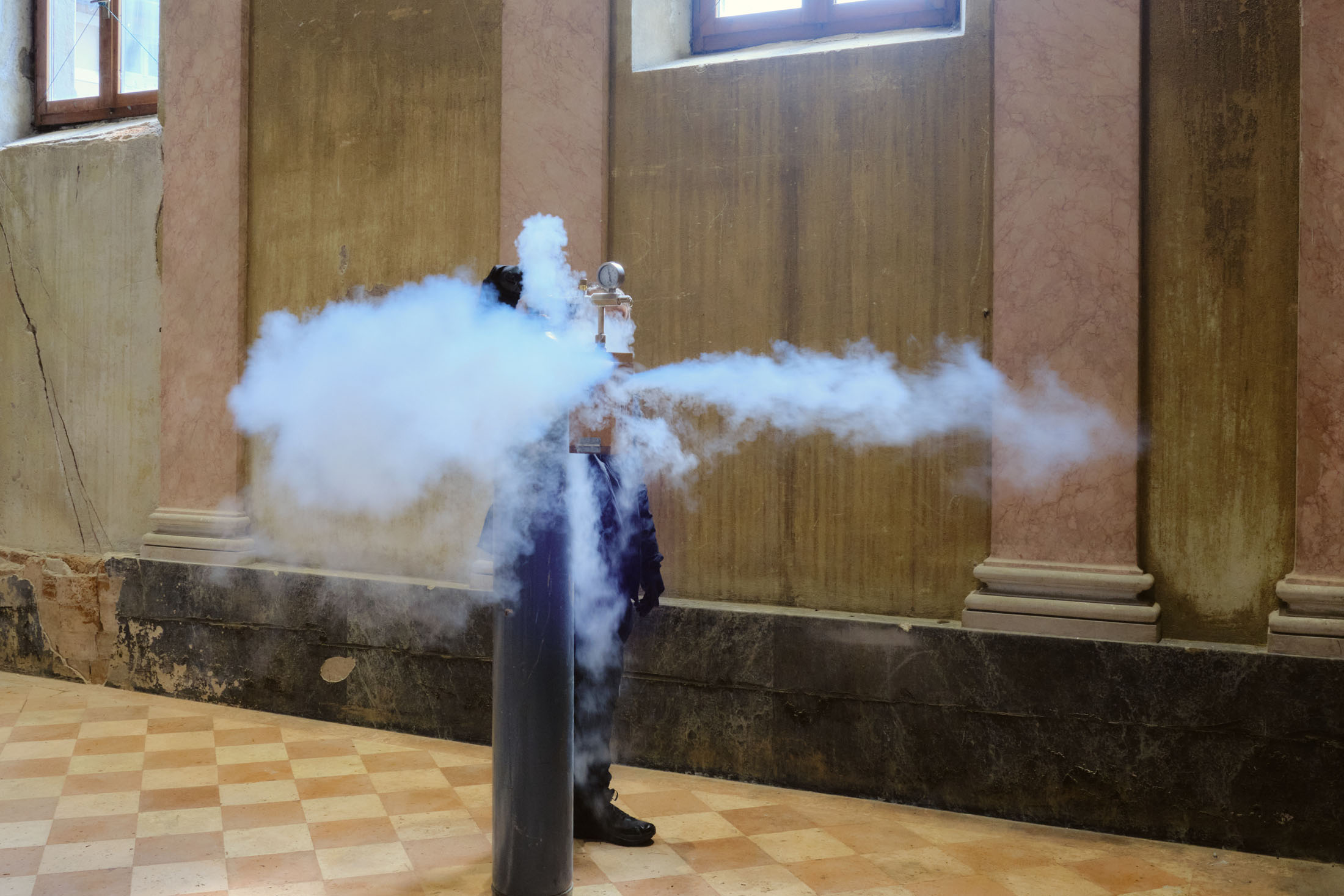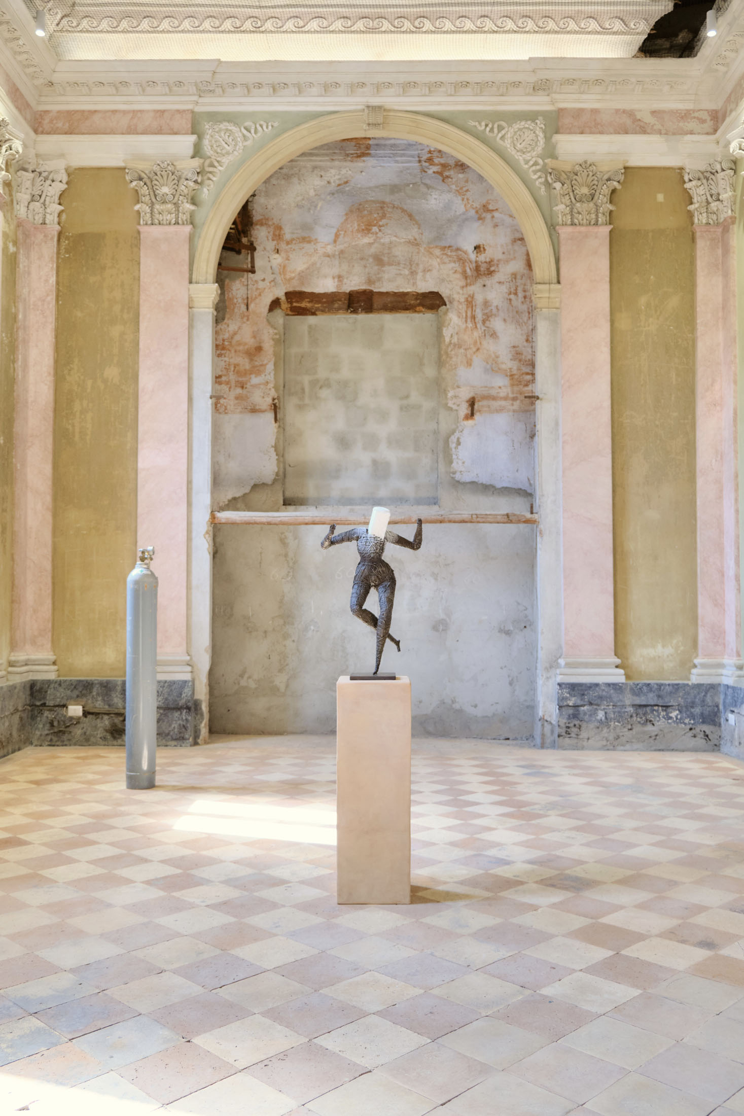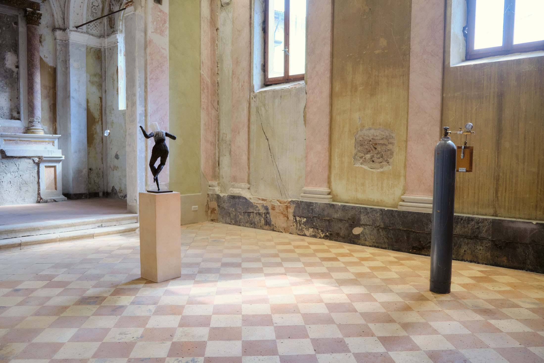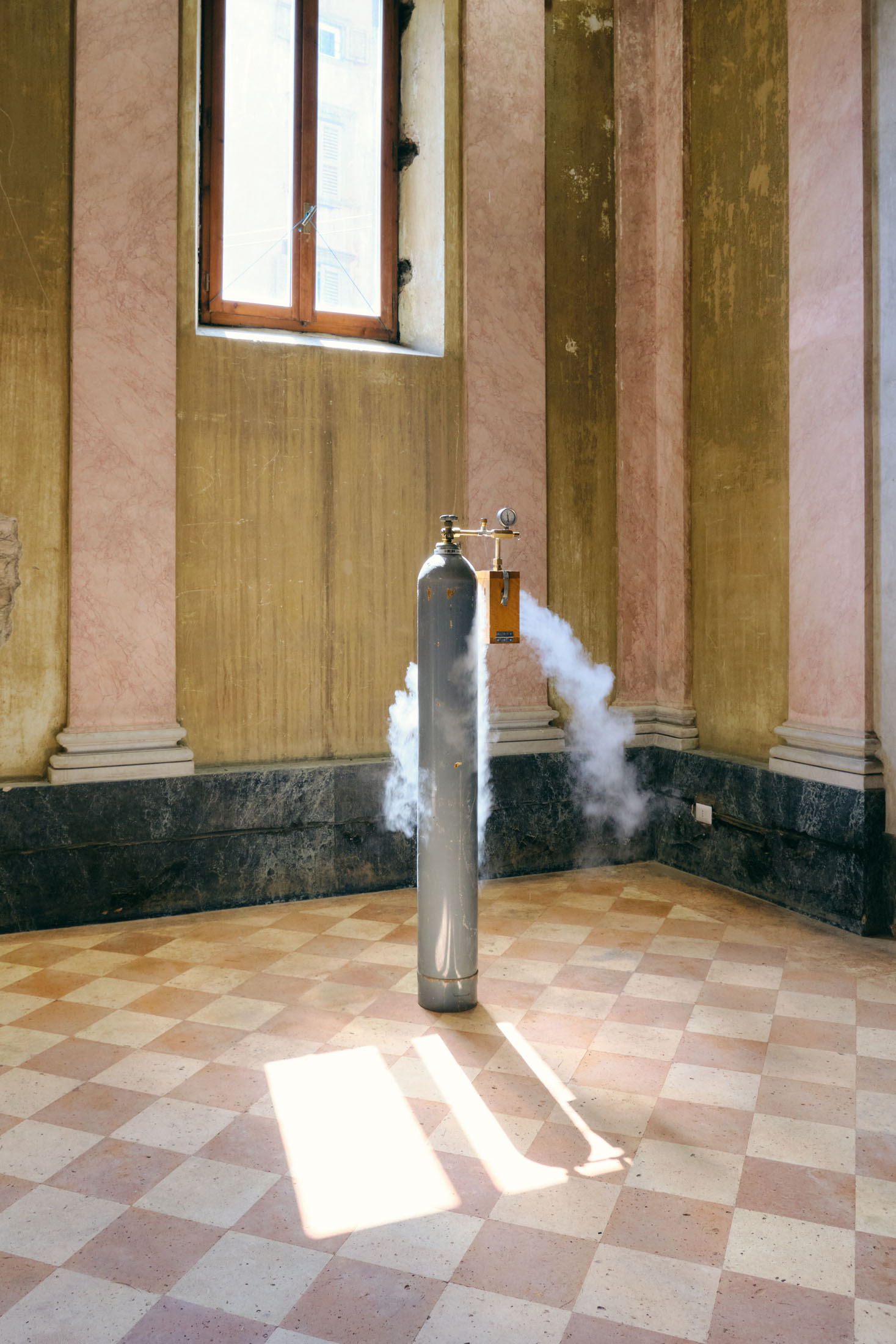 In the framework of the biennial program dedicated to the theme of the removed in contemporary society, the project imagined by Namsal Siedlecki starts from the rituality of India’s most representative Hindu festival, Dur-gā Pūjā. The festival lasts six days: every year, thousands of devotional idols are built and finally immersed in the rivers. The process leading to the creation of a fetish depicting the goddess Durgā, with her characteristic ten arms, always starts with a stuffed soul, which Namsal uses to make the base of a new sculpture, a new idol. In the centre of the nave, this figure stands on a terracotta pedestal. The barely sketched existence of the soul in straw, still without feet, hands and head, is fixed in the permanence of the bronze, a solid, shiny body with the appearance of armour on the one hand Siedlecki subtracts a moment of festive rituality, taking away the fetish, on the other hand he reintroduces new forms of processuality through his own vocabulary. Once a day, the sculpture is reactivated by animating itself through the transformative capacity of matter: recreating the physical mechanism of sublimation, a silhouette of ice sublimates from a solid to a gaseous state, creating a dense condensation around the work.