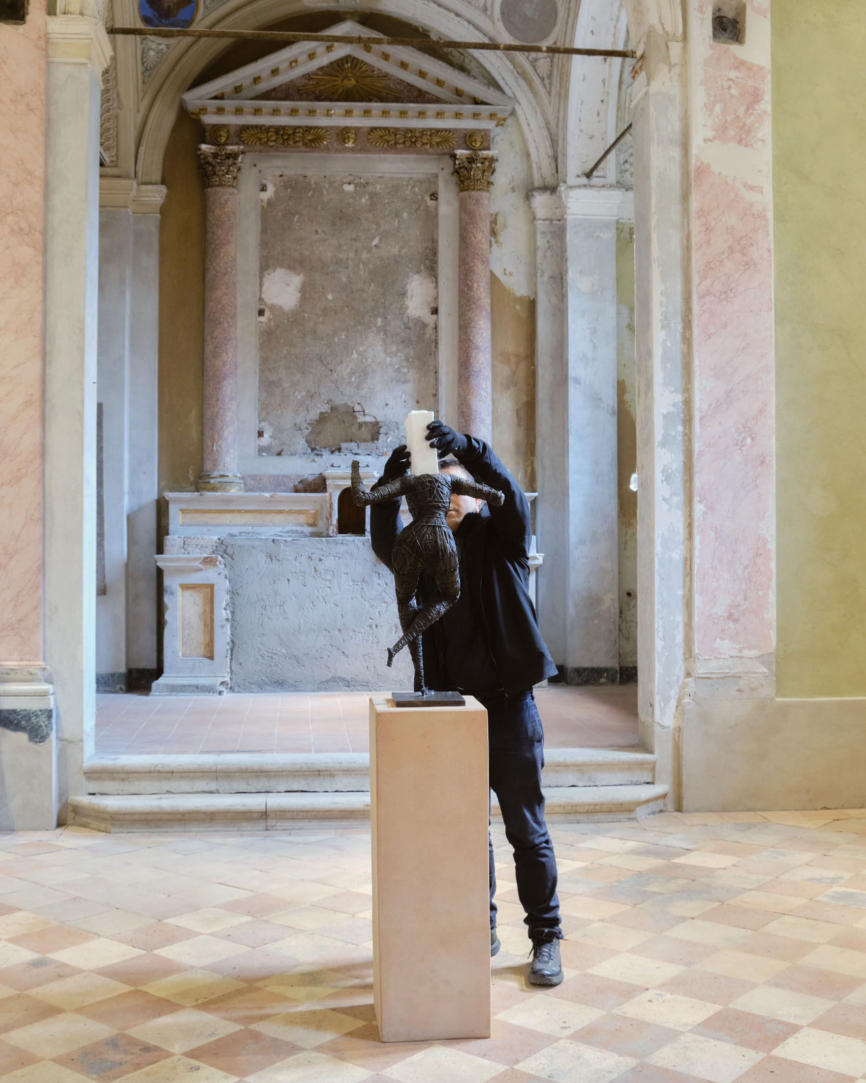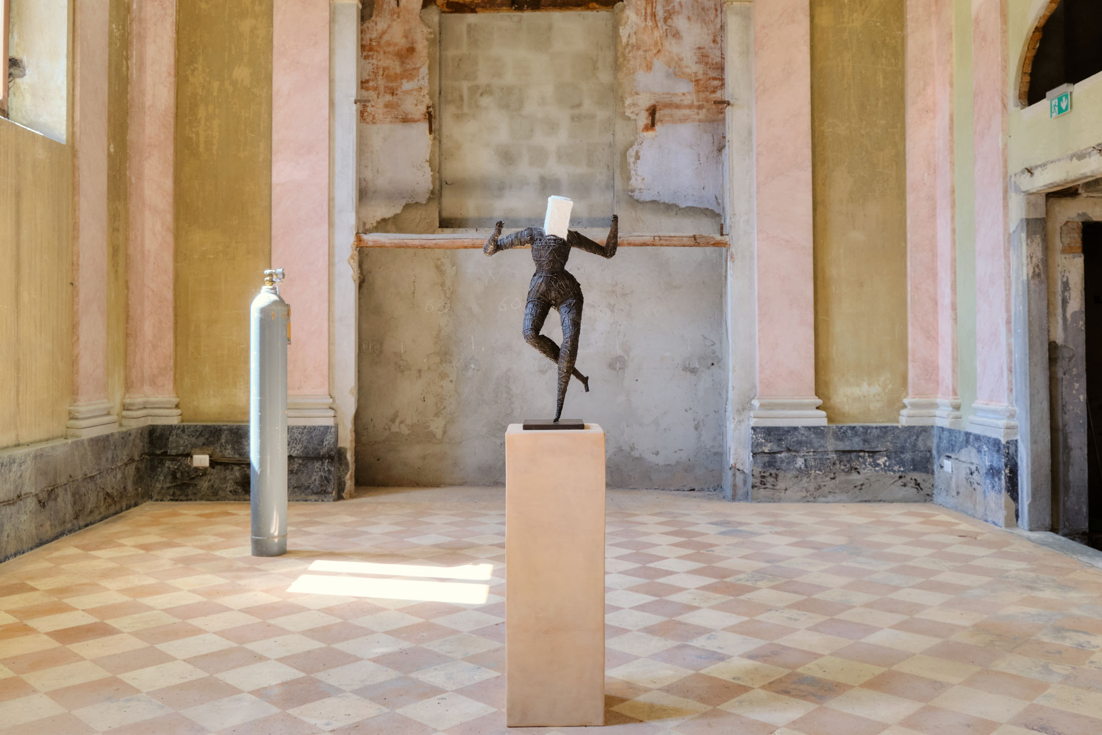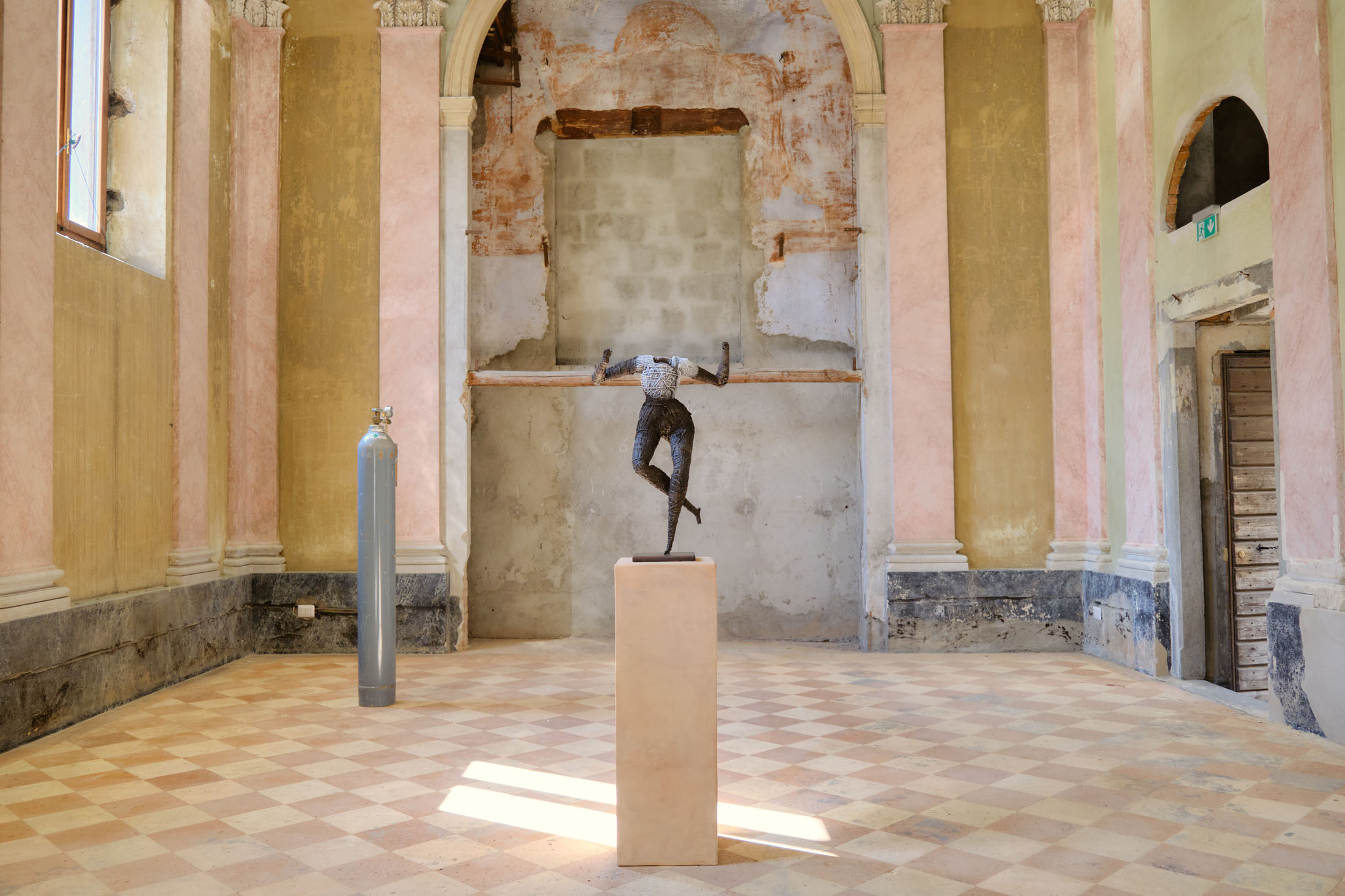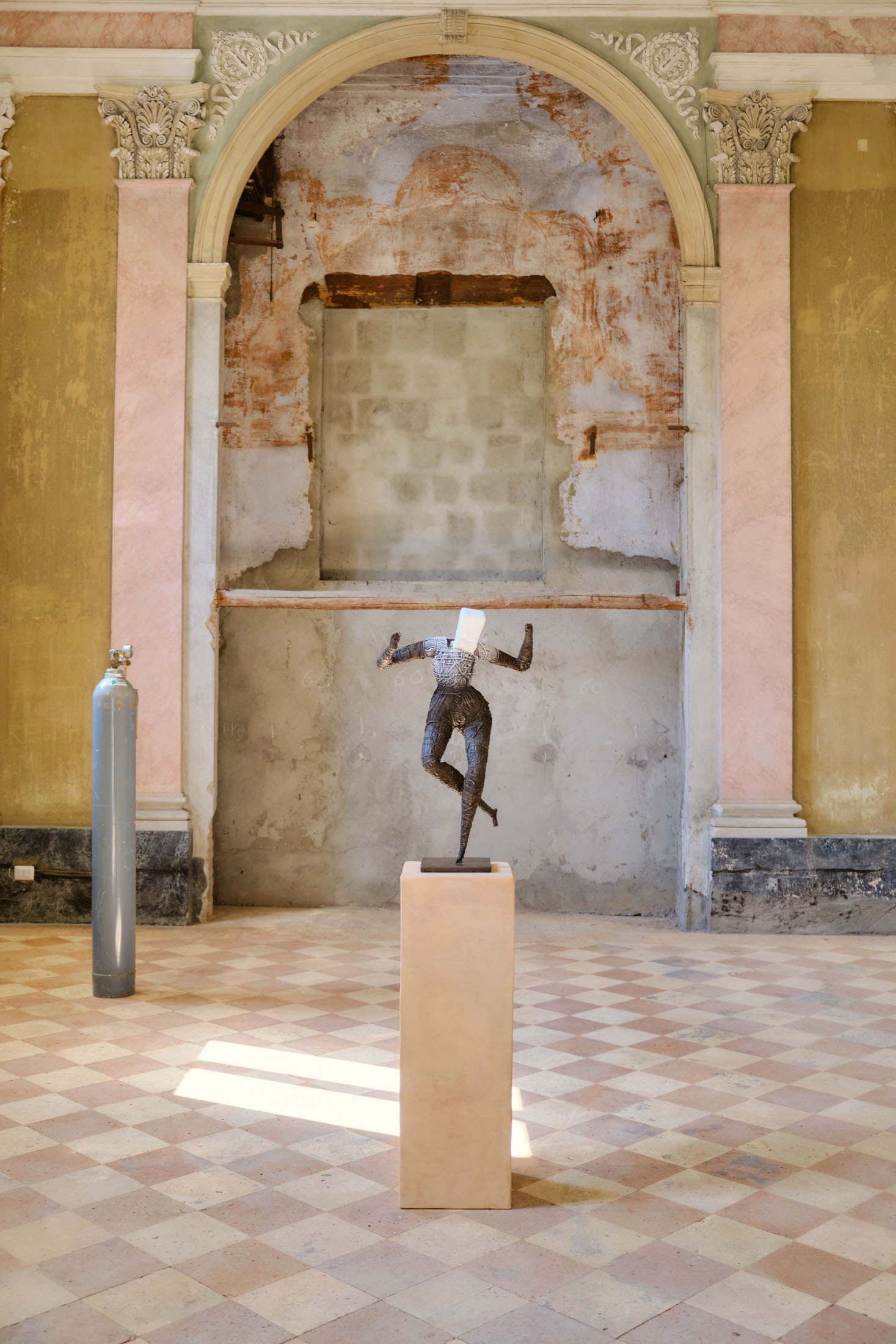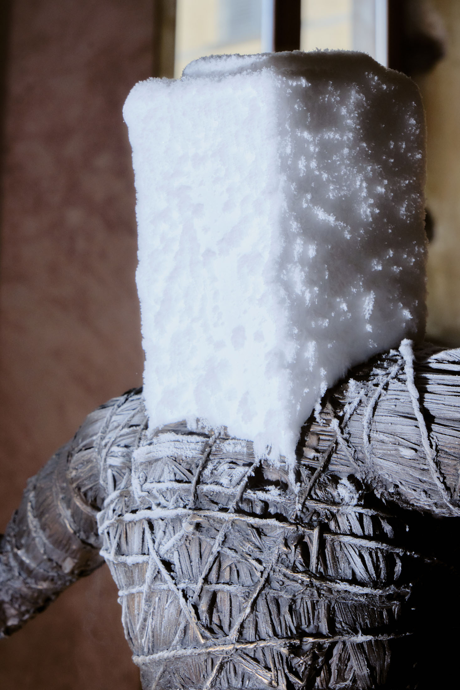 In the framework of the biennial program dedicated to the theme of the removed in contemporary society, the project imagined by Namsal Siedlecki starts from the rituality of India’s most representative Hindu festival, Dur-gā Pūjā. The festival lasts six days: every year, thousands of devotional idols are built and finally immersed in the rivers. The process leading to the creation of a fetish depicting the goddess Durgā, with her characteristic ten arms, always starts with a stuffed soul, which Namsal uses to make the base of a new sculpture, a new idol. In the centre of the nave, this figure stands on a terracotta pedestal. The barely sketched existence of the soul in straw, still without feet, hands and head, is fixed in the permanence of the bronze, a solid, shiny body with the appearance of armour on the one hand Siedlecki subtracts a moment of festive rituality, taking away the fetish, on the other hand he reintroduces new forms of processuality through his own vocabulary. Once a day, the sculpture is reactivated by animating itself through the transformative capacity of matter: recreating the physical mechanism of sublimation, a silhouette of ice sublimates from a solid to a gaseous state, creating a dense condensation around the work.