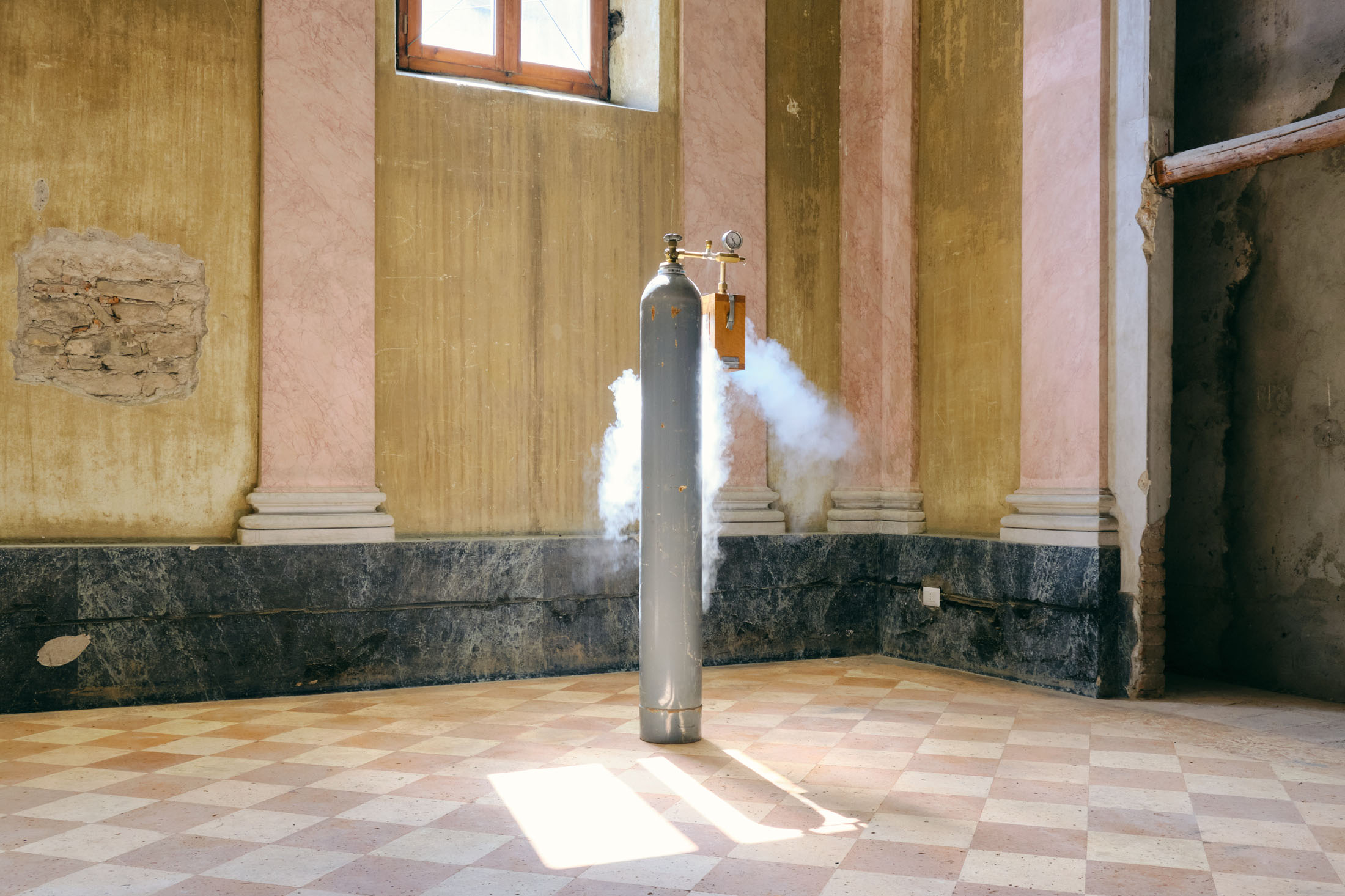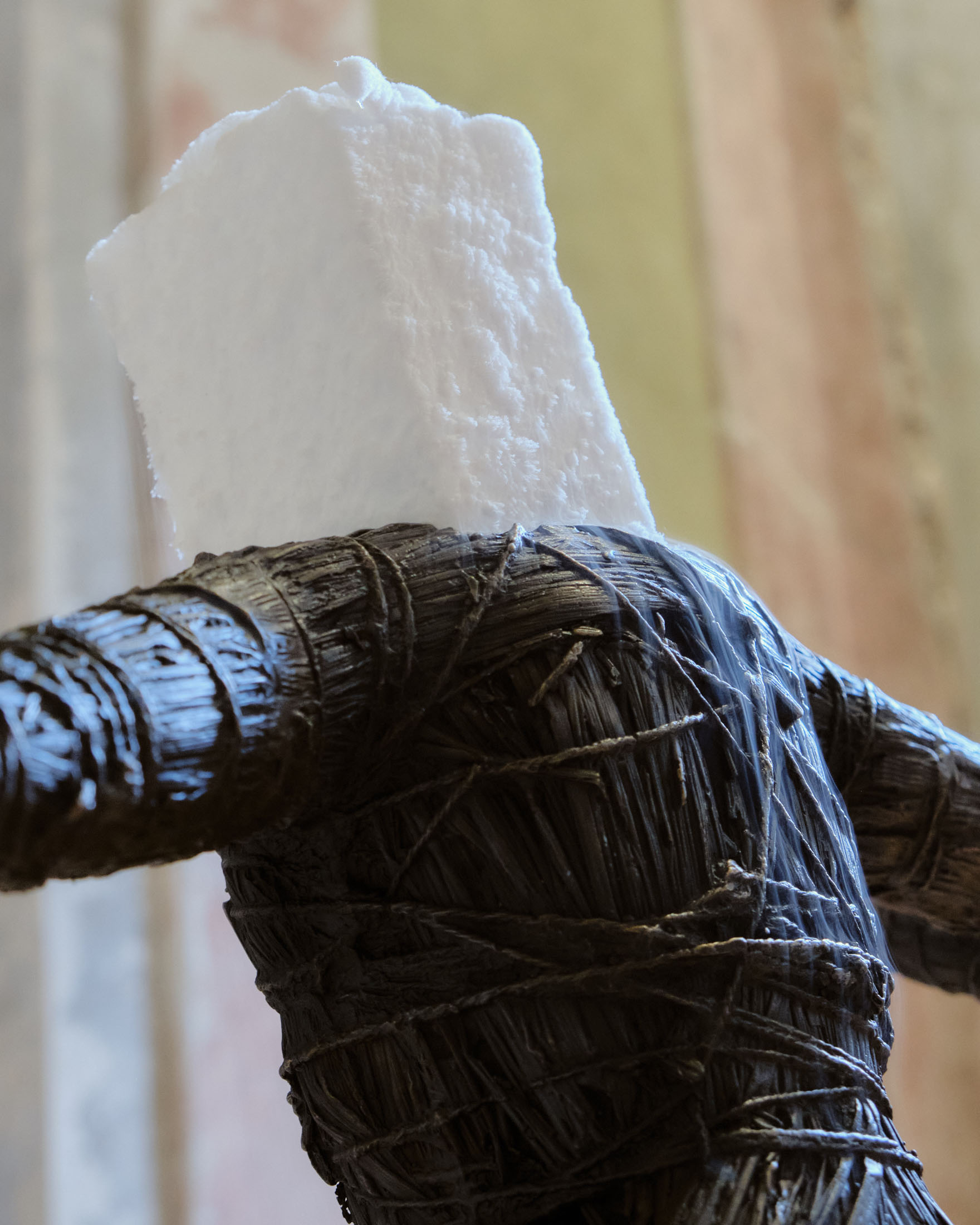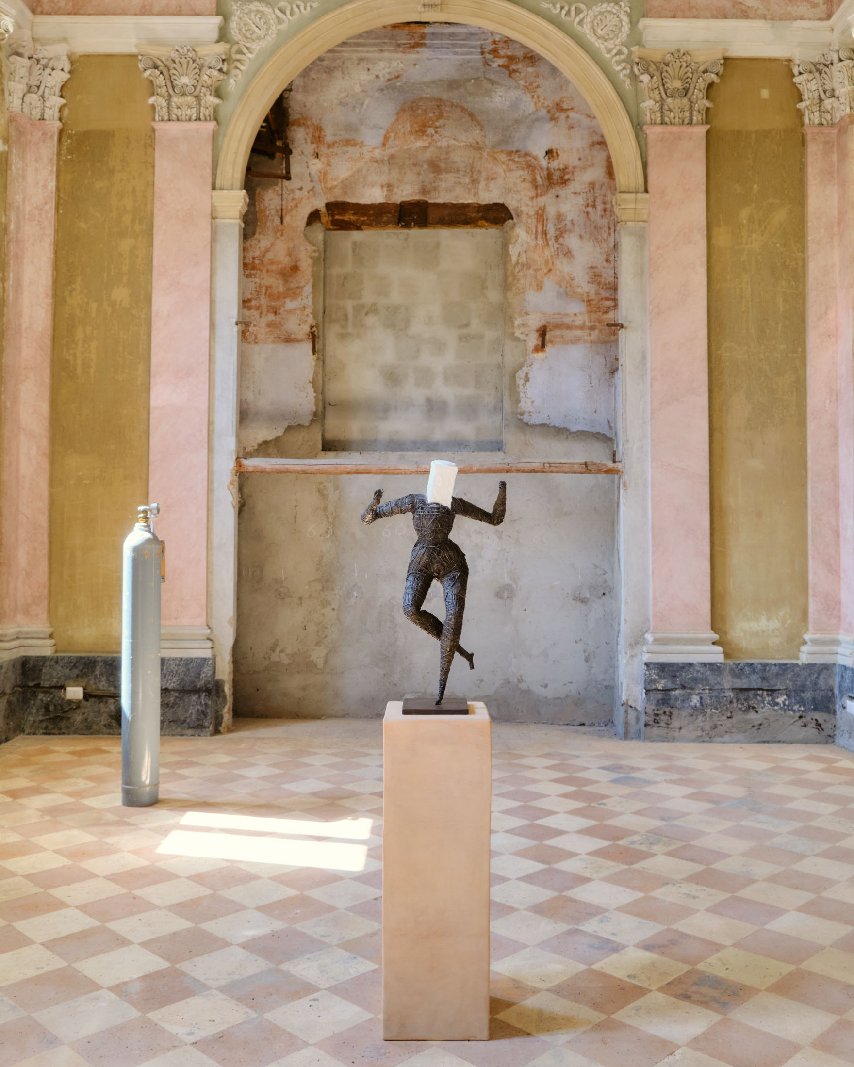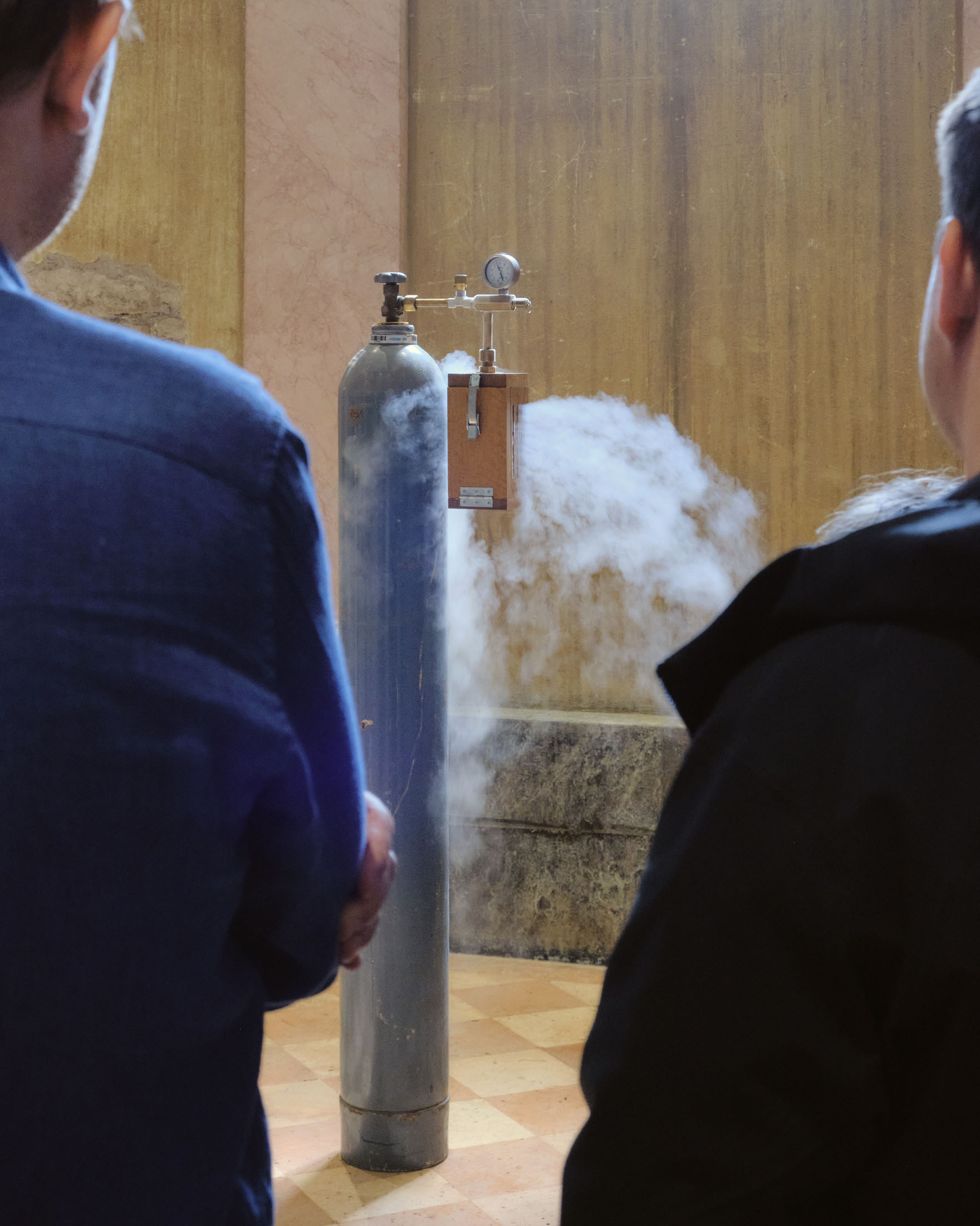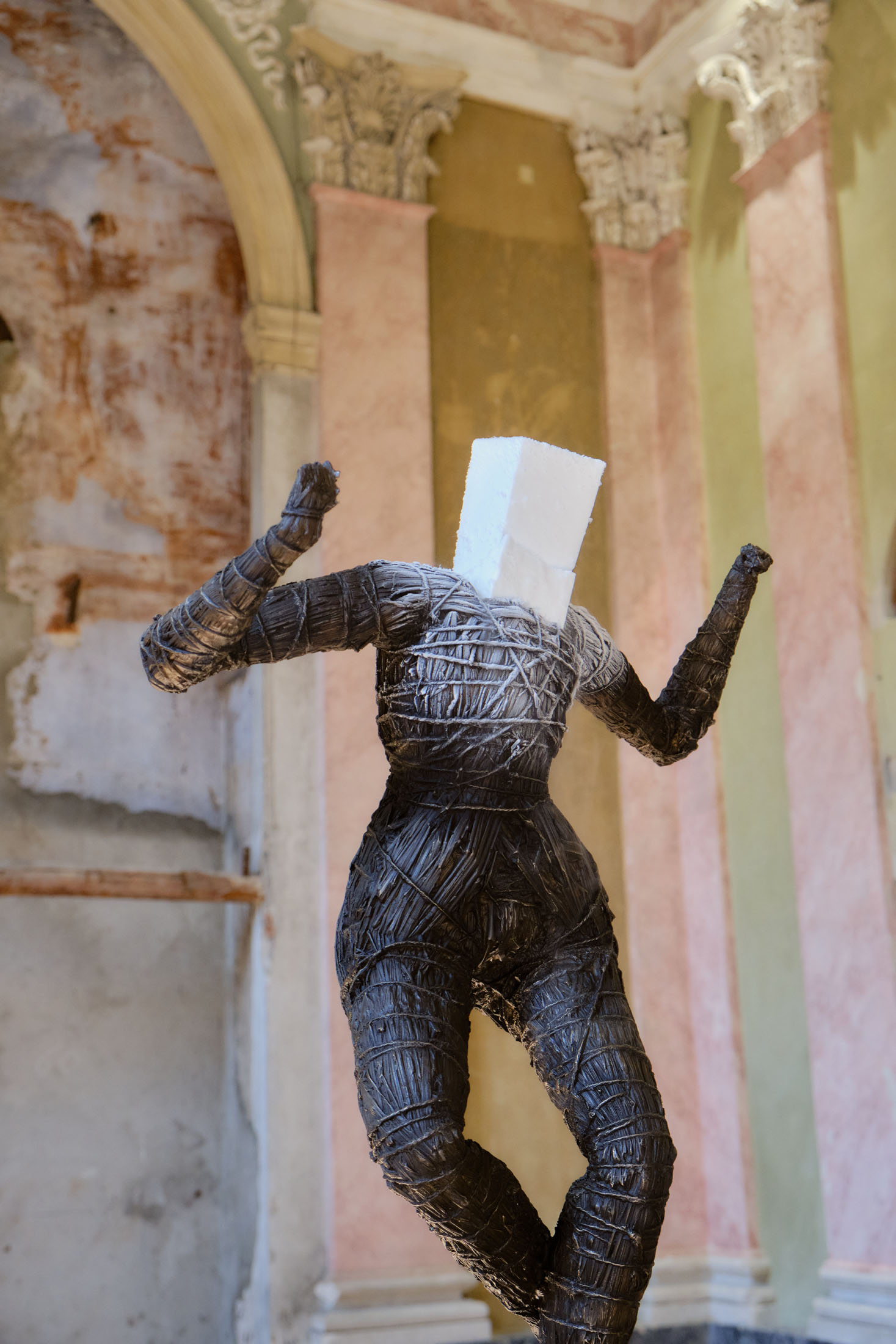 In the framework of the biennial program dedicated to the theme of the removed in contemporary society, the project imagined by Namsal Siedlecki starts from the rituality of India’s most representative Hindu festival, Dur-gā Pūjā. The festival lasts six days: every year, thousands of devotional idols are built and finally immersed in the rivers. The process leading to the creation of a fetish depicting the goddess Durgā, with her characteristic ten arms, always starts with a stuffed soul, which Namsal uses to make the base of a new sculpture, a new idol. In the centre of the nave, this figure stands on a terracotta pedestal. The barely sketched existence of the soul in straw, still without feet, hands and head, is fixed in the permanence of the bronze, a solid, shiny body with the appearance of armour on the one hand Siedlecki subtracts a moment of festive rituality, taking away the fetish, on the other hand he reintroduces new forms of processuality through his own vocabulary. Once a day, the sculpture is reactivated by animating itself through the transformative capacity of matter: recreating the physical mechanism of sublimation, a silhouette of ice sublimates from a solid to a gaseous state, creating a dense condensation around the work.