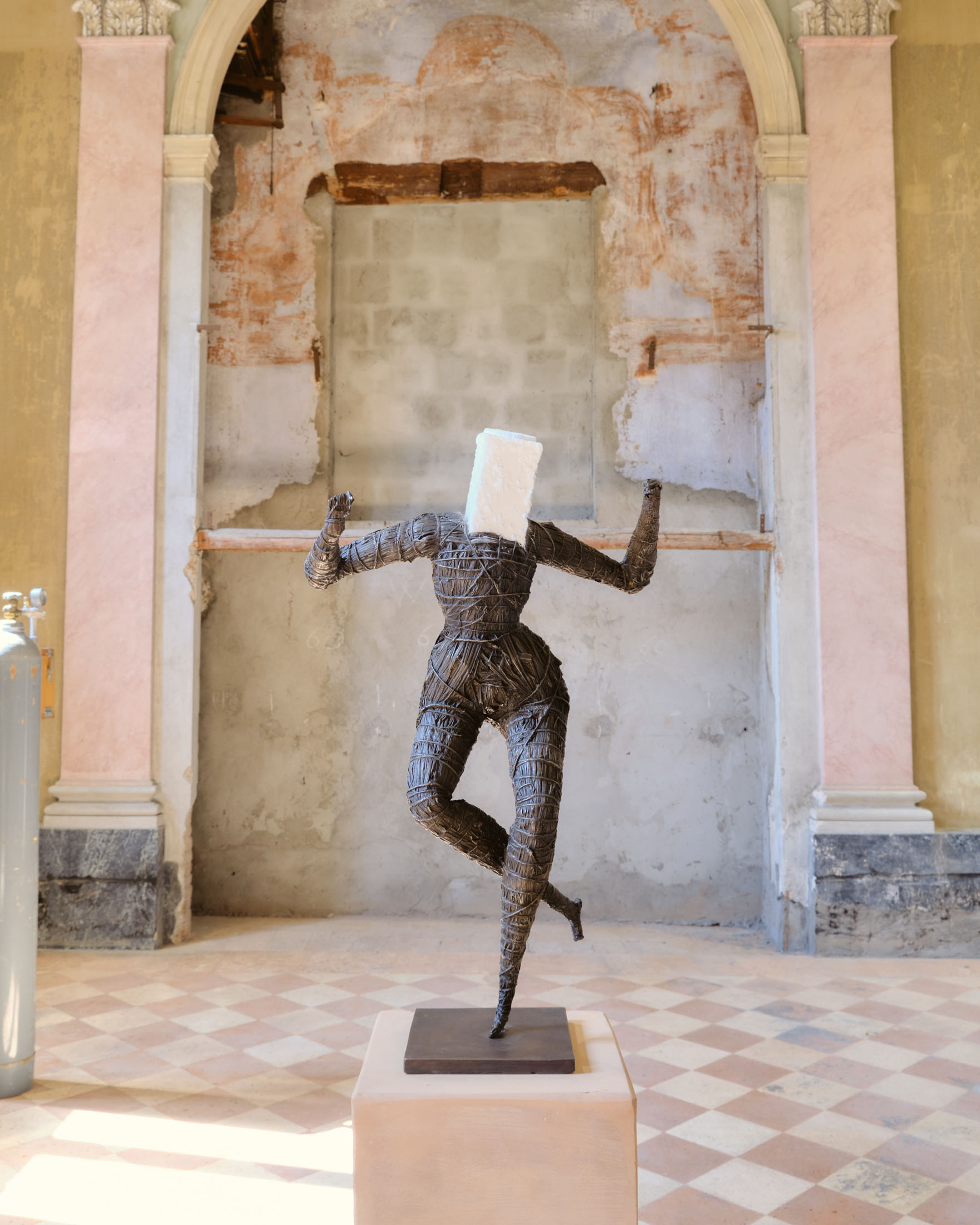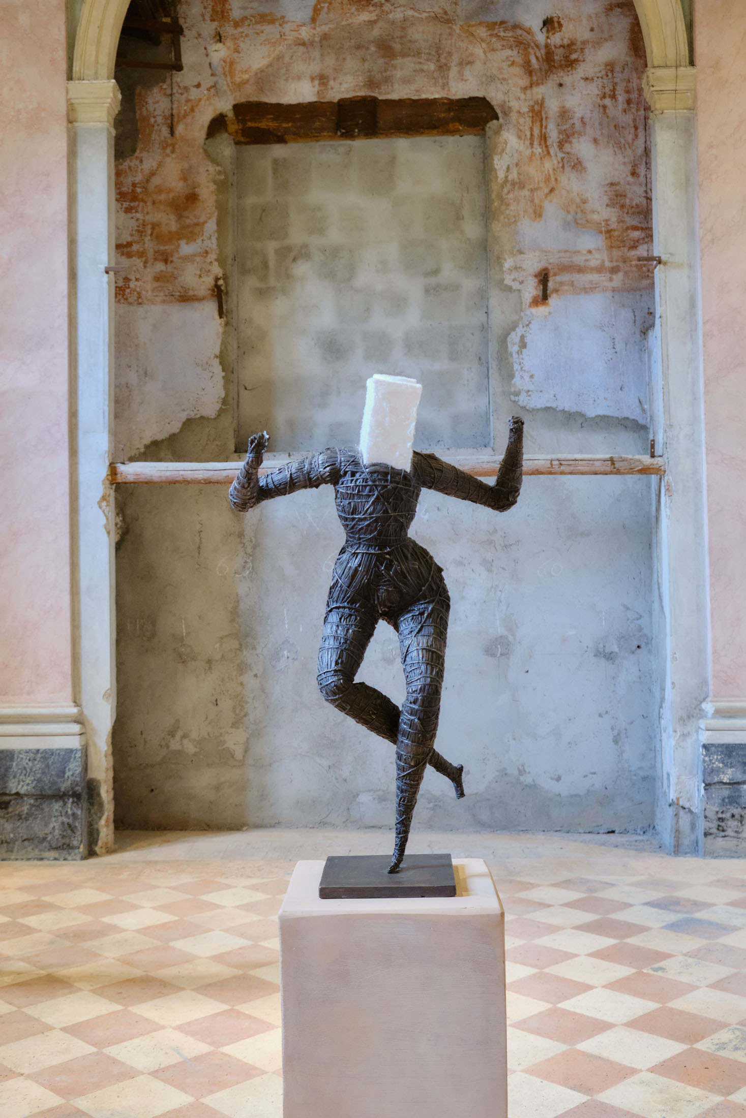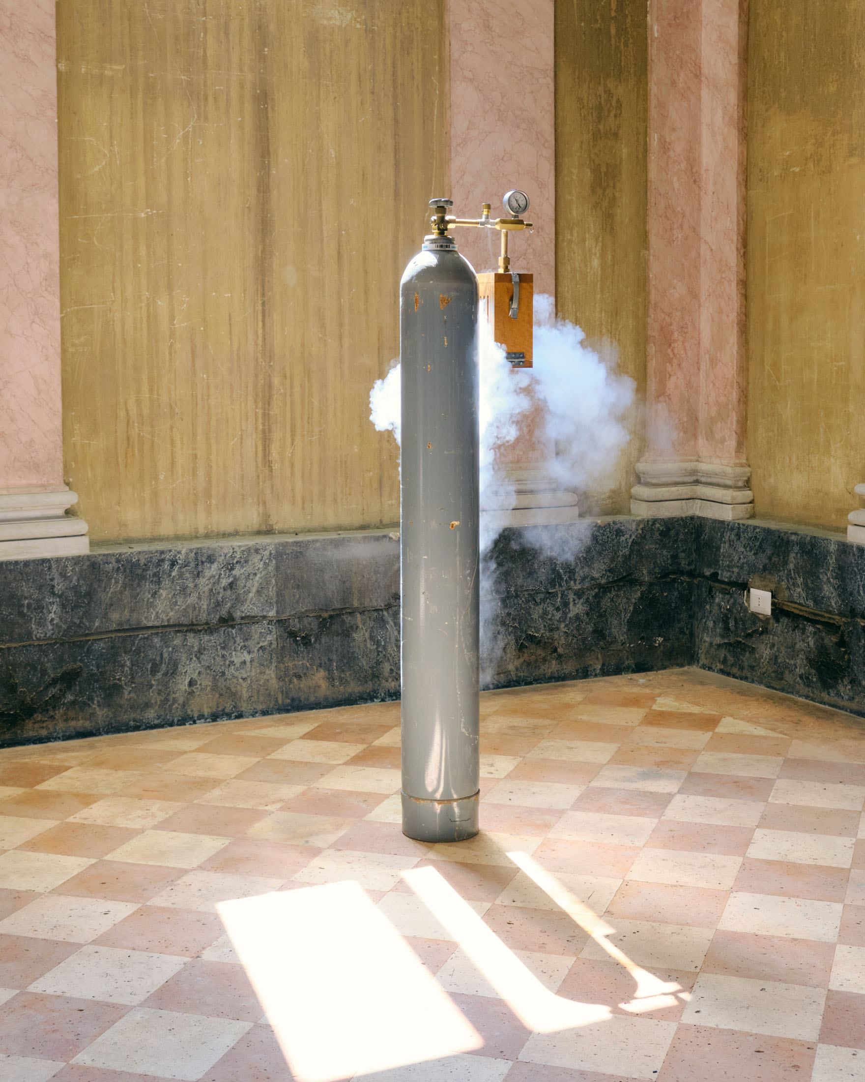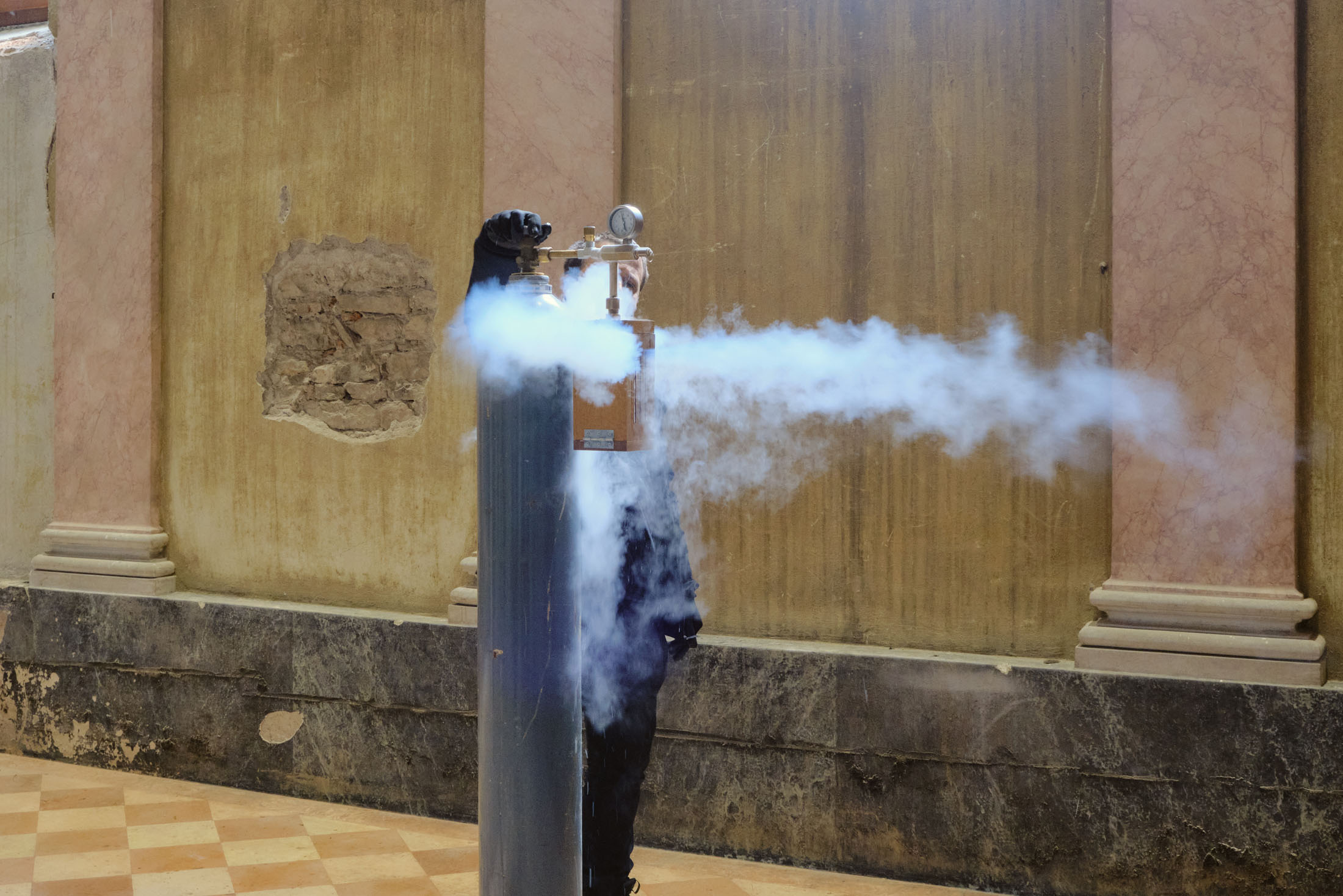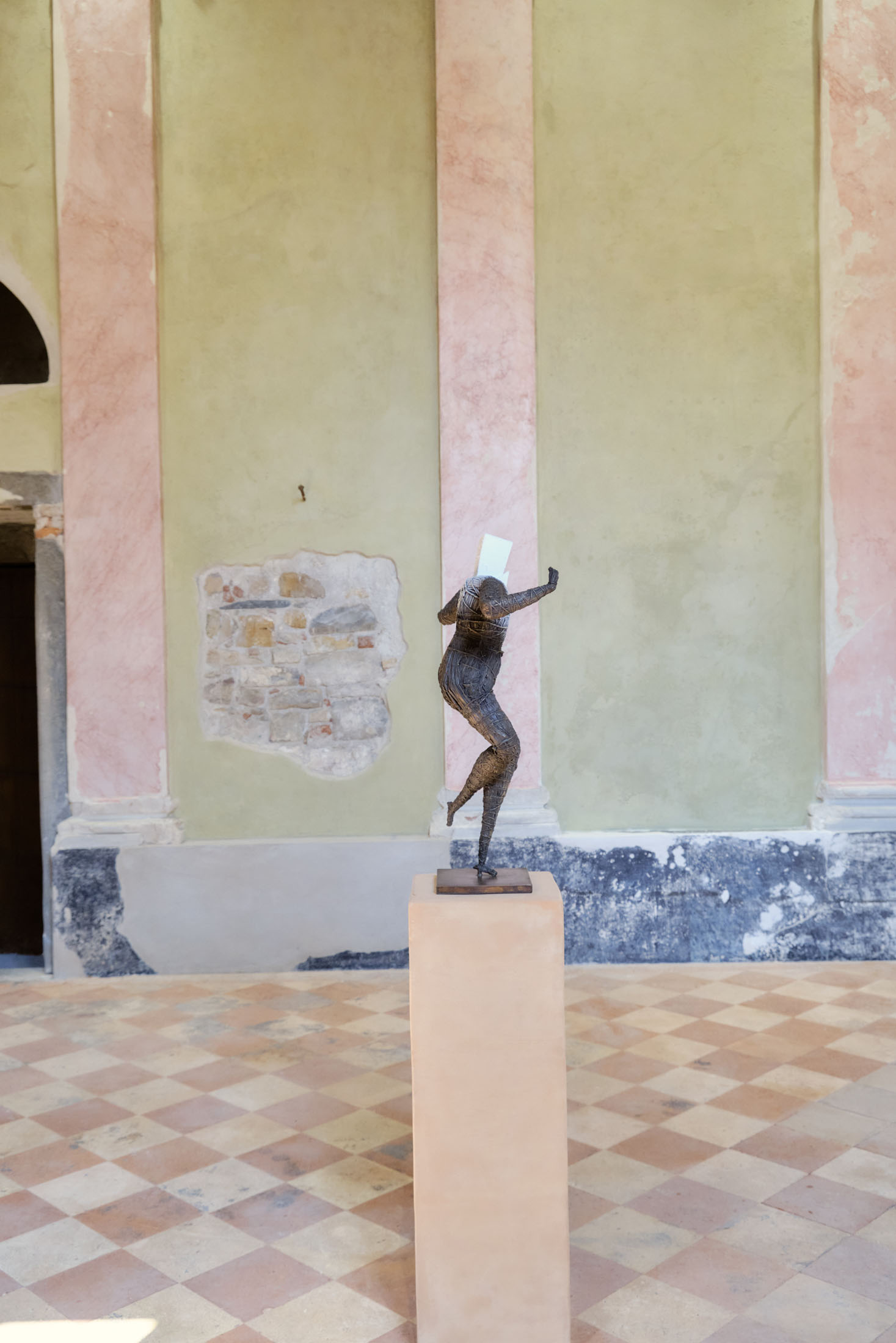 In the framework of the biennial program dedicated to the theme of the removed in contemporary society, the project imagined by Namsal Siedlecki starts from the rituality of India’s most representative Hindu festival, Dur-gā Pūjā. The festival lasts six days: every year, thousands of devotional idols are built and finally immersed in the rivers. The process leading to the creation of a fetish depicting the goddess Durgā, with her characteristic ten arms, always starts with a stuffed soul, which Namsal uses to make the base of a new sculpture, a new idol. In the centre of the nave, this figure stands on a terracotta pedestal. The barely sketched existence of the soul in straw, still without feet, hands and head, is fixed in the permanence of the bronze, a solid, shiny body with the appearance of armour on the one hand Siedlecki subtracts a moment of festive rituality, taking away the fetish, on the other hand he reintroduces new forms of processuality through his own vocabulary. Once a day, the sculpture is reactivated by animating itself through the transformative capacity of matter: recreating the physical mechanism of sublimation, a silhouette of ice sublimates from a solid to a gaseous state, creating a dense condensation around the work.