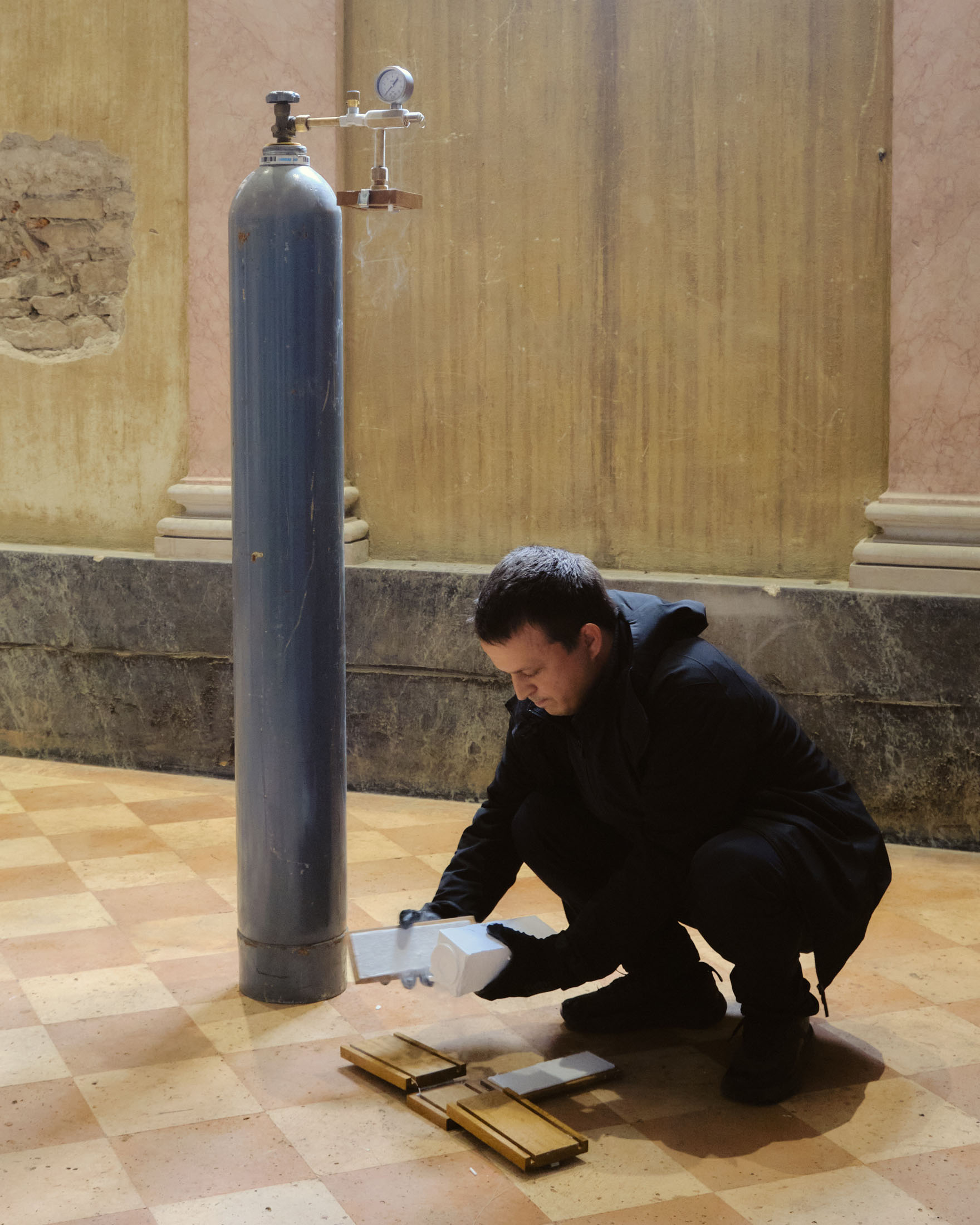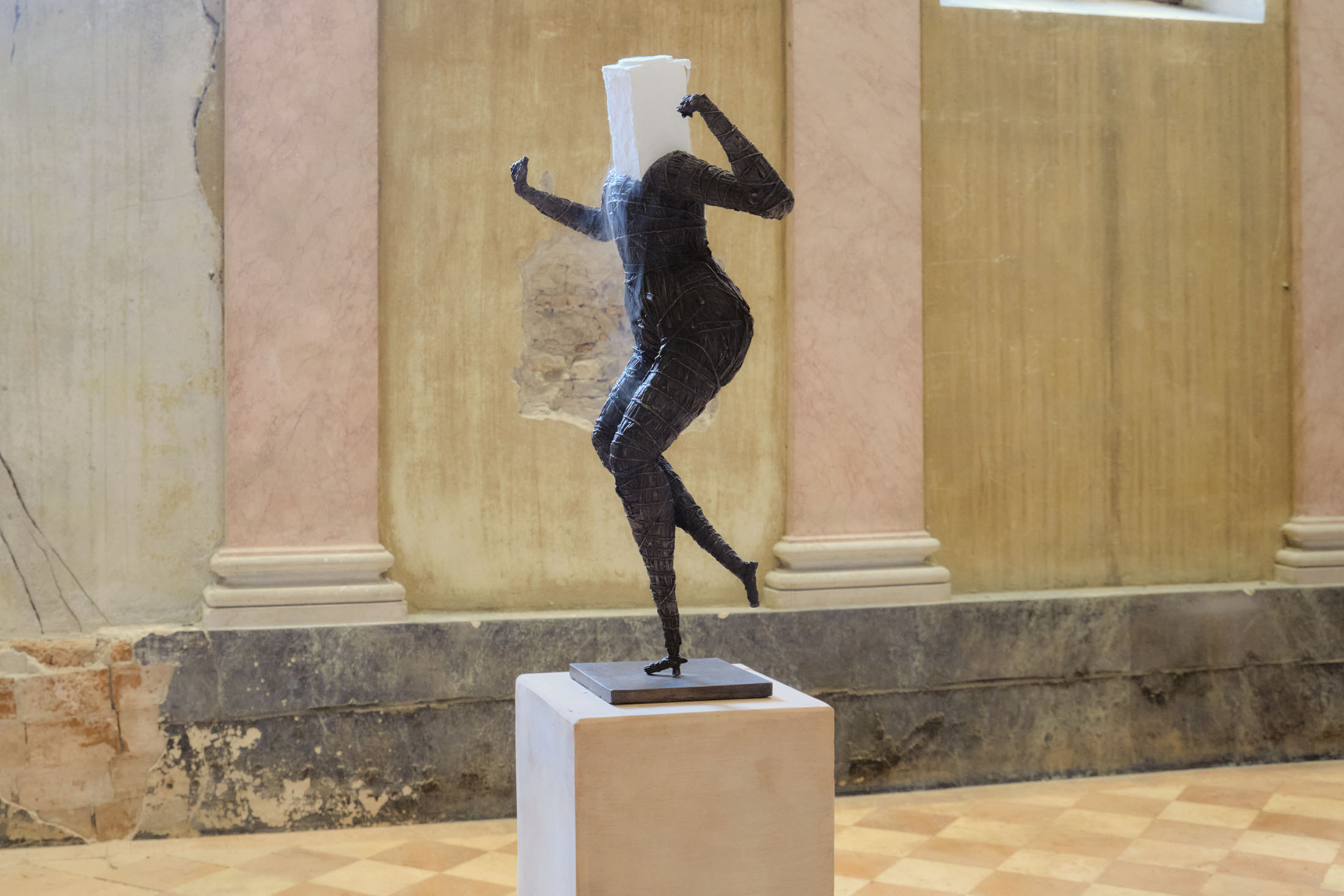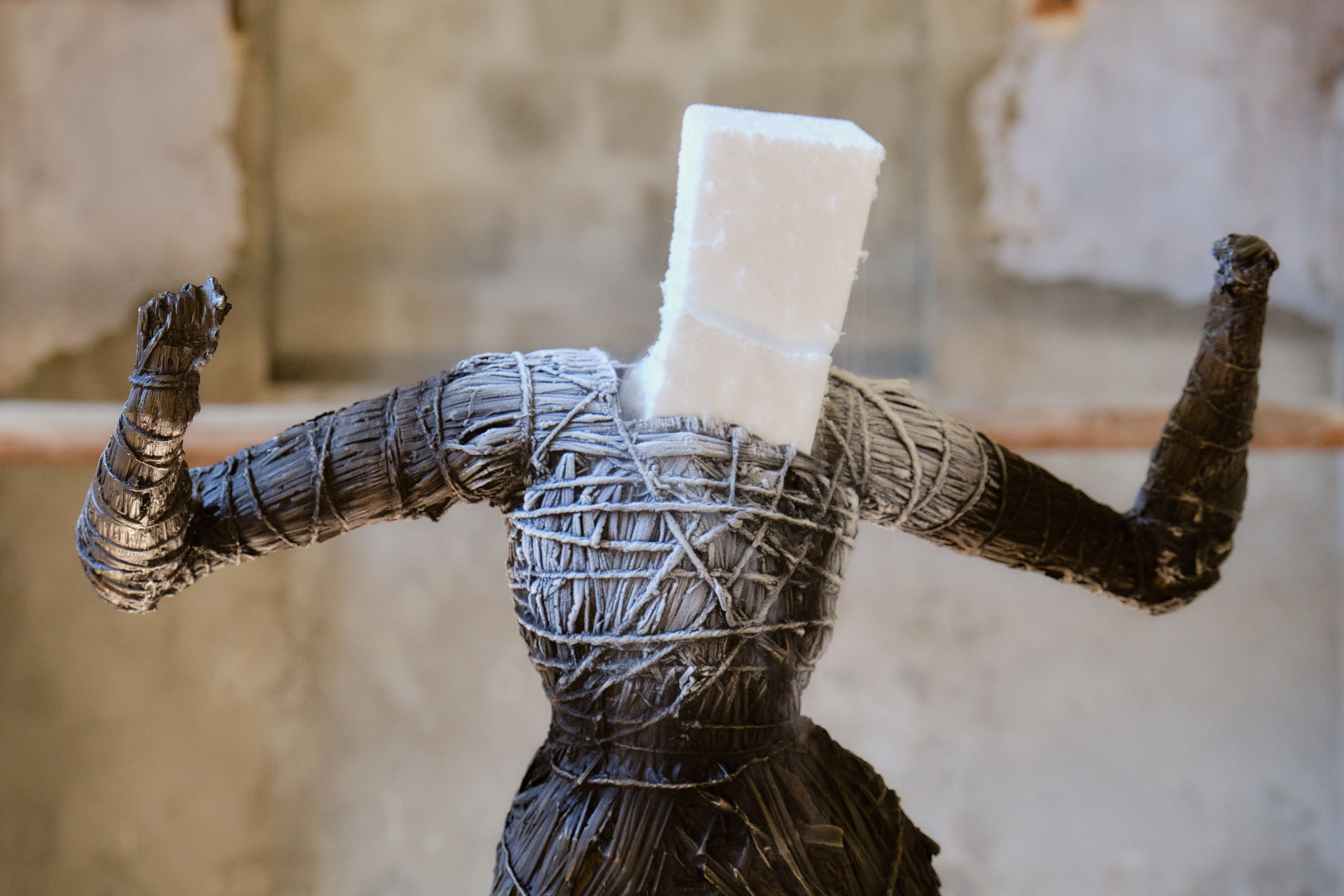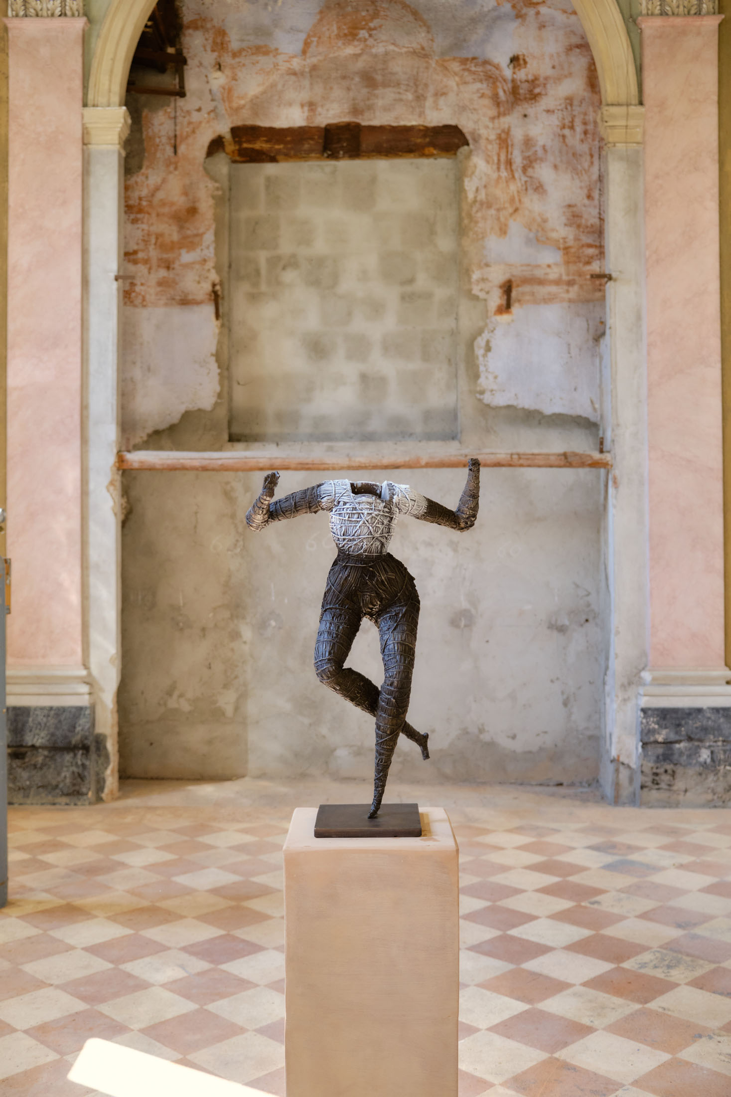 In the framework of the biennial program dedicated to the theme of the removed in contemporary society, the project imagined by Namsal Siedlecki starts from the rituality of India’s most representative Hindu festival, Dur-gā Pūjā. The festival lasts six days: every year, thousands of devotional idols are built and finally immersed in the rivers. The process leading to the creation of a fetish depicting the goddess Durgā, with her characteristic ten arms, always starts with a stuffed soul, which Namsal uses to make the base of a new sculpture, a new idol. In the centre of the nave, this figure stands on a terracotta pedestal. The barely sketched existence of the soul in straw, still without feet, hands and head, is fixed in the permanence of the bronze, a solid, shiny body with the appearance of armour on the one hand Siedlecki subtracts a moment of festive rituality, taking away the fetish, on the other hand he reintroduces new forms of processuality through his own vocabulary. Once a day, the sculpture is reactivated by animating itself through the transformative capacity of matter: recreating the physical mechanism of sublimation, a silhouette of ice sublimates from a solid to a gaseous state, creating a dense condensation around the work.