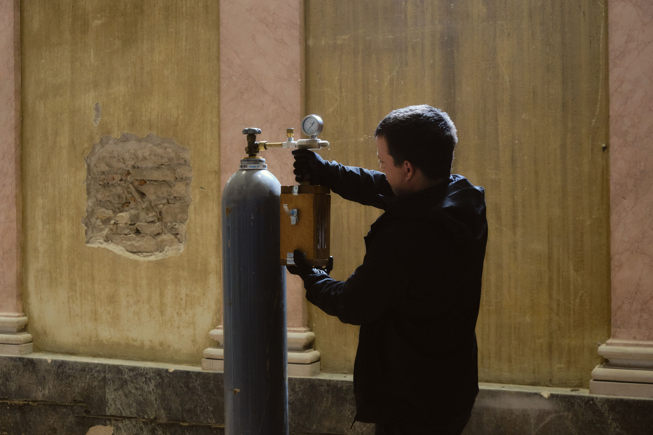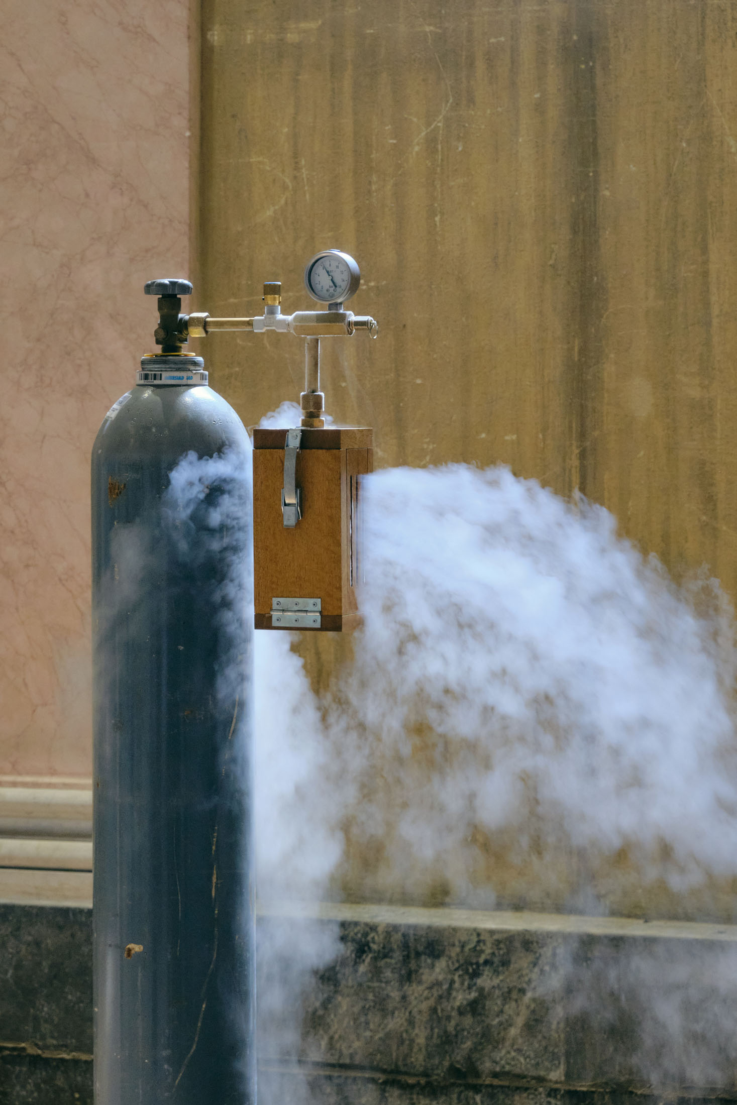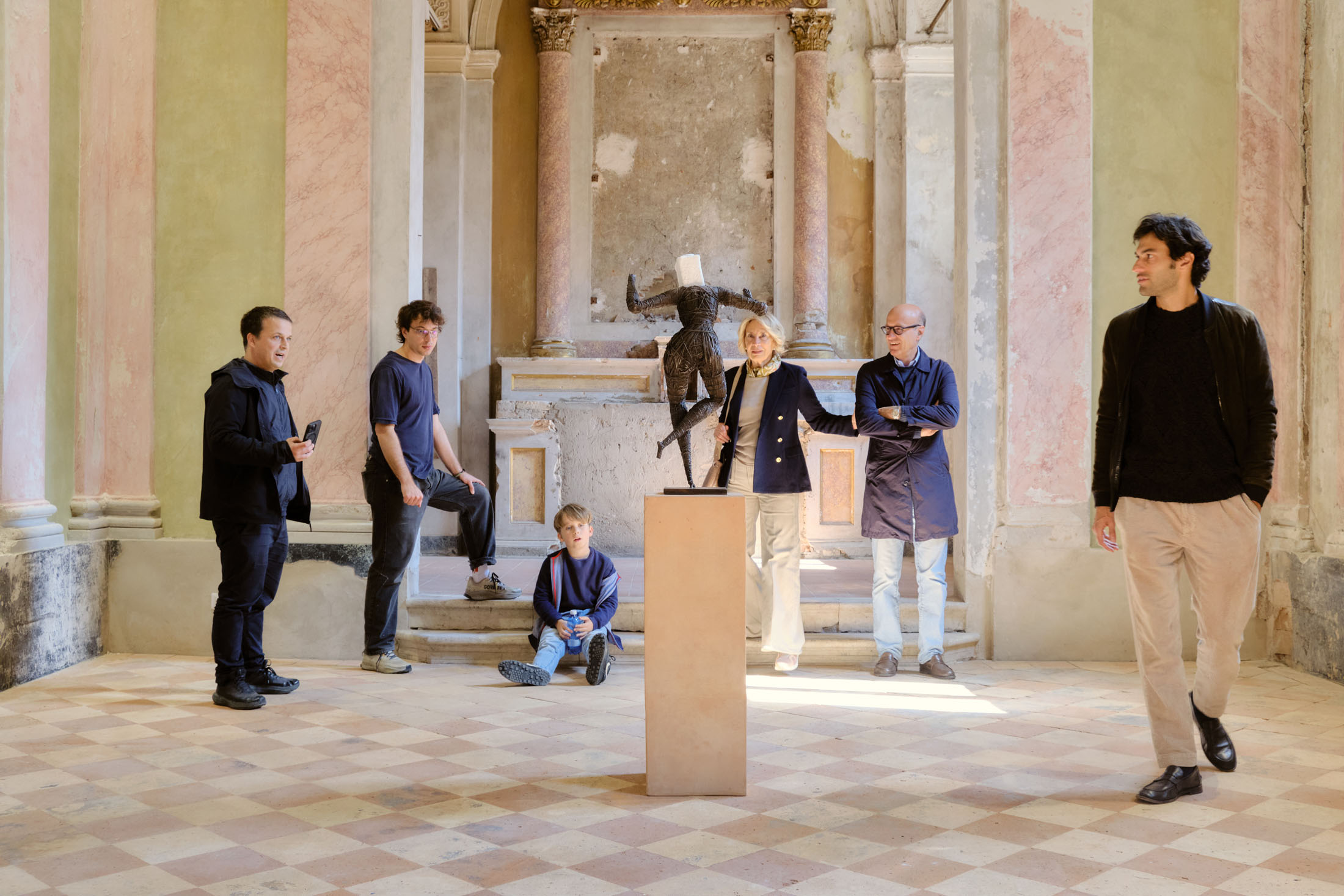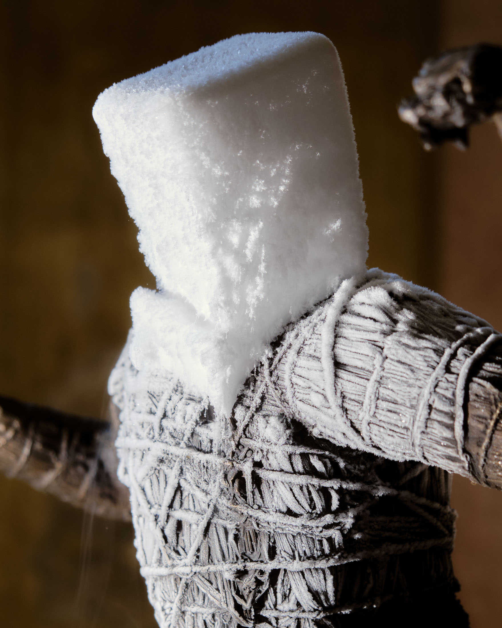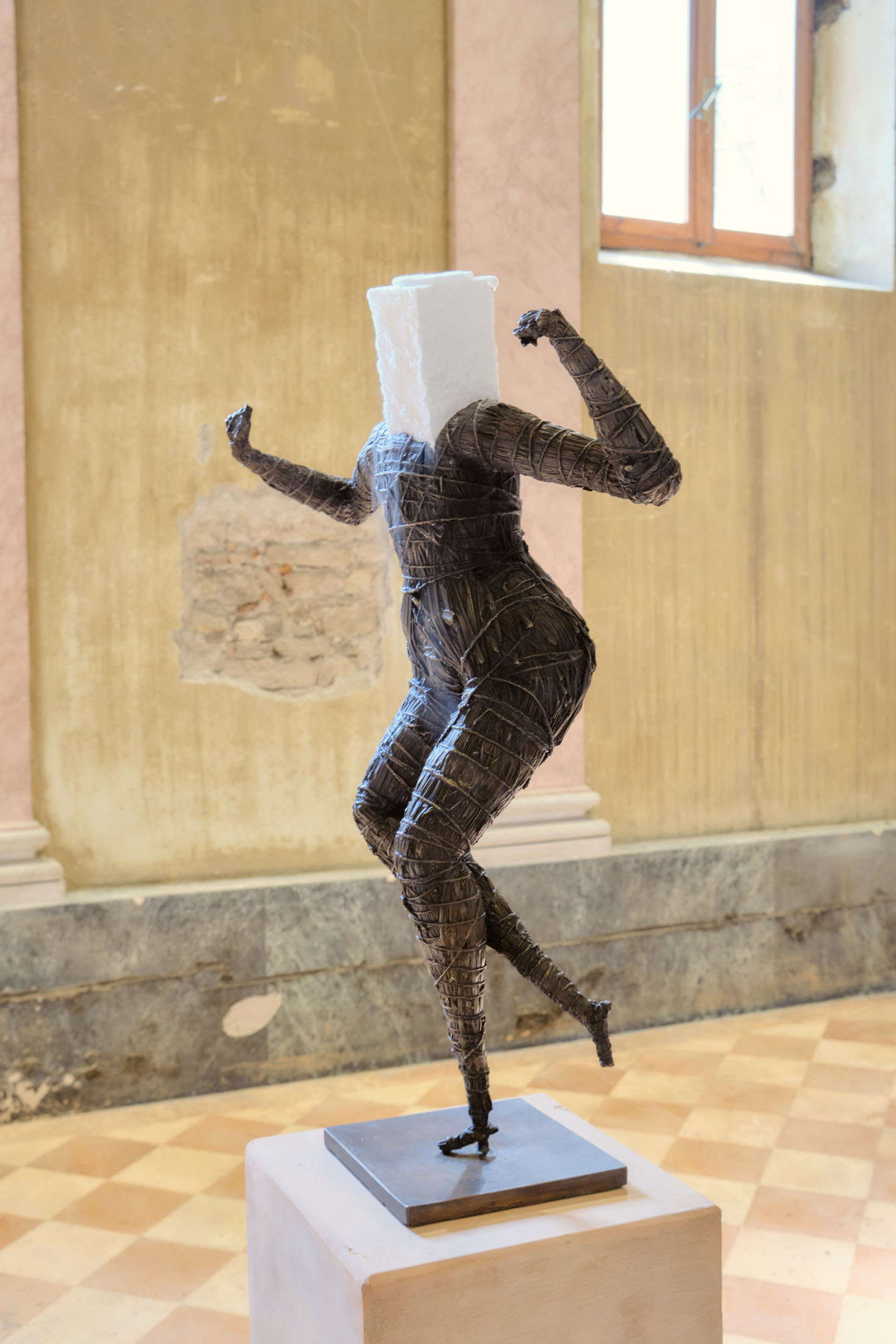 In the framework of the biennial program dedicated to the theme of the removed in contemporary society, the project imagined by Namsal Siedlecki starts from the rituality of India’s most representative Hindu festival, Dur-gā Pūjā. The festival lasts six days: every year, thousands of devotional idols are built and finally immersed in the rivers. The process leading to the creation of a fetish depicting the goddess Durgā, with her characteristic ten arms, always starts with a stuffed soul, which Namsal uses to make the base of a new sculpture, a new idol. In the centre of the nave, this figure stands on a terracotta pedestal. The barely sketched existence of the soul in straw, still without feet, hands and head, is fixed in the permanence of the bronze, a solid, shiny body with the appearance of armour on the one hand Siedlecki subtracts a moment of festive rituality, taking away the fetish, on the other hand he reintroduces new forms of processuality through his own vocabulary. Once a day, the sculpture is reactivated by animating itself through the transformative capacity of matter: recreating the physical mechanism of sublimation, a silhouette of ice sublimates from a solid to a gaseous state, creating a dense condensation around the work.