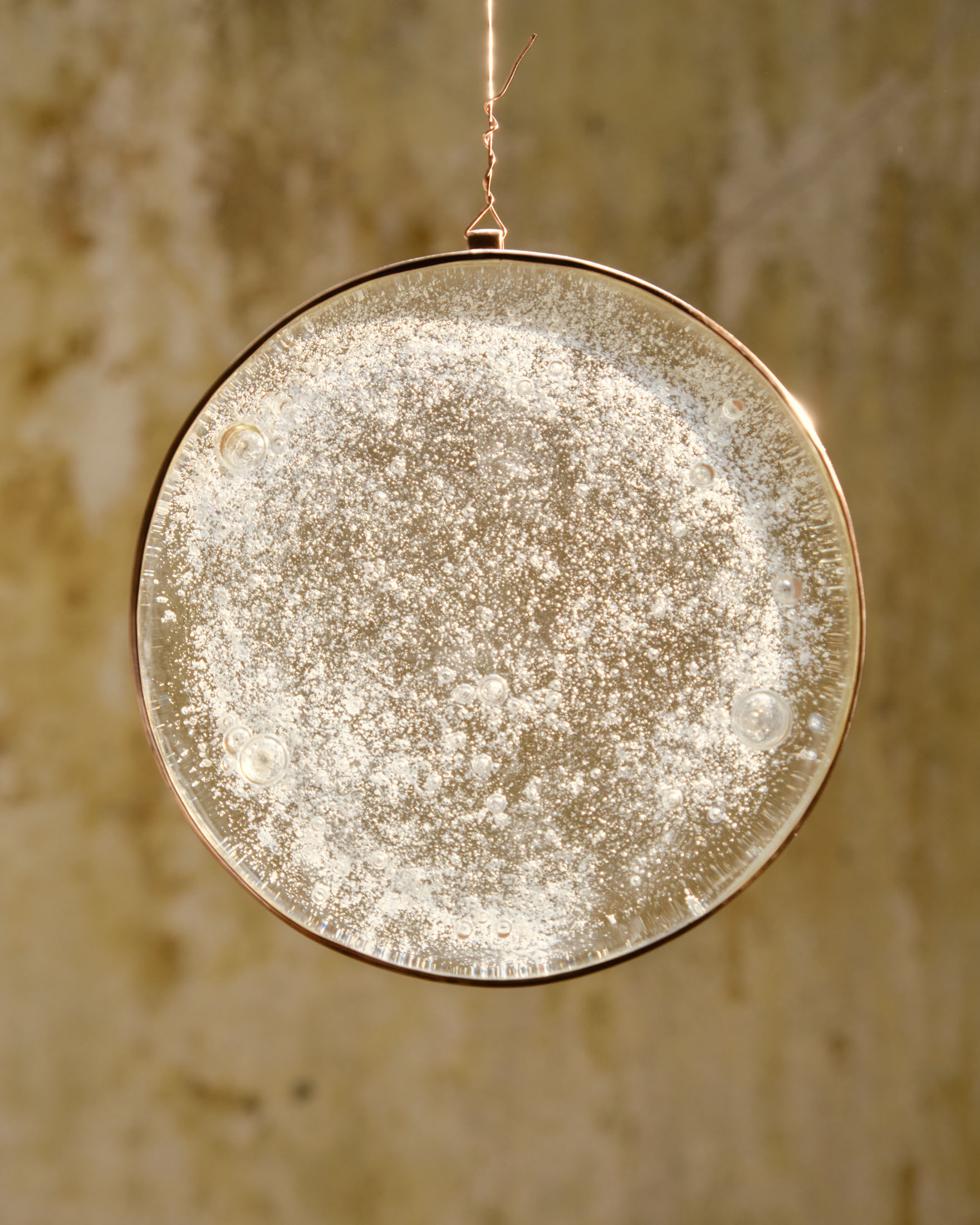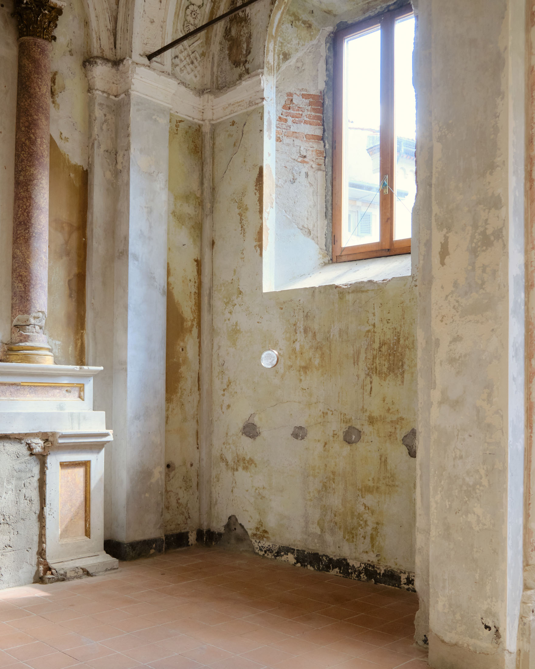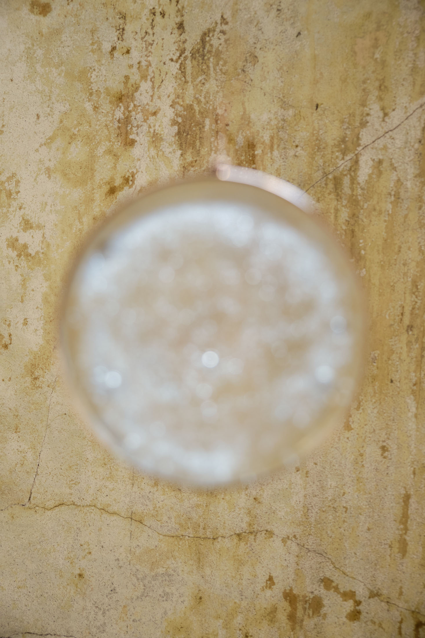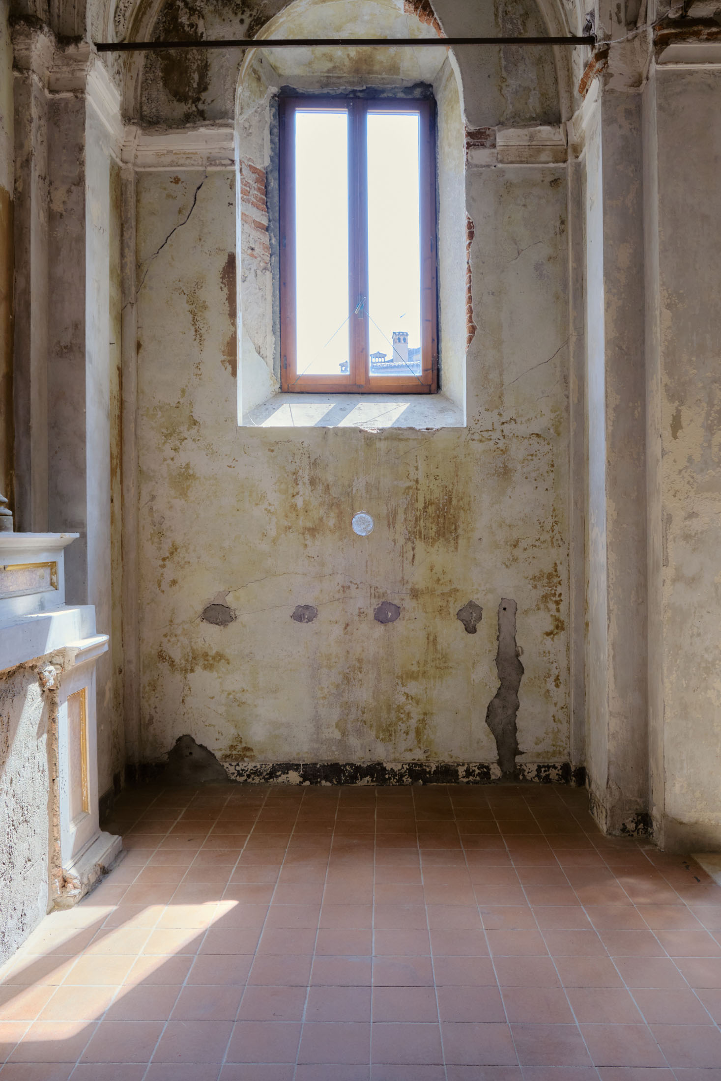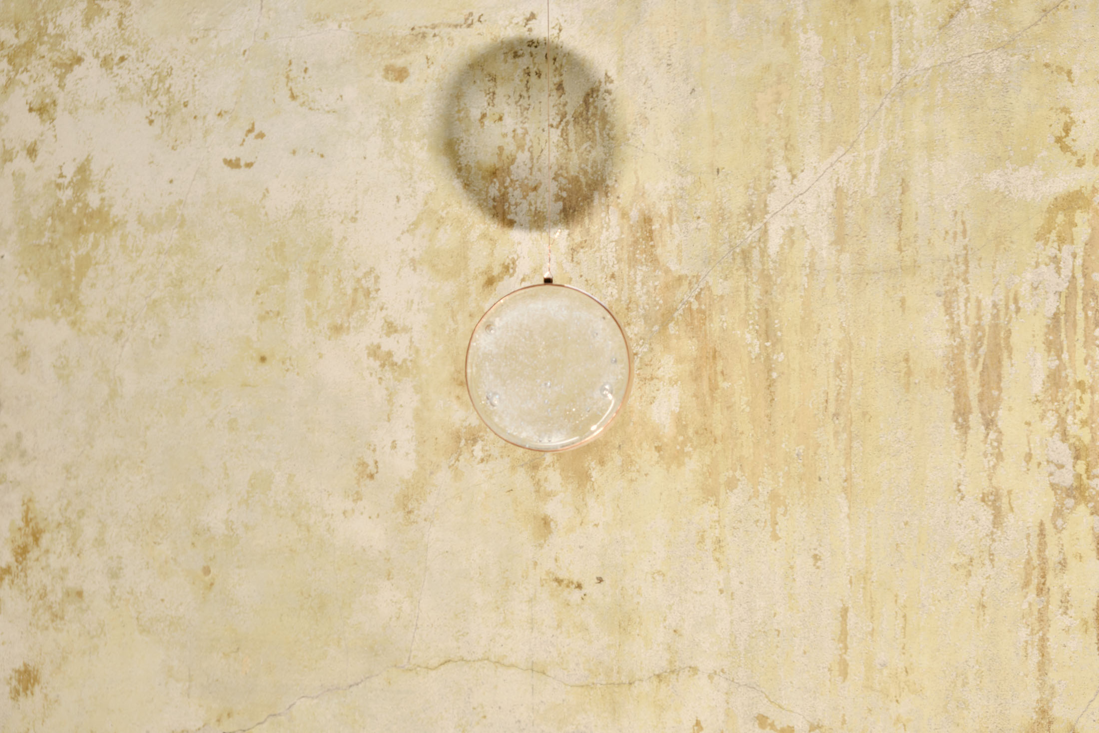 The work Limes, suspended instead under the dome of the presbytery, is inspired by the concept of limit and frontier. When the body of a wolf is found, according to Italian law, it must be cremated in specialised centres. In Limes, the ashes of a wolf were scattered inside molten crystal, later cast into moulds in the shape of the work. The ancient Romans, who feared and admired the wolf that looked after them, were the first to make glass windows to protect their dwellings and called limes the boundary, of the house as well as of the empire. A glass window that usually separates the animal and human worlds, in this case, brings them together, acting as a transpa-rent barrier between two universes. Where the altar refers to the point where the divine meets the human, the work constitutes a meeting point.