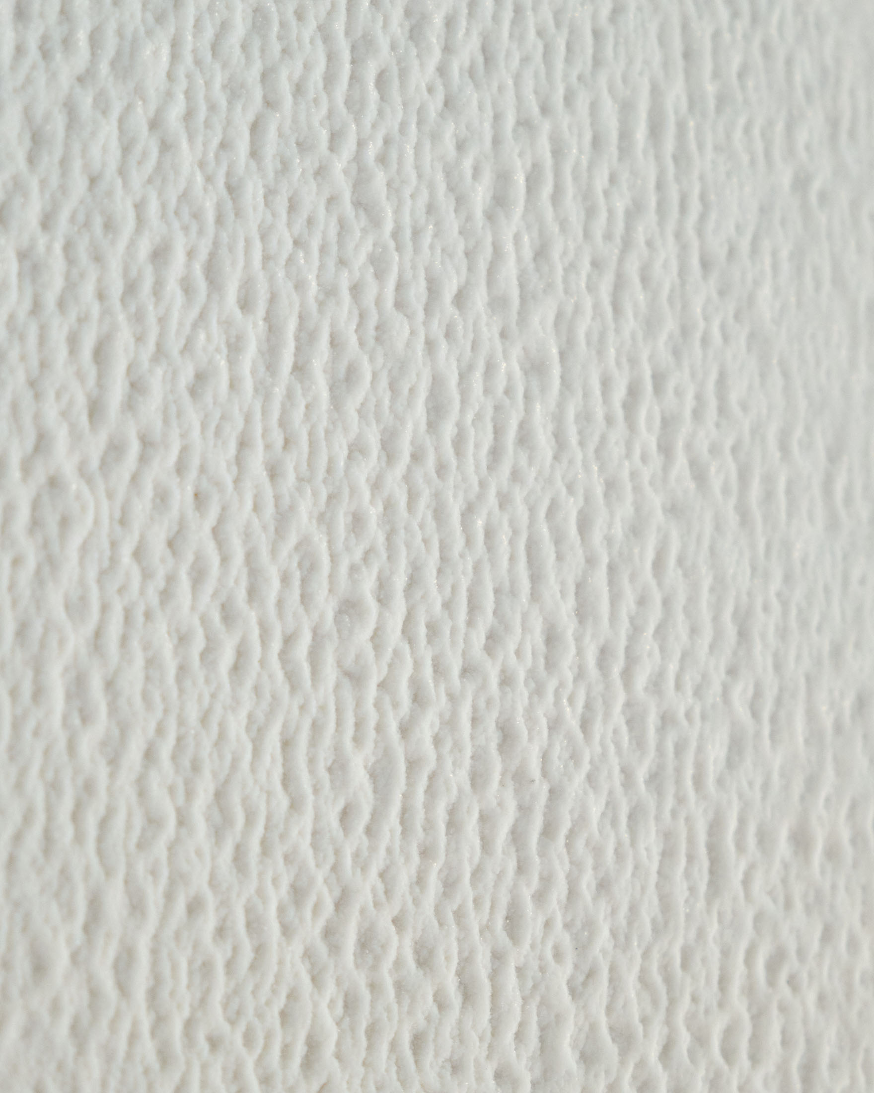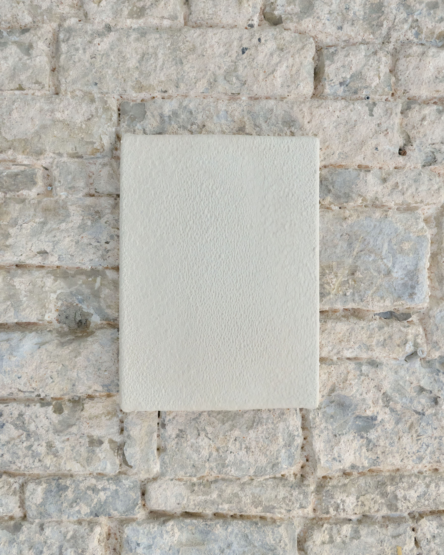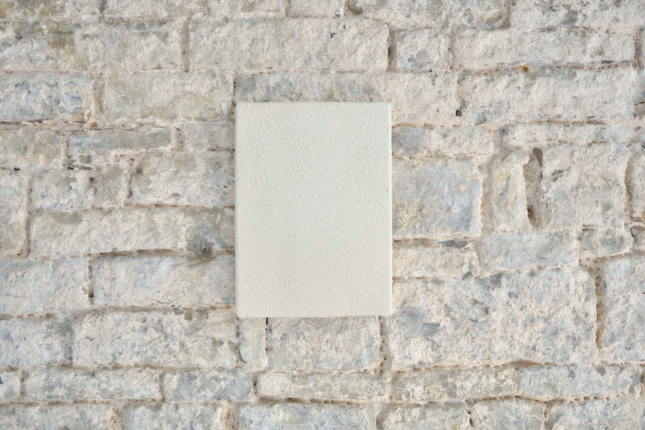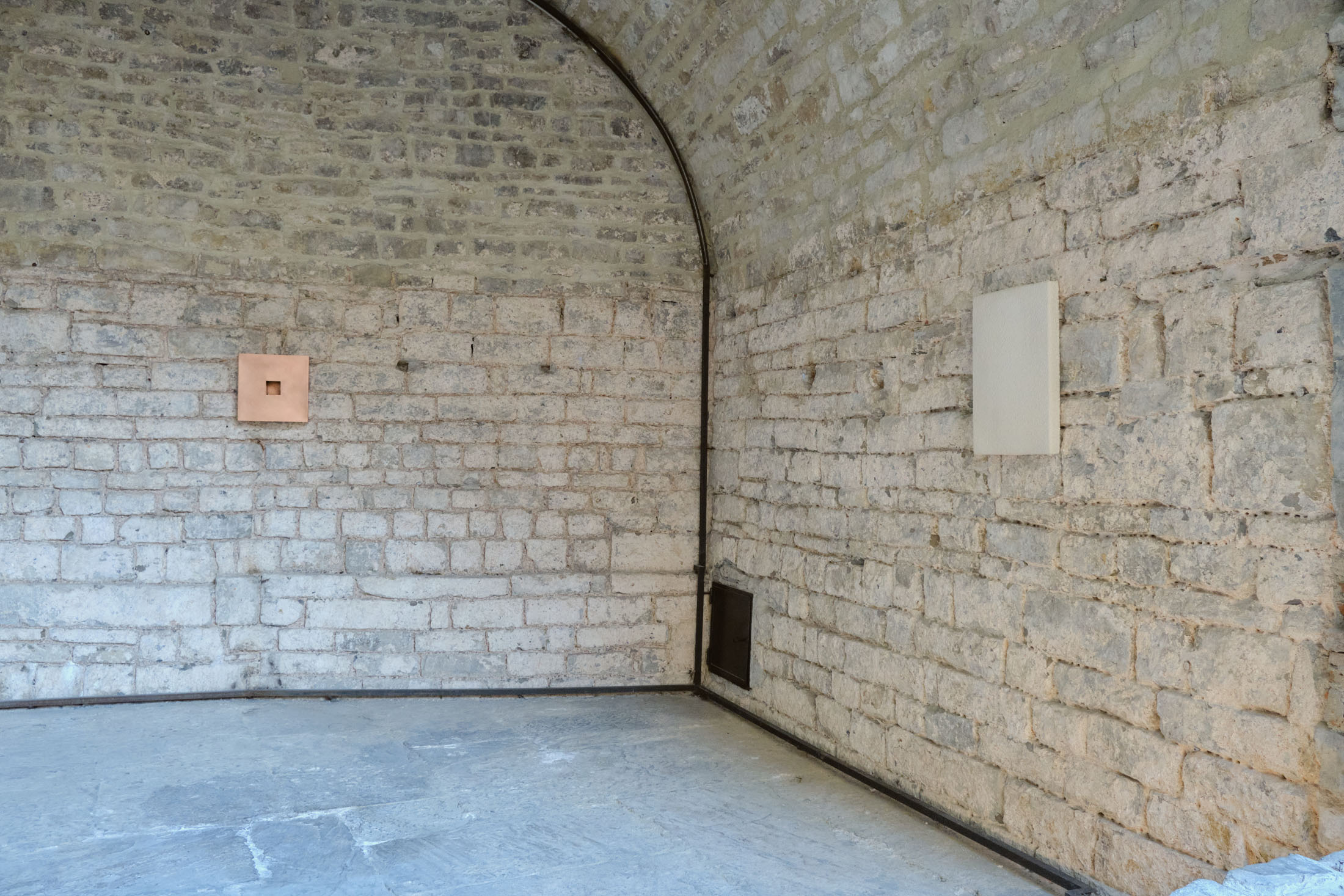 The exhibition consists of two further series of works, distributed on the lower and upper floors, which take up the idea of the processuality of the natural world. The Deposition series, in the former fountain, is a two-dimensional canvas that has taken on a three-dimensional sculptural dimension due to the effect of a particular volcanic water. Placed under a waterfall in Saint-Nectaire, a small village in central France, the canvases were petrified for six months. Flowing over the jute, the water deposits calcite crystals, but whereas in the case of stalactites, these take hundreds of years, here nature accelerates this process, showing the result of a metaphorical journey through time.