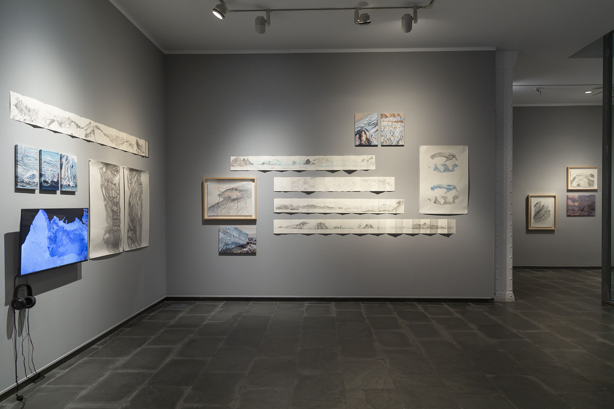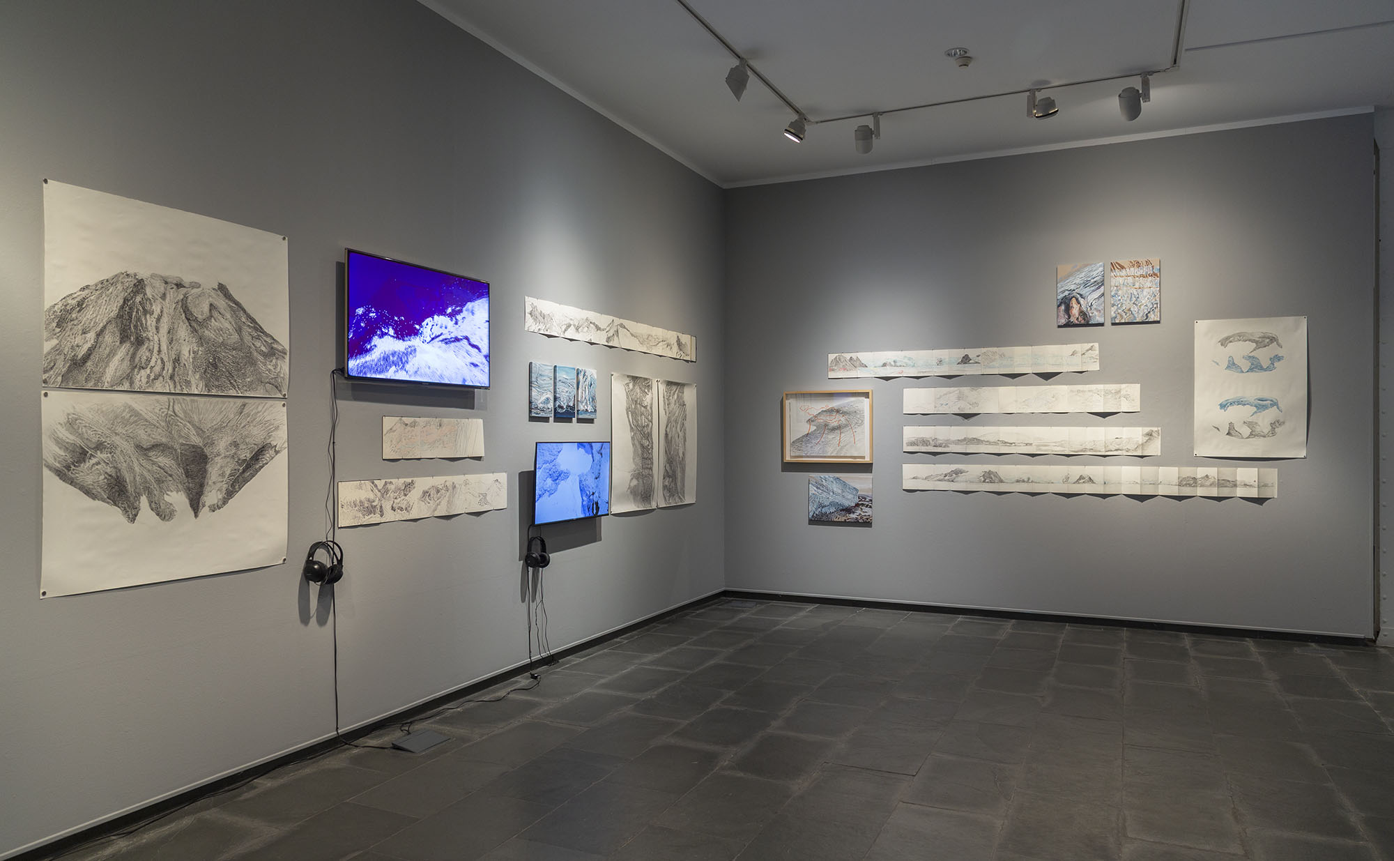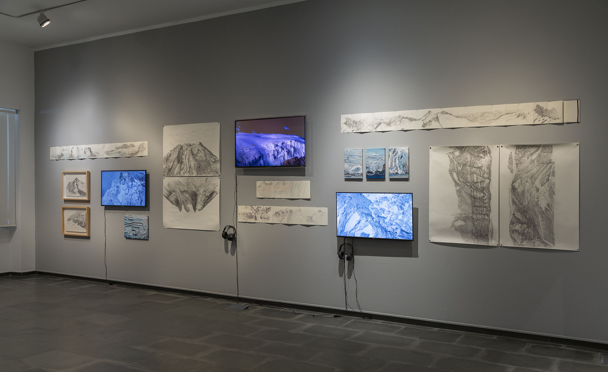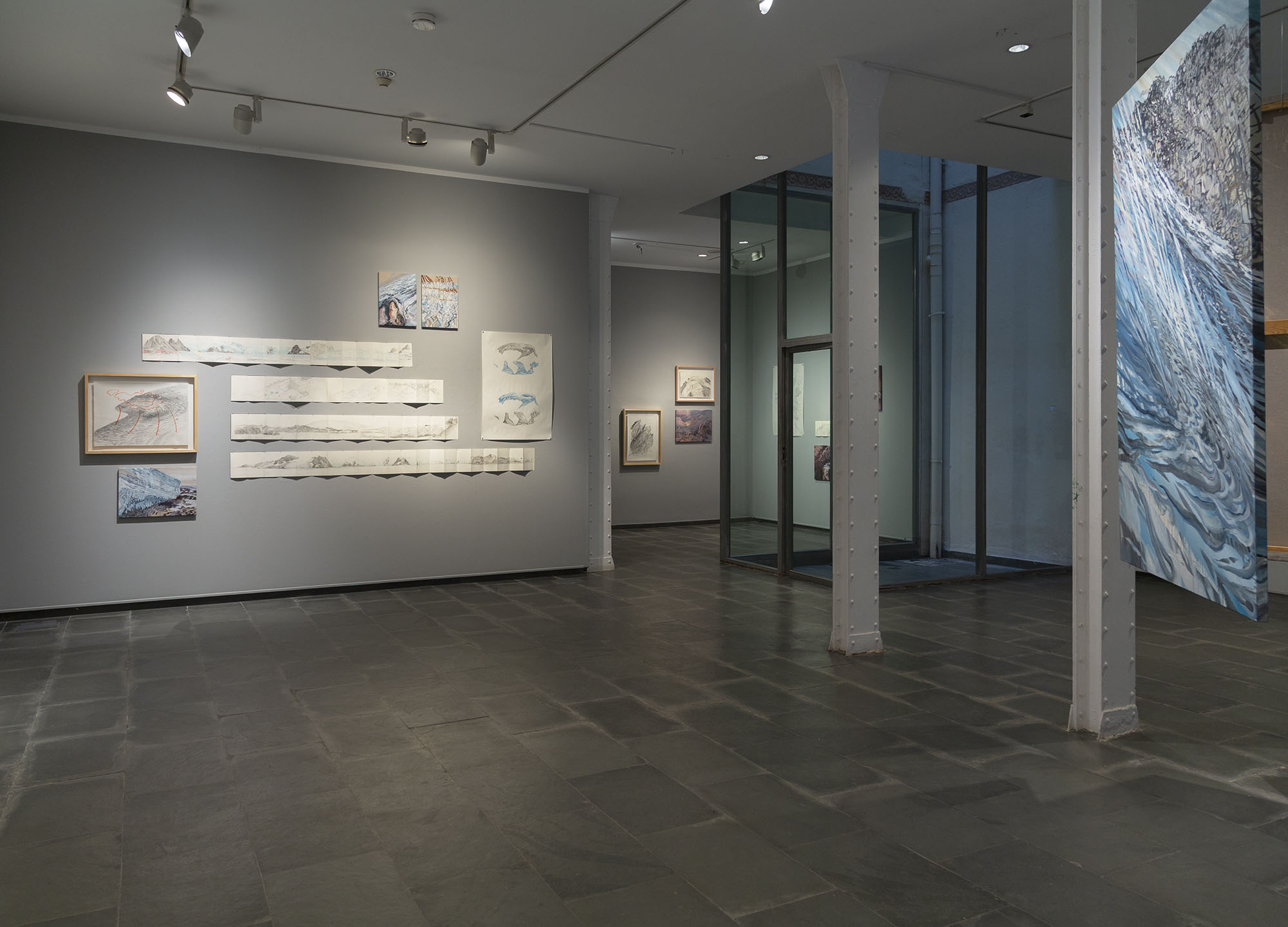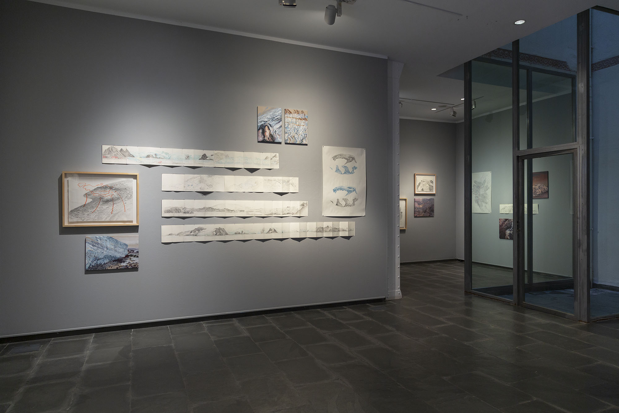 From her drawings and notes we can see pieces at various levels of execution from the more finished to the sketched, depending on the stage of the work. The field note books written up in situ are filled energetic, vibrant strokes. There is body, life and feeling in the rough drawings made in the adverse weather on a glacier. There are larger drawings that delicately insinuate the outlines of the peaks, the crags and ridges as if the artist wishes to emphasise the interiors of these elements rather than their iconic exterior. And there are elaborate maps that diligently show the glacier’s sheath. Together all these pieces share a common element. By eliminating a horizon their substance is enhanced. The substance once again takes centre stage in this work that skillfully moves from landscape to geological subject.