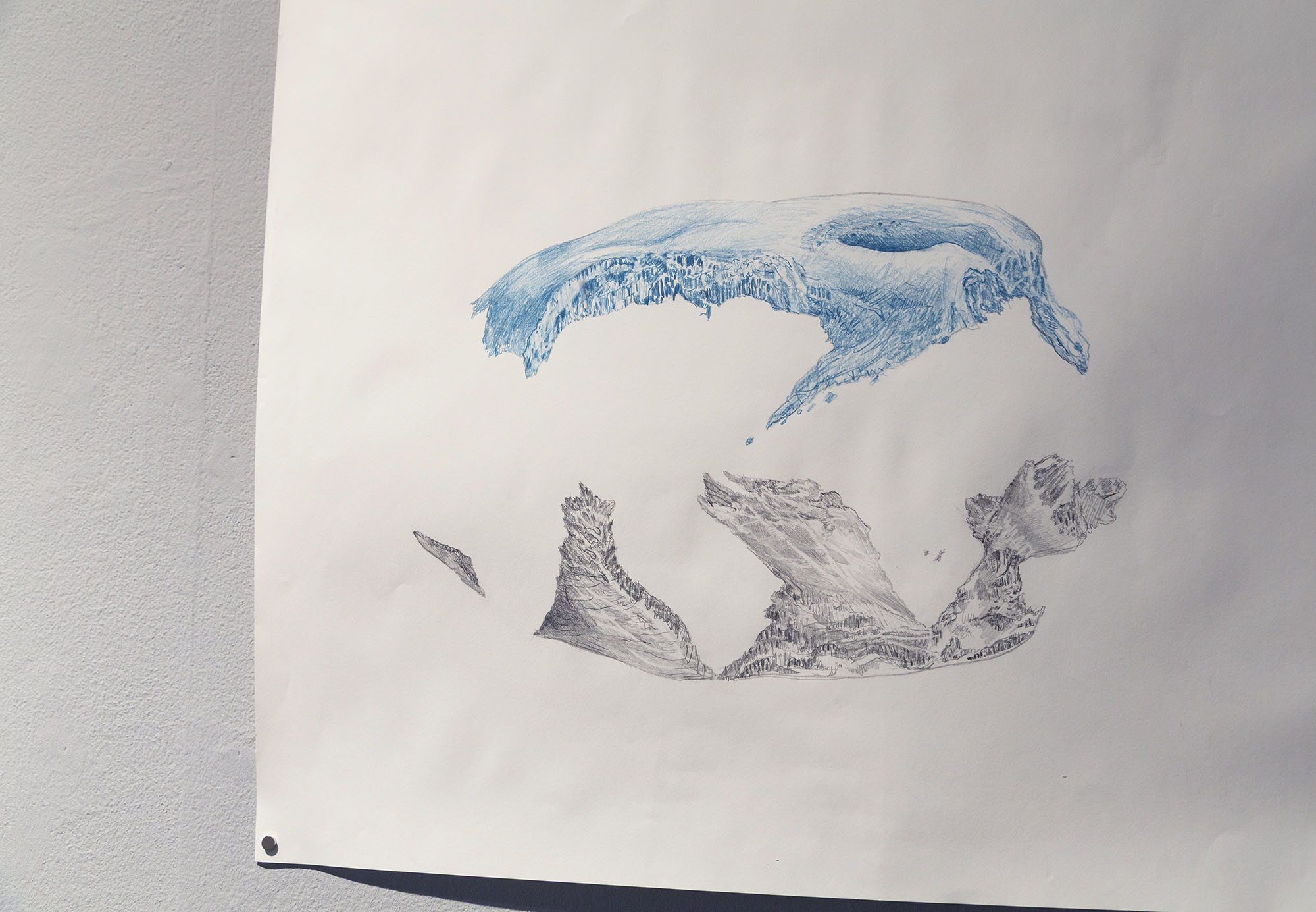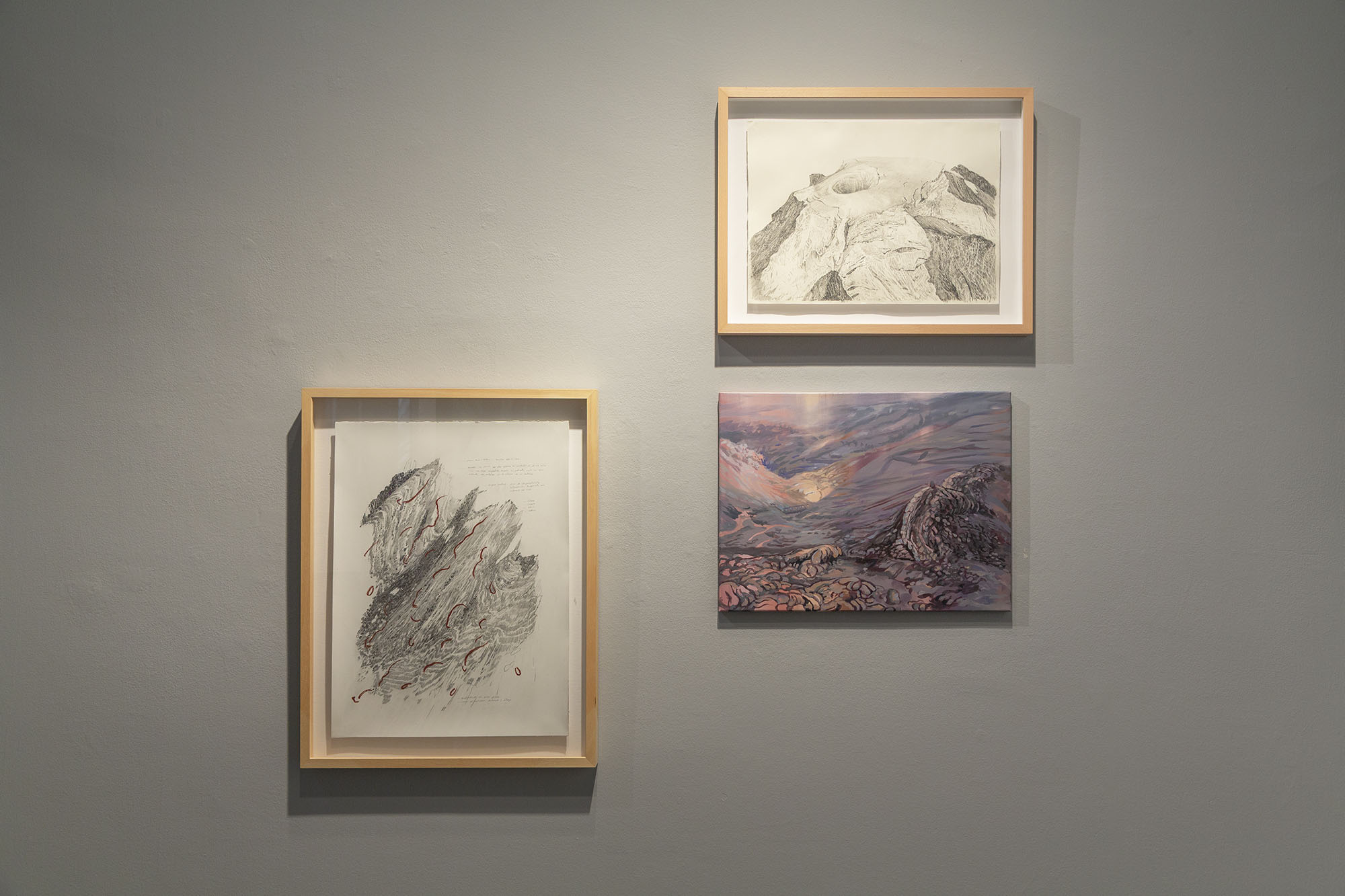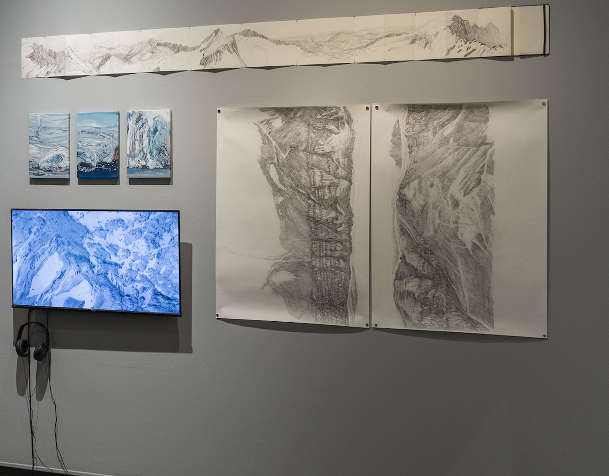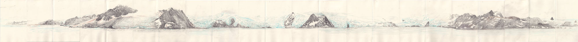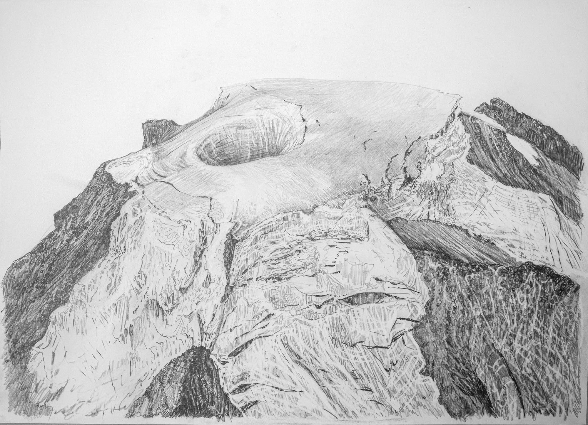From her drawings and notes we can see pieces at various levels of execution from the more finished to the sketched, depending on the stage of the work. The field note books written up in situ are filled energetic, vibrant strokes. There is body, life and feeling in the rough drawings made in the adverse weather on a glacier. There are larger drawings that delicately insinuate the outlines of the peaks, the crags and ridges as if the artist wishes to emphasise the interiors of these elements rather than their iconic exterior. And there are elaborate maps that diligently show the glacier’s sheath. Together all these pieces share a common element. By eliminating a horizon their substance is enhanced. The substance once again takes centre stage in this work that skillfully moves from landscape to geological subject.