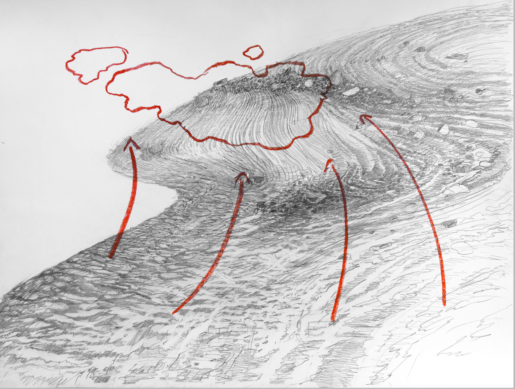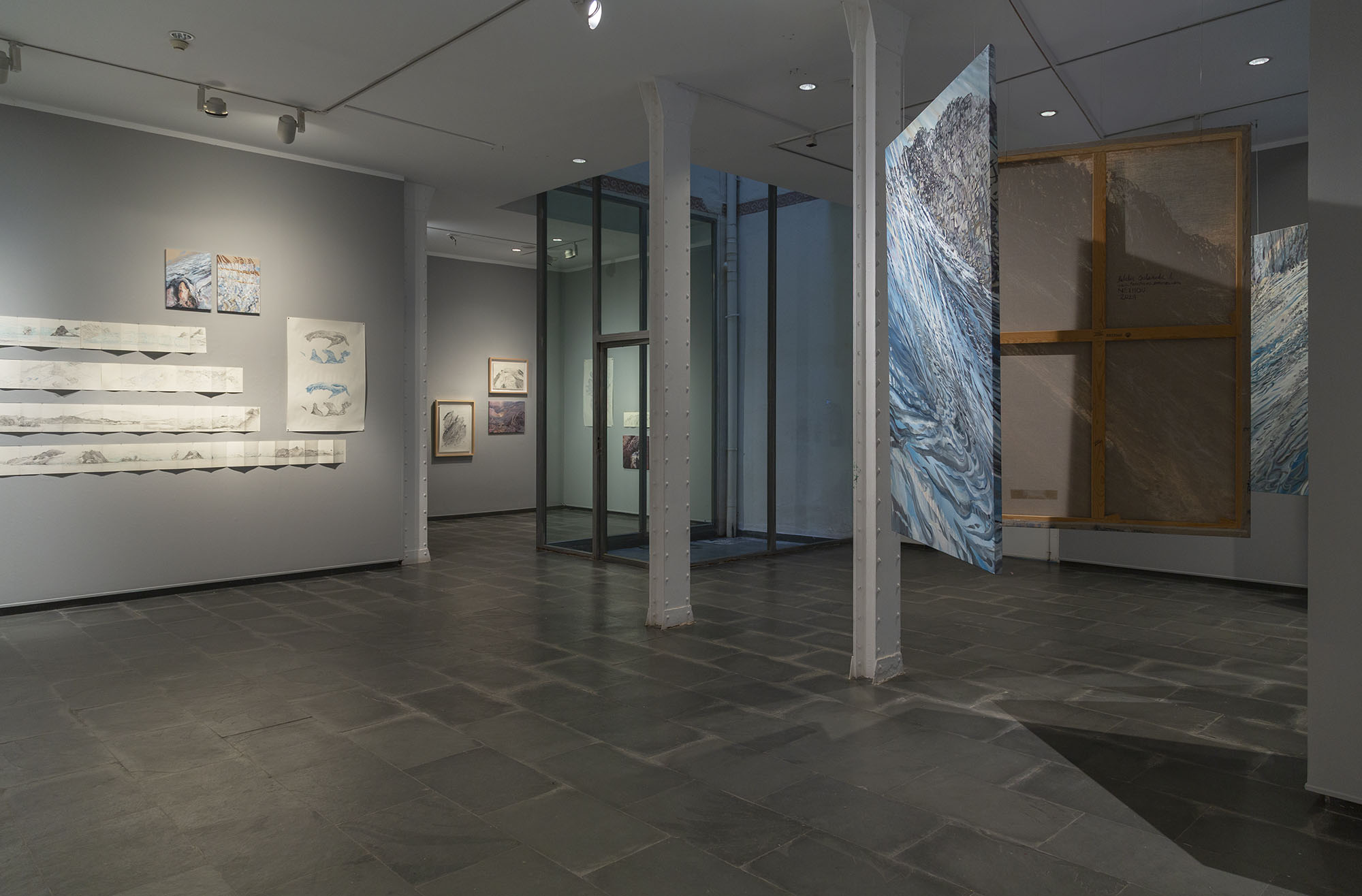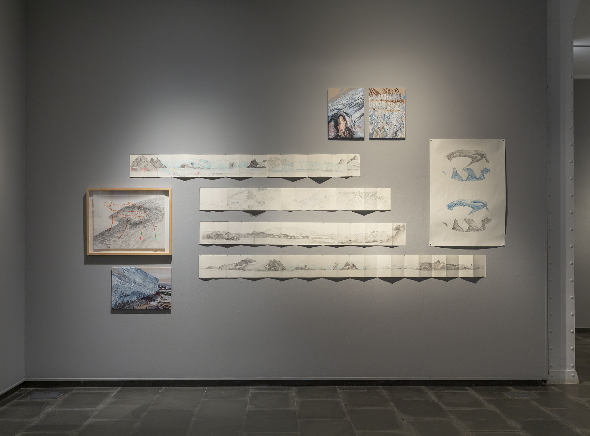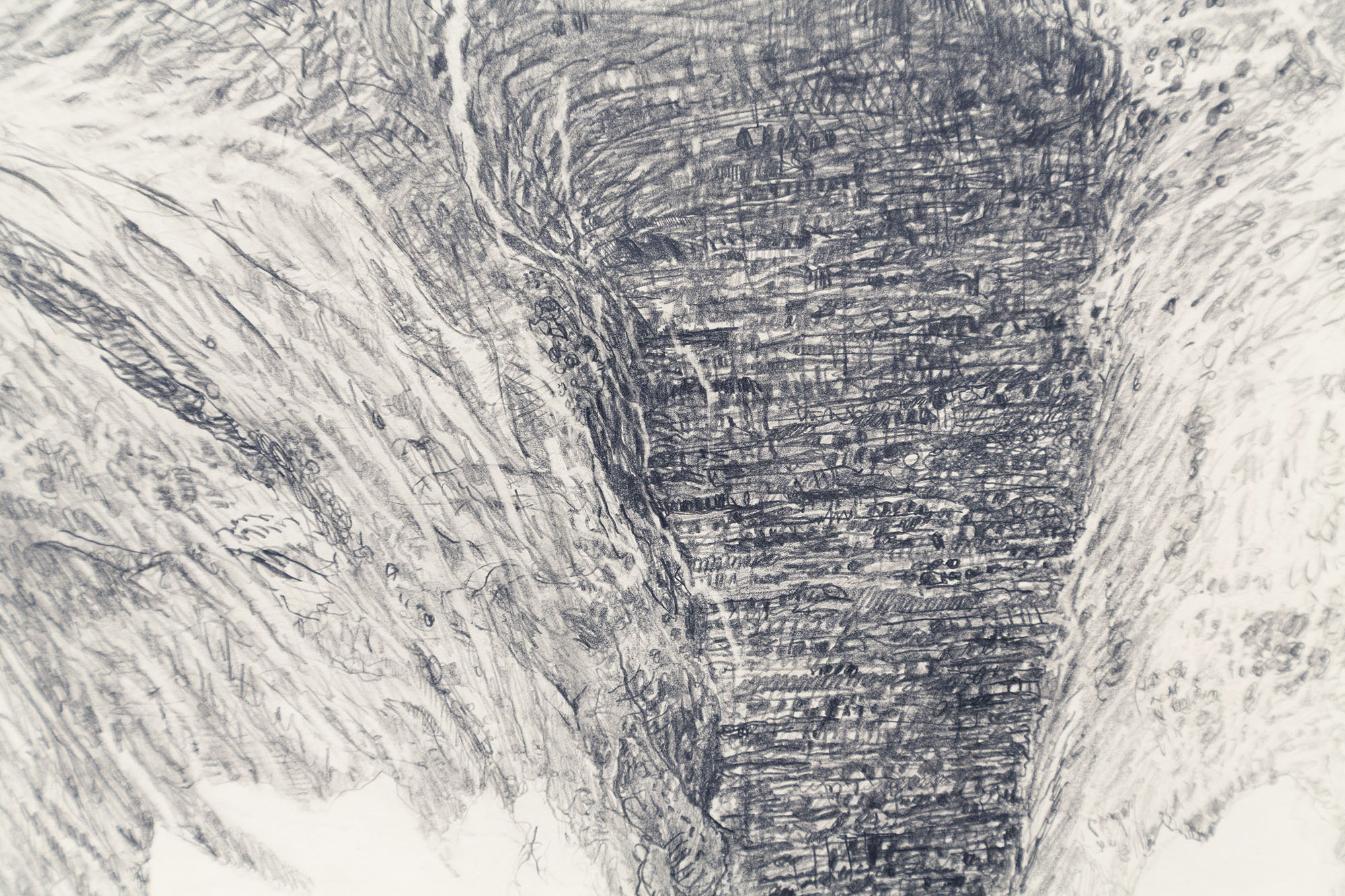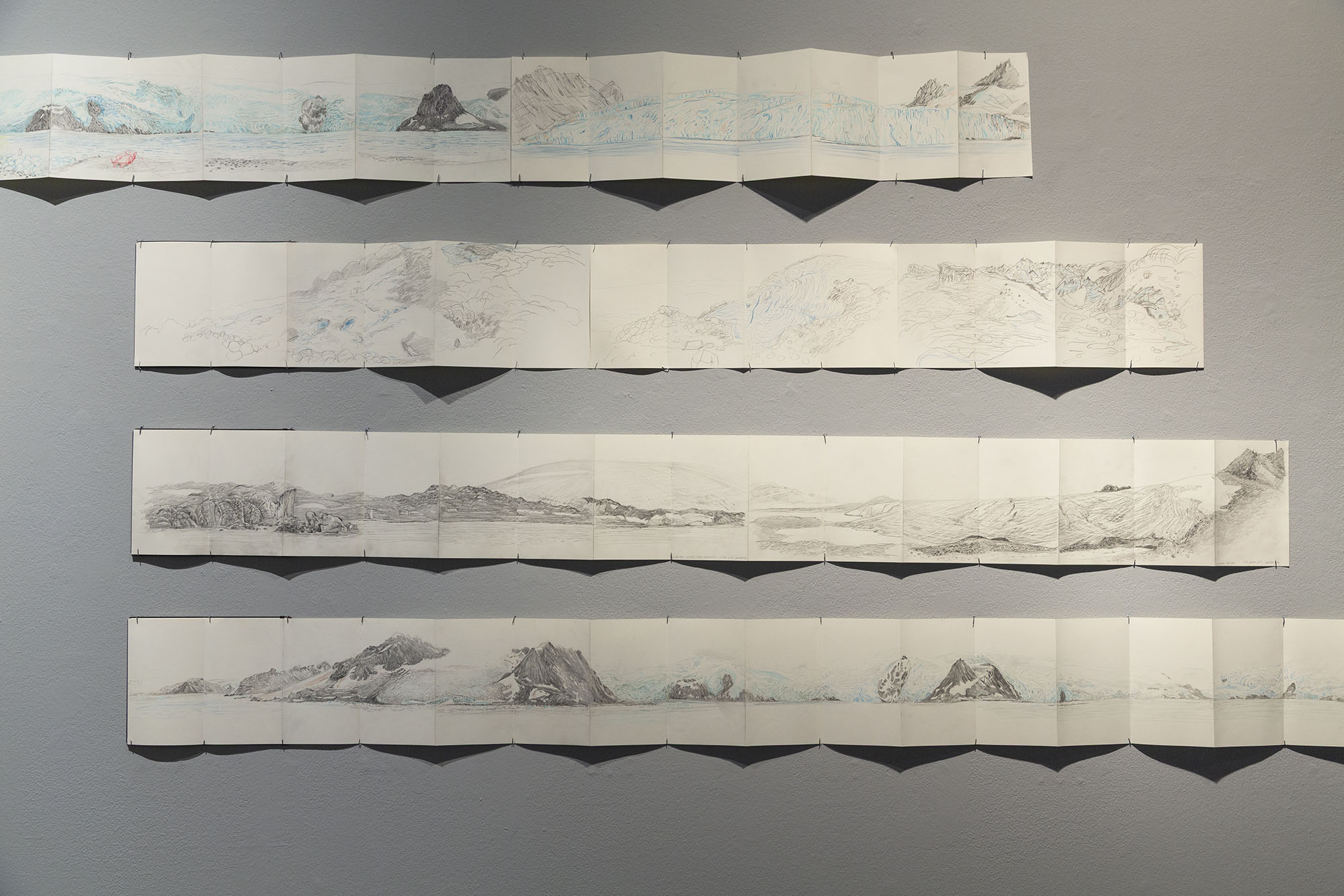From her drawings and notes we can see pieces at various levels of execution from the more finished to the sketched, depending on the stage of the work. The field note books written up in situ are filled energetic, vibrant strokes. There is body, life and feeling in the rough drawings made in the adverse weather on a glacier. There are larger drawings that delicately insinuate the outlines of the peaks, the crags and ridges as if the artist wishes to emphasise the interiors of these elements rather than their iconic exterior. And there are elaborate maps that diligently show the glacier’s sheath. Together all these pieces share a common element. By eliminating a horizon their substance is enhanced. The substance once again takes centre stage in this work that skillfully moves from landscape to geological subject.