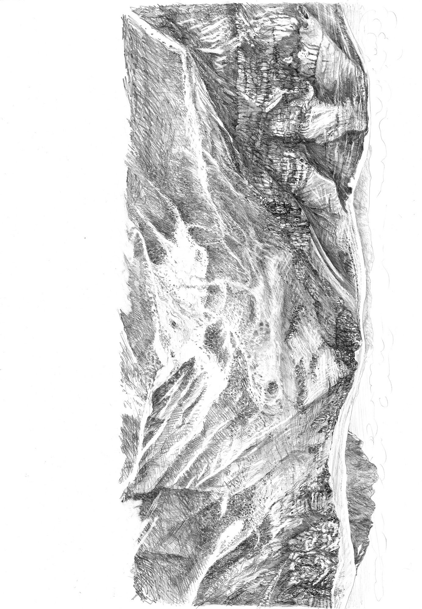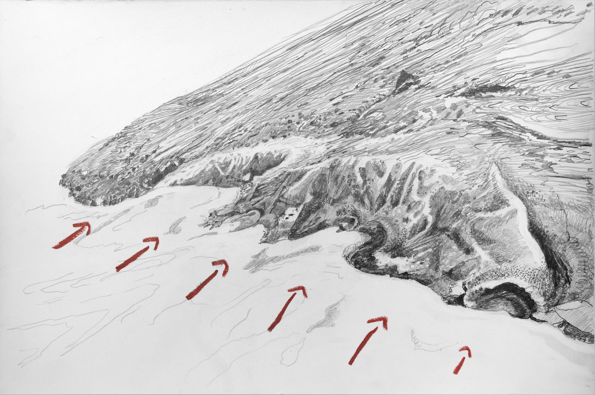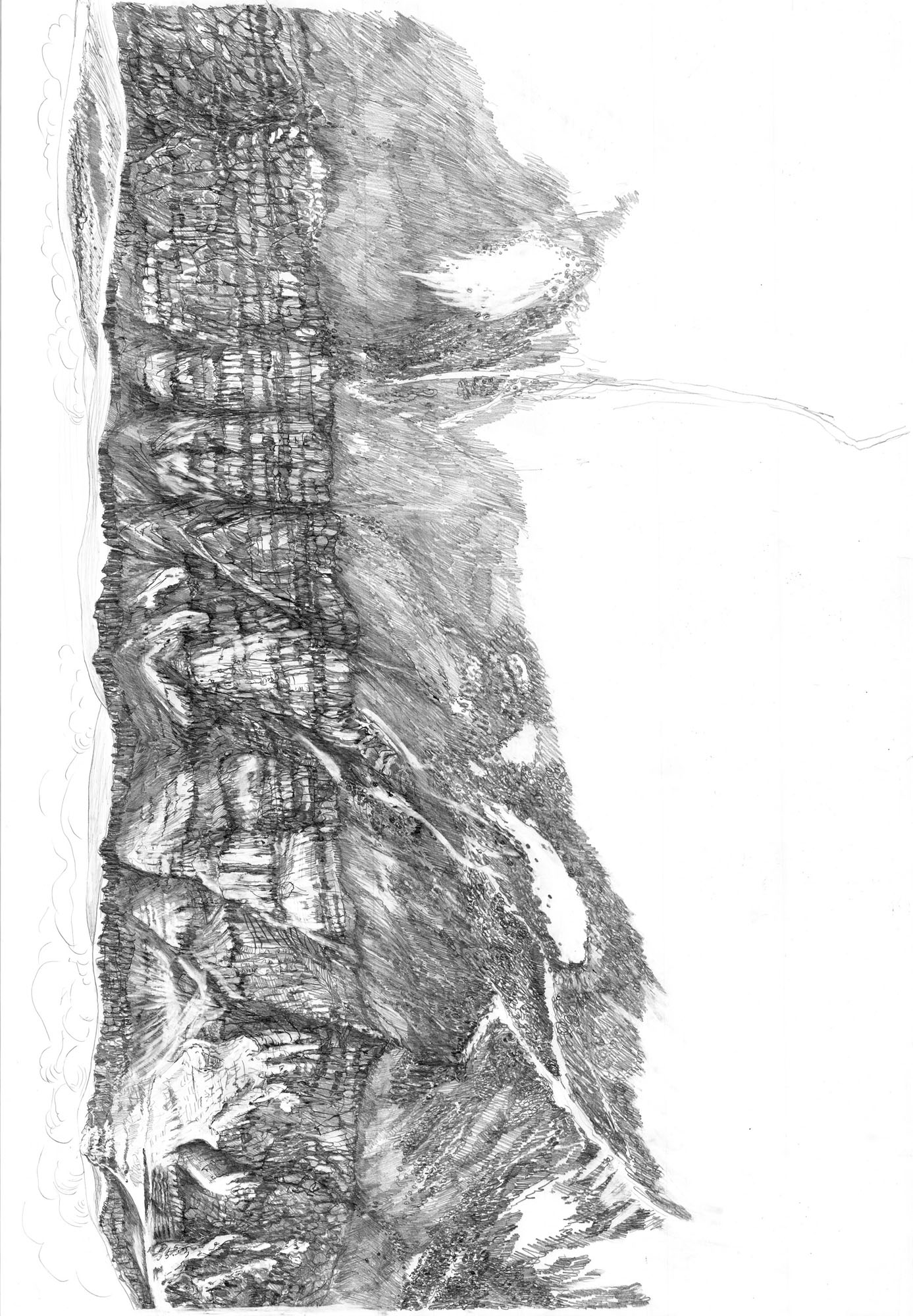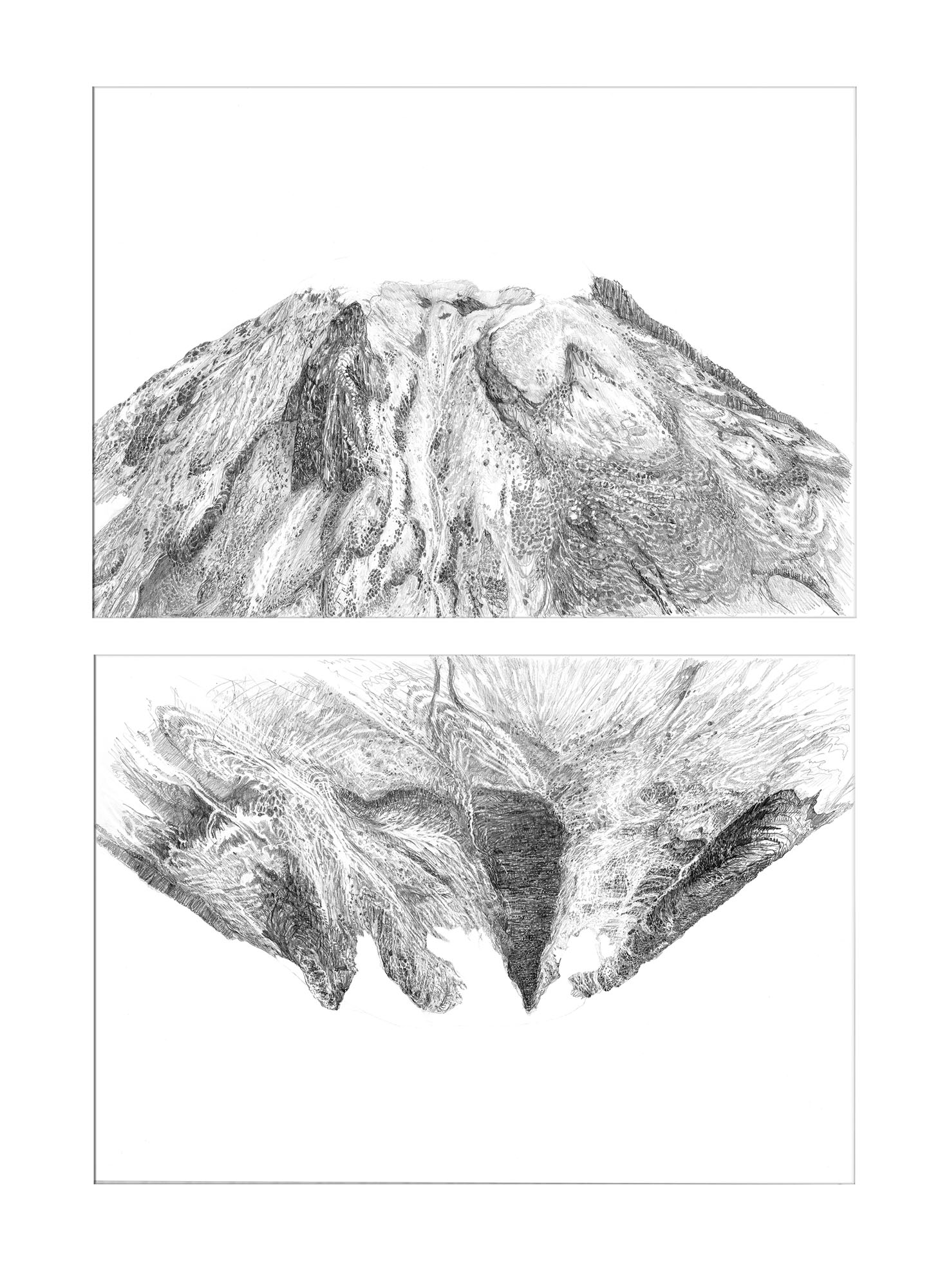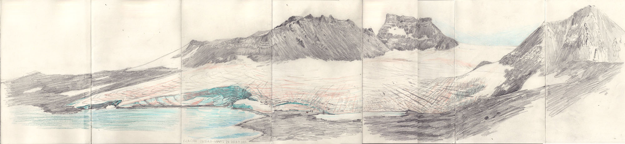 From her drawings and notes we can see pieces at various levels of execution from the more finished to the sketched, depending on the stage of the work. The field note books written up in situ are filled energetic, vibrant strokes. There is body, life and feeling in the rough drawings made in the adverse weather on a glacier. There are larger drawings that delicately insinuate the outlines of the peaks, the crags and ridges as if the artist wishes to emphasise the interiors of these elements rather than their iconic exterior. And there are elaborate maps that diligently show the glacier’s sheath. Together all these pieces share a common element. By eliminating a horizon their substance is enhanced. The substance once again takes centre stage in this work that skillfully moves from landscape to geological subject.