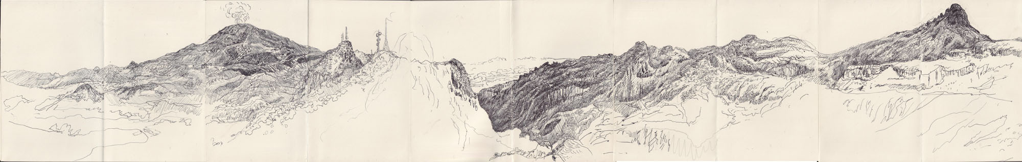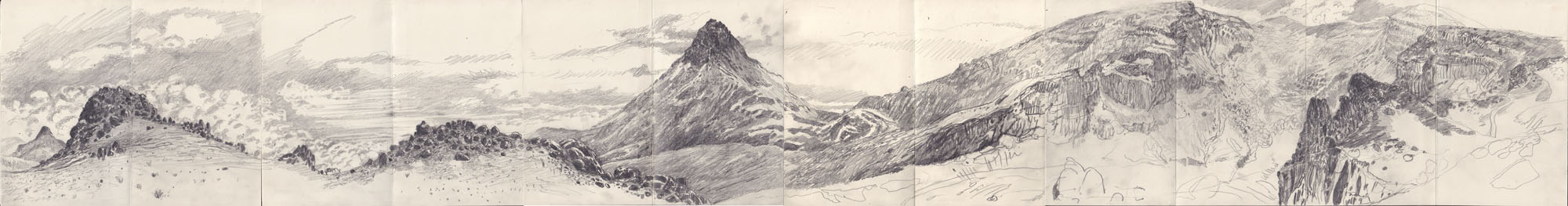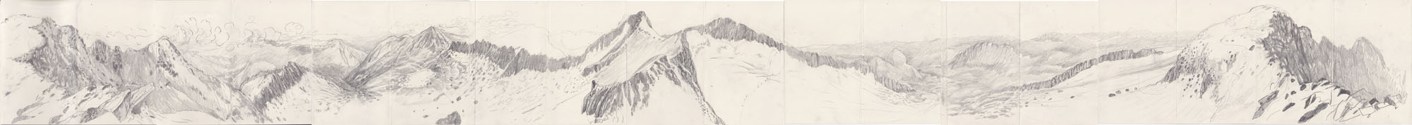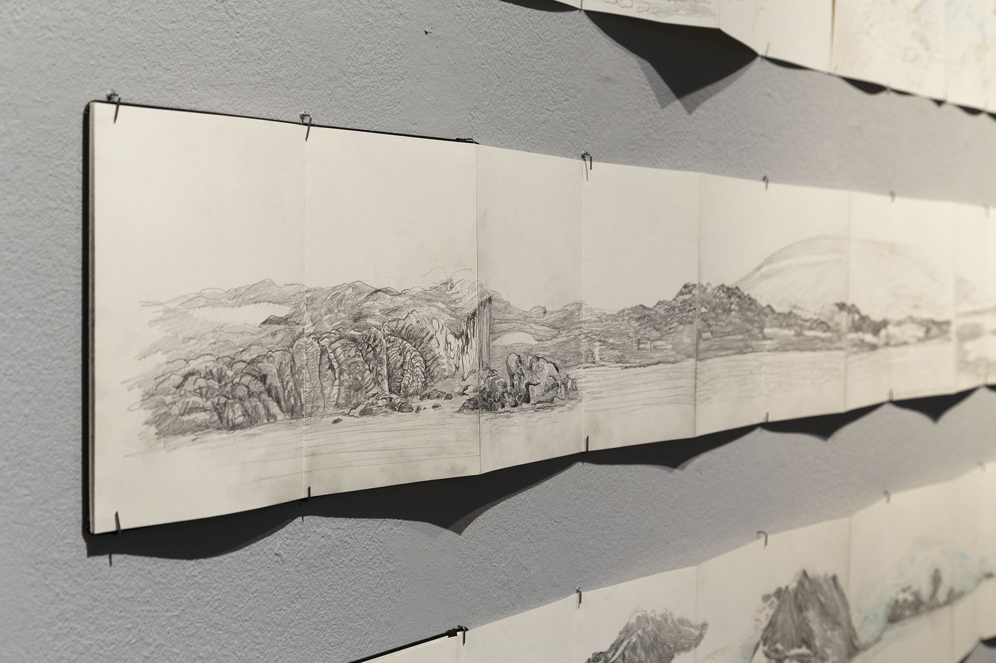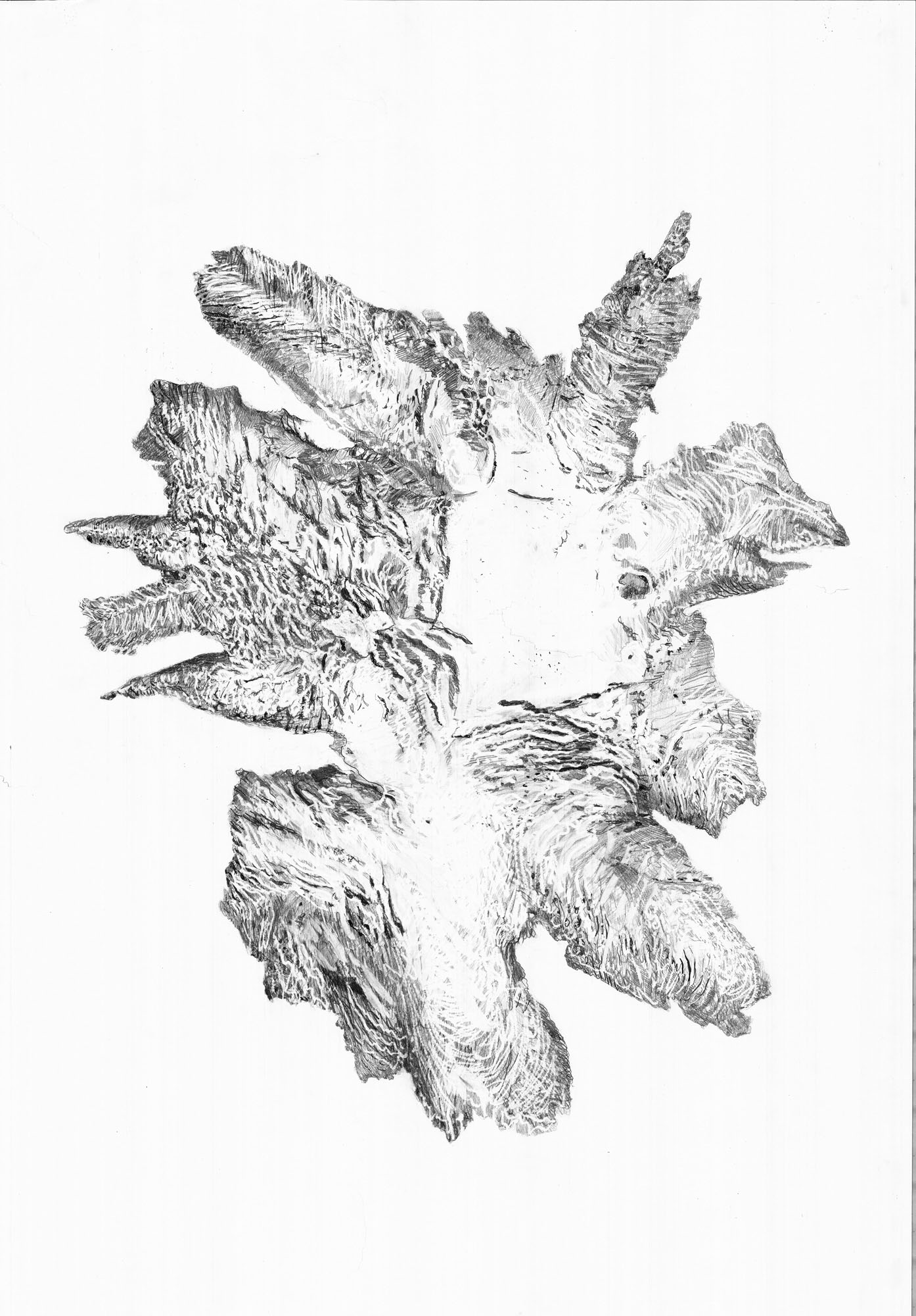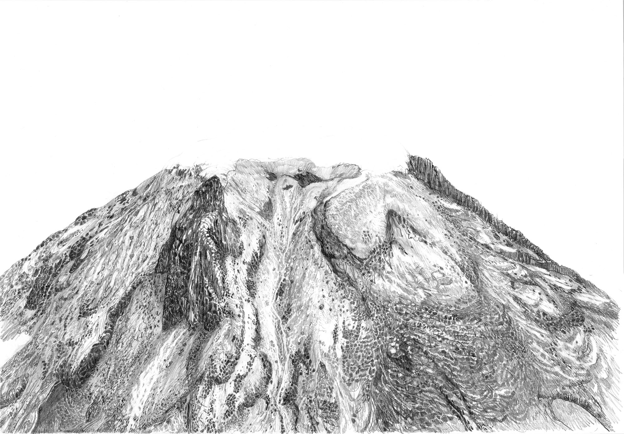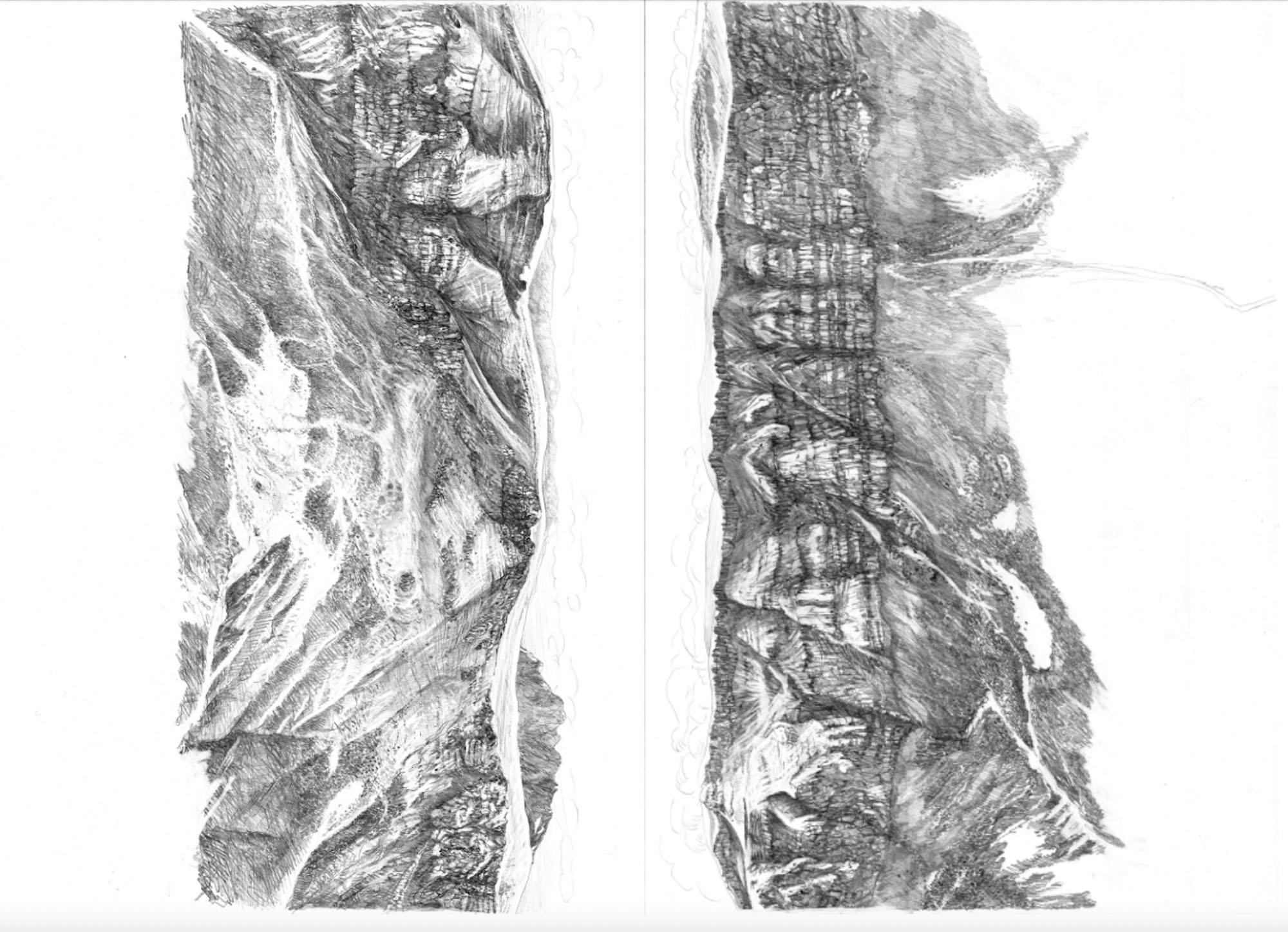 From her drawings and notes we can see pieces at various levels of execution from the more finished to the sketched, depending on the stage of the work. The field note books written up in situ are filled energetic, vibrant strokes. There is body, life and feeling in the rough drawings made in the adverse weather on a glacier. There are larger drawings that delicately insinuate the outlines of the peaks, the crags and ridges as if the artist wishes to emphasise the interiors of these elements rather than their iconic exterior. And there are elaborate maps that diligently show the glacier’s sheath. Together all these pieces share a common element. By eliminating a horizon their substance is enhanced. The substance once again takes centre stage in this work that skillfully moves from landscape to geological subject.