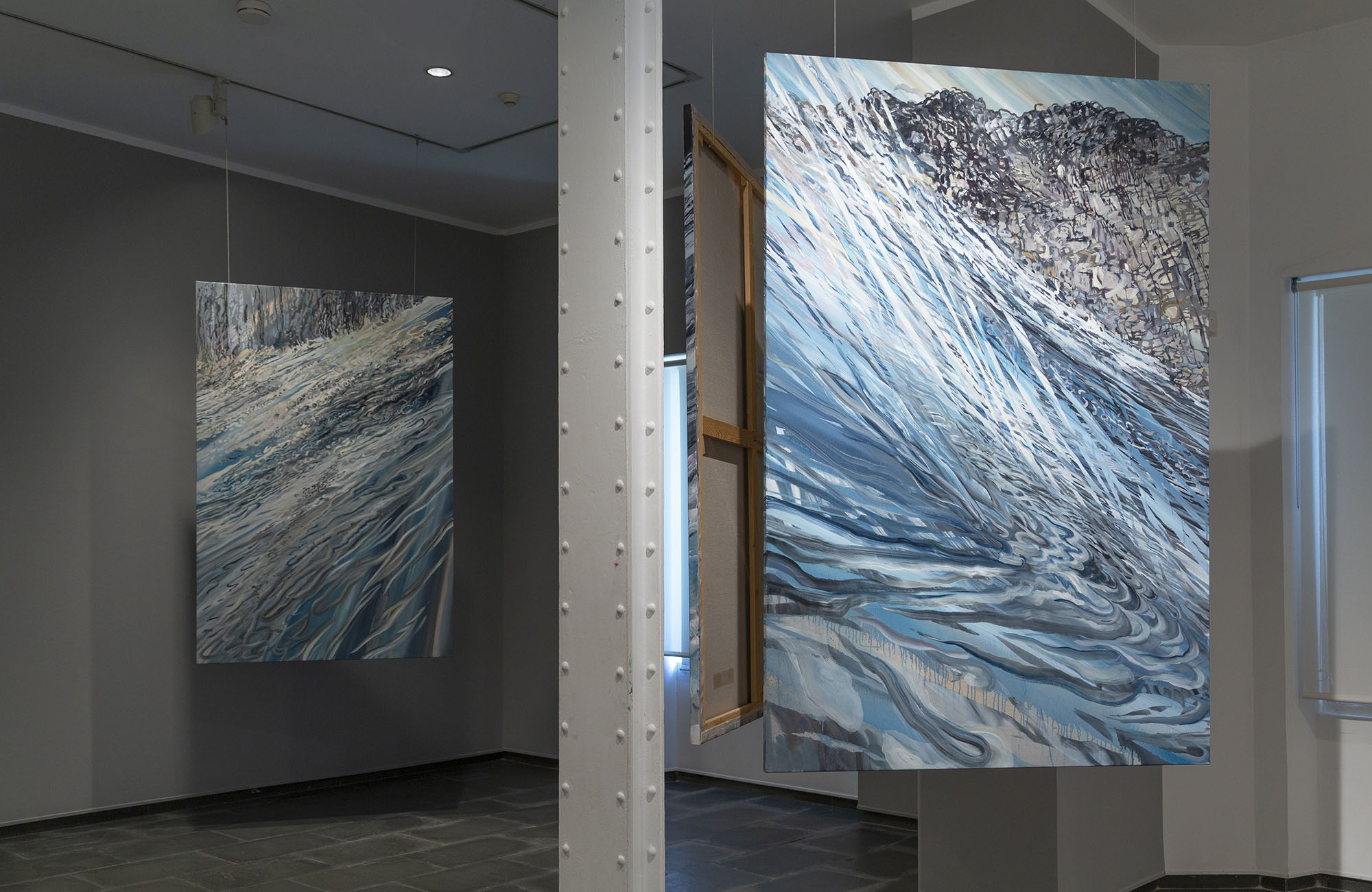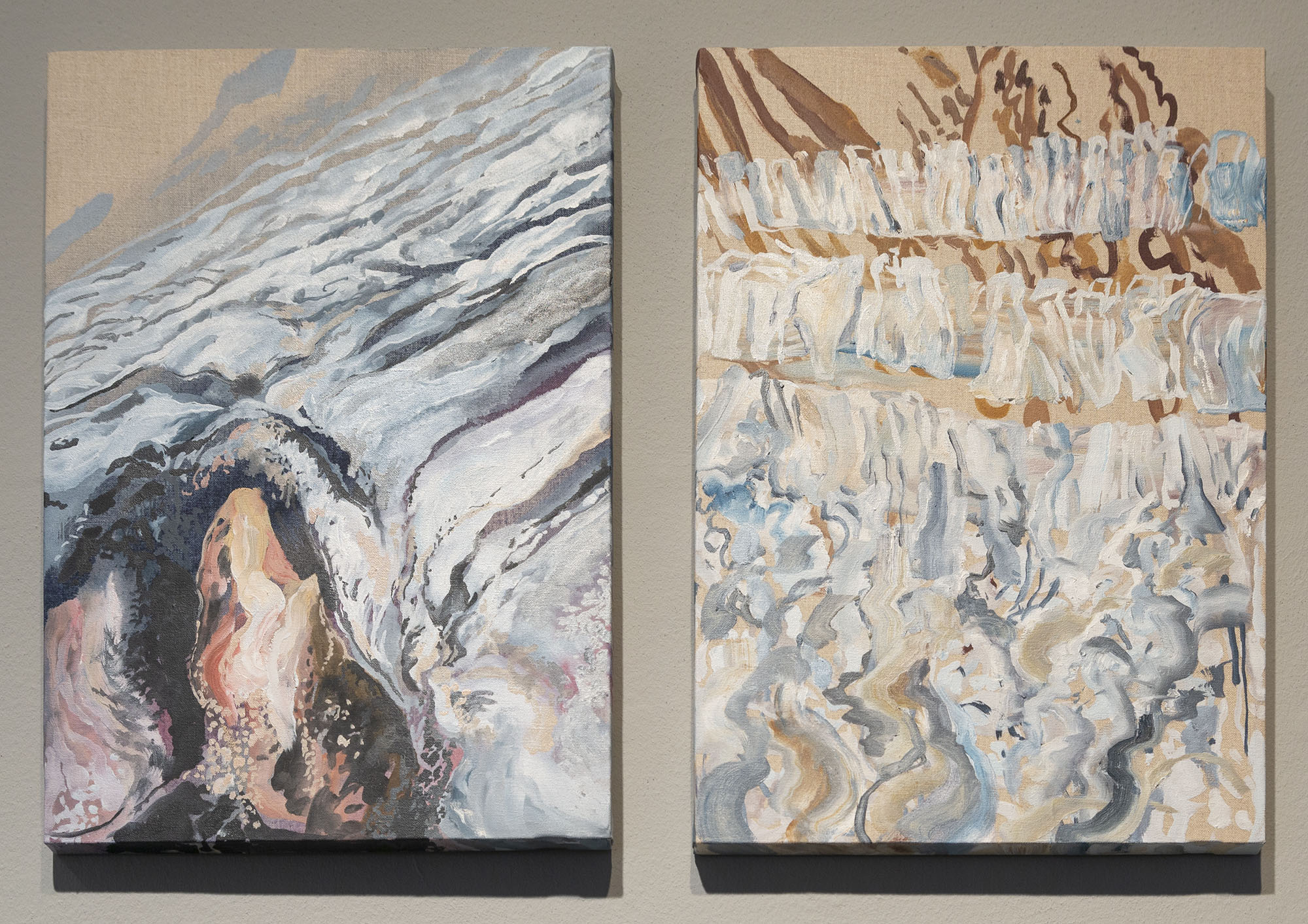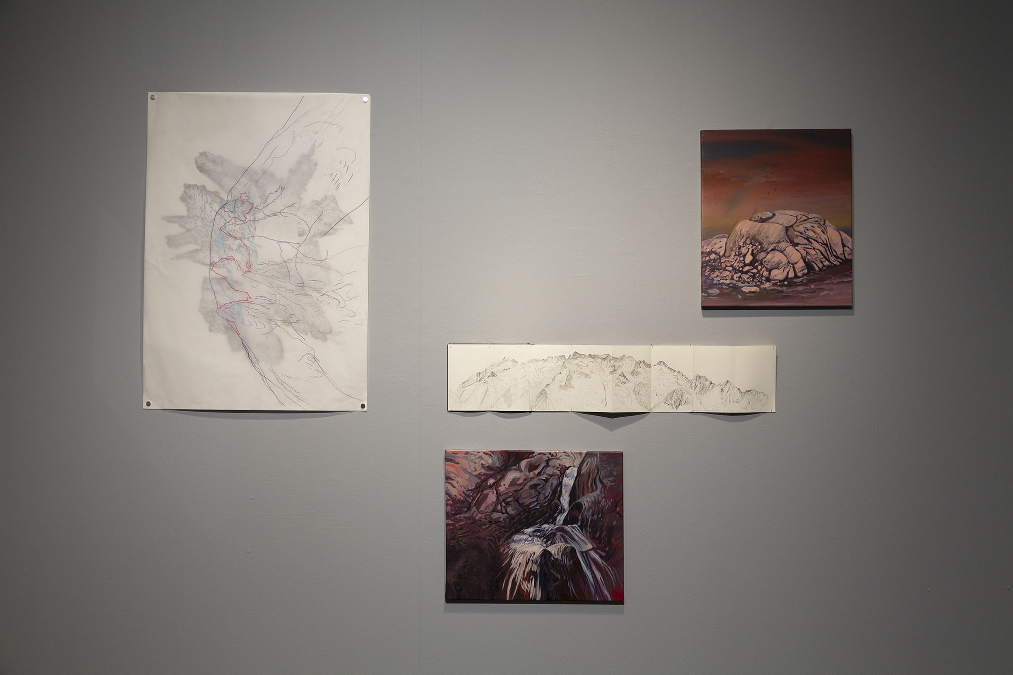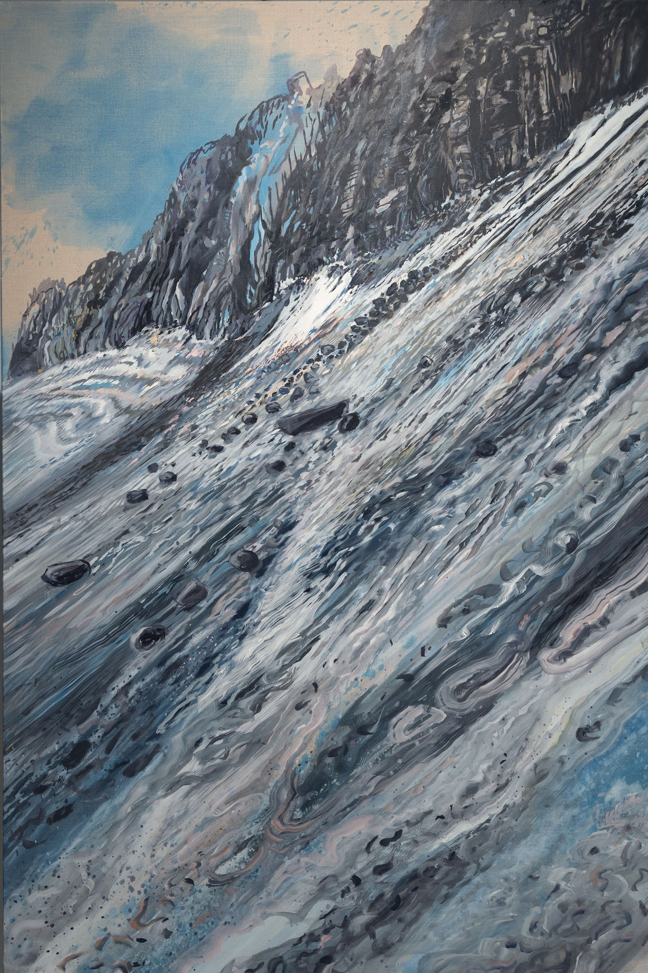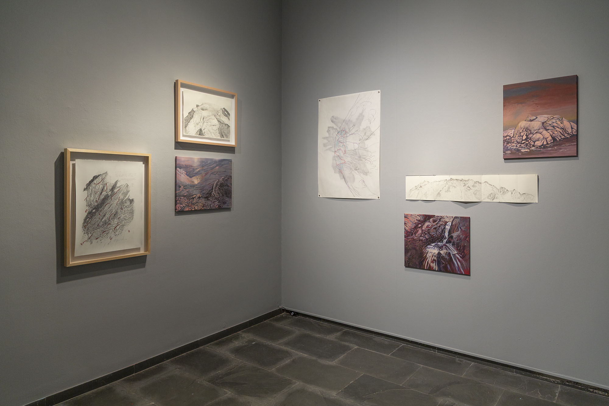 On the other hand her paintings are a visual perception of the mountain unlike the spectacular drone images. They are a subjective interpretation that forge a close physical relationship with the object, a tactile register of the dynamics of mountain that tell us of her own experiences. This throbbing, luminous technique reveals a story-teller, an affectionate mountain, conscious of the links between the material and the metaphoric self.
