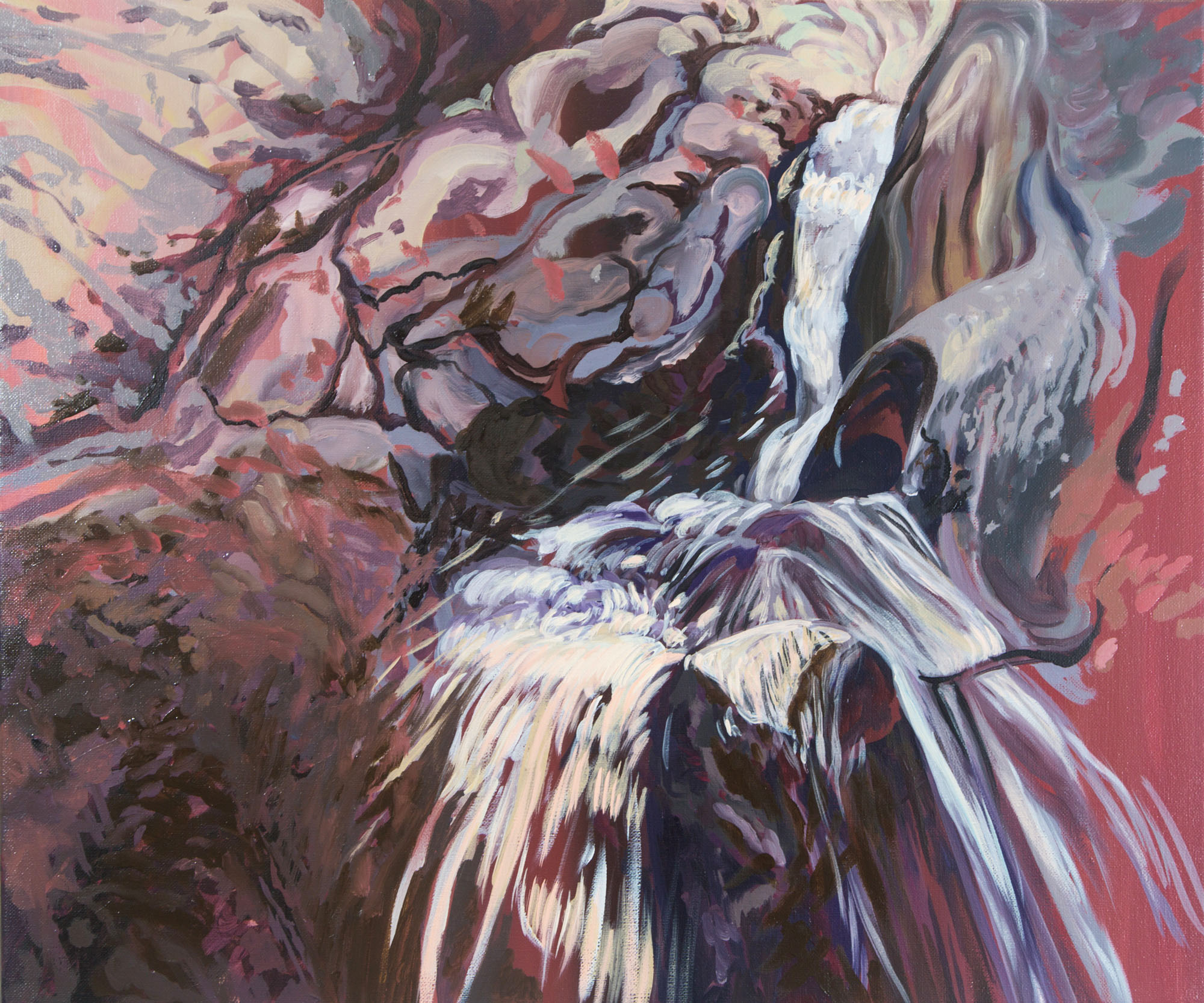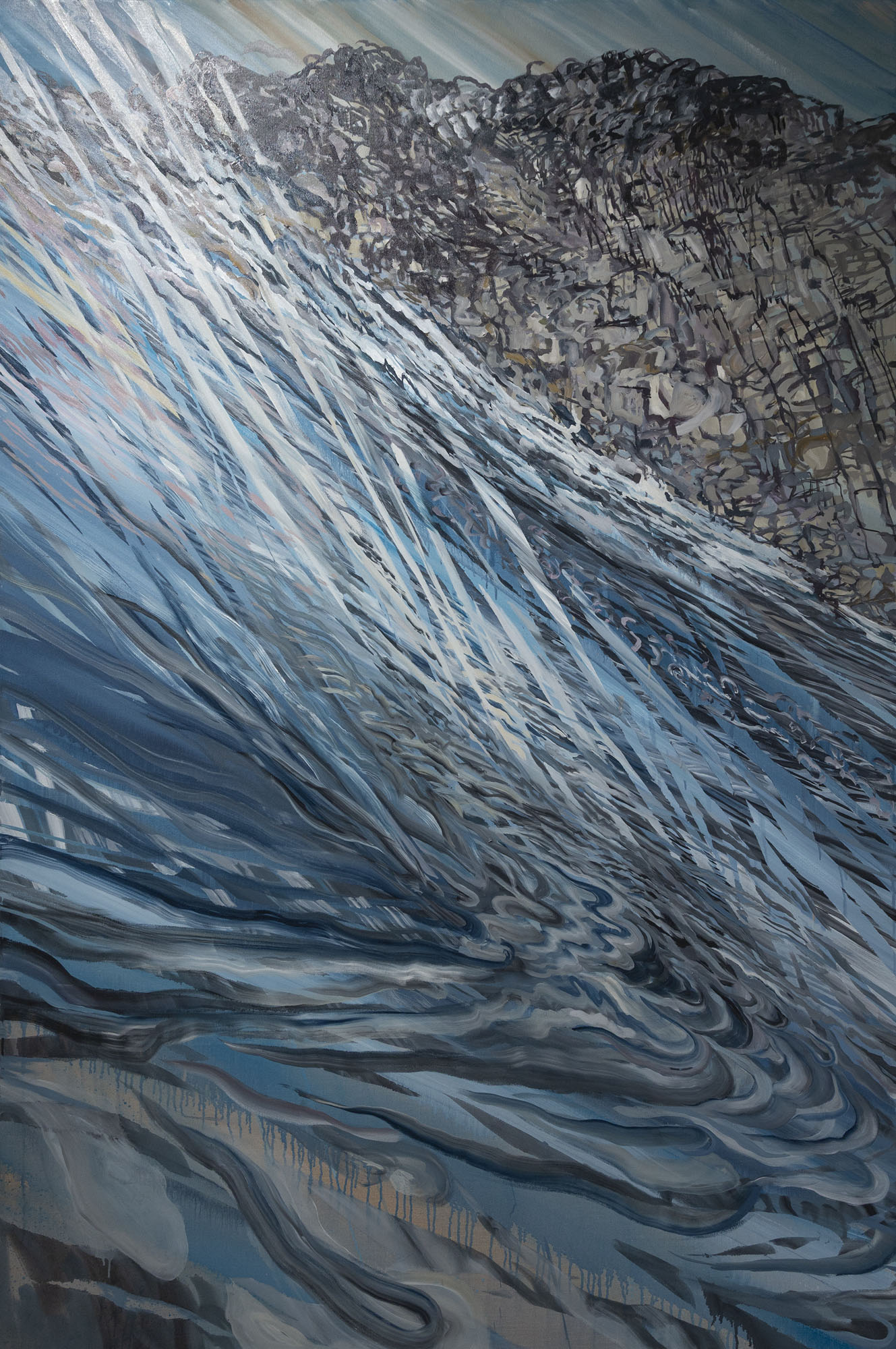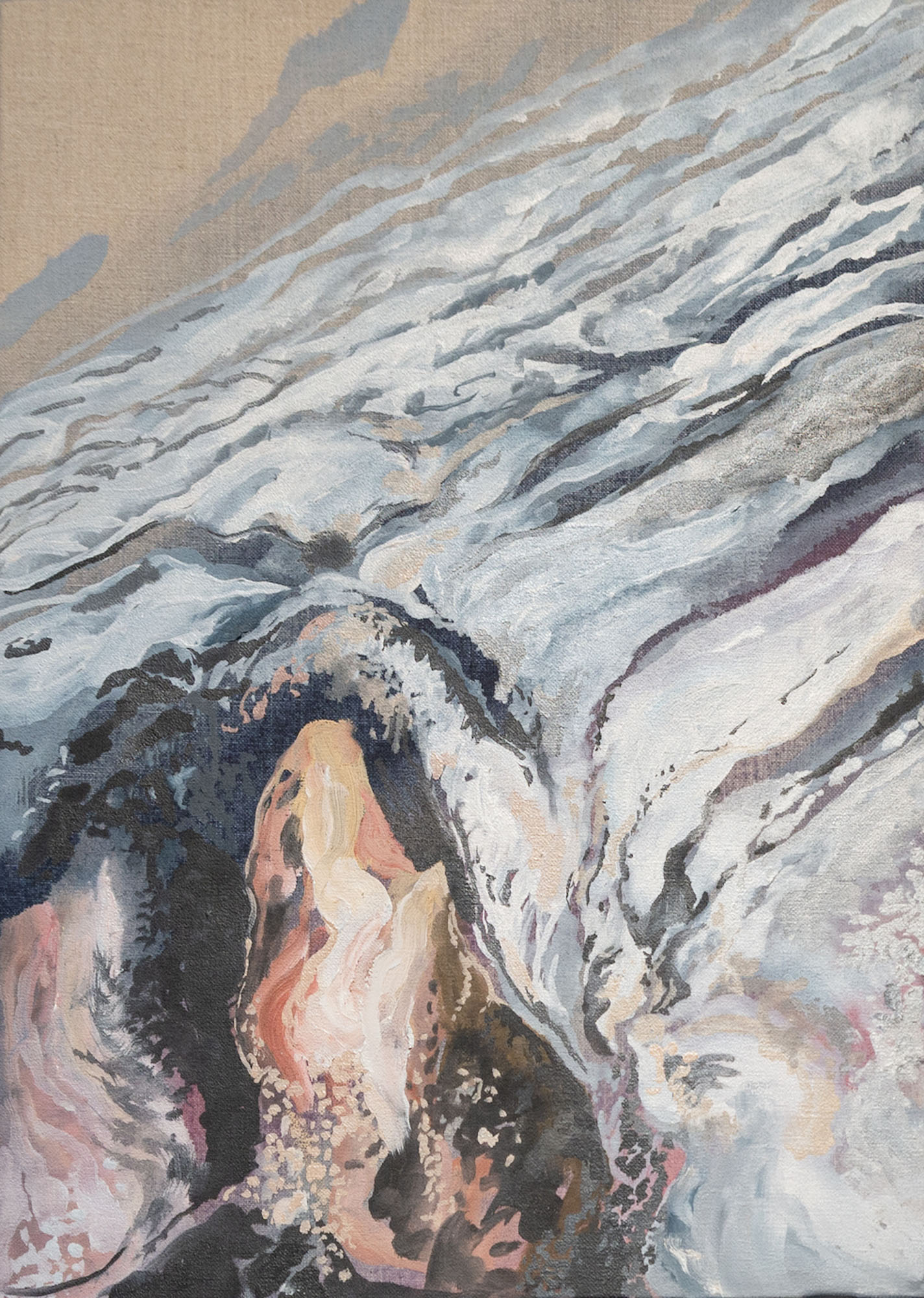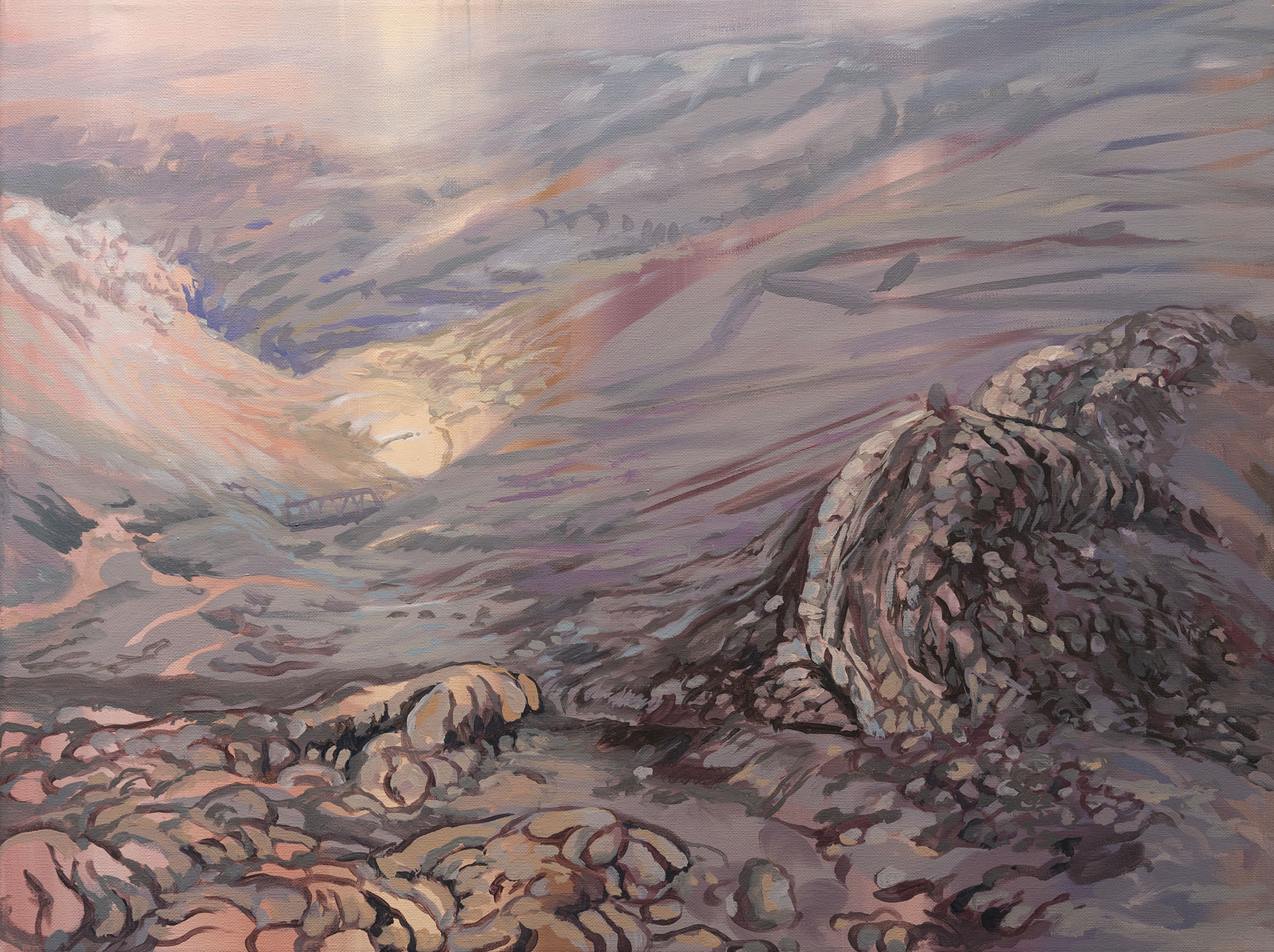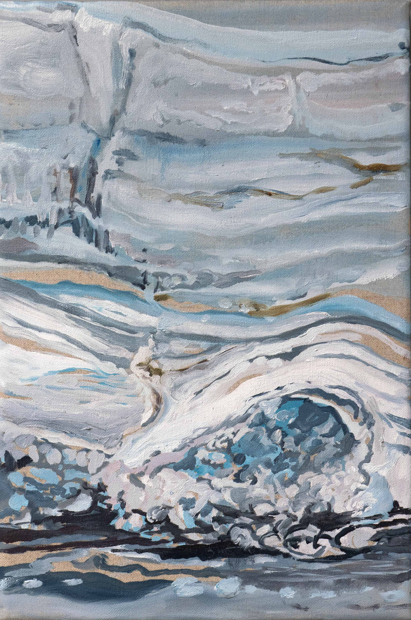 On the other hand her paintings are a visual perception of the mountain unlike the spectacular drone images. They are a subjective interpretation that forge a close physical relationship with the object, a tactile register of the dynamics of mountain that tell us of her own experiences. This throbbing, luminous technique reveals a story-teller, an affectionate mountain, conscious of the links between the material and the metaphoric self.