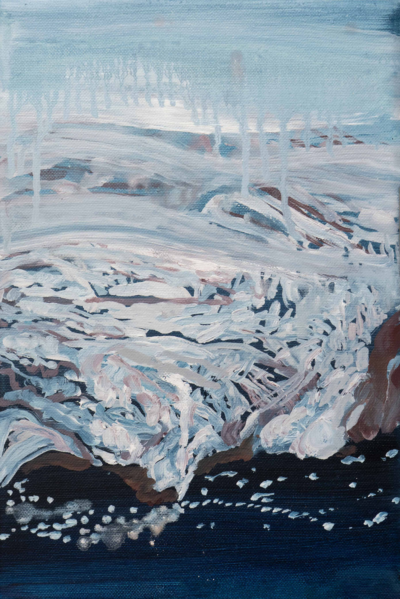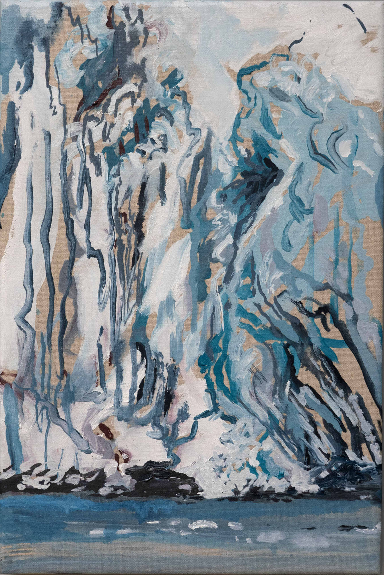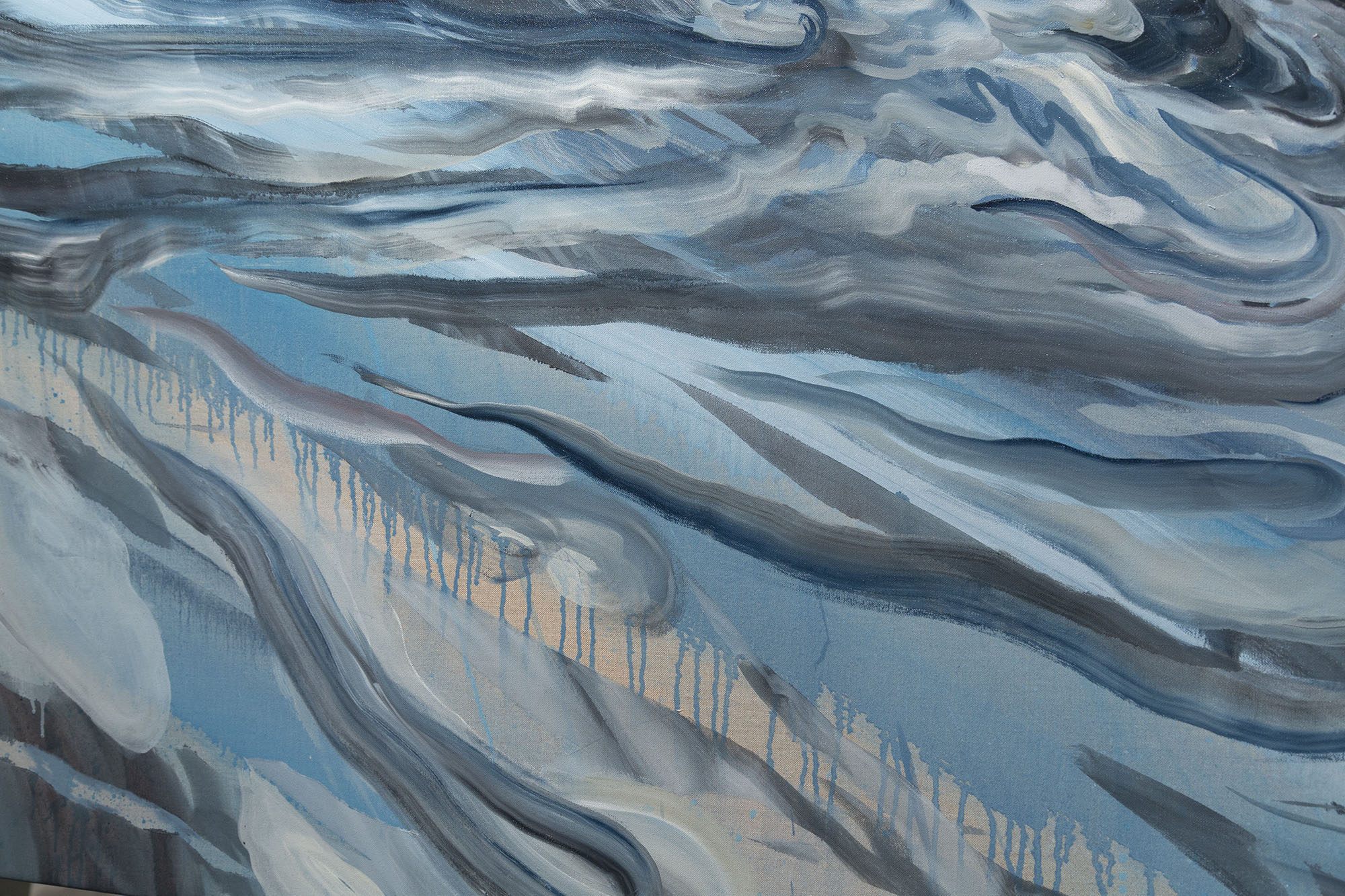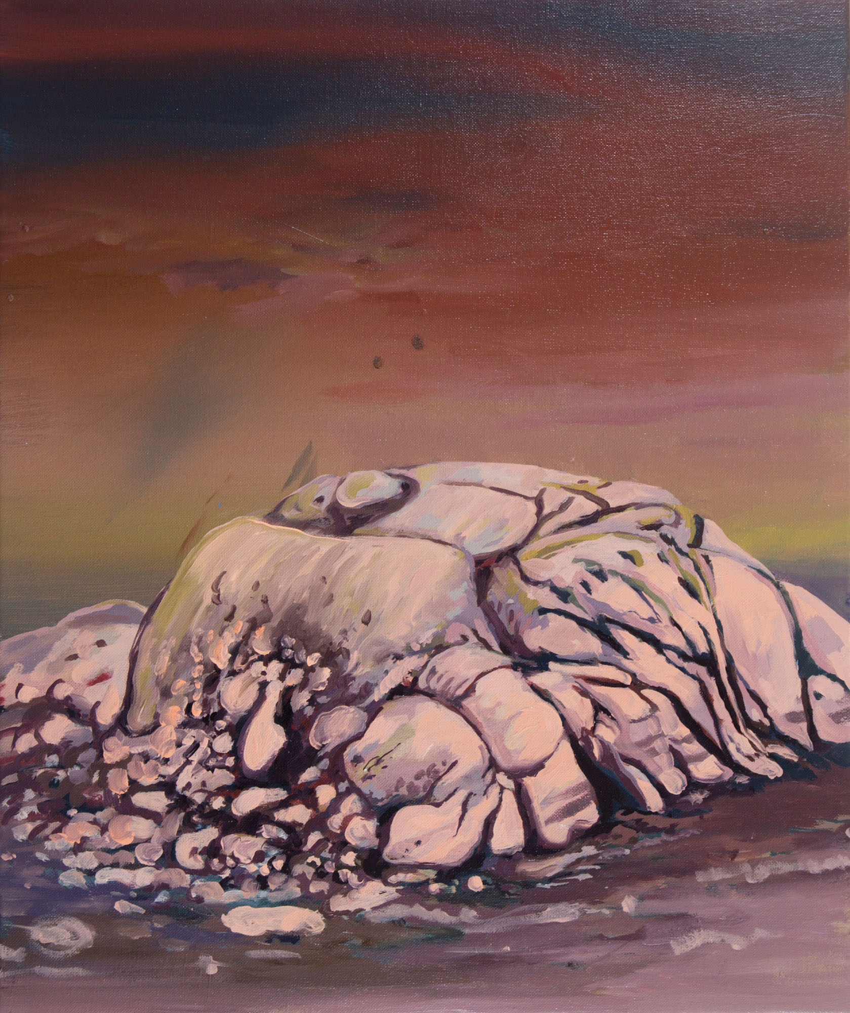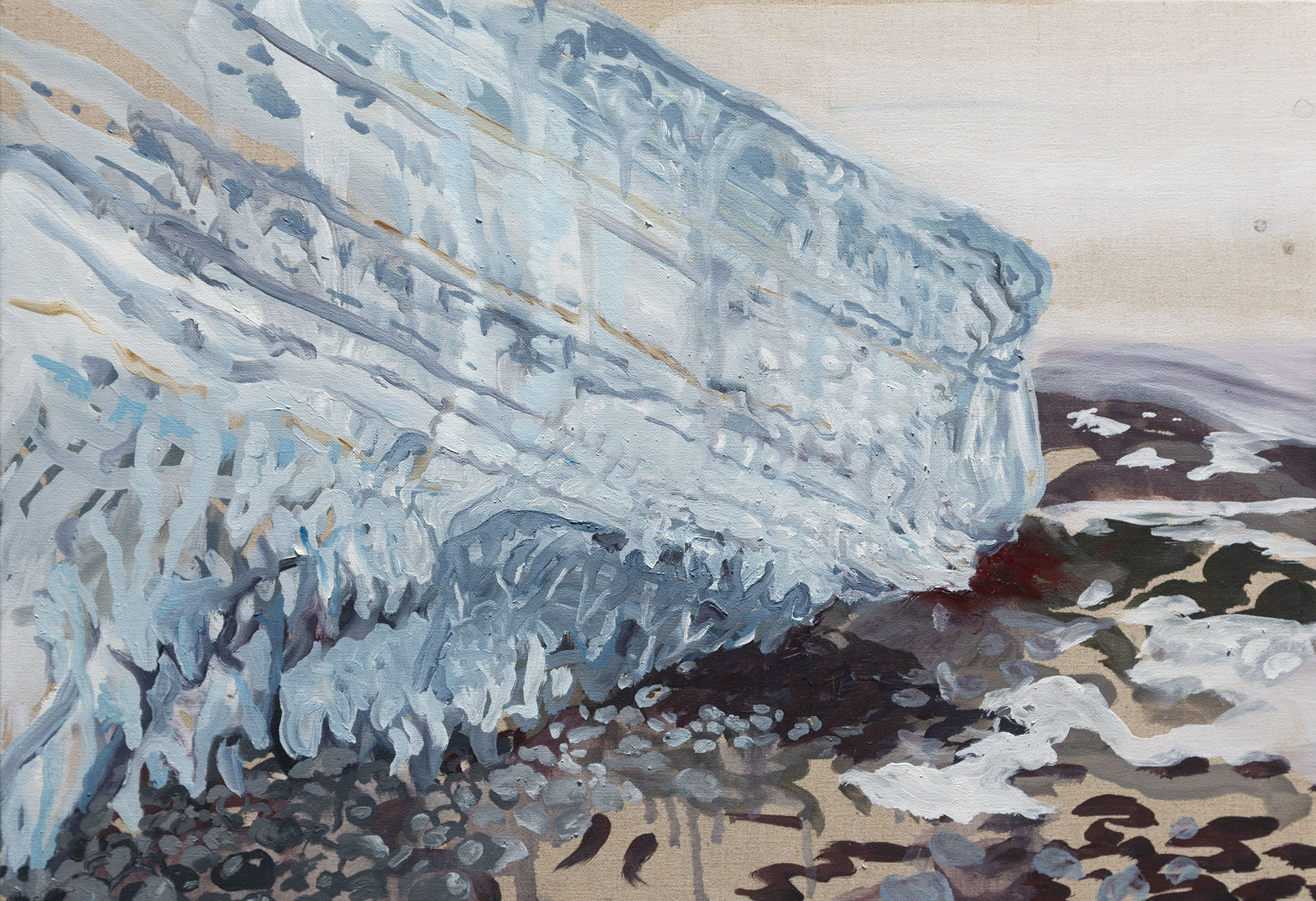 On the other hand her paintings are a visual perception of the mountain unlike the spectacular drone images. They are a subjective interpretation that forge a close physical relationship with the object, a tactile register of the dynamics of mountain that tell us of her own experiences. This throbbing, luminous technique reveals a story-teller, an affectionate mountain, conscious of the links between the material and the metaphoric self.