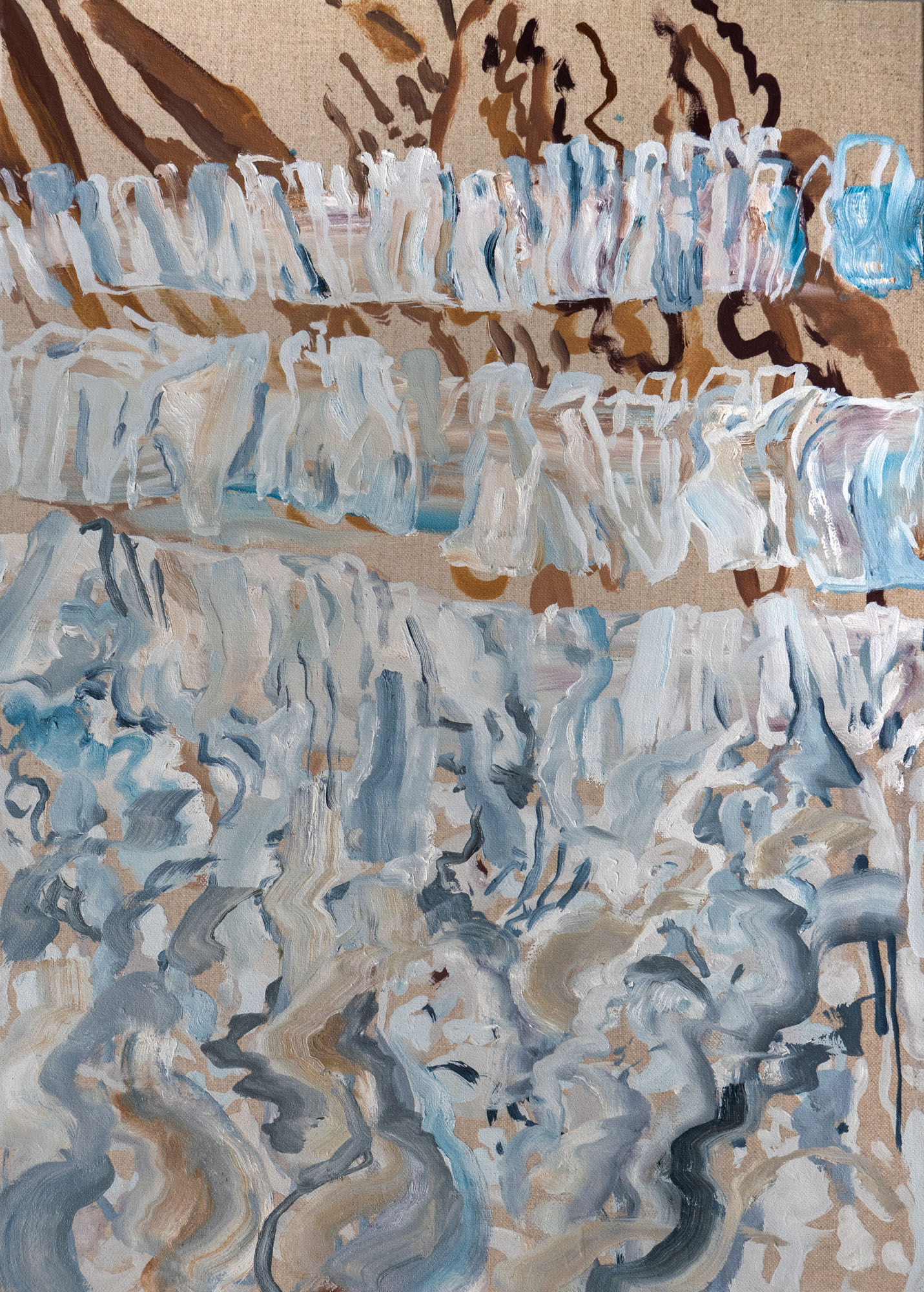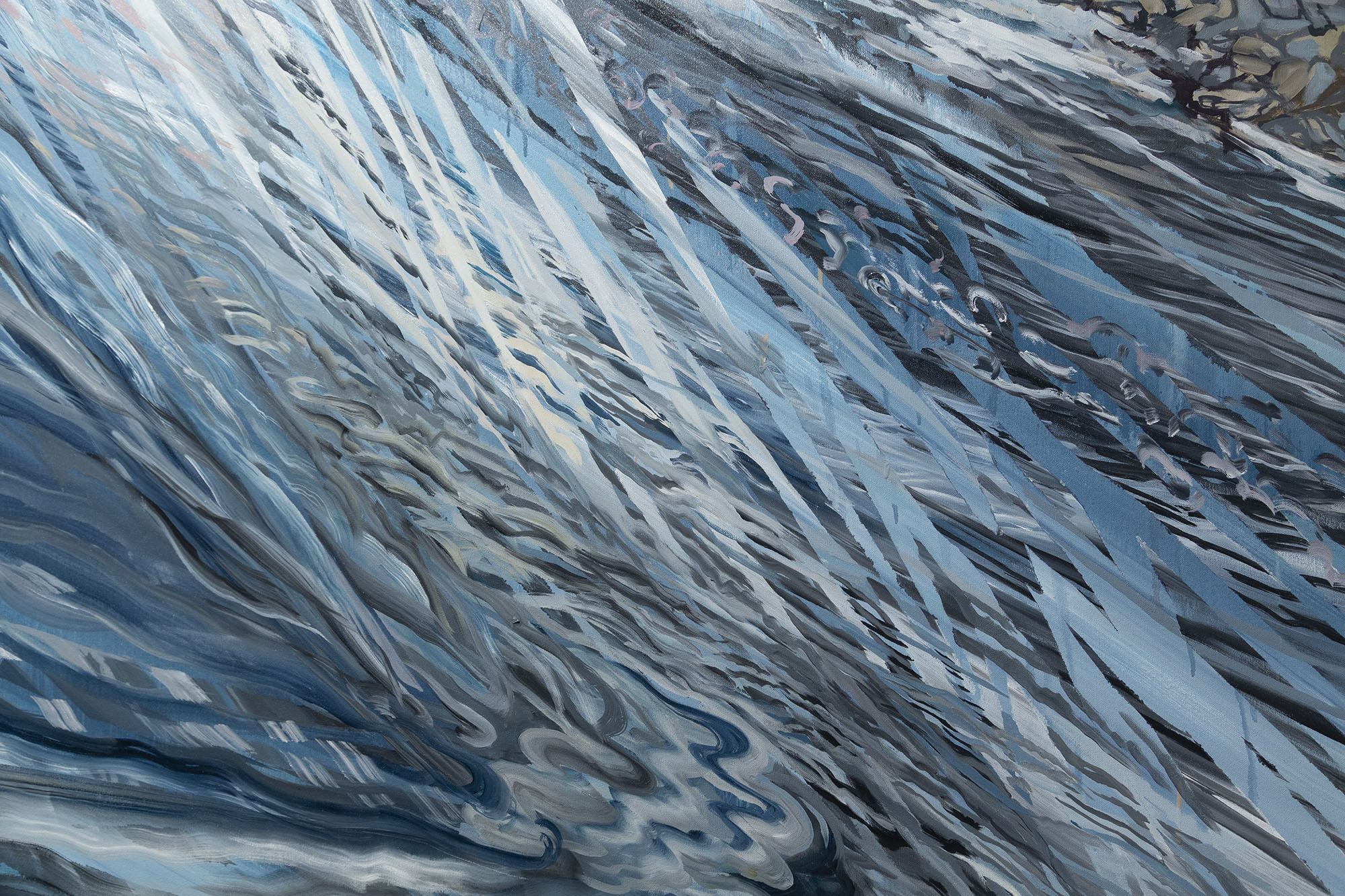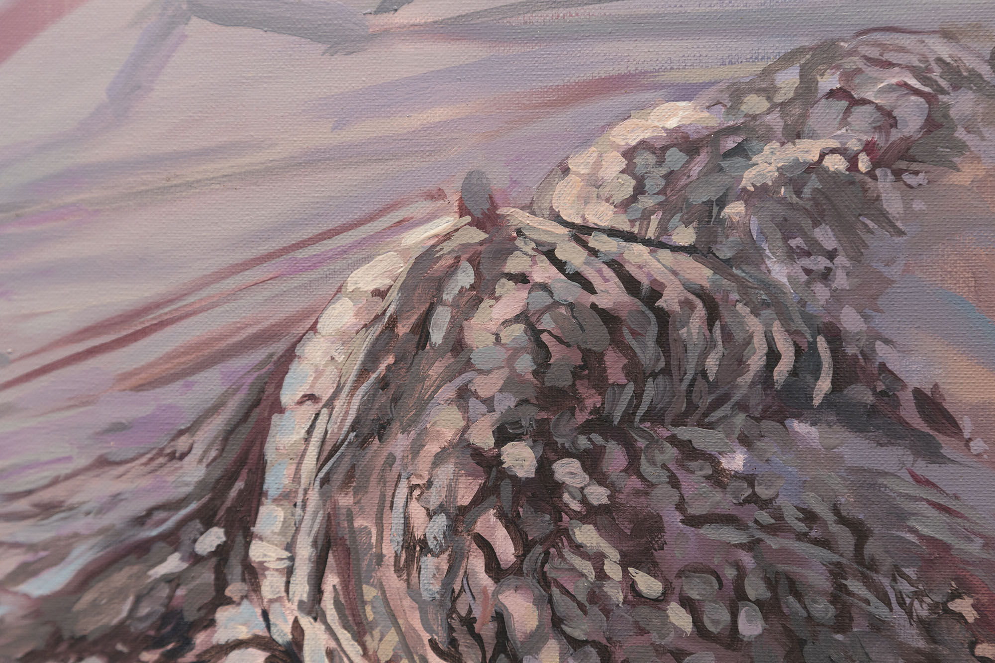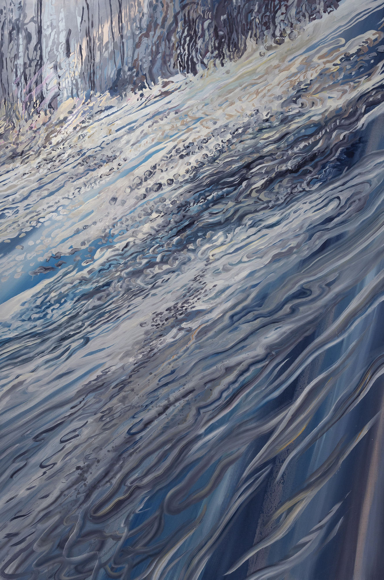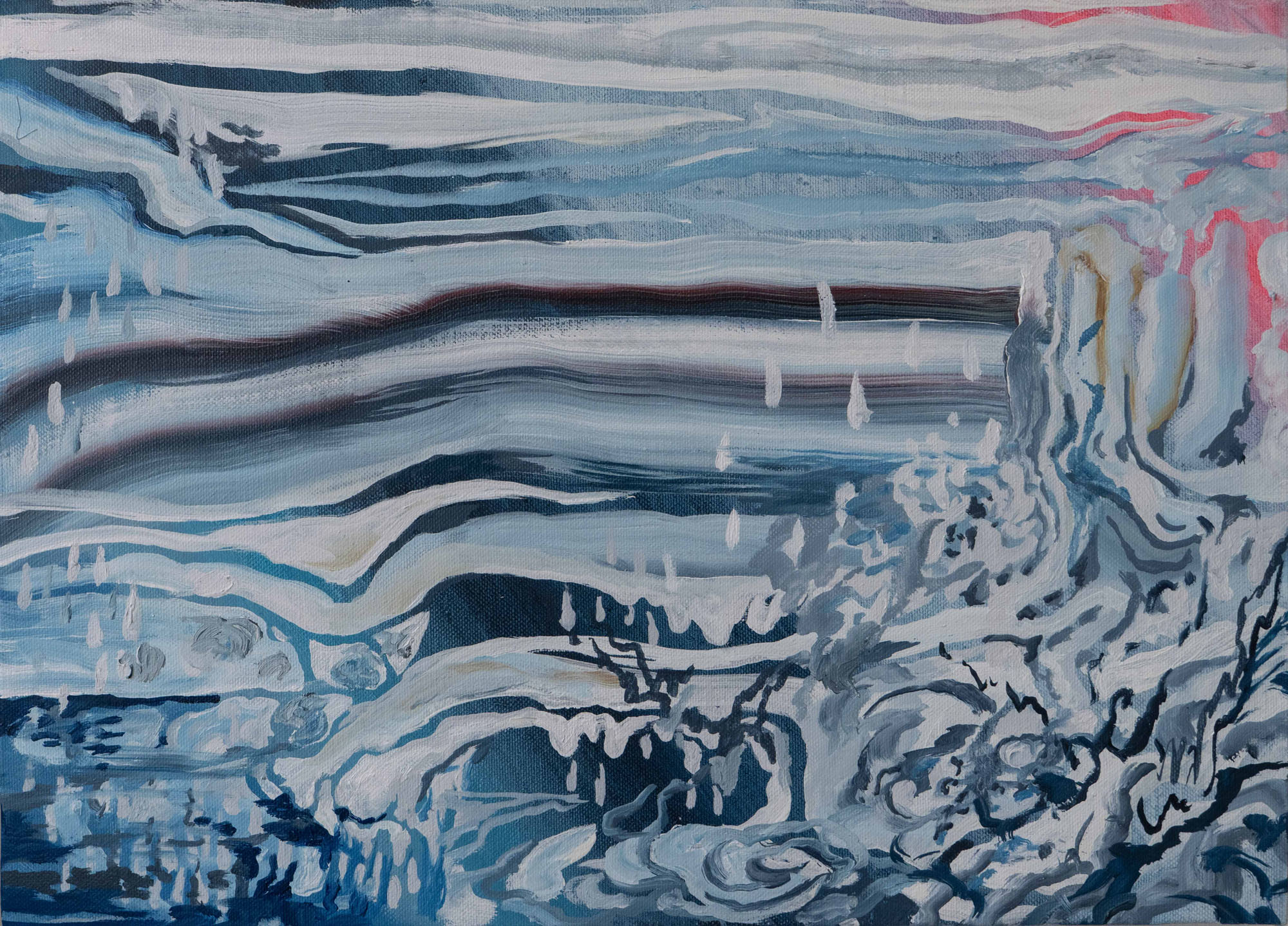 On the other hand her paintings are a visual perception of the mountain unlike the spectacular drone images. They are a subjective interpretation that forge a close physical relationship with the object, a tactile register of the dynamics of mountain that tell us of her own experiences. This throbbing, luminous technique reveals a story-teller, an affectionate mountain, conscious of the links between the material and the metaphoric self.