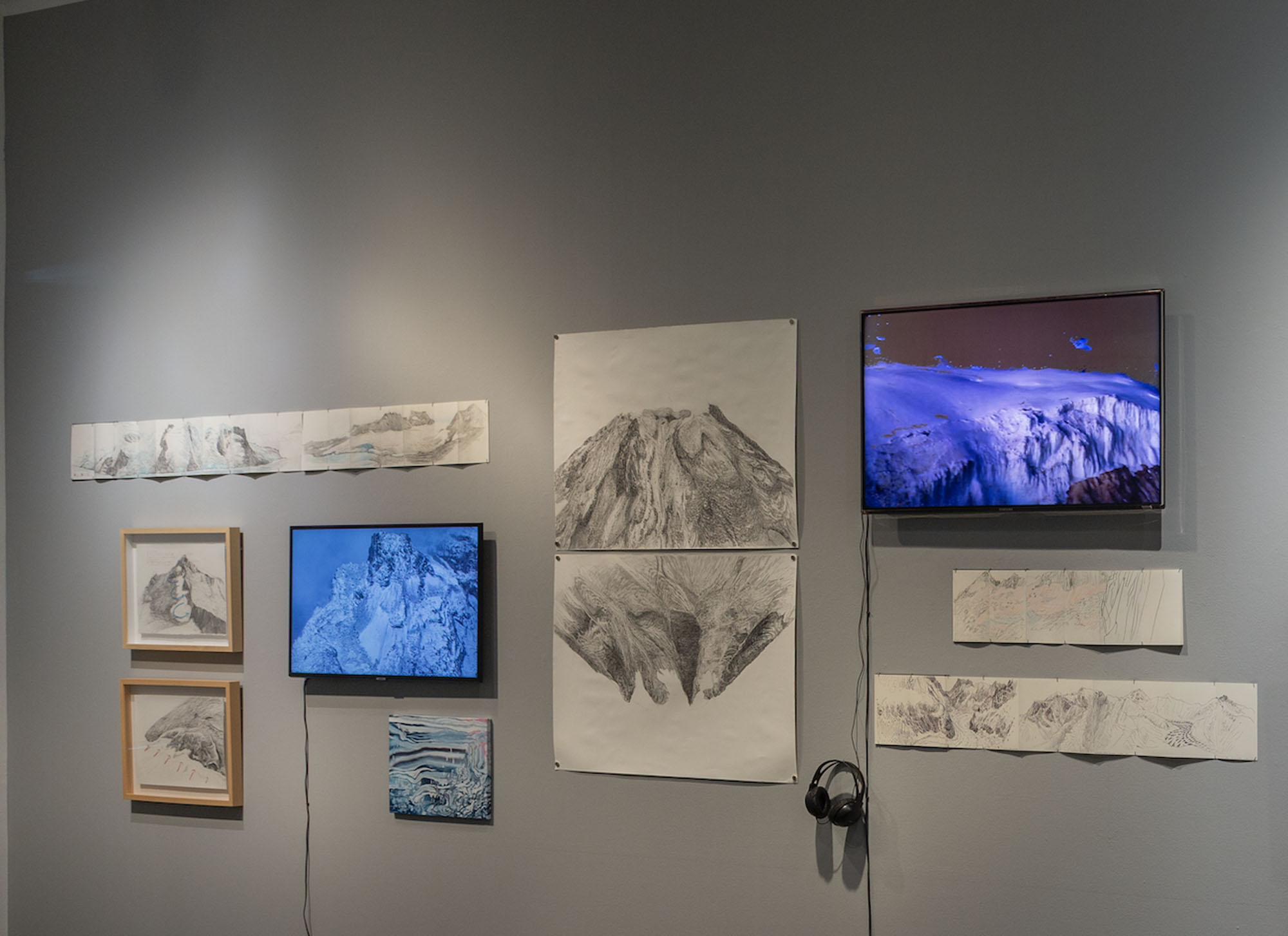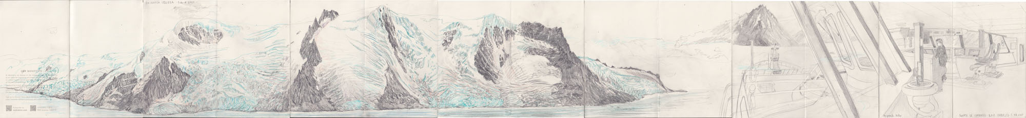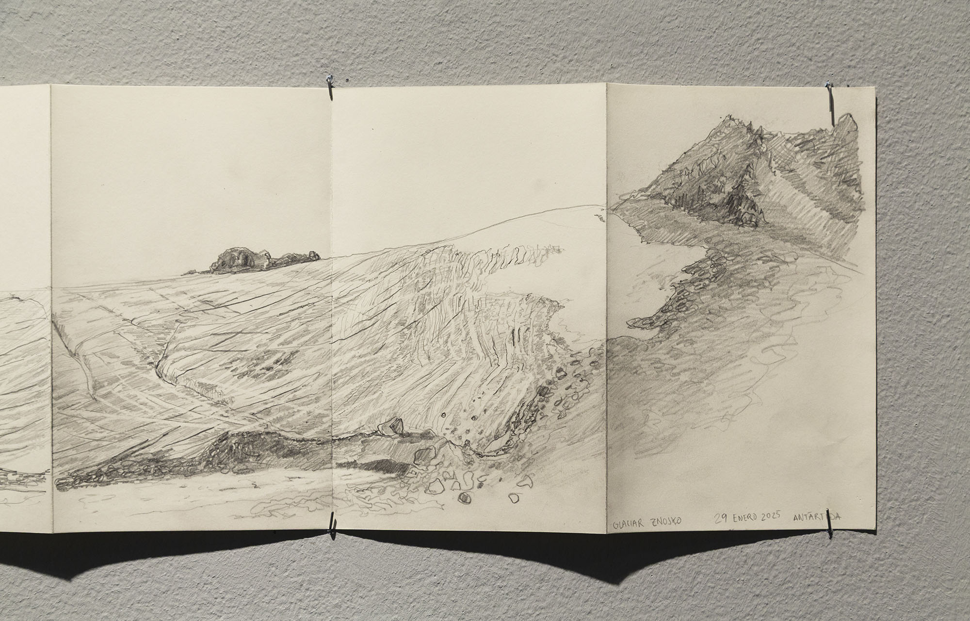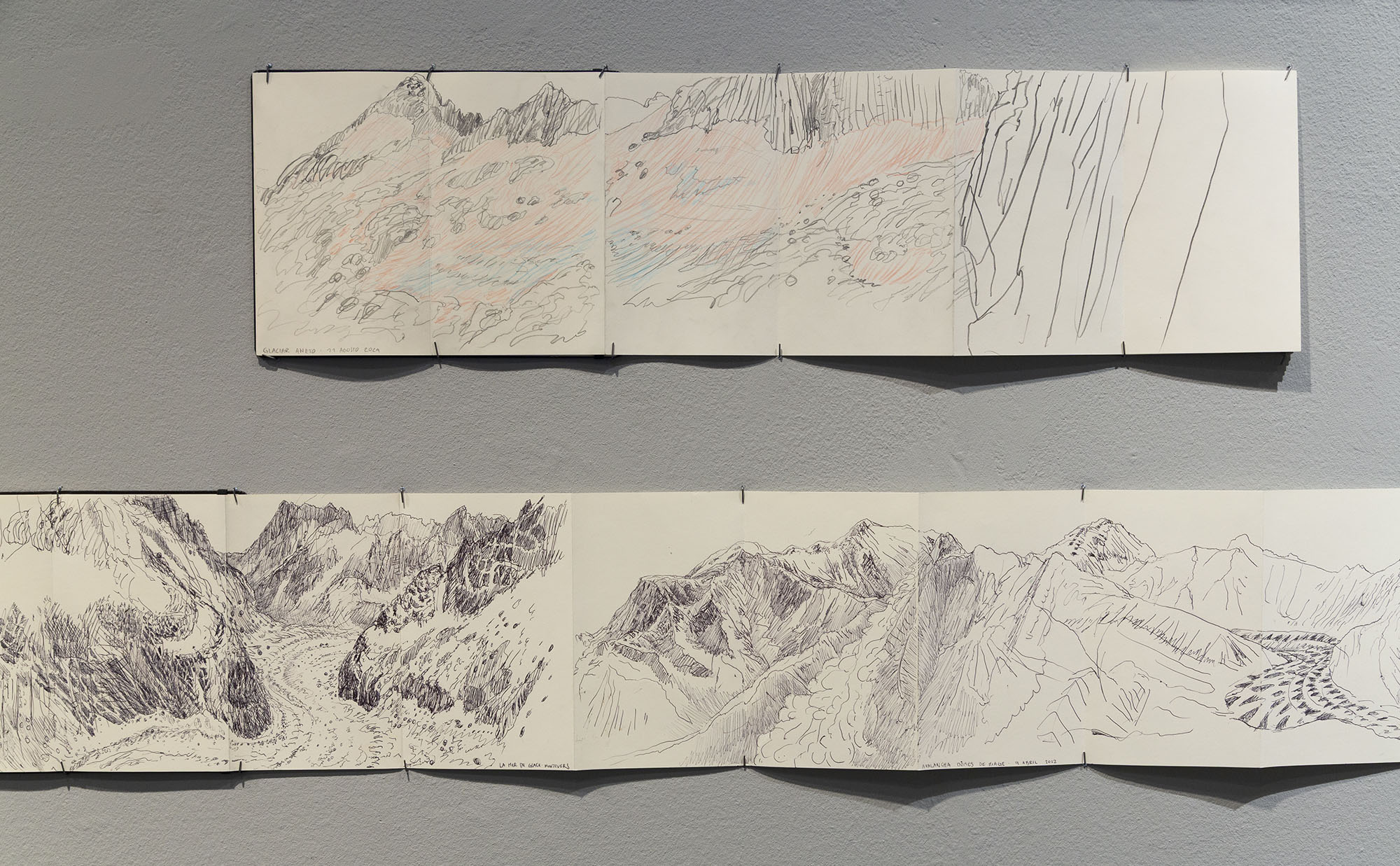 To illustrate all this the exhibition is structured as an amalgam of works combining videos, notebooks, sketches, drawings, maps and paintings of various glaciers: the Dulima, Poleka-Sasue and Kumanday all ancestral names in her native Colombia and the Aneto and Cadí-Moixeró in Huesca and Catalonia respectively. There are also pieces of Mont Blanc and her recent visit to Antarctica. All the materials on show receive the same unranked treatment of visibility or interpretation. This deliberate gesture underlines the different ways of representation and richness of Cardenas’ work, the myriad approximations, the impossiblity of understanding, fixing or capturing the enormity, depth and quiesence of her subject.