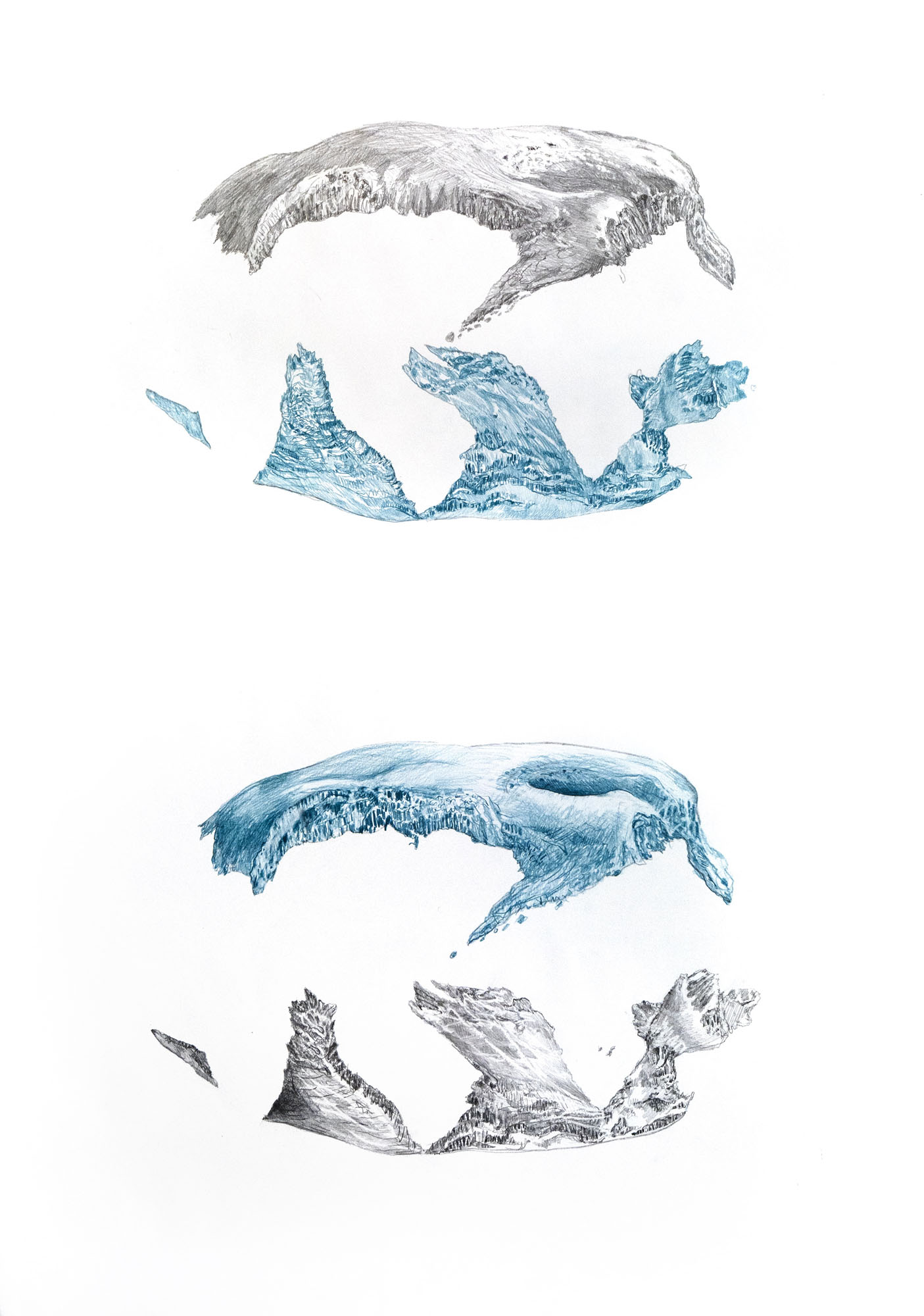 The mountain peaks and their climbing is often associated with the idea of the observer who sees and controls all from the summit. Natalia on the other hand does not look downwards or outwards as if searching for absolute knowledge. She looks along and inside the mountains and glaciers searching for their corporeality and mystery. This is suggestive of the philosopher Merleau-Ponty’s idea when he affirmed that we are encrusted in the flesh of the world. The world is not that immutable object presented in social or natural sciences. Rather, it is unceasingly connected. Our perception of it is possible thanks to our bodies and our sensorial functions. Humans add up data patiently but this is not enough. Knowledge is an accomplice in the mystery, not its antagonist. Being content with the knowledge means not to search for complete knowledge. As Nan Shepherd wrote in her book The Living Mountain, “one can never achieve knowledge of the whole mountain, nor of oneself in relation to it”.